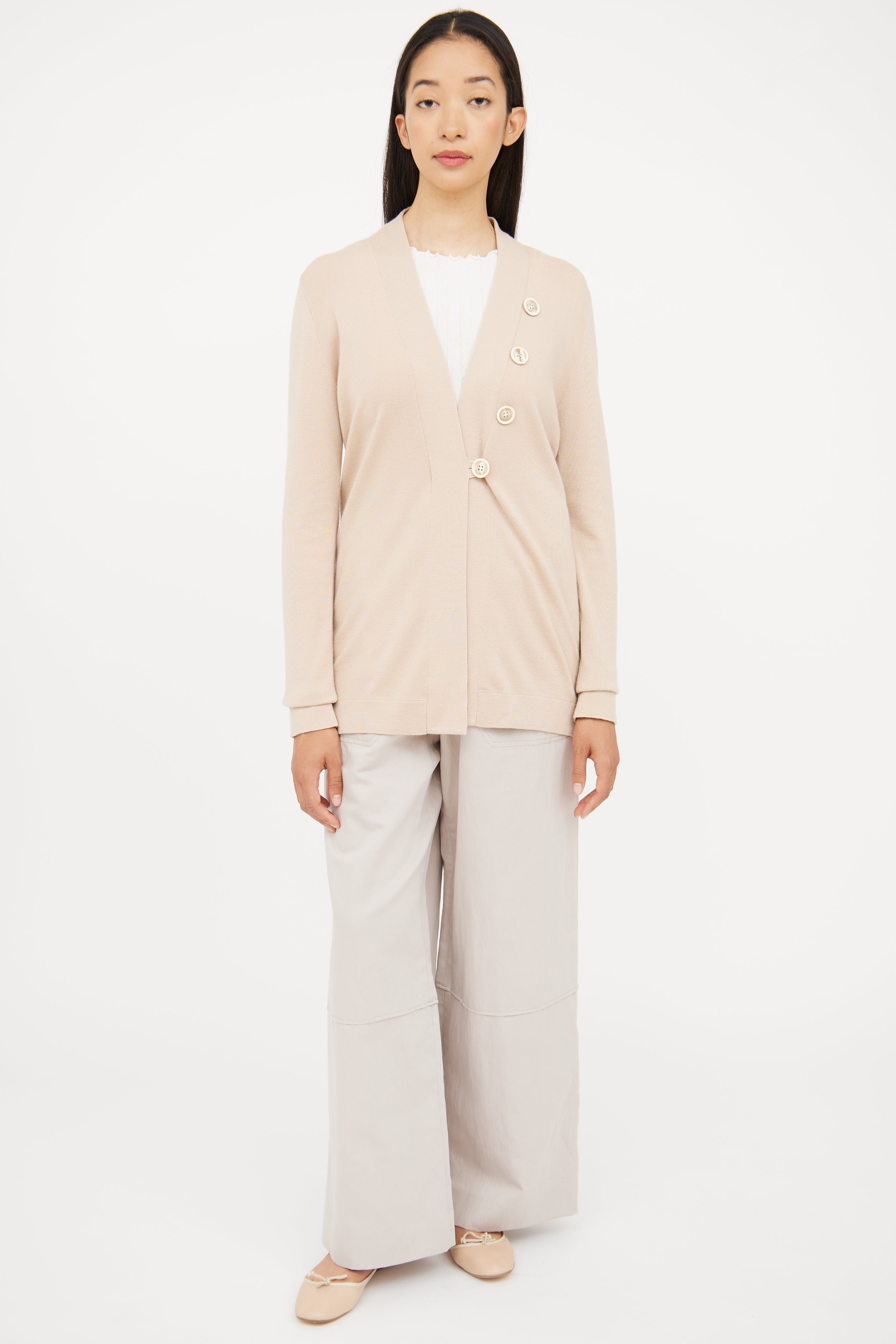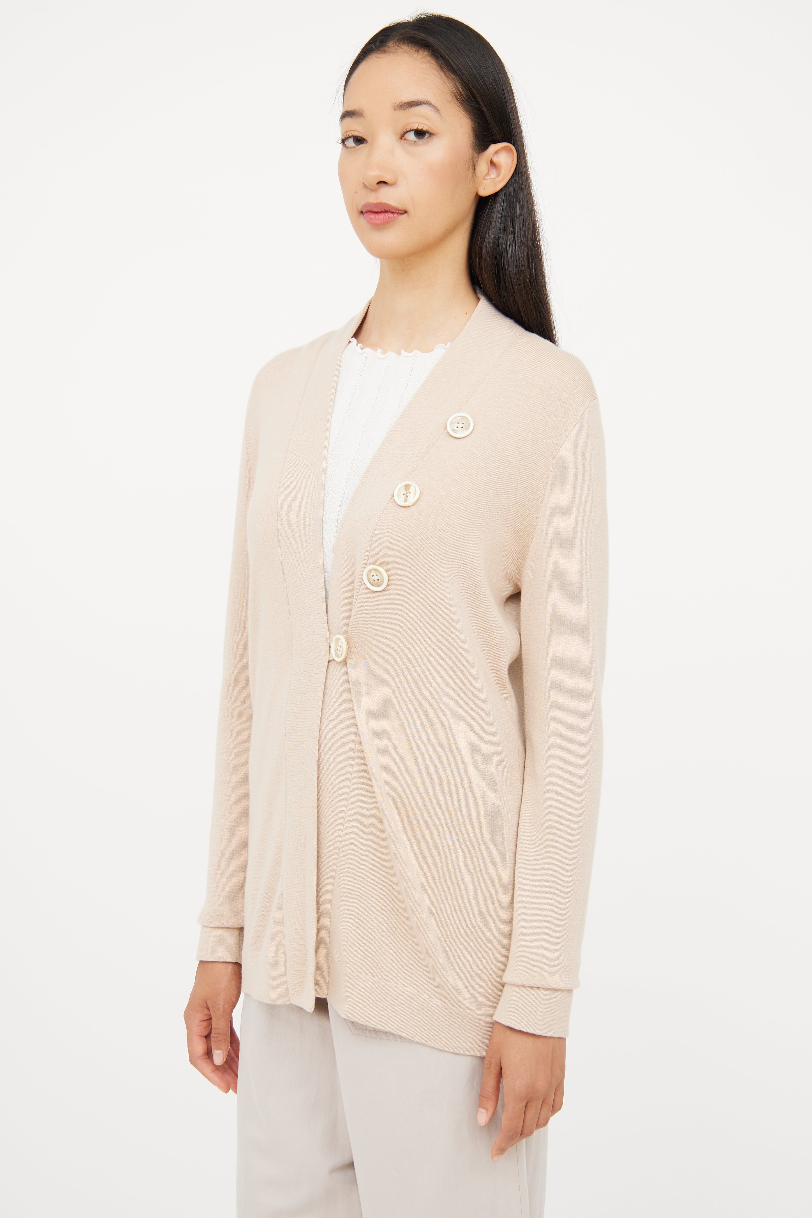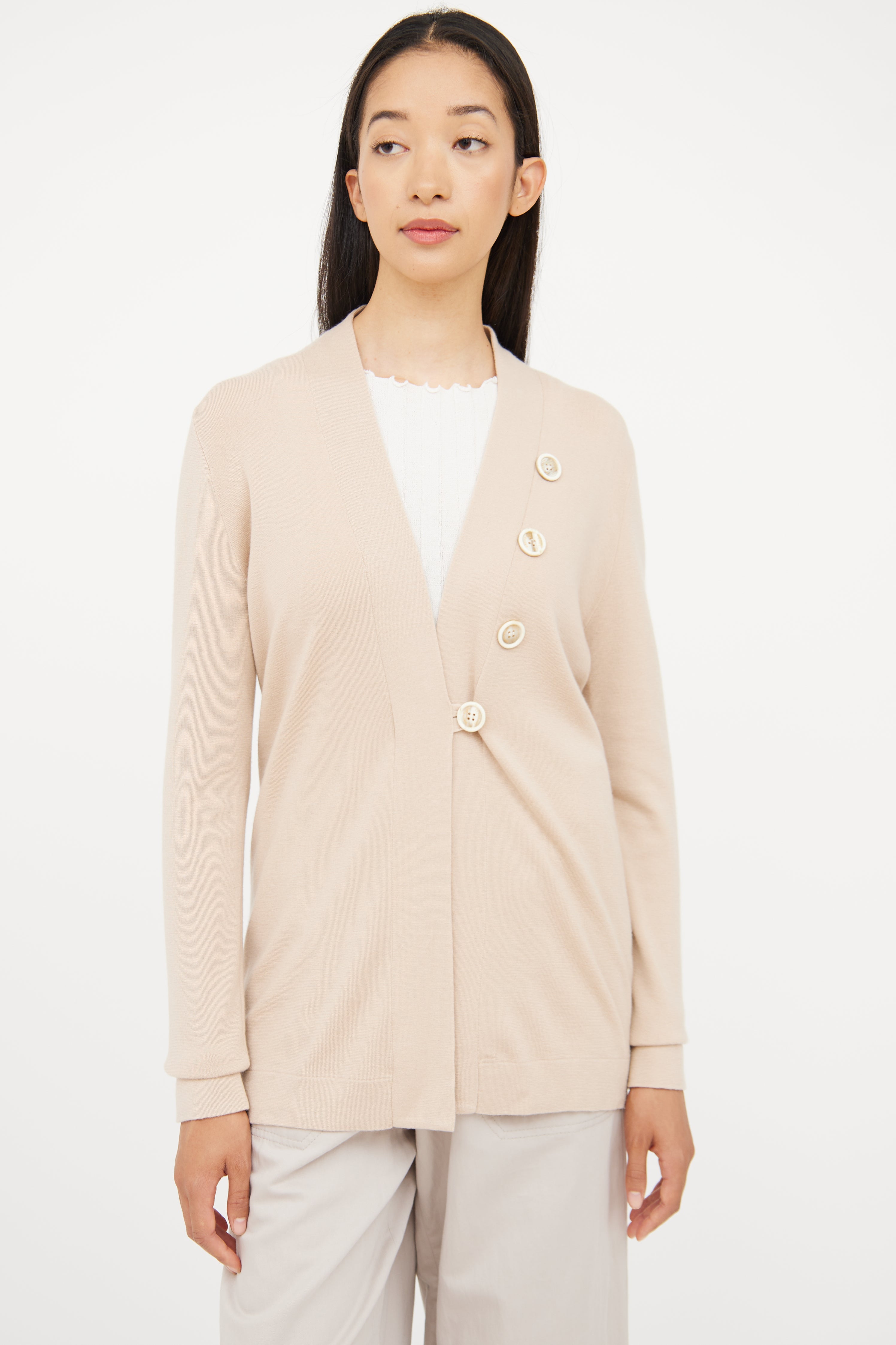 Pre-owned Brunello Cucinelli beige long sleeve cardigan featuring asymmetrical button detail, single button closure and V neck.