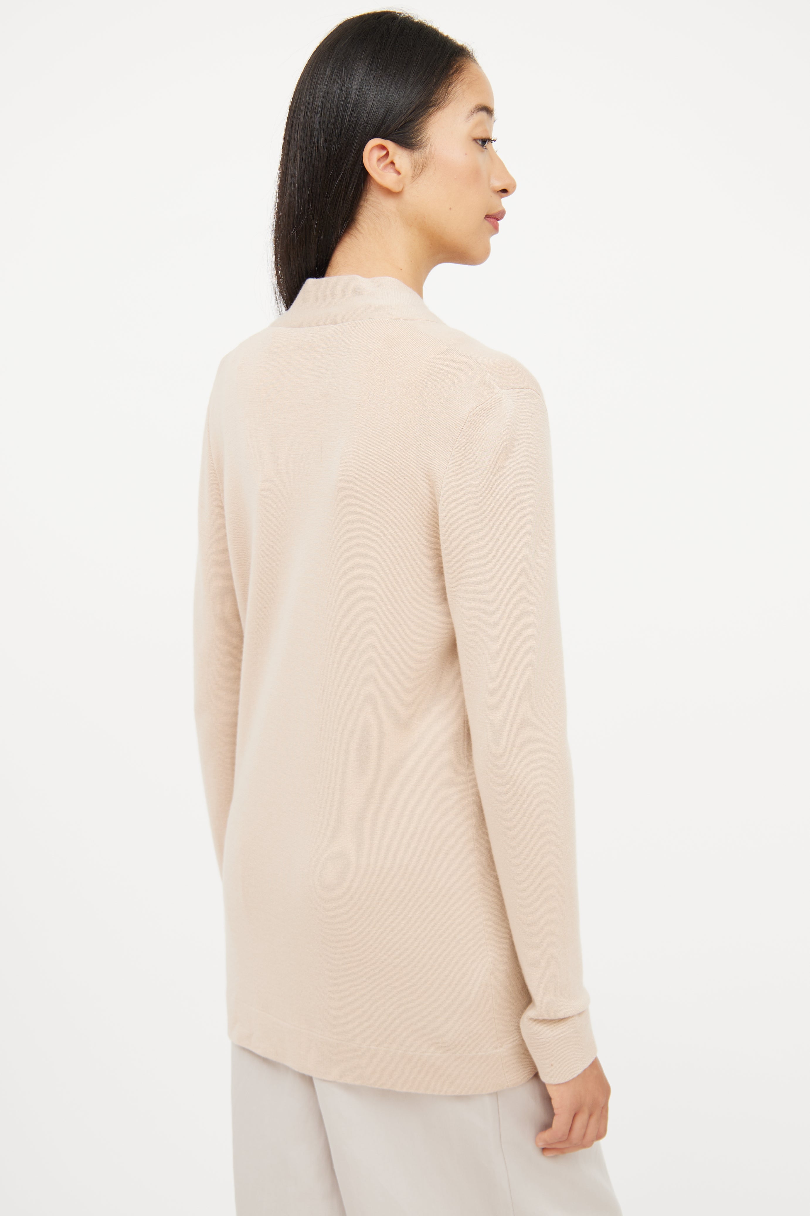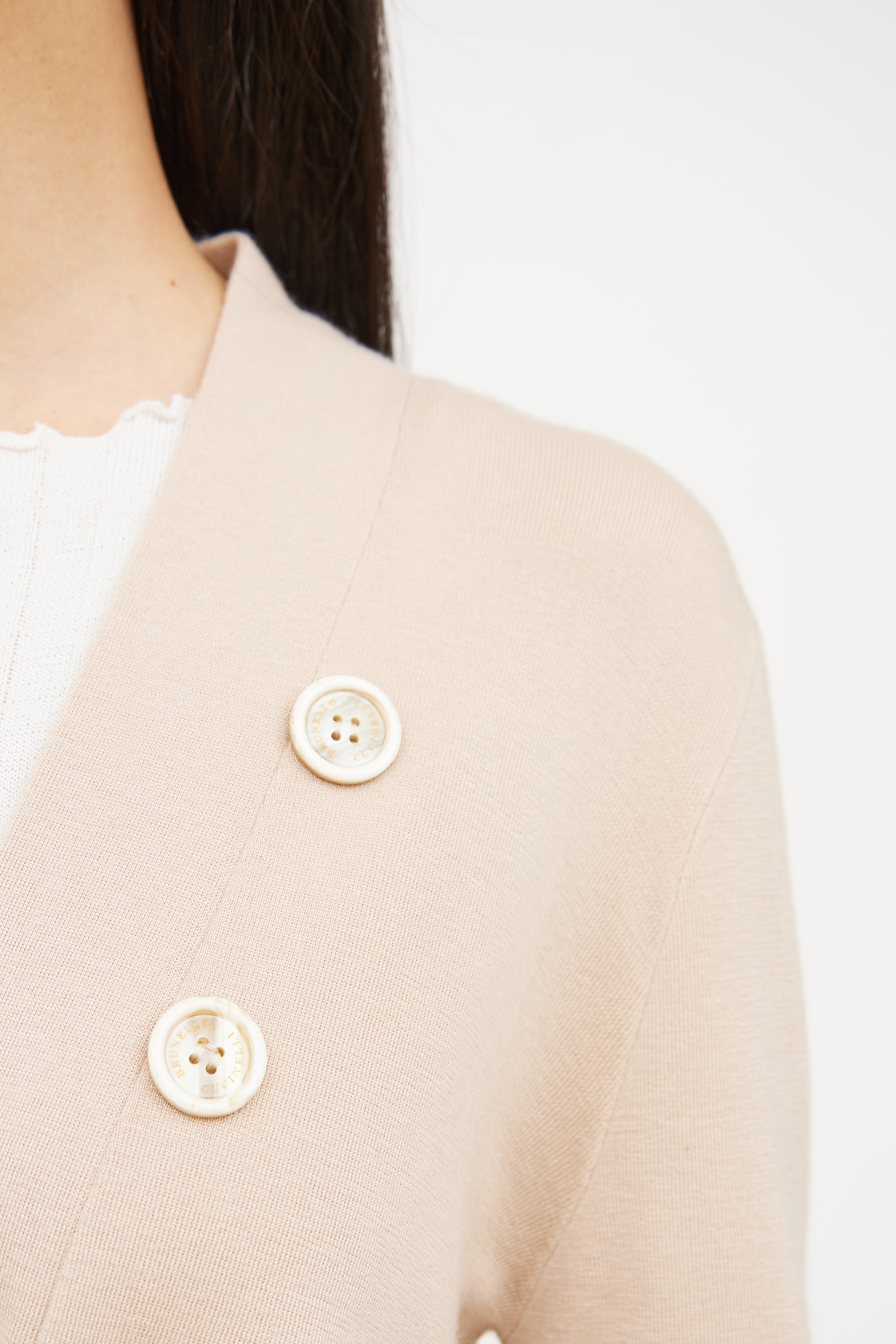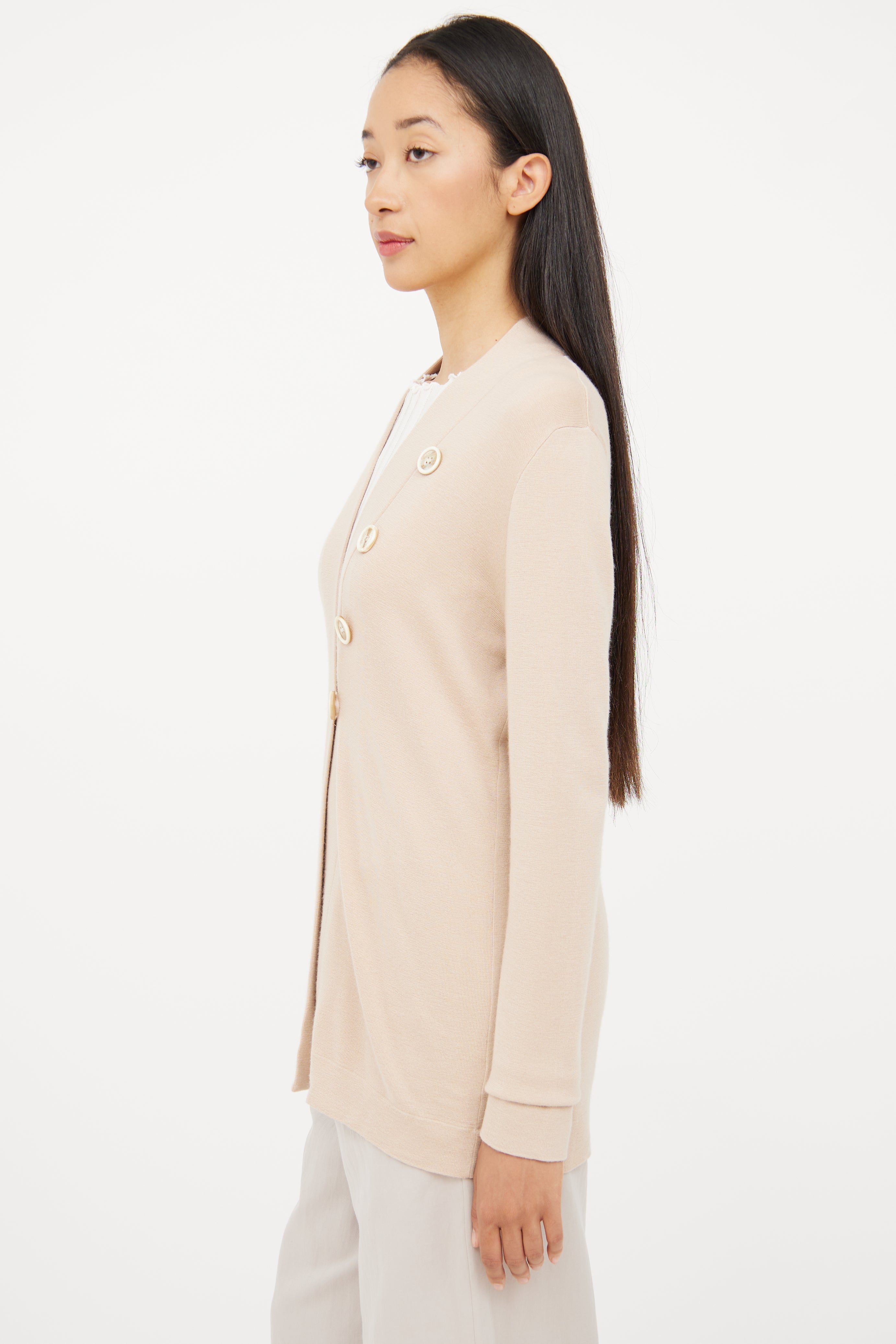 Pre-owned Brunello Cucinelli beige long sleeve cardigan featuring asymmetrical button detail, single button closure and V neck.