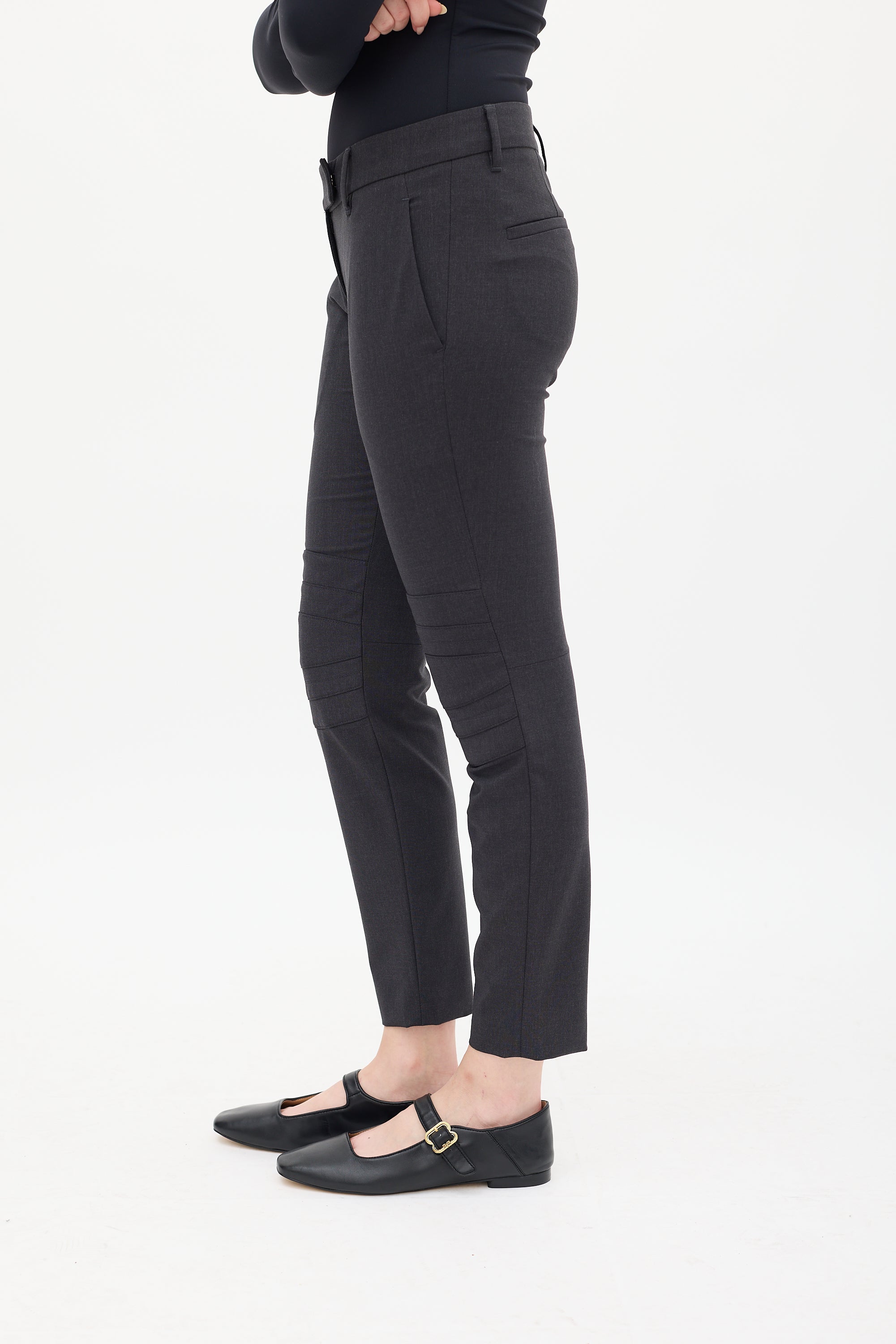 Pre-owned Brunello Cucinelli dark grey wool blend trousers featuring a regular waist, slim leg, four pocket styling, panelling at knees, and zip fly.