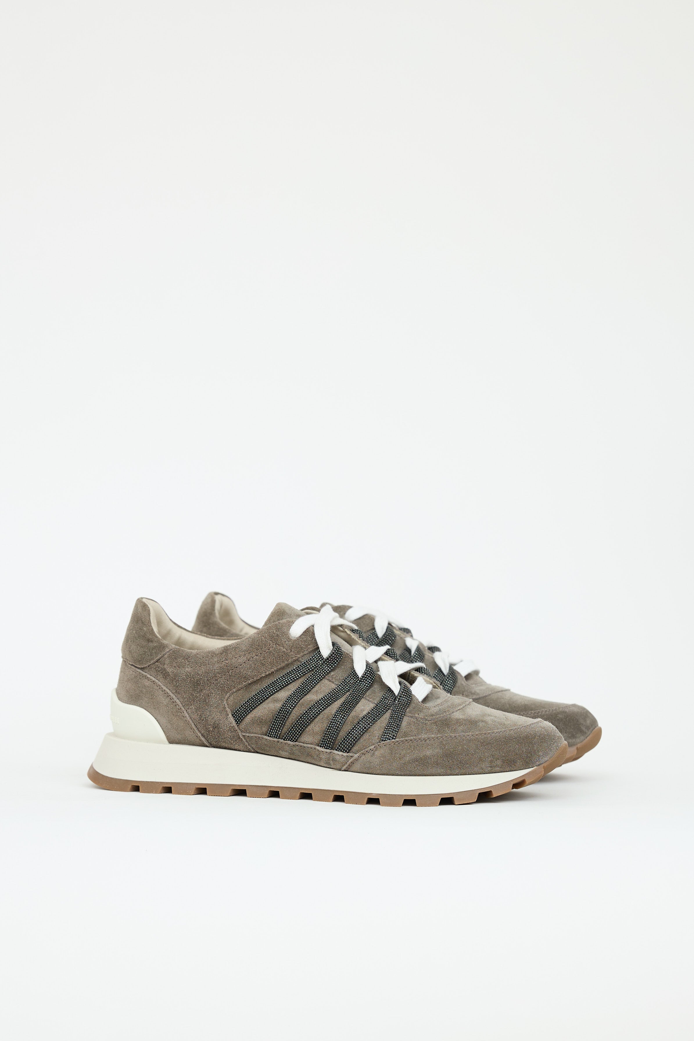 Pre-owned Brunello Cucinelli grey suede Monili sneakers featuring a round toe, suede upper, Monili bead detailing at sides, lace up closure, embossed logo at counter, and chunky outsole.