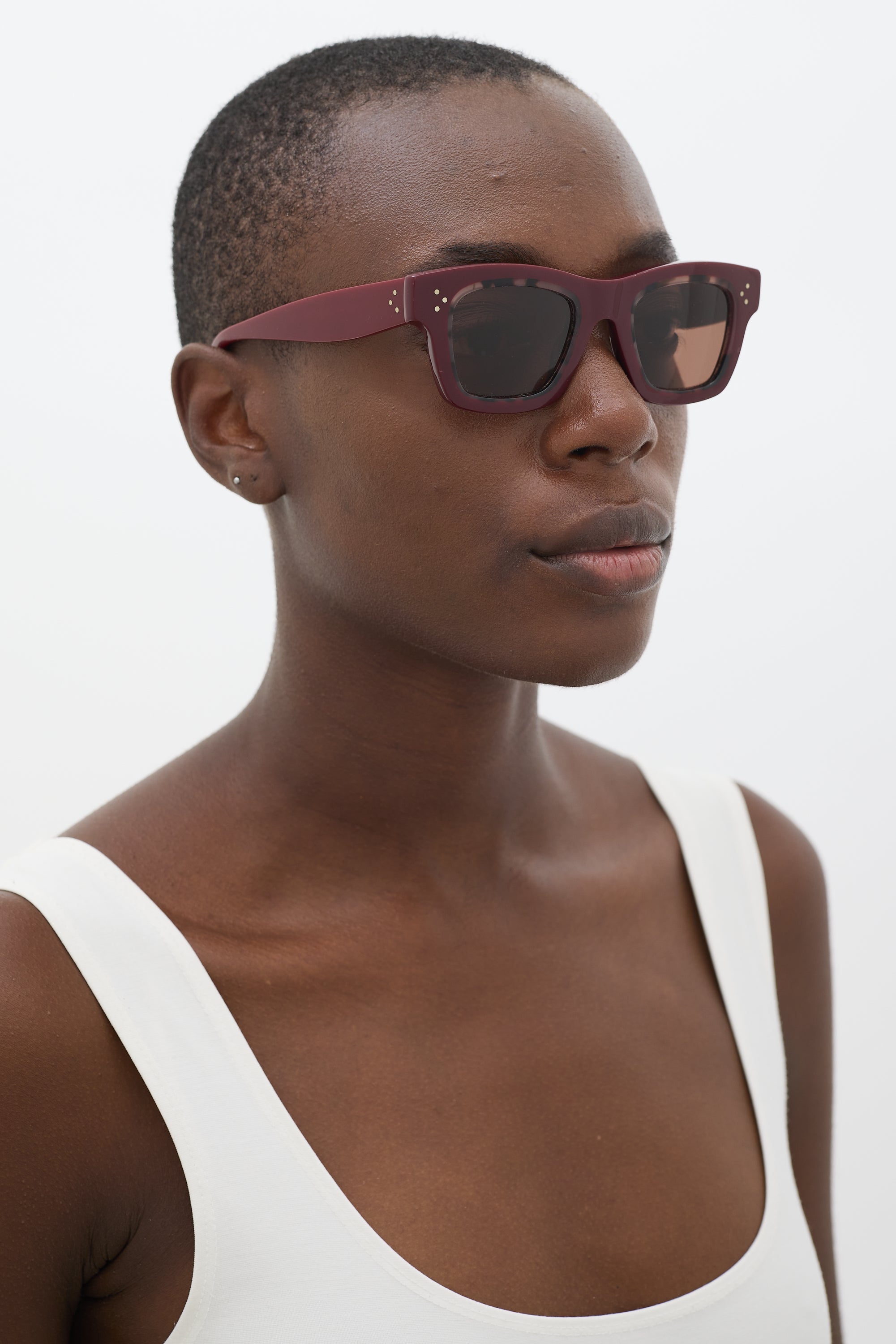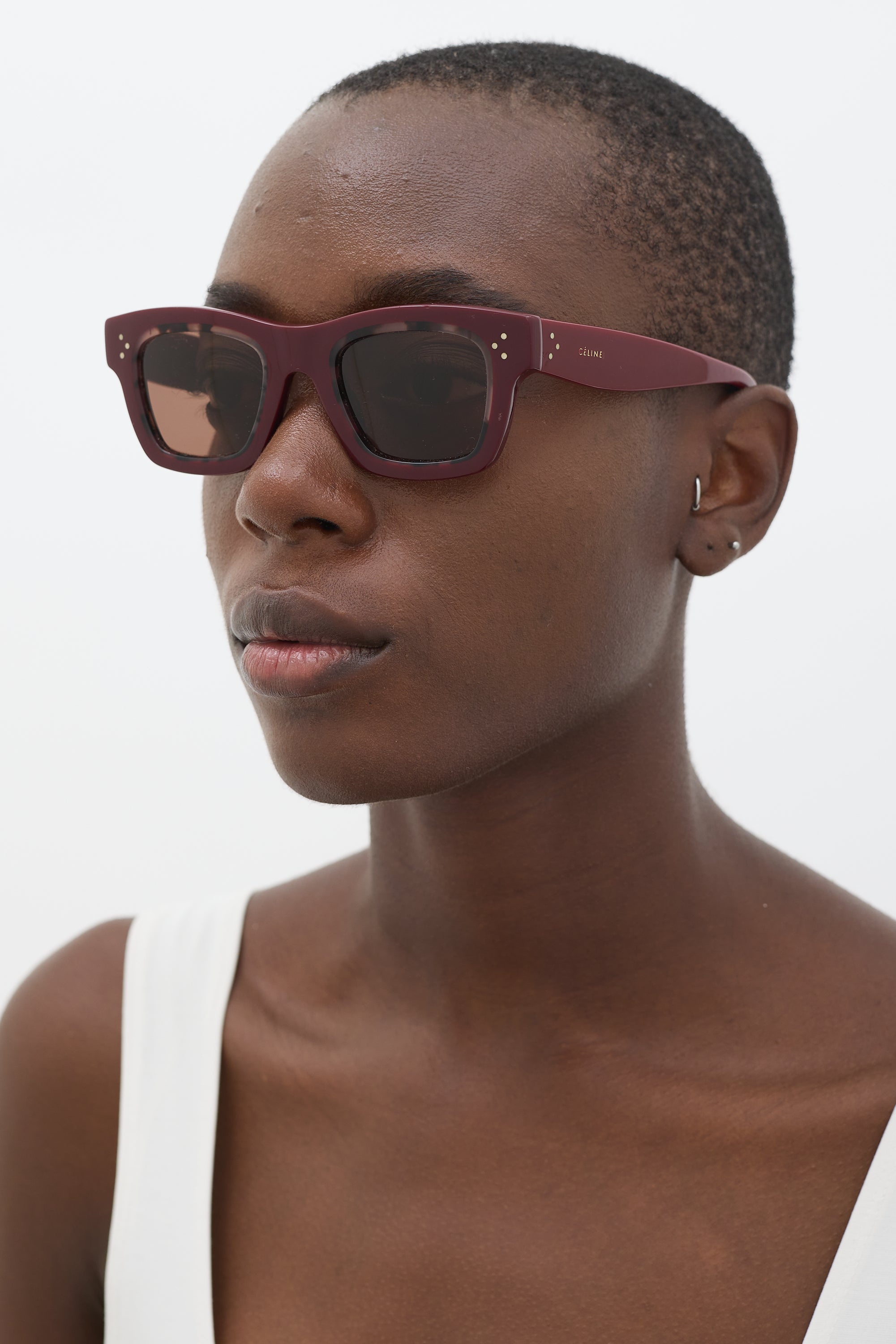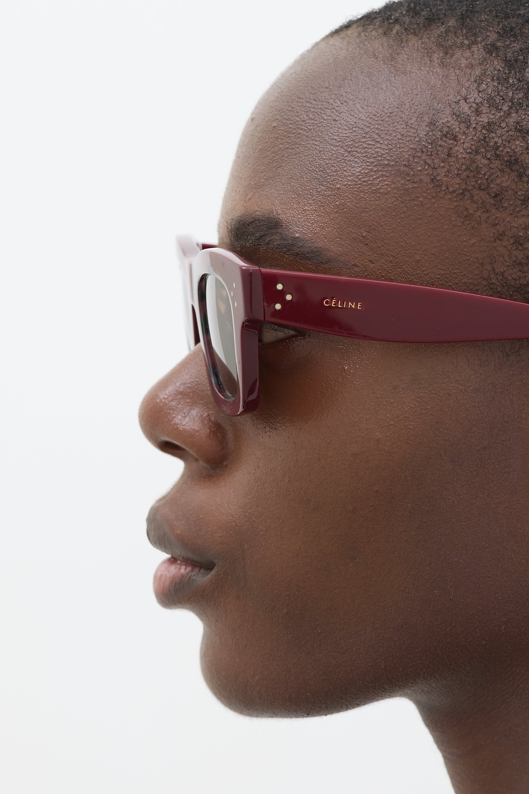Pre-owned Celine CL41396/S sunglasses featuring grey tinted lenses, burgundy acetate frame, marbled border at lenses, and gold tone foil logo at left temple.
