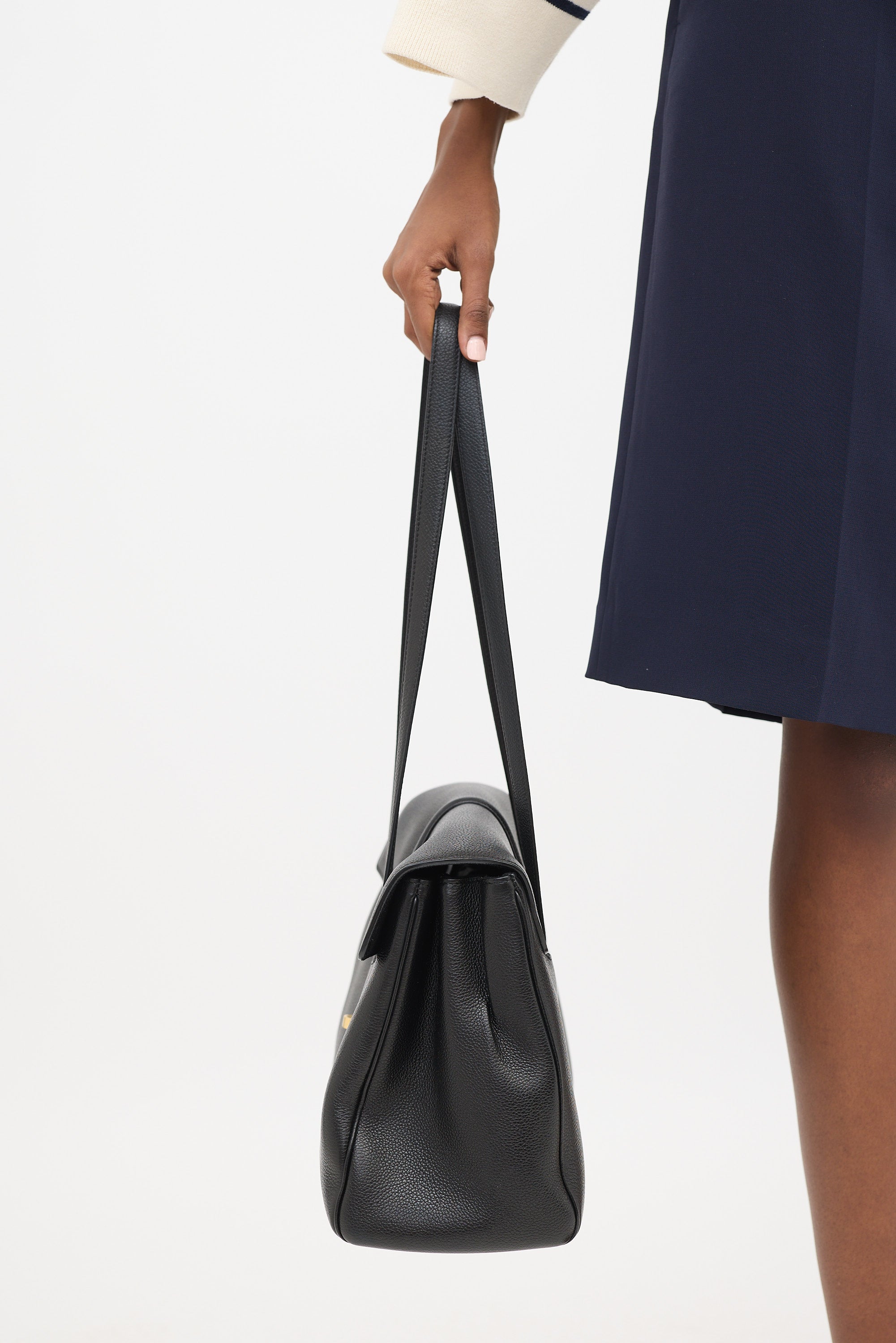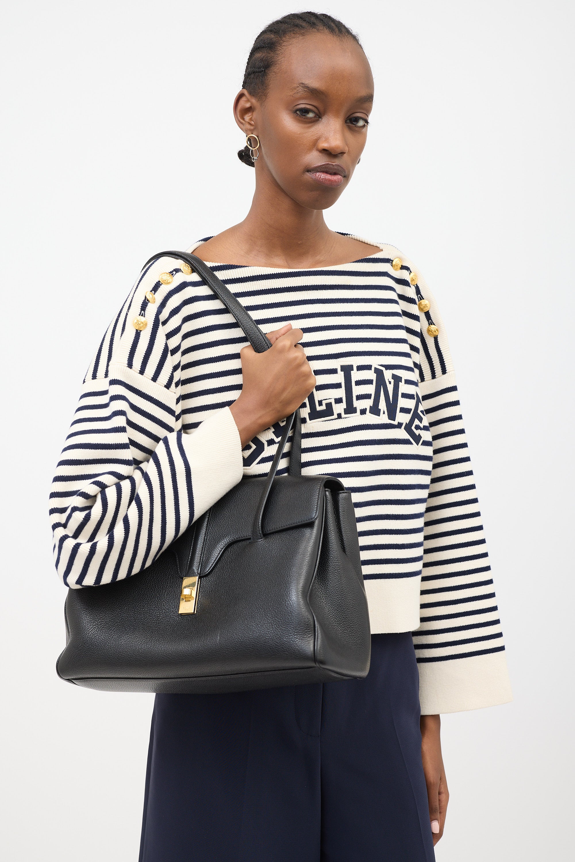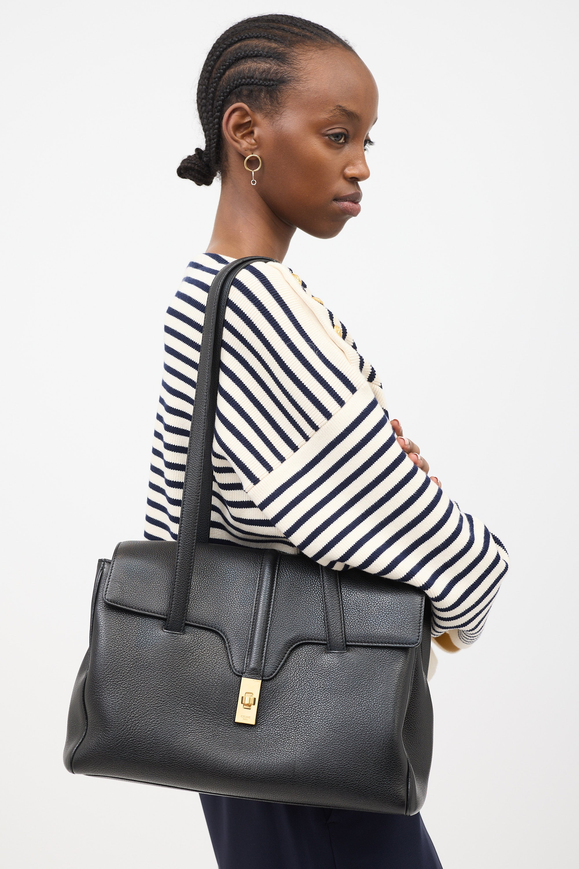 Pre-owned Celine black calfskin leather Soft 16 medium bag featuring dual flat shoulder straps, gold tone hardware, top flap with turn lock closure and debossed logo, stamped foil logo under flap, two main compartments, and suede lining with one interior slip pocket. Comes with original dust bag.
