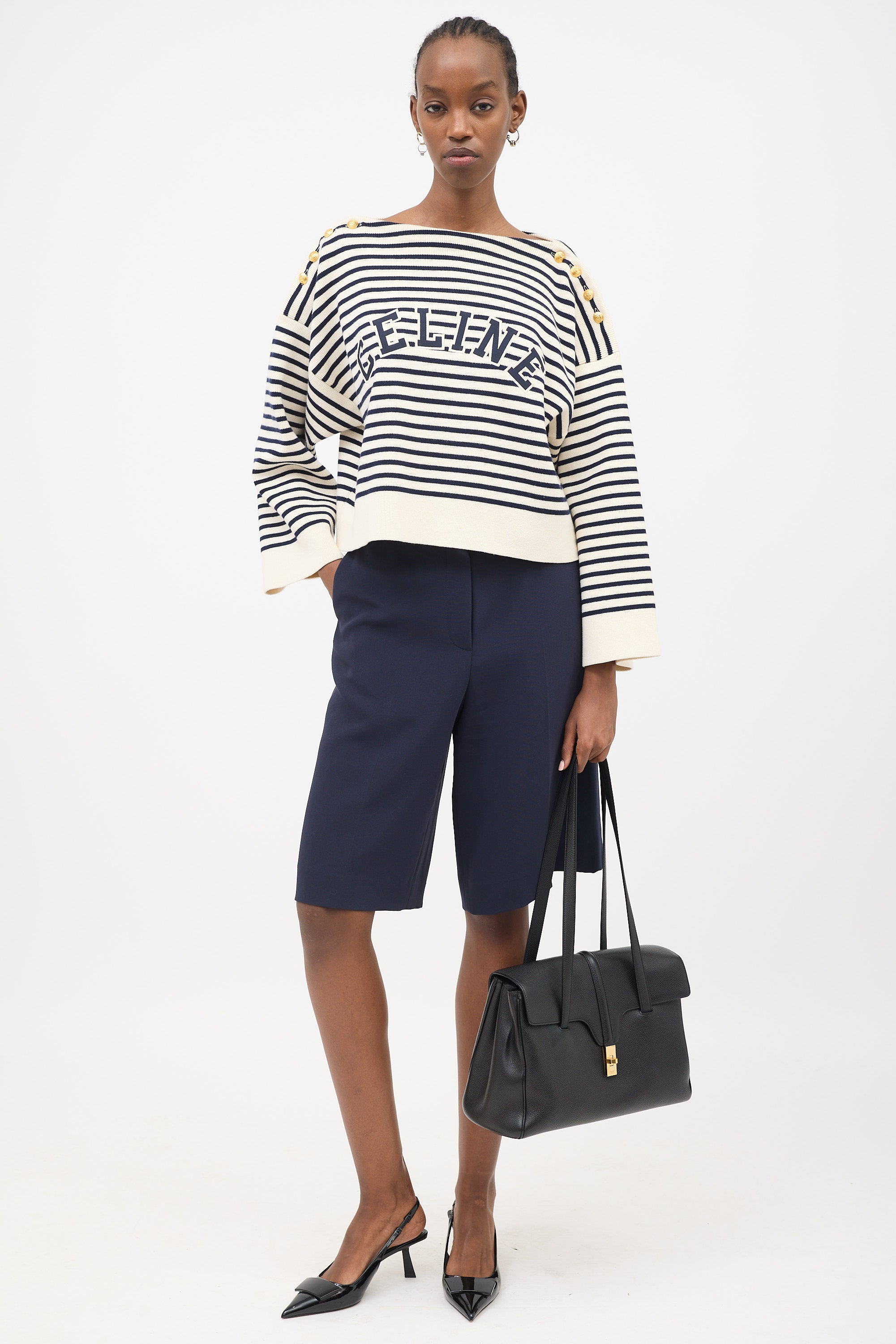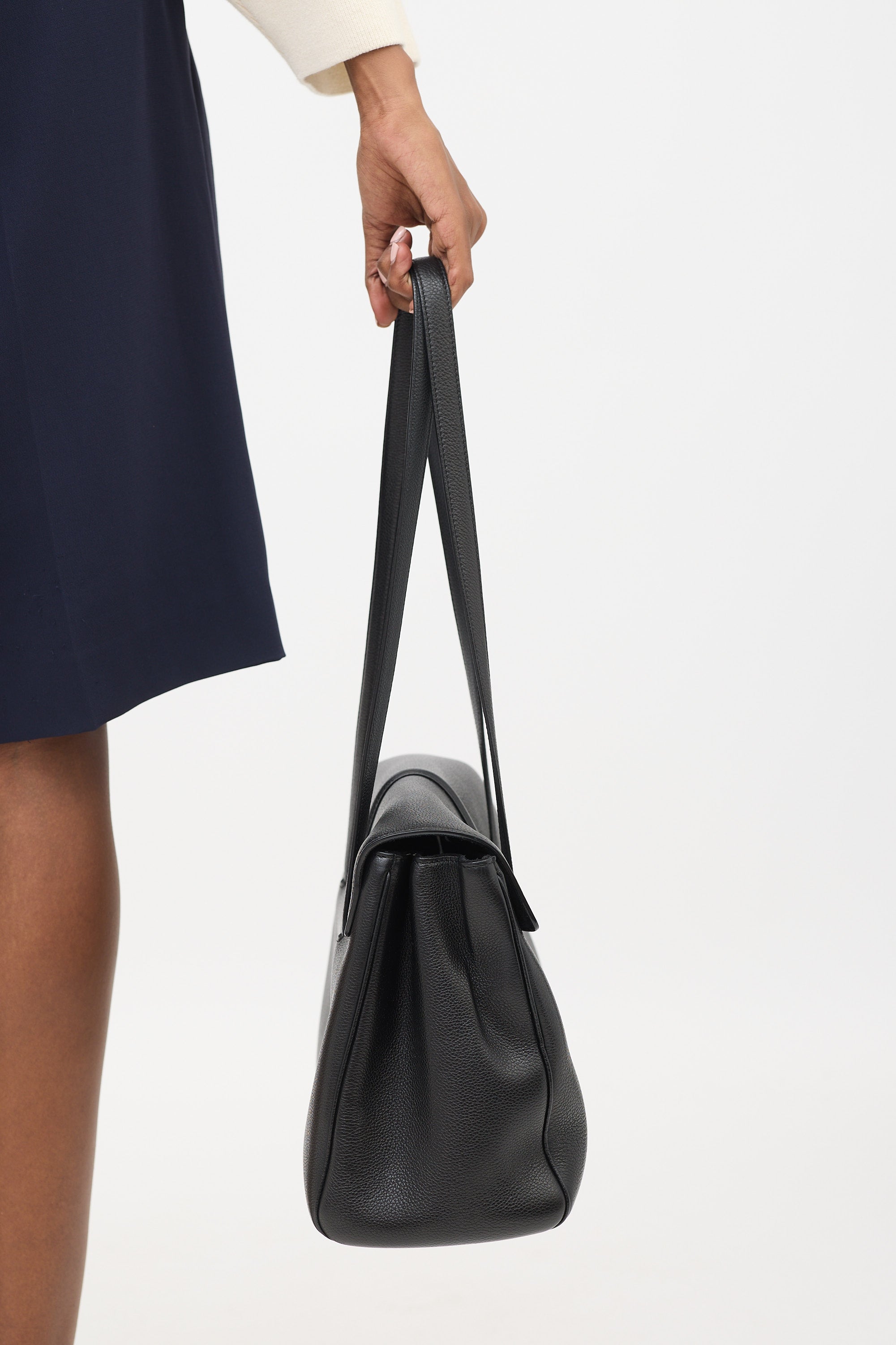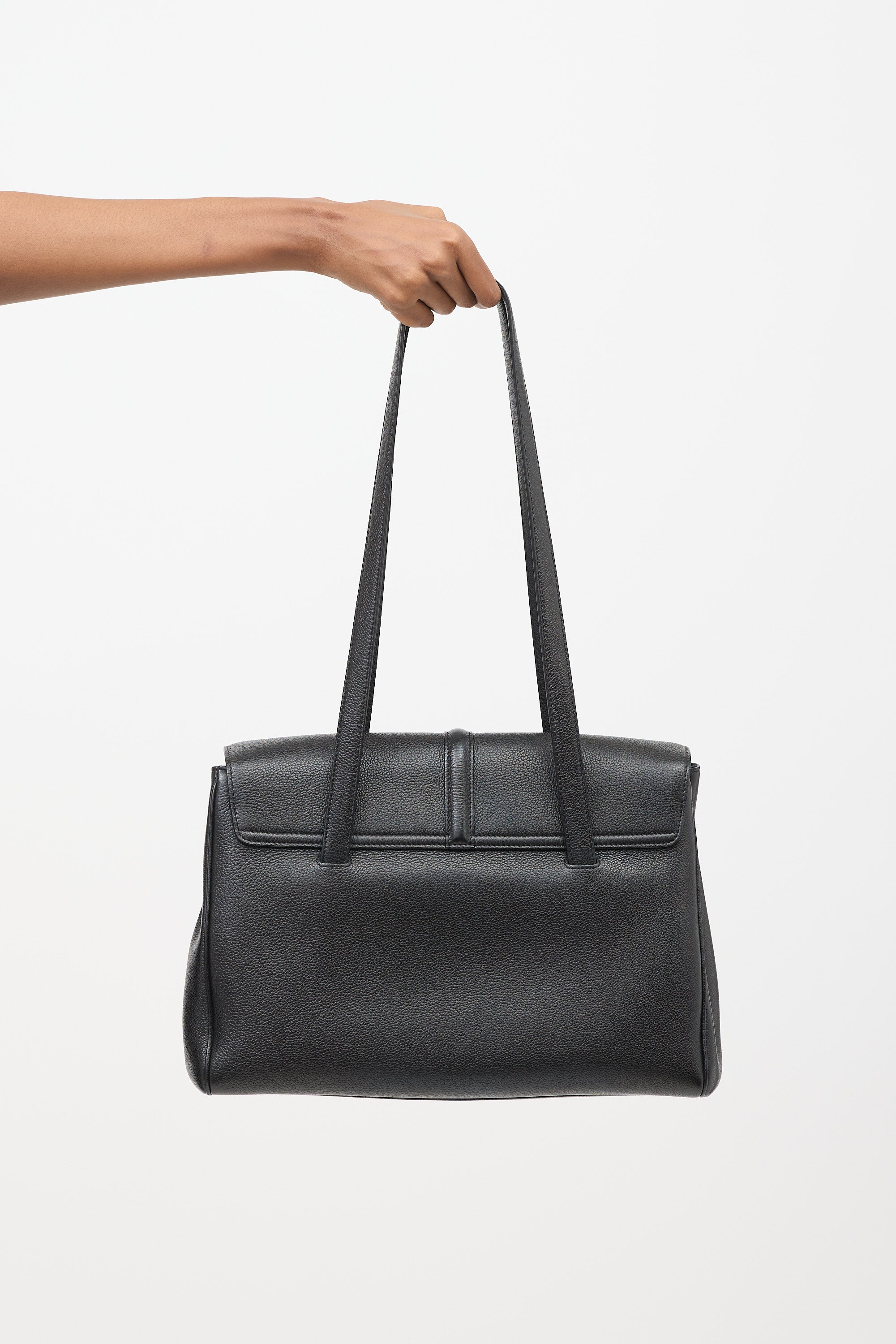 Pre-owned Celine black calfskin leather Soft 16 medium bag featuring dual flat shoulder straps, gold tone hardware, top flap with turn lock closure and debossed logo, stamped foil logo under flap, two main compartments, and suede lining with one interior slip pocket. Comes with original dust bag.