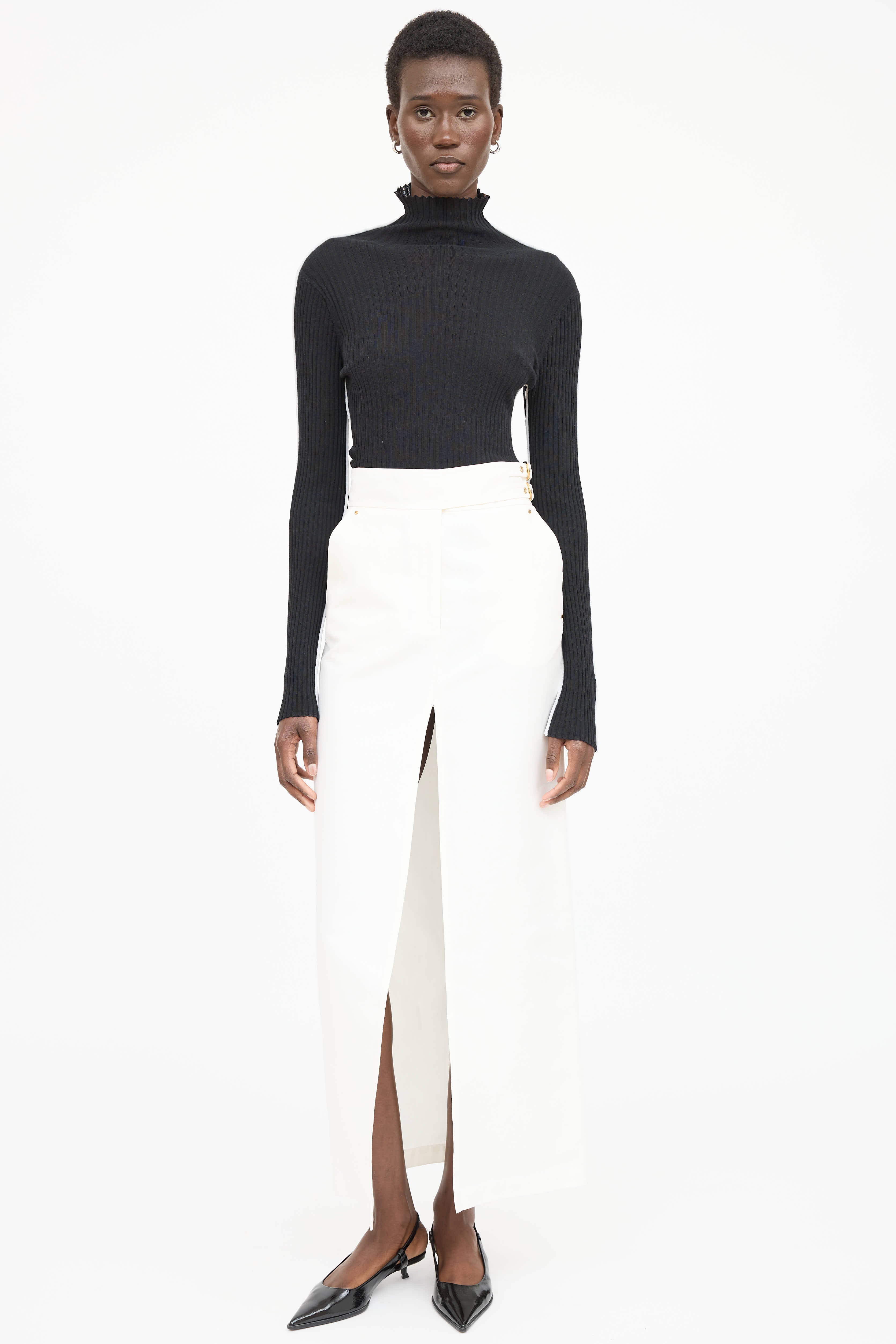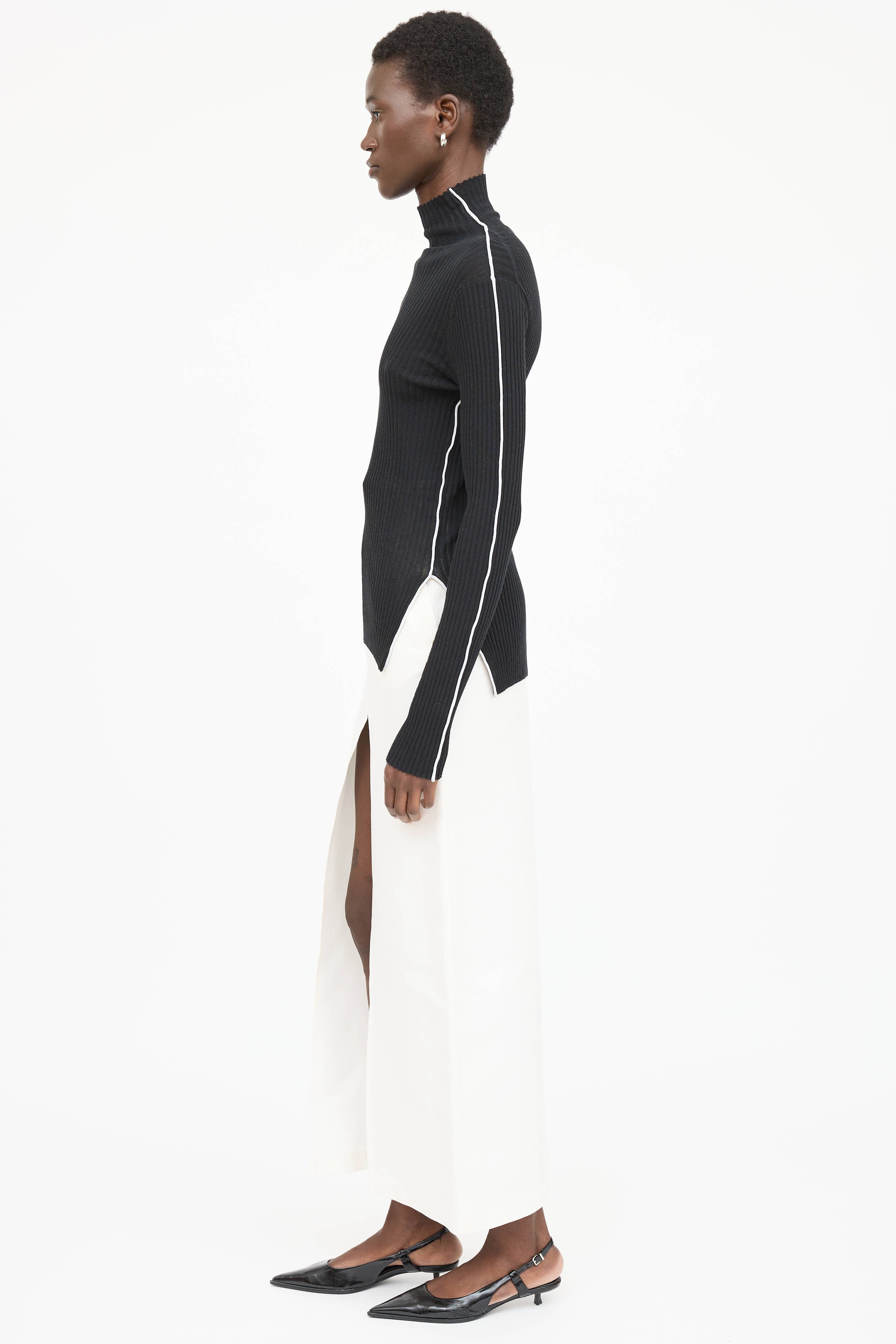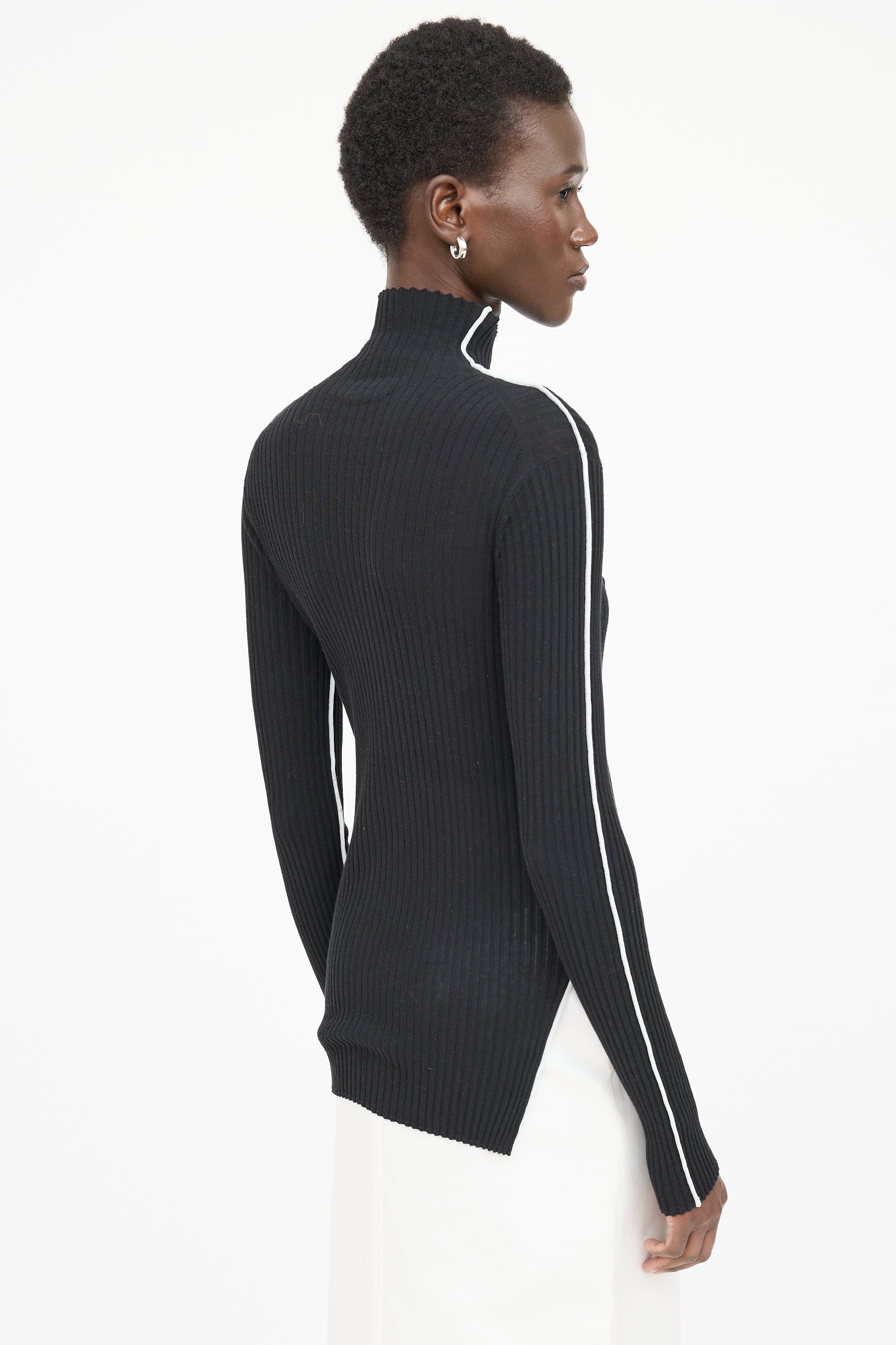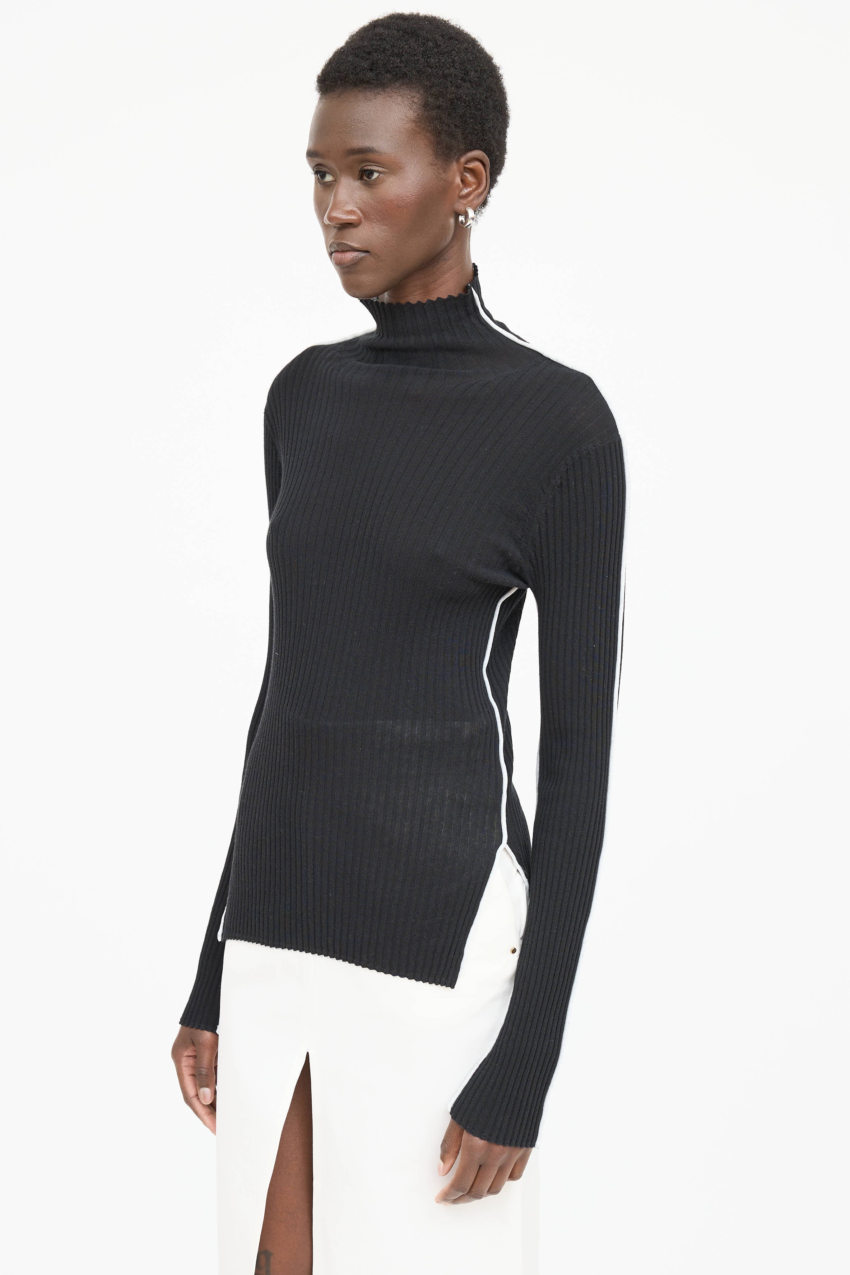 Pre-owned Celine black long sleeve top featuring mock neckline, side slits at hemline, and contrast stitched piping and ribbed throughout.