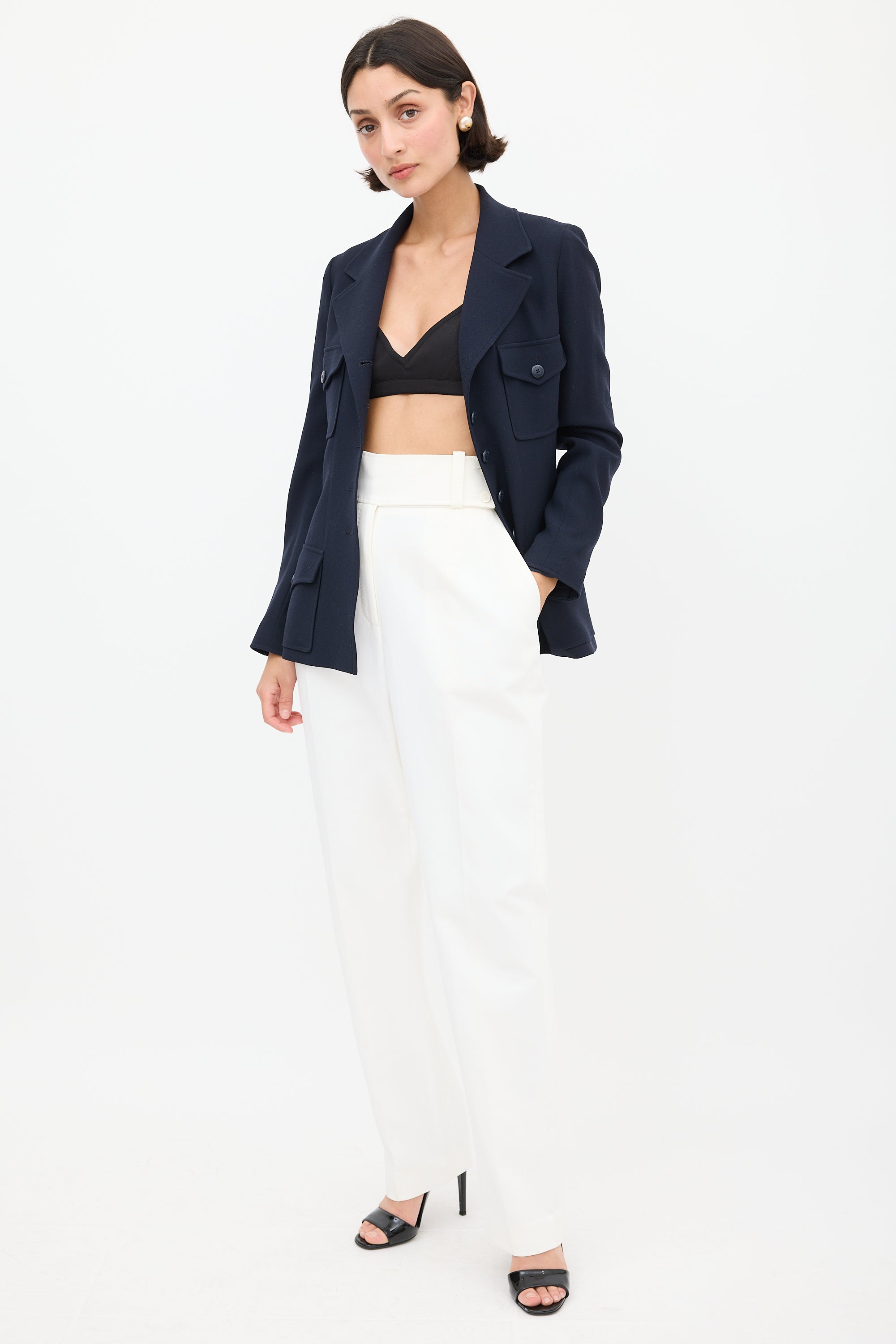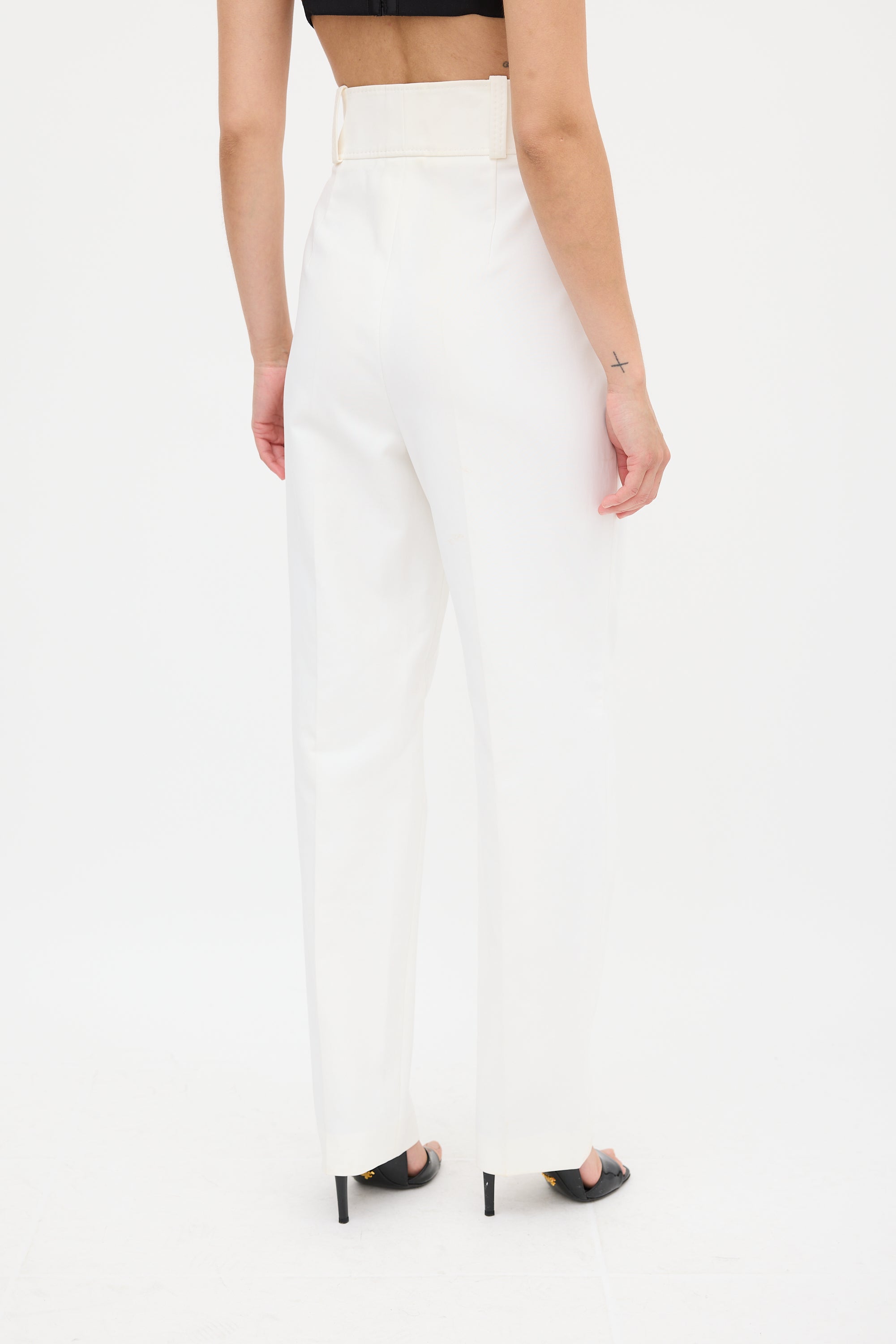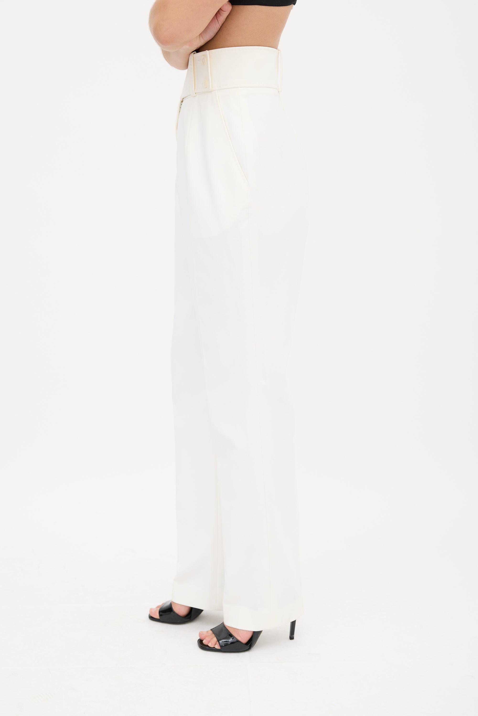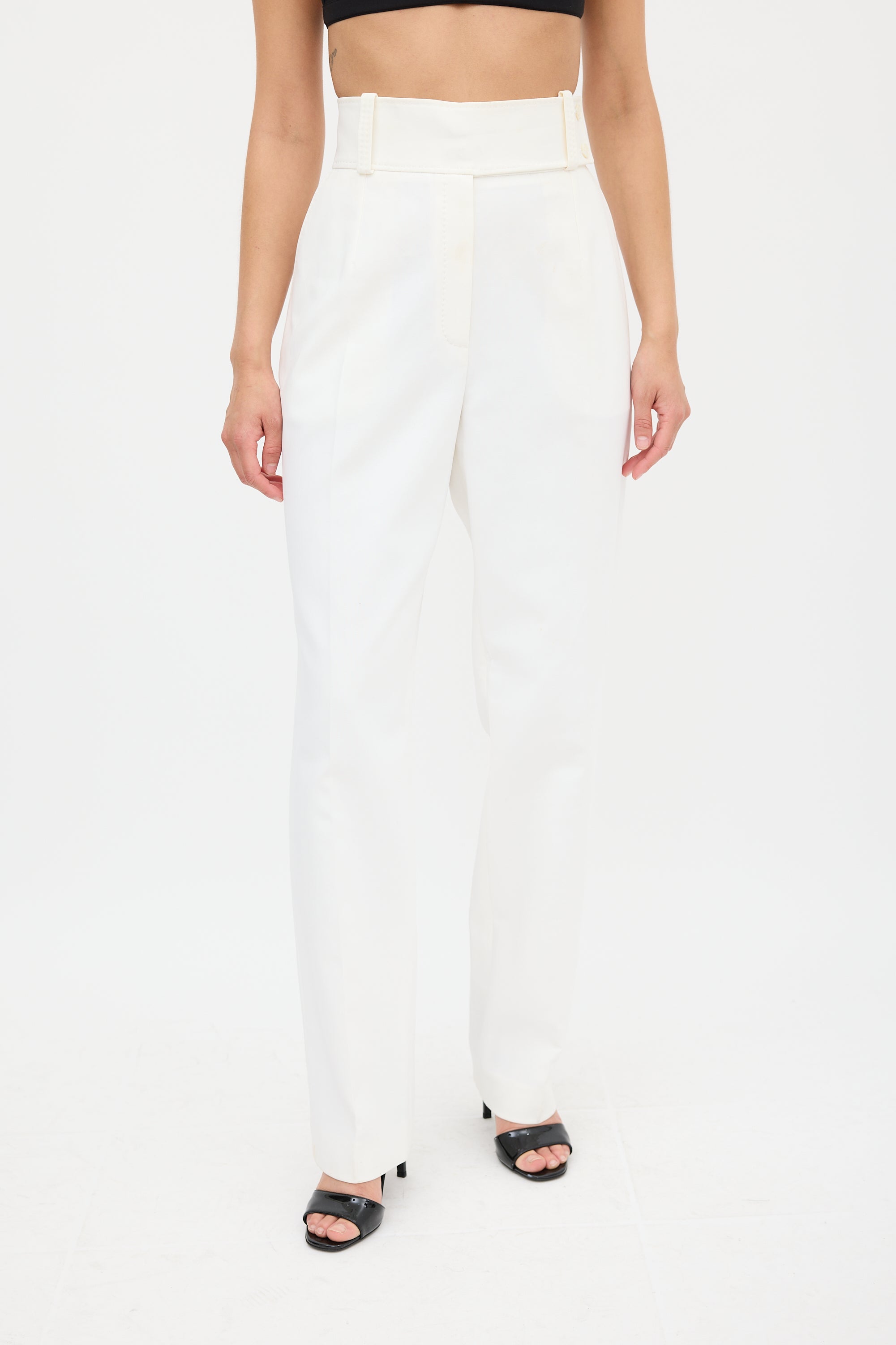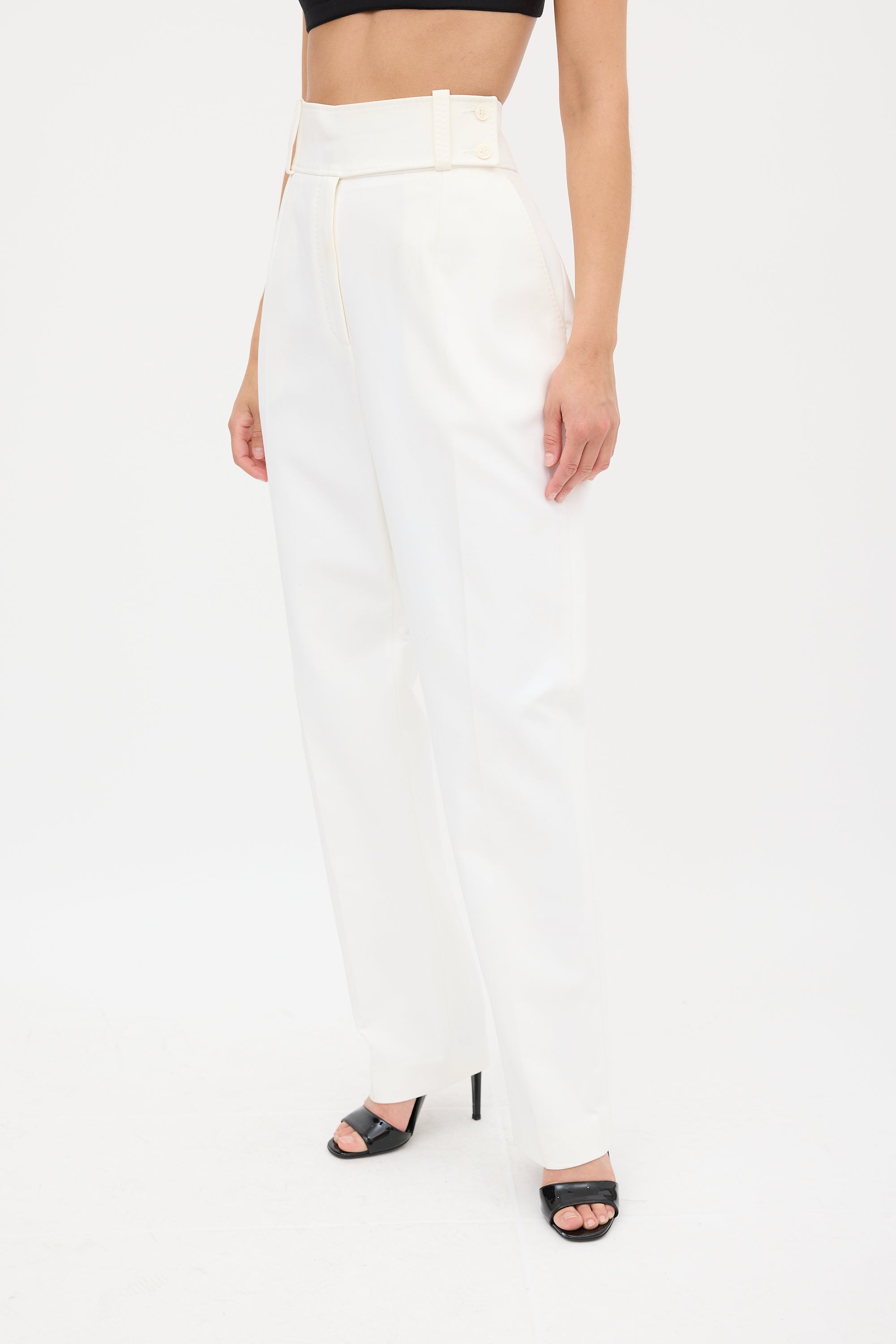 Pre-owned Celine white trousers featuring two slip pockets at hip, centre pleat, tapered leg, and zip fly with button closure.