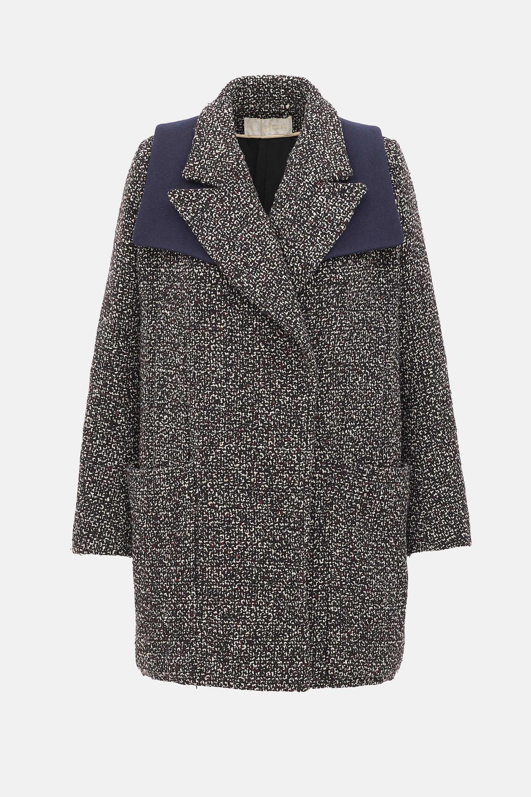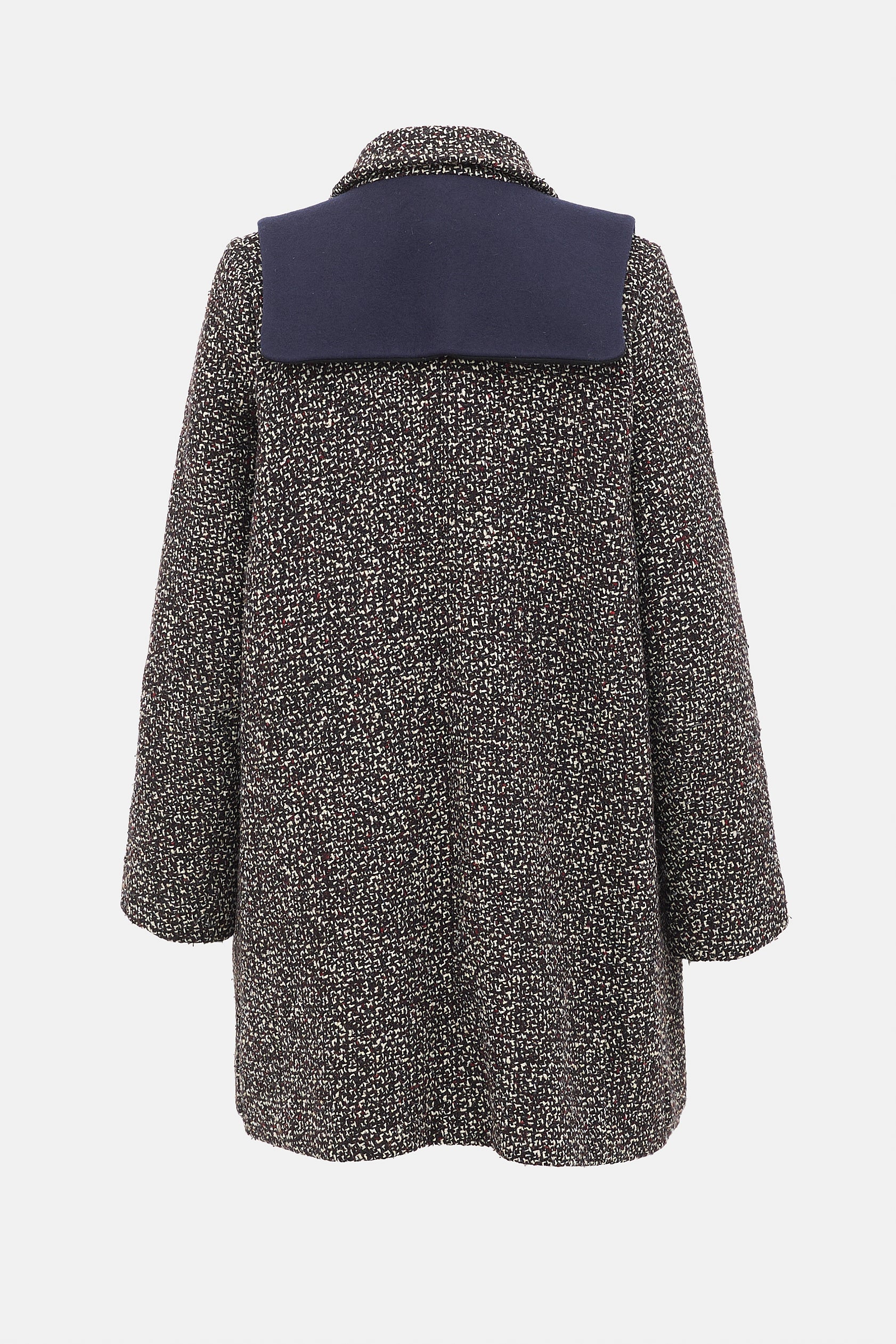Pre-owned Chloé Fall Winter 2013 black, white, and red wool tweed coat featuring a notched lapel, navy sailor flap at front and back, concealed snap button closure, and two patch pockets at hip. Lined.
