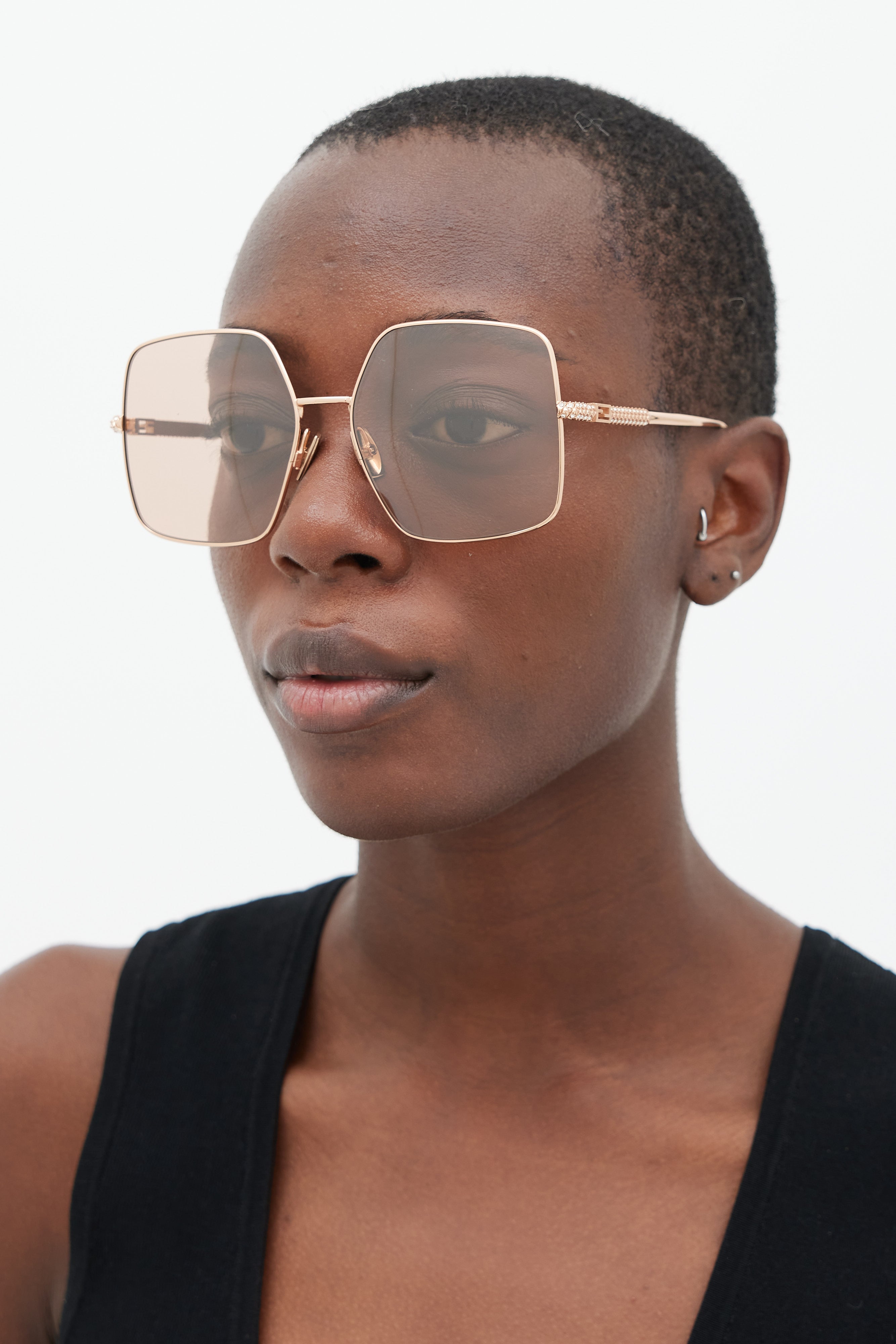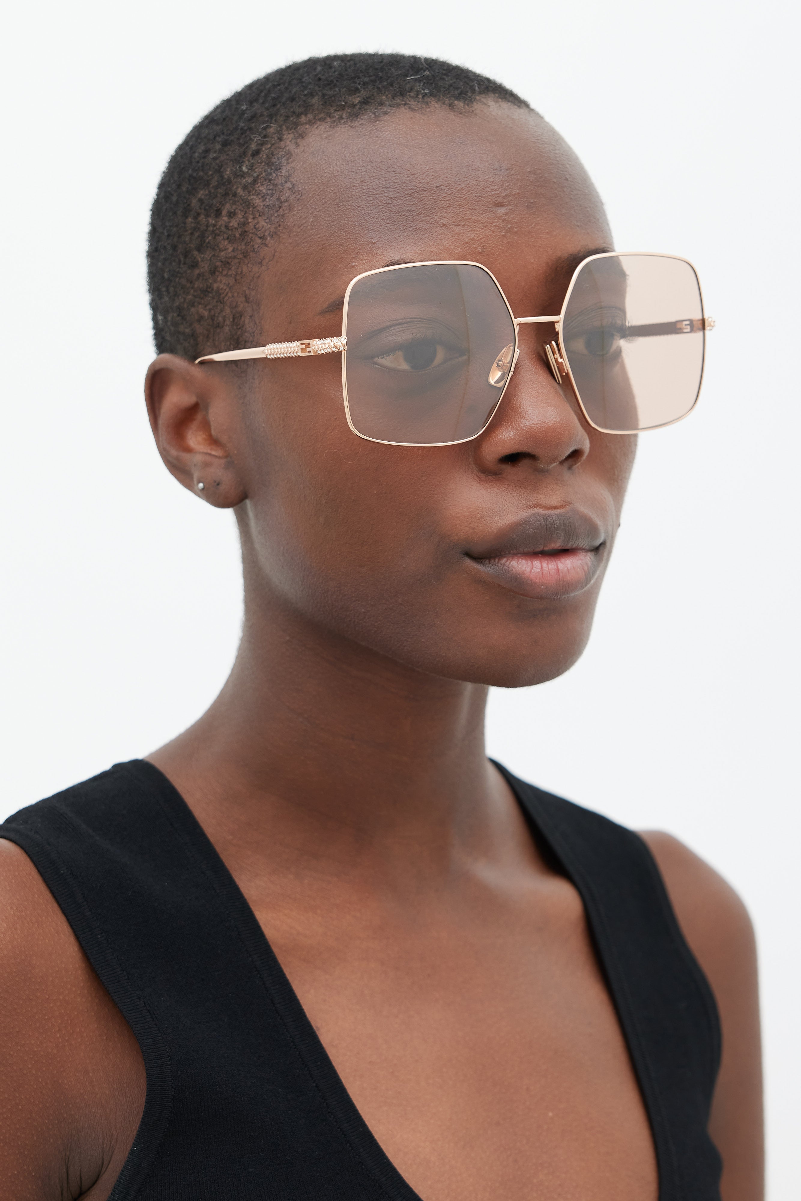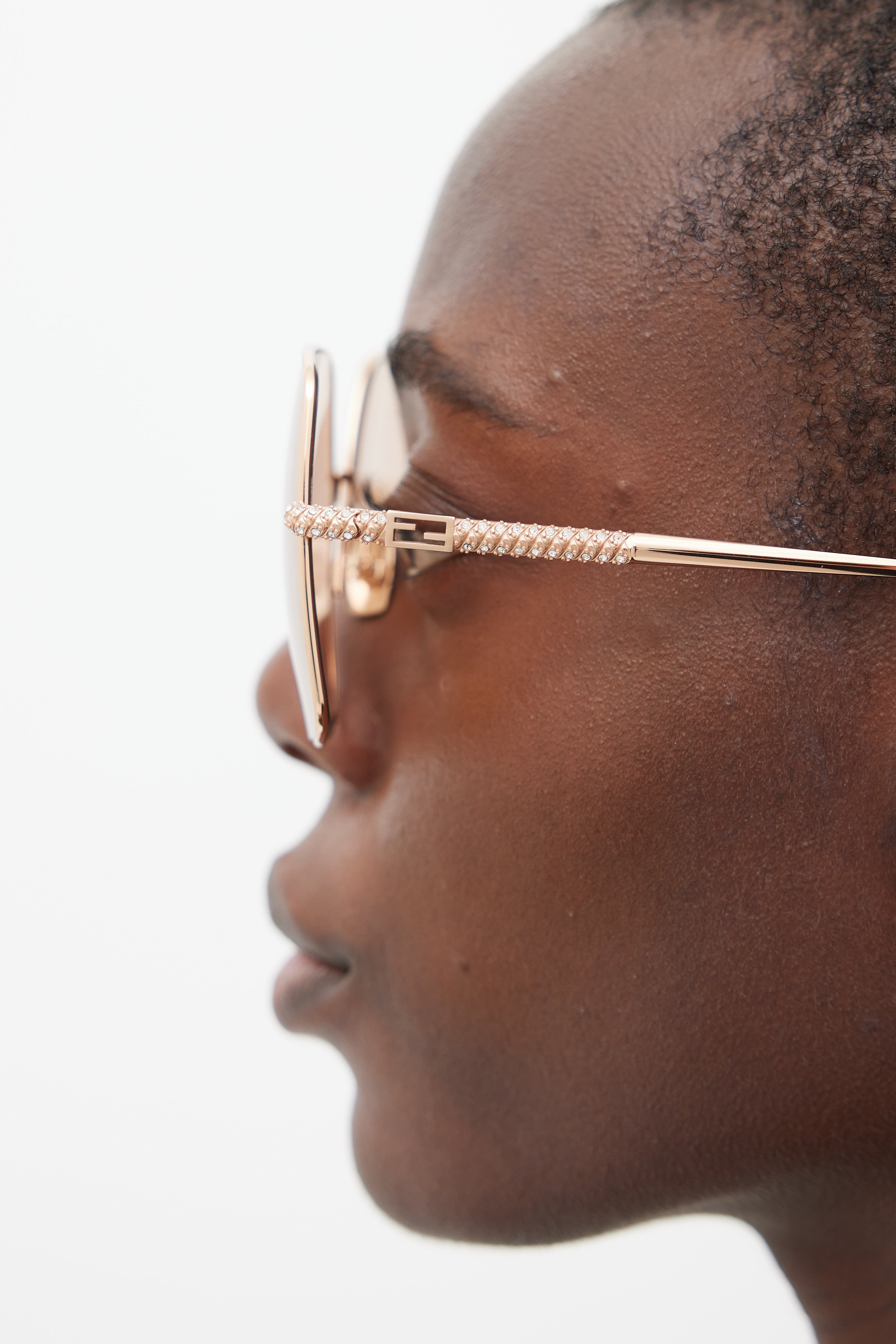 Pre-owned Fendi FF 0439/S sunglasses featuring rose gold tone metal square frame, pink lenses, and diamond encrusting and logo cutout at temple. Comes with original case.