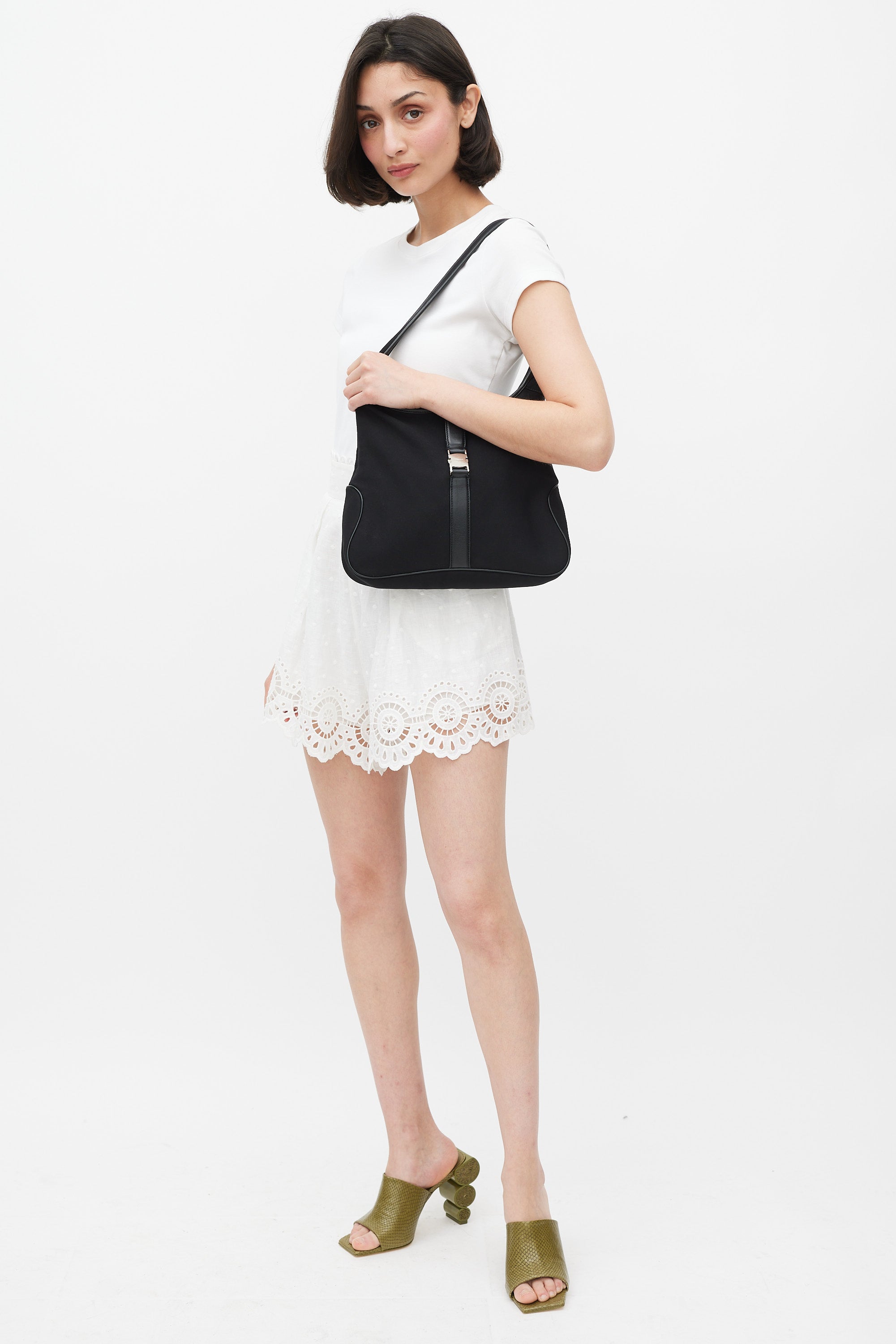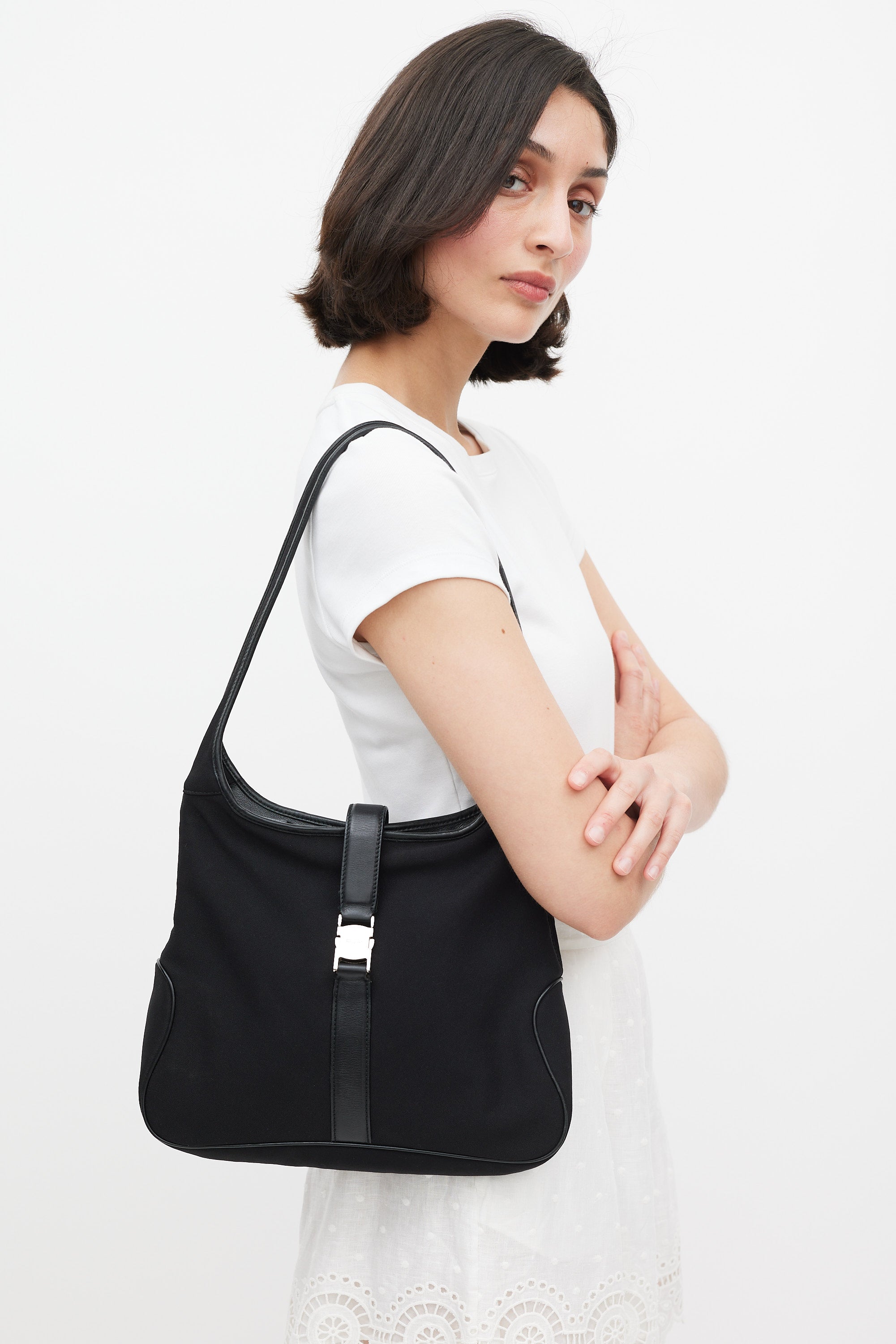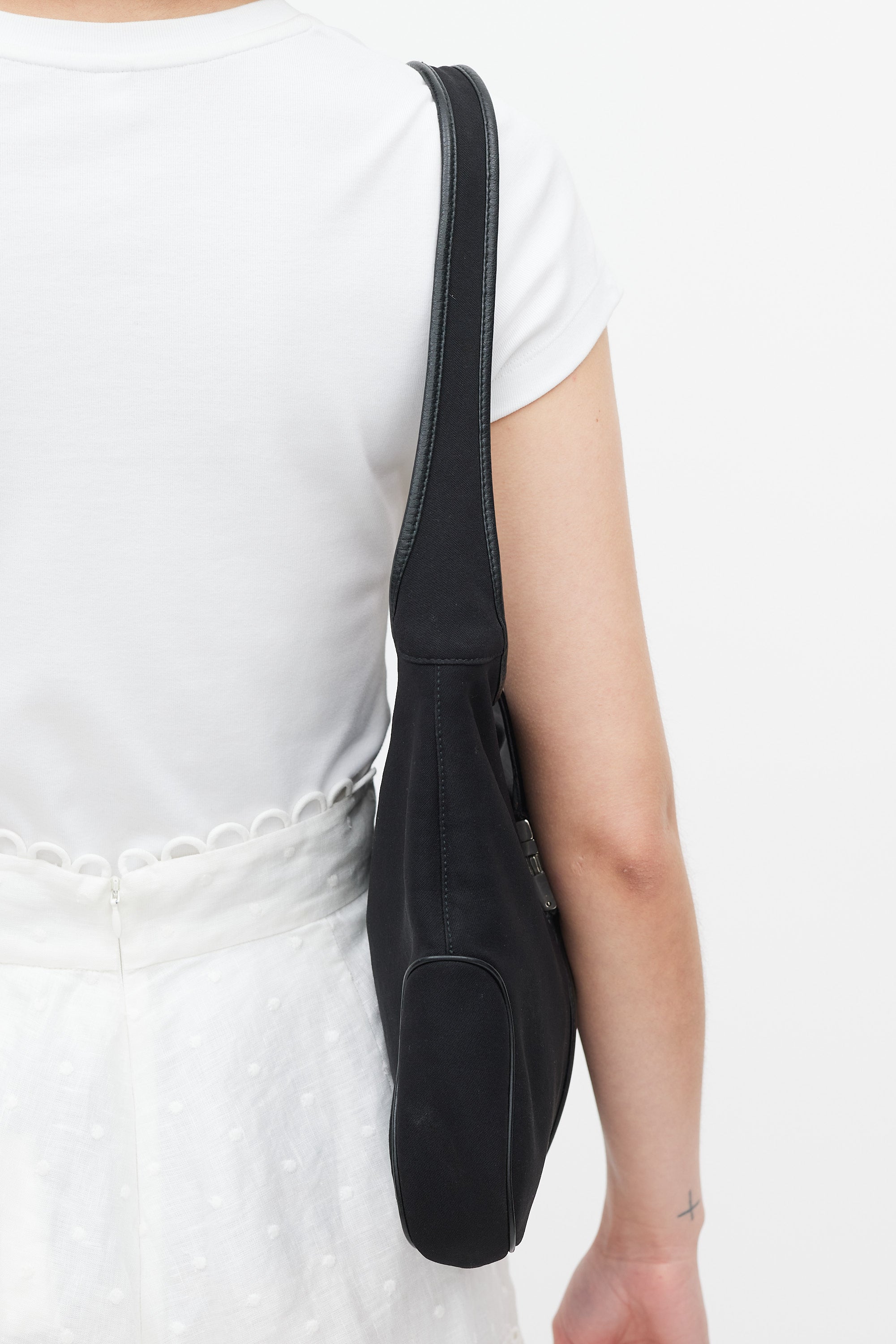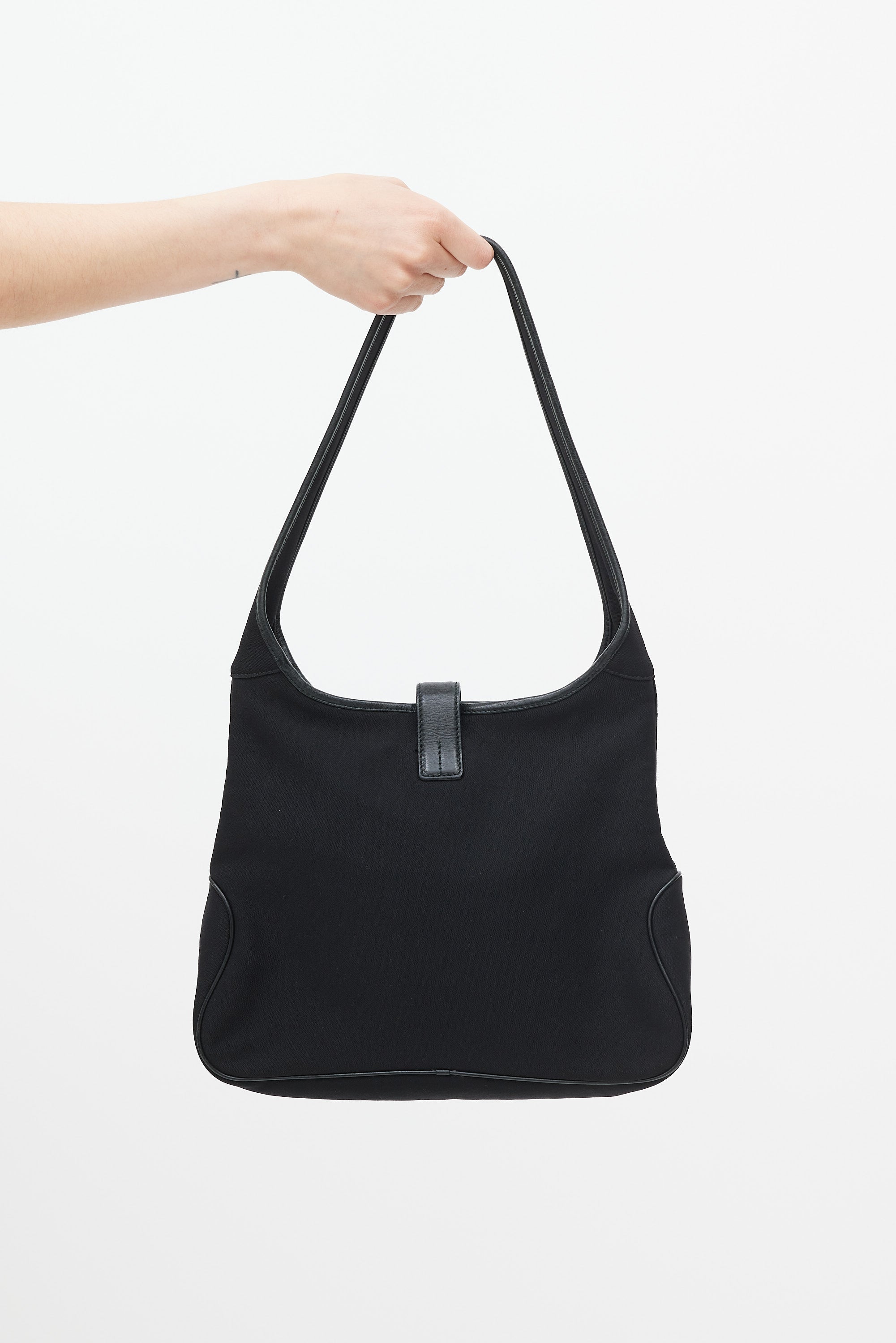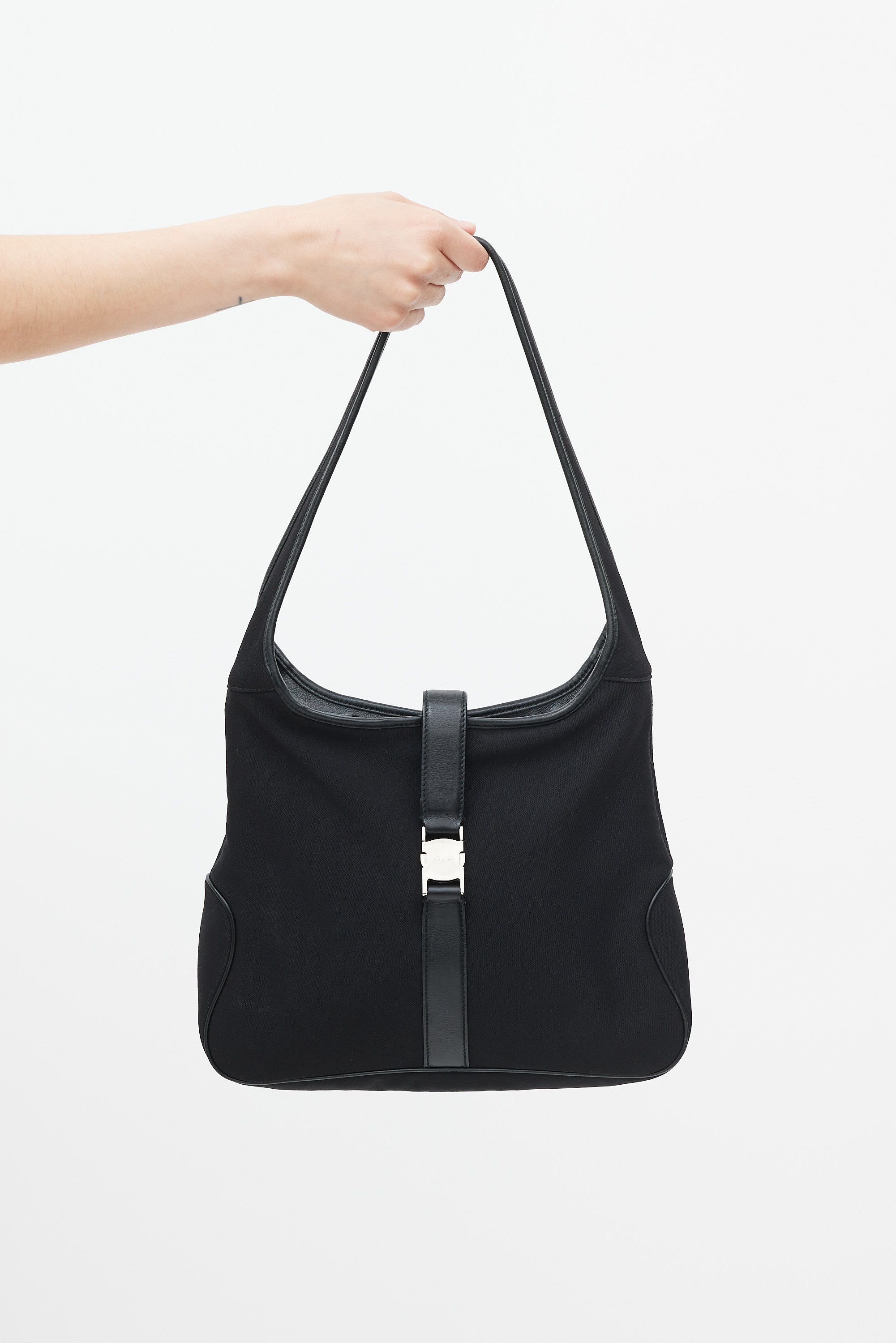 Pre-owned Ferragamo black bag featuring flat top handle, leather piping and trim throughout, strap across front with silver tone buckle with engraved logo, top zip closure, and one lined main compartment with single zip pocket.