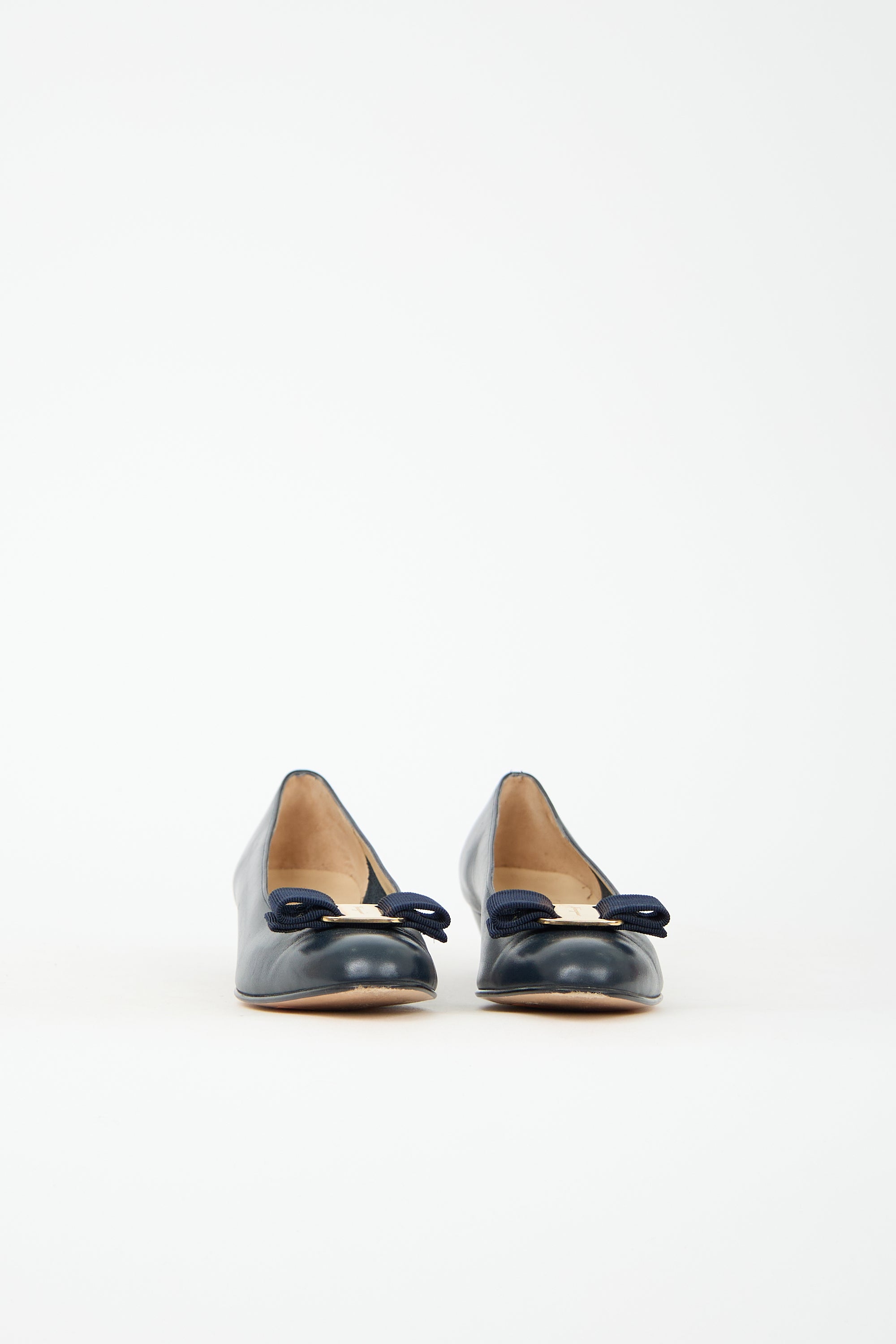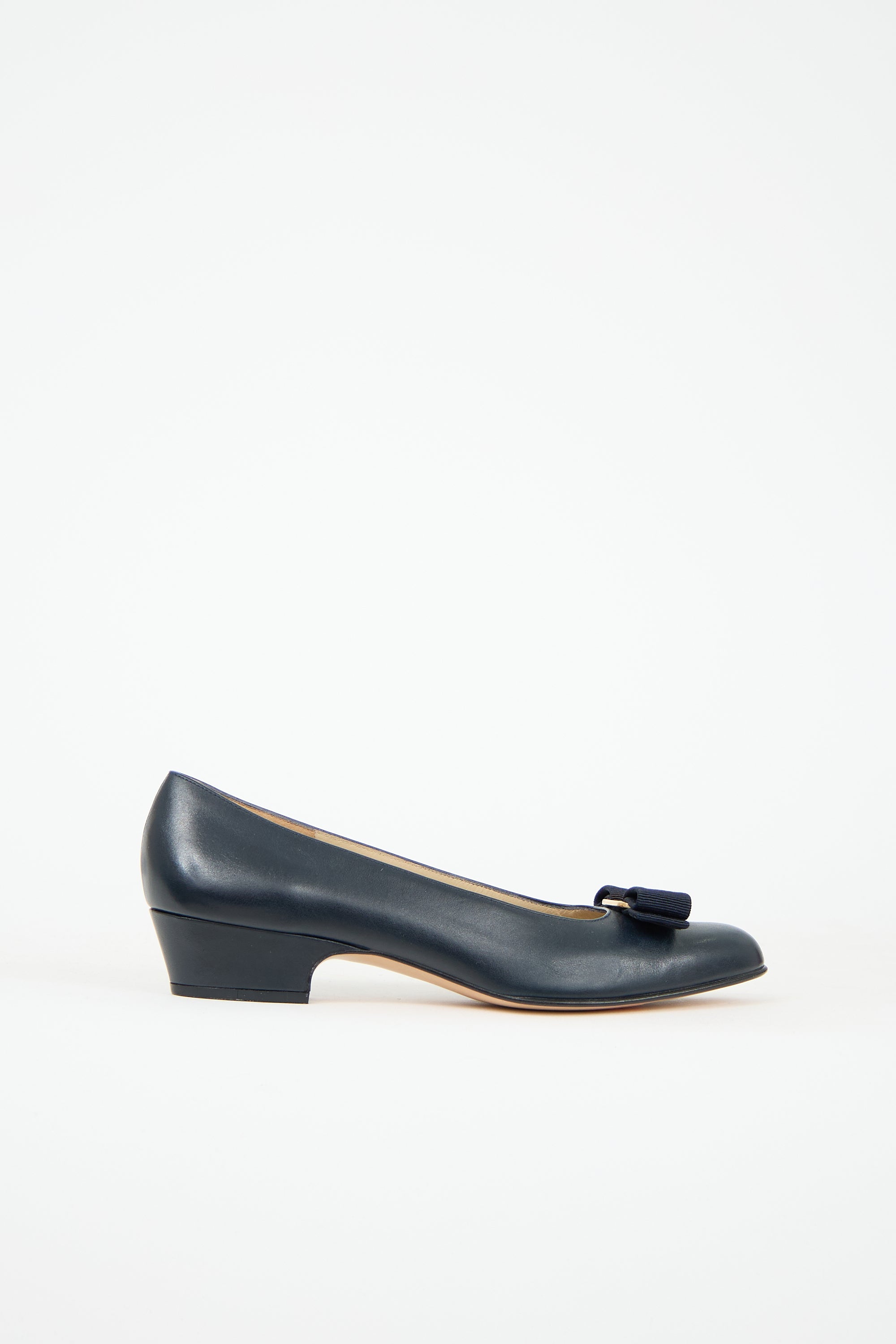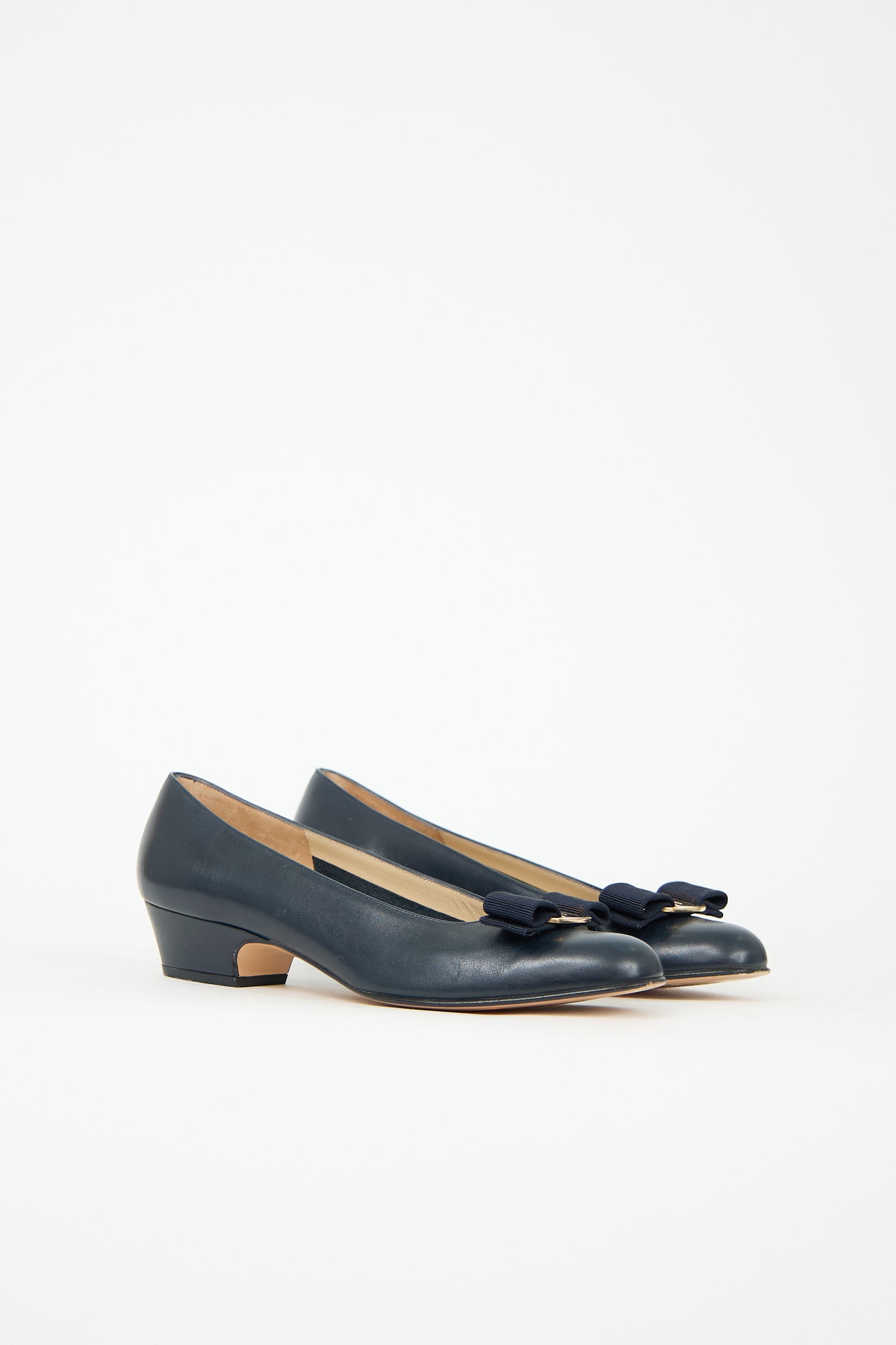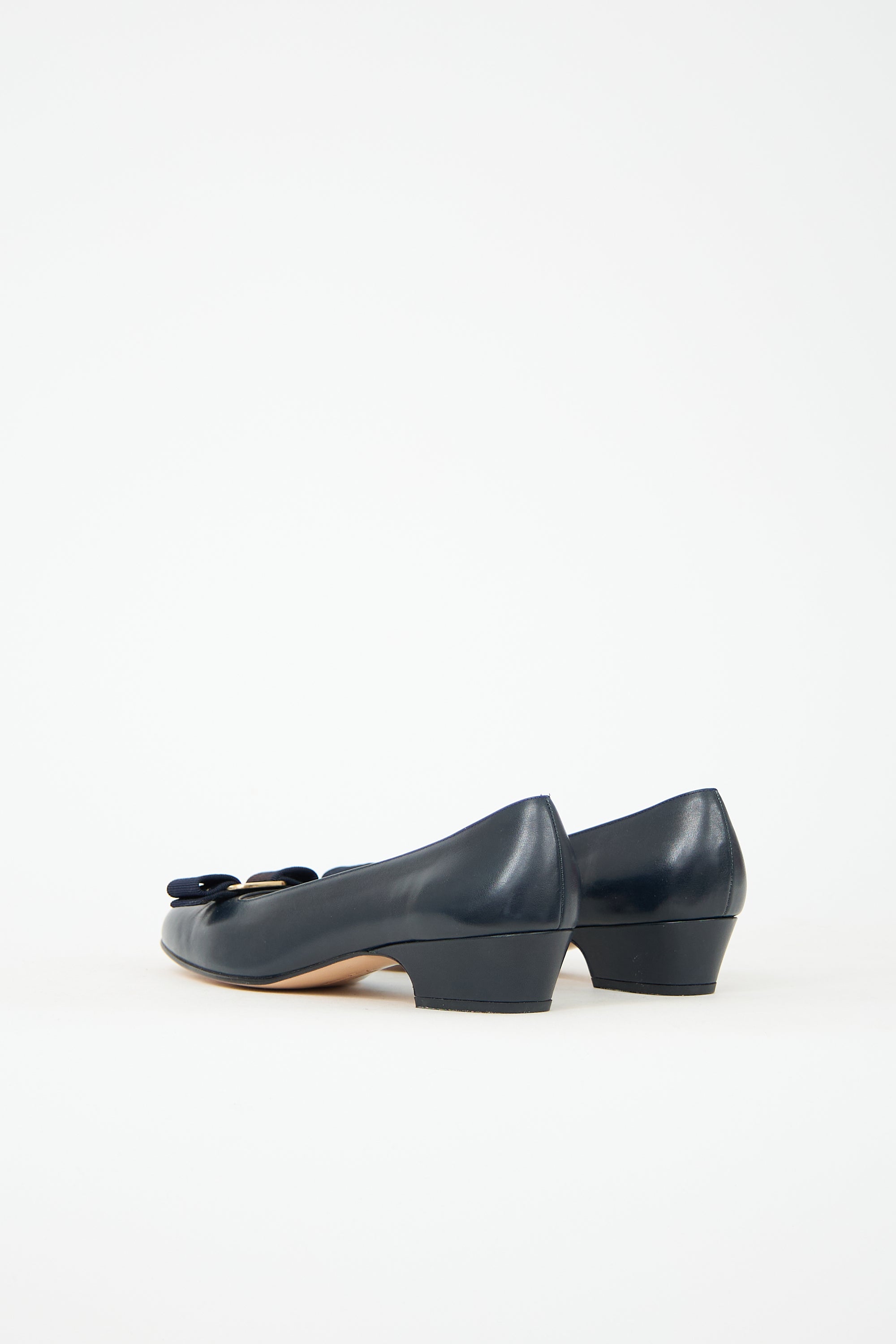Pre-owned Ferragamo black leather Vara pumps featuring a rounded toe, bow and gold tone hardware at toe, slip on entry, and short block heel.