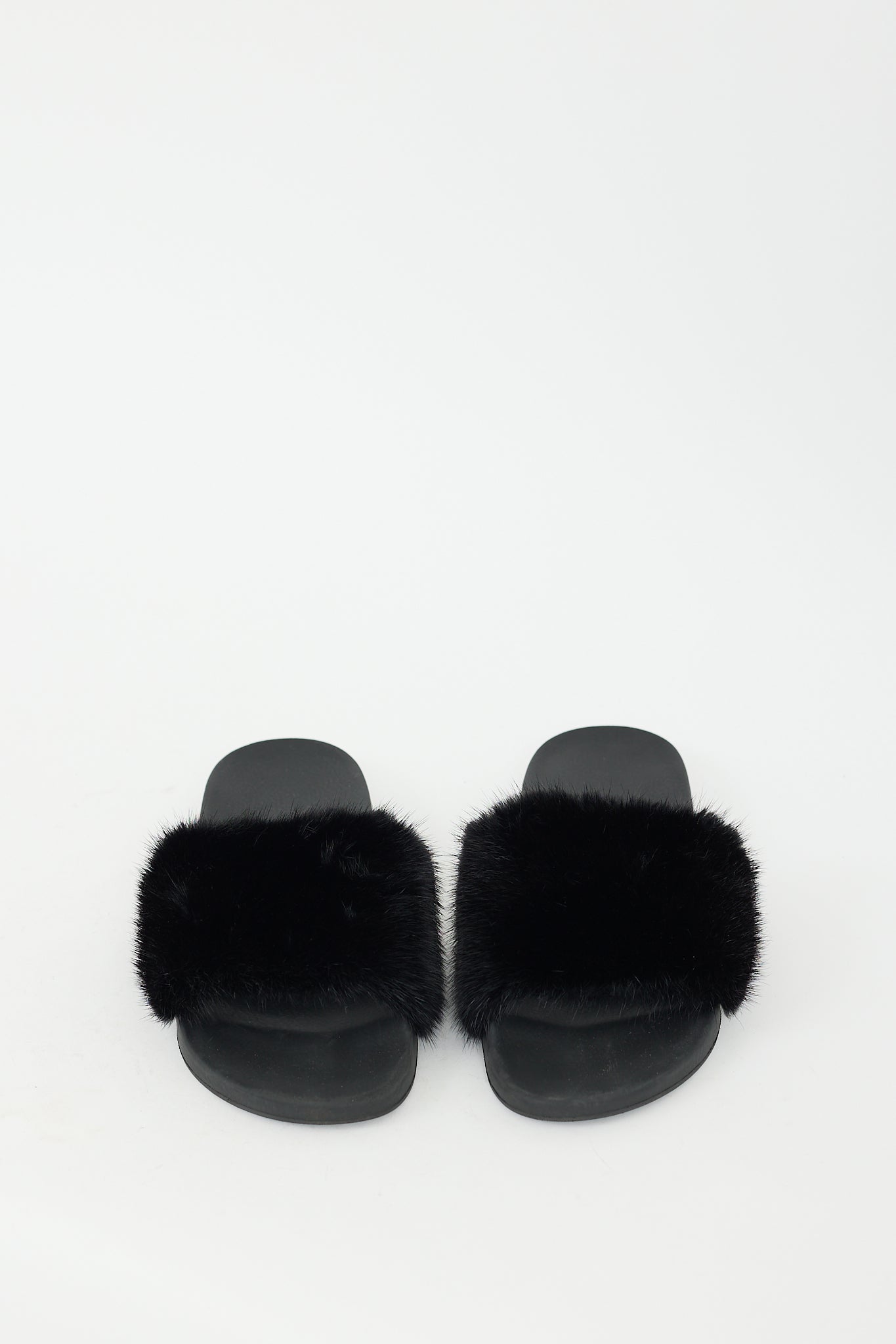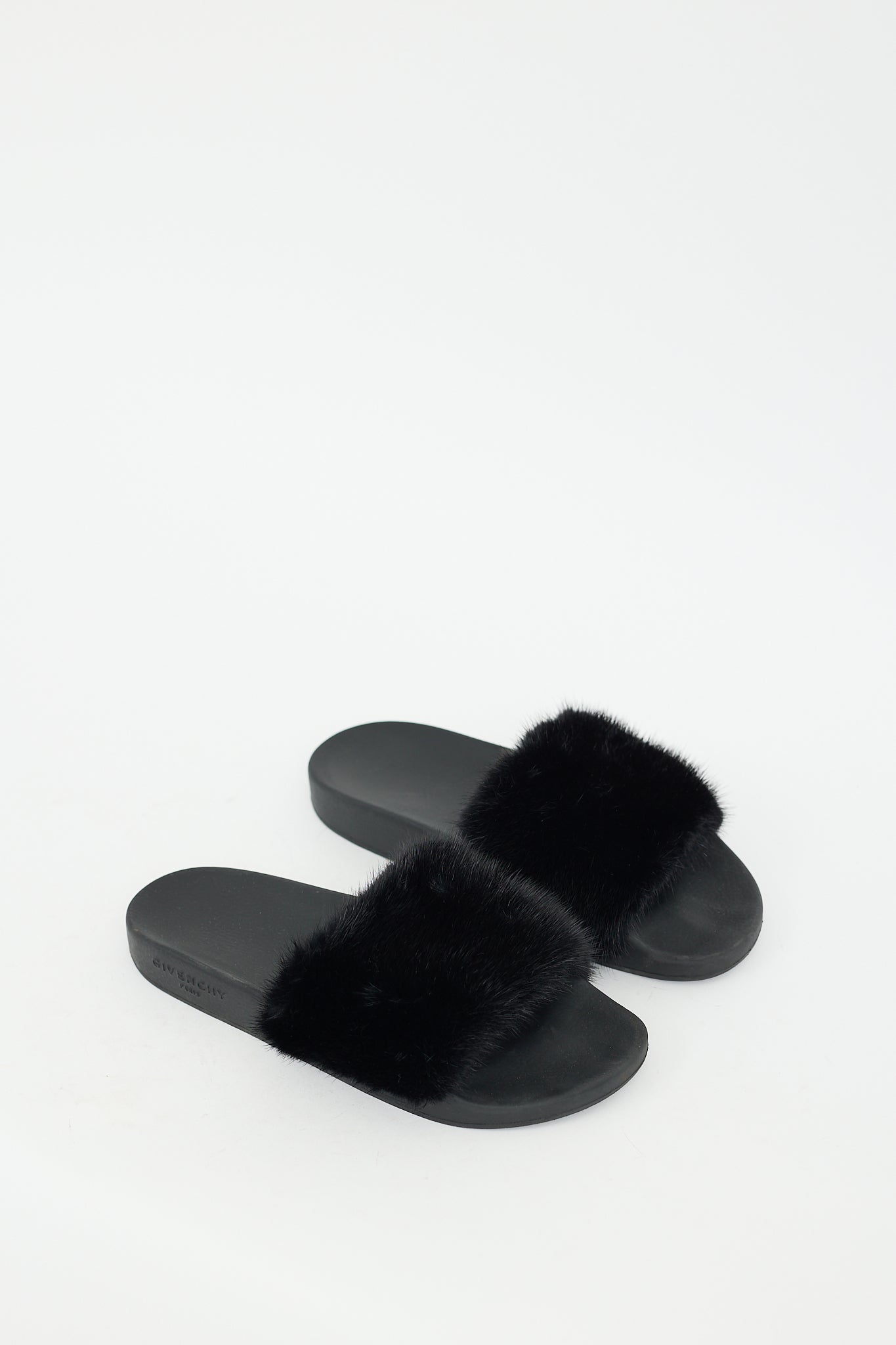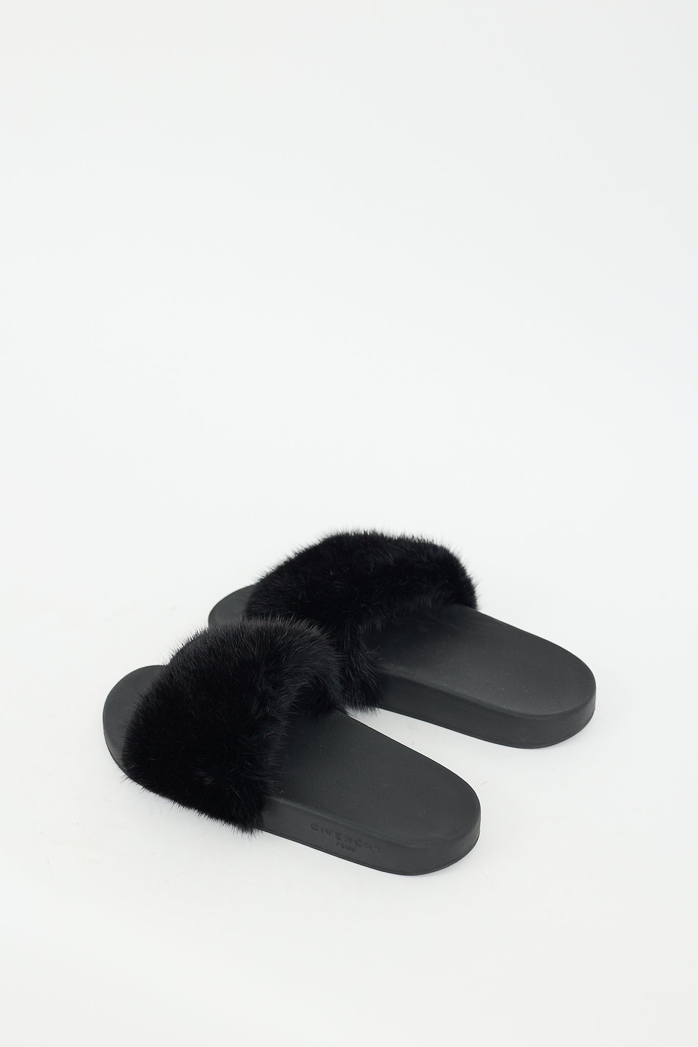 Pre-owned Givenchy black slides featuring a rubber base, rounded toe, embossed logo at outer quarter, and wide mink fur strap across vamp.