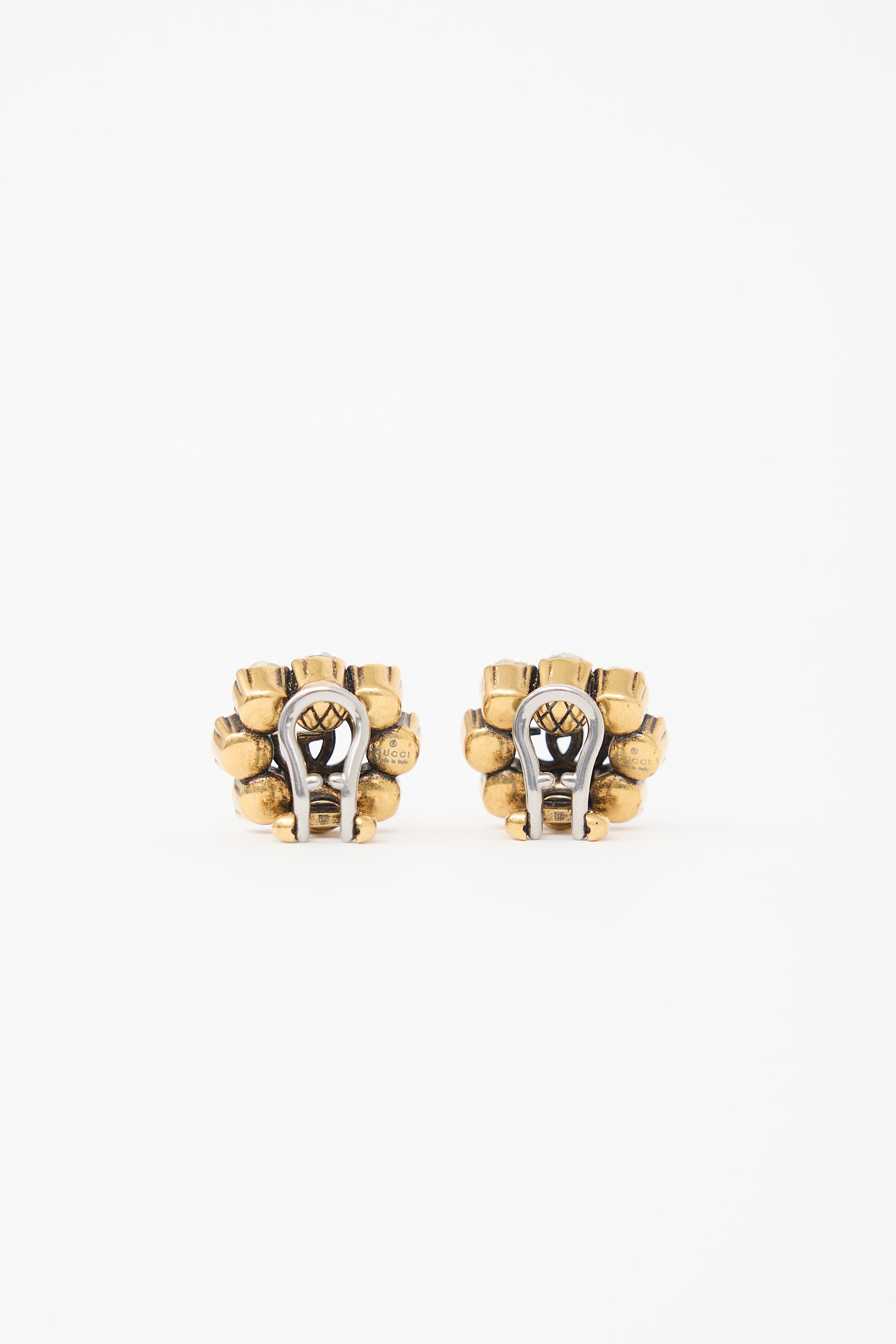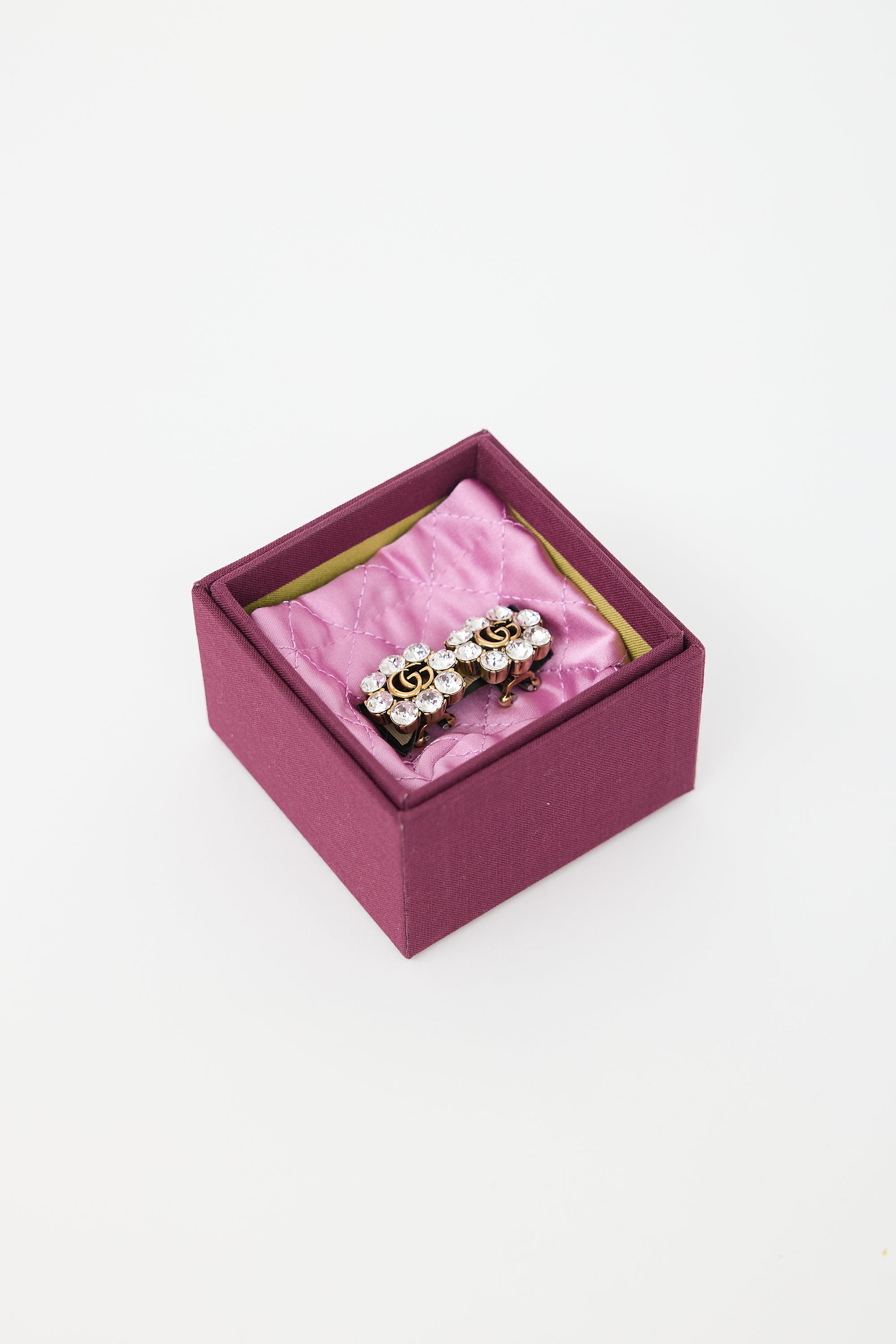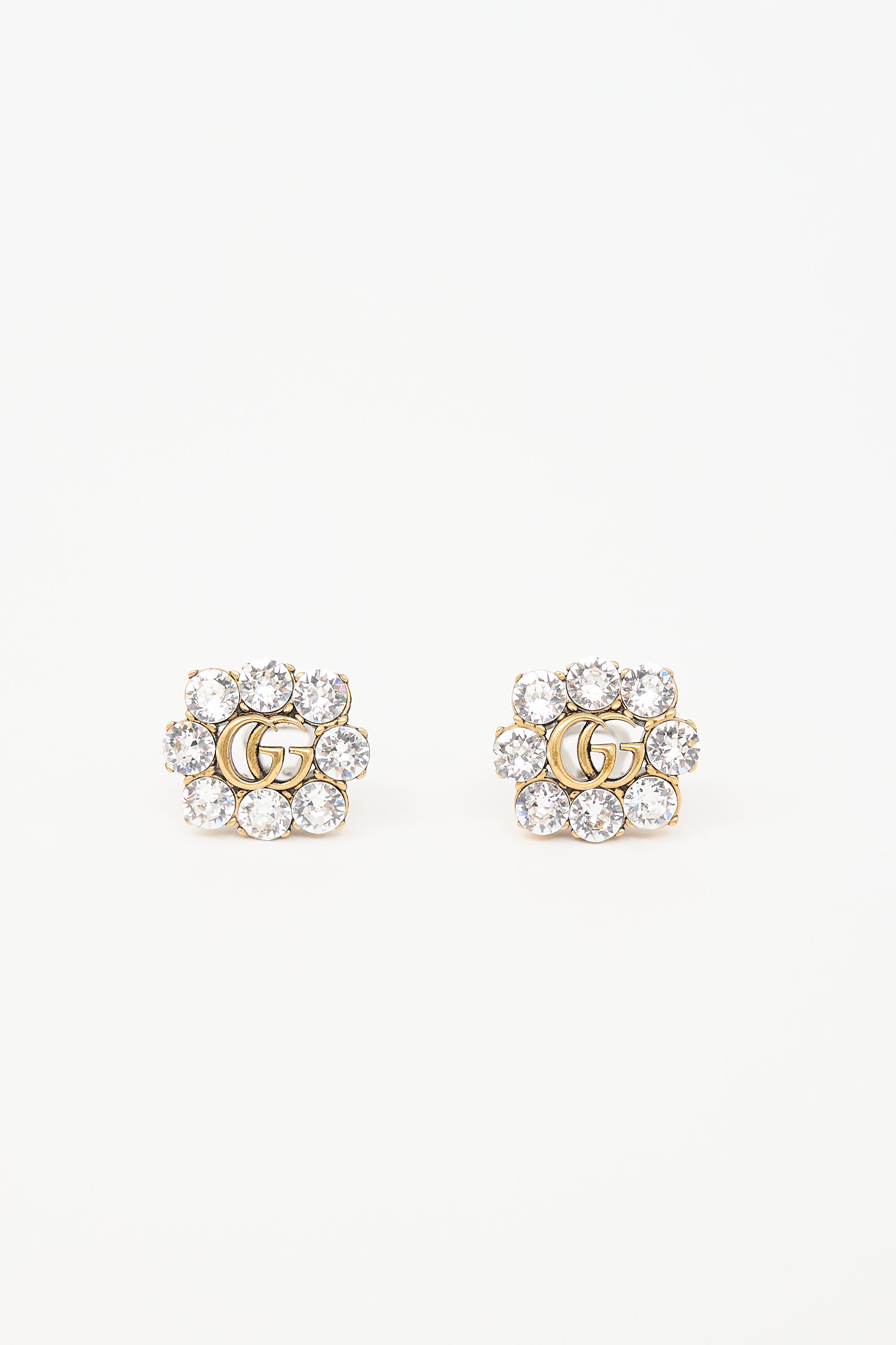 Pre-owned Gucci gold earrings featuring crystal embellishment, double GG logo, and clip on closure. Includes original dust bag and box.