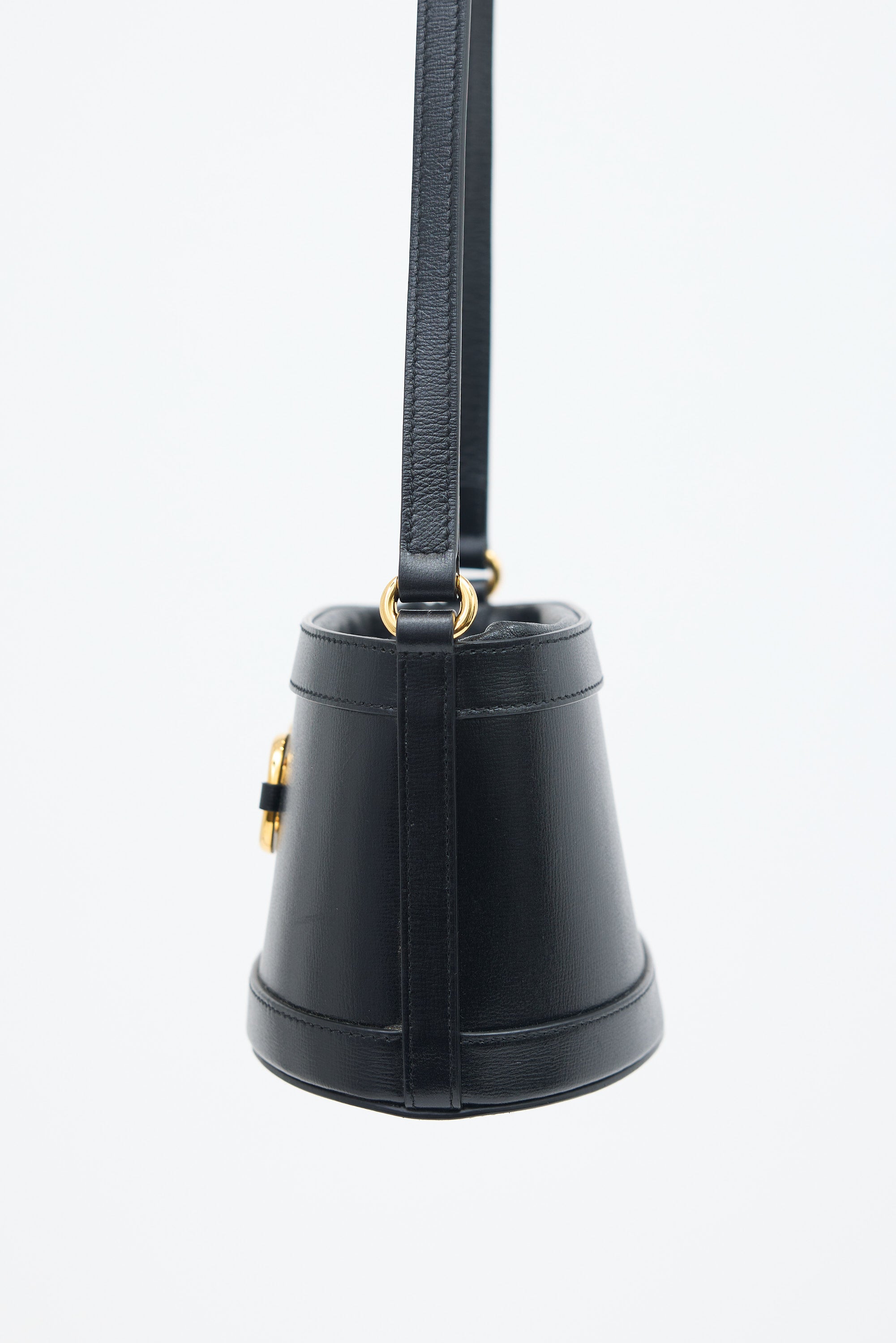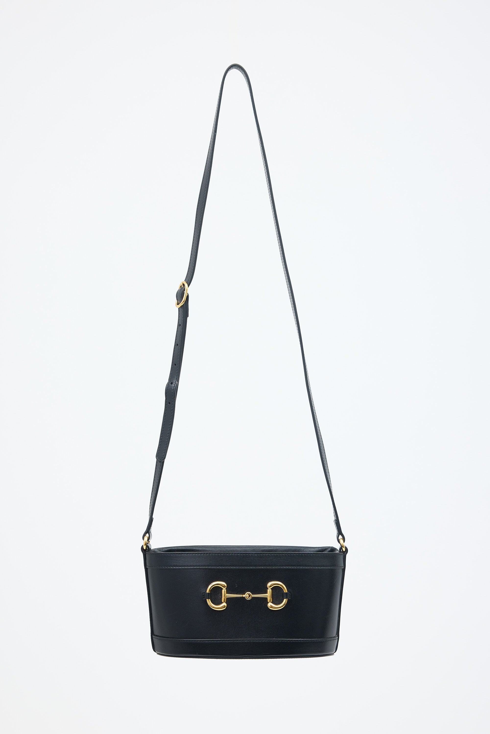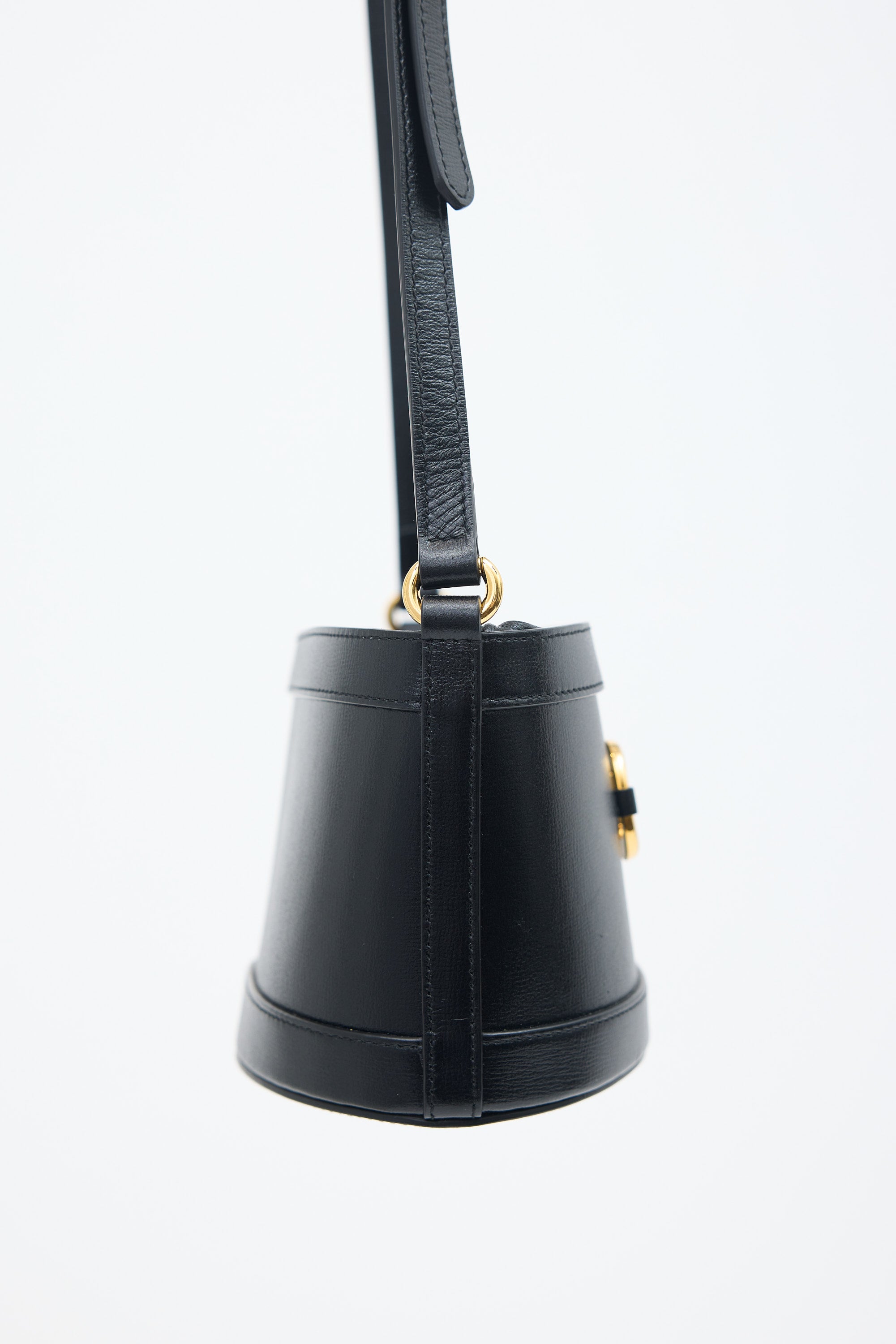 Pre-owned Gucci black leather Horsebit 1955 bucket bag featuring gold tone hardware, adjustable flat shoulder strap, Horsebit hardware at front, drawstring top closure, pink suede interior, and one interior slip pocket.