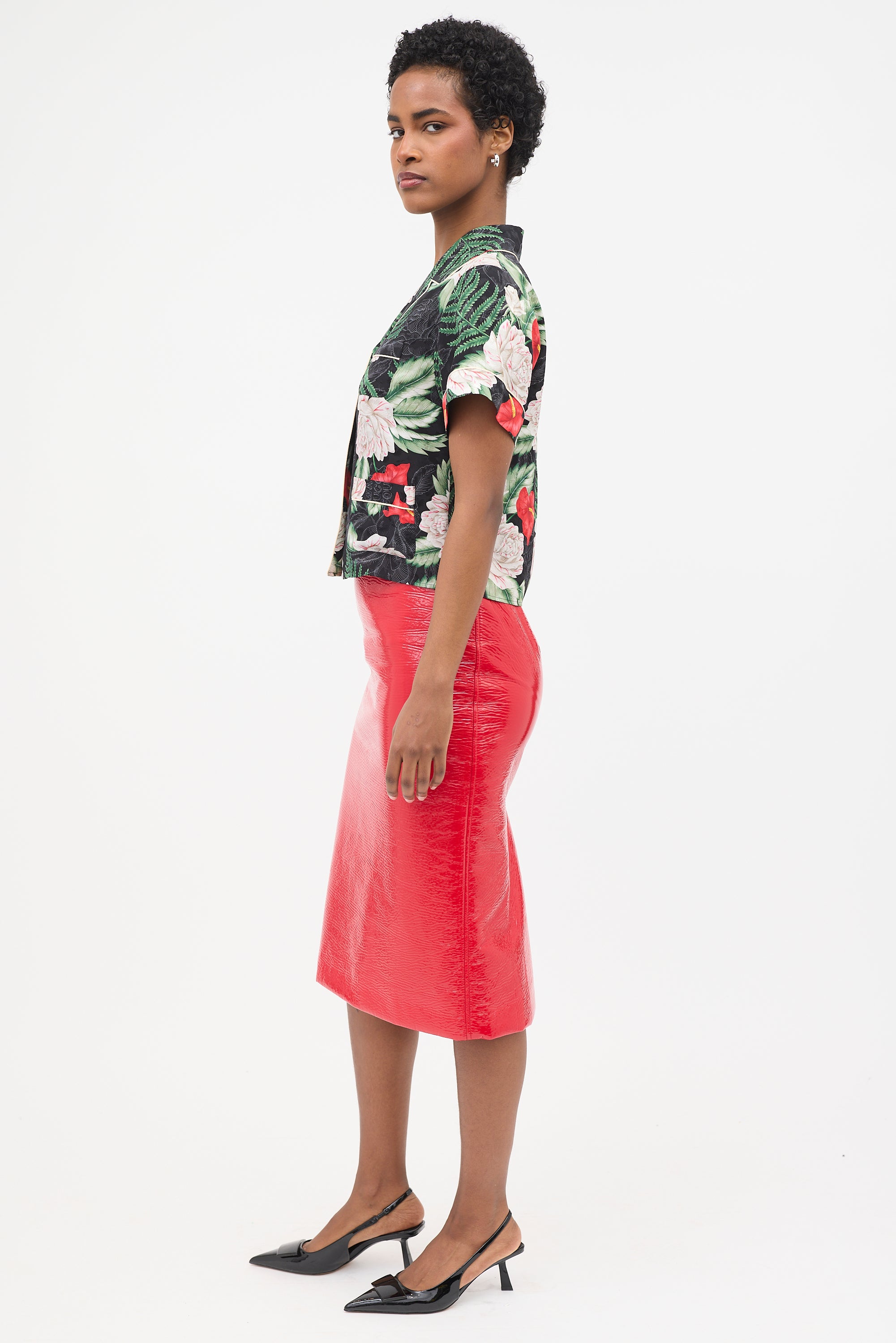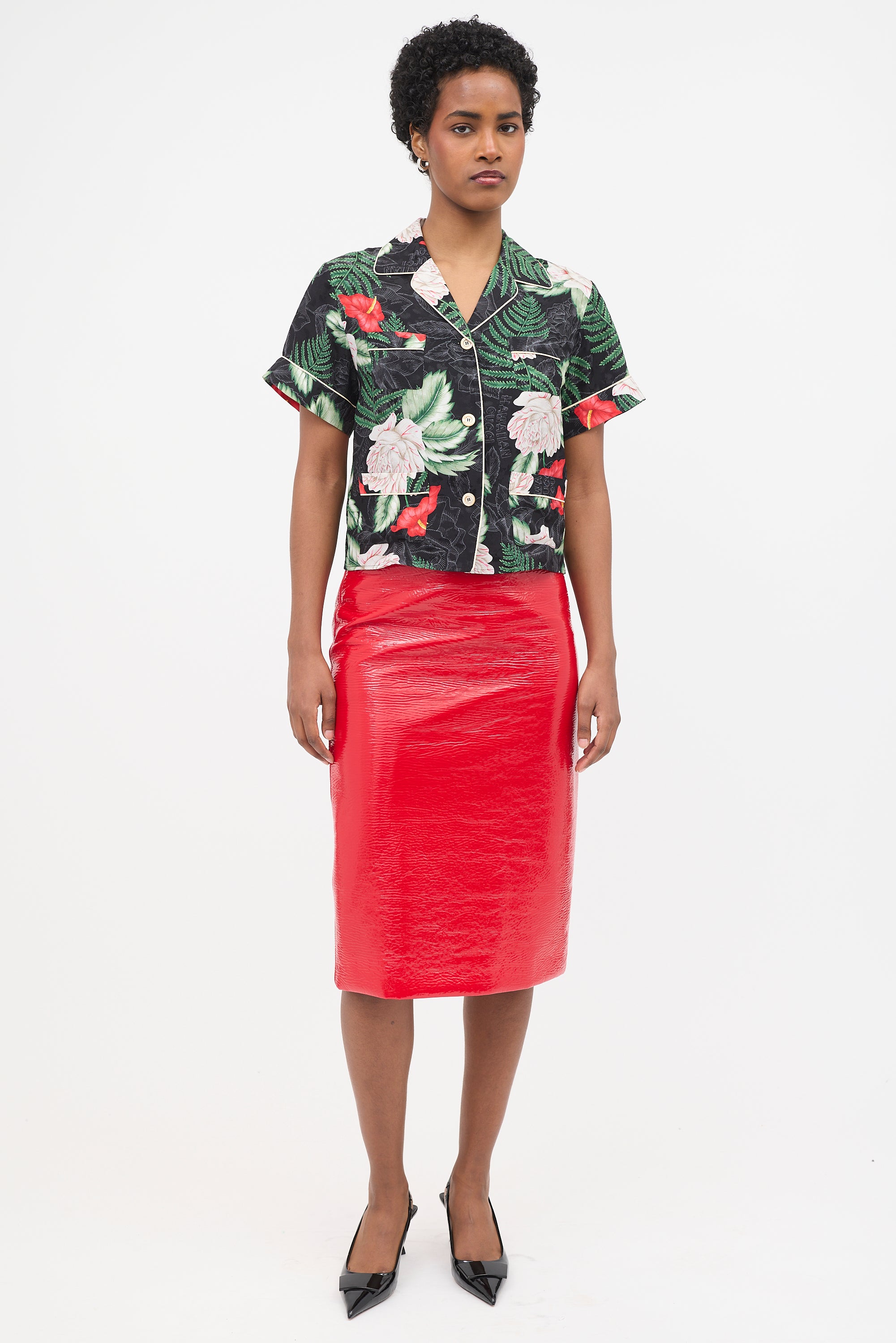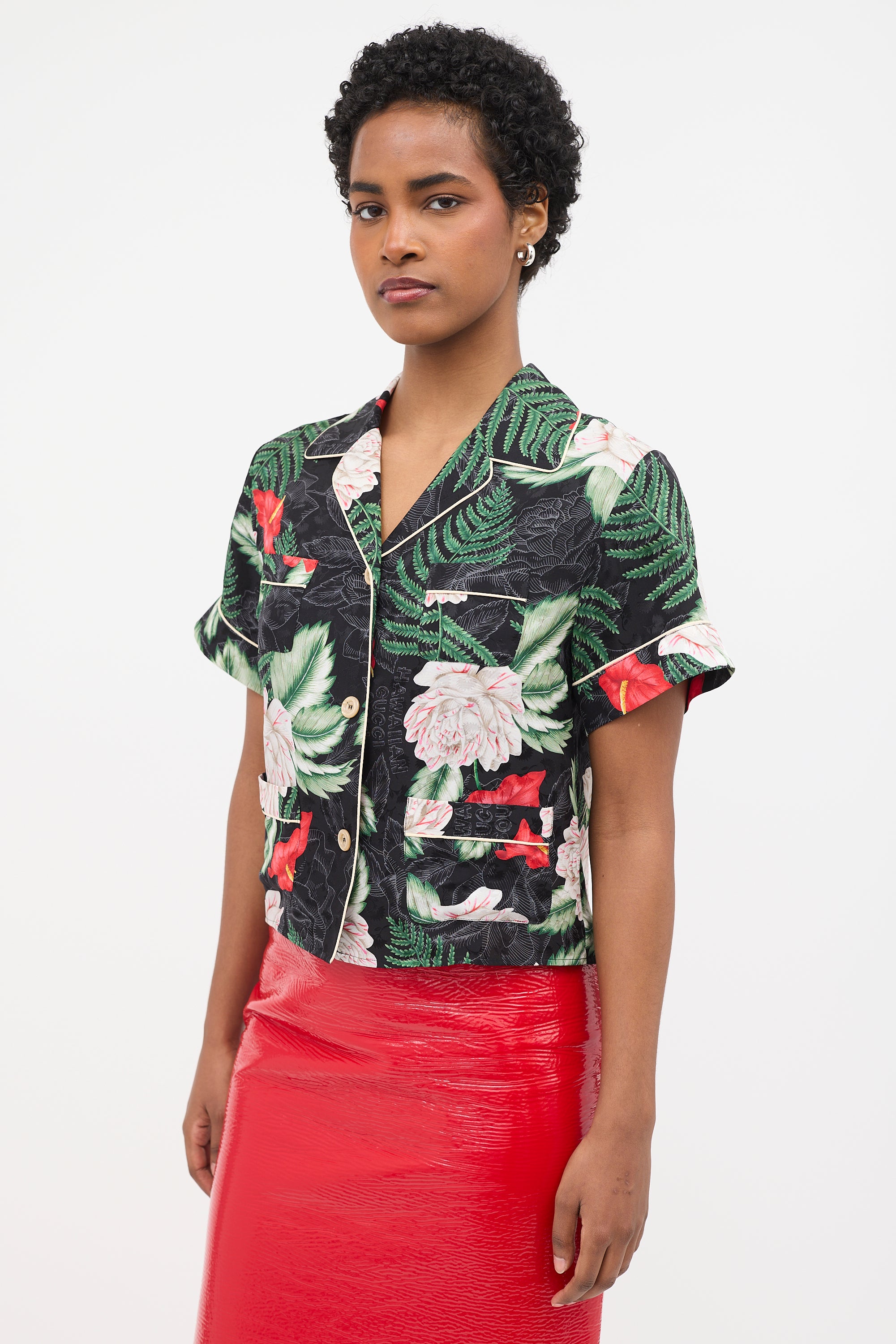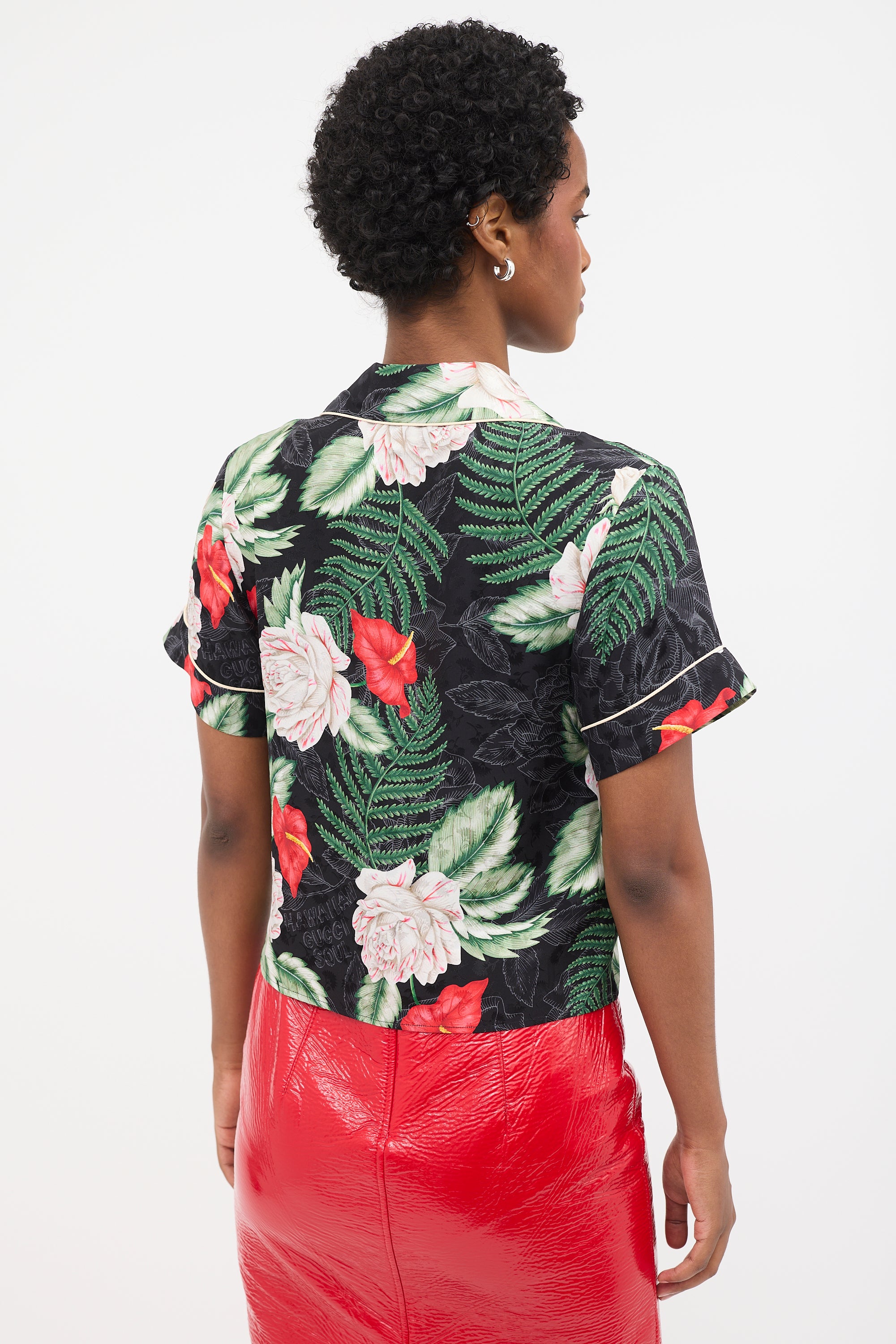 Pre-owned Gucci black silk shirt featuring multicolour Hawaiian floral pattern, camp collar, button front, four front patch pockets, and cream piping.