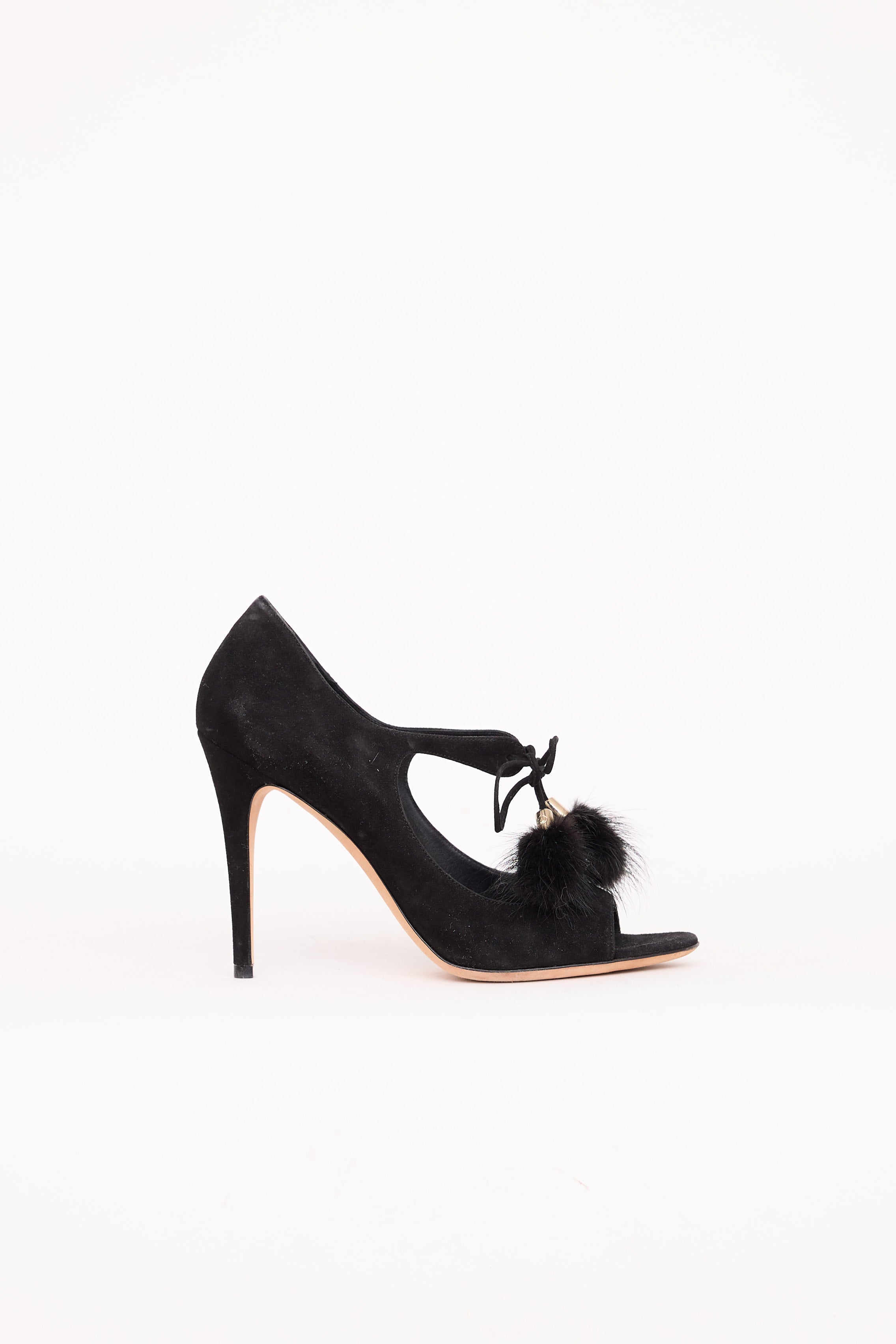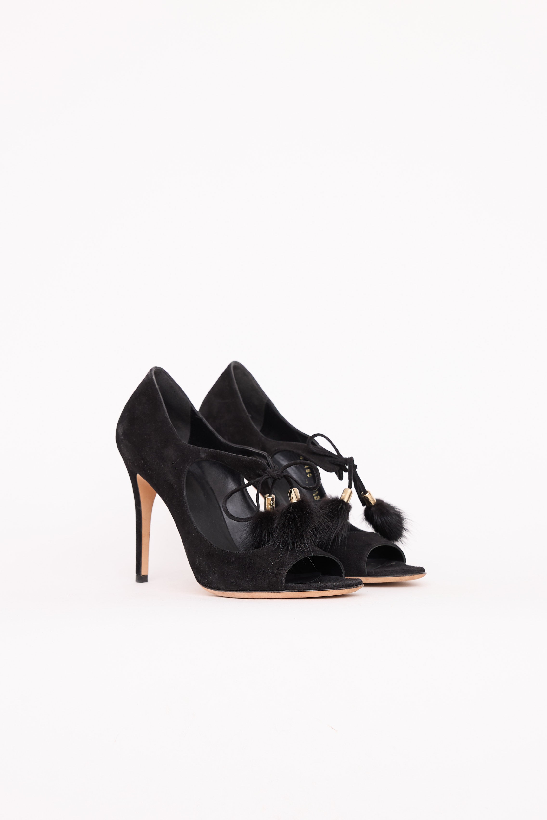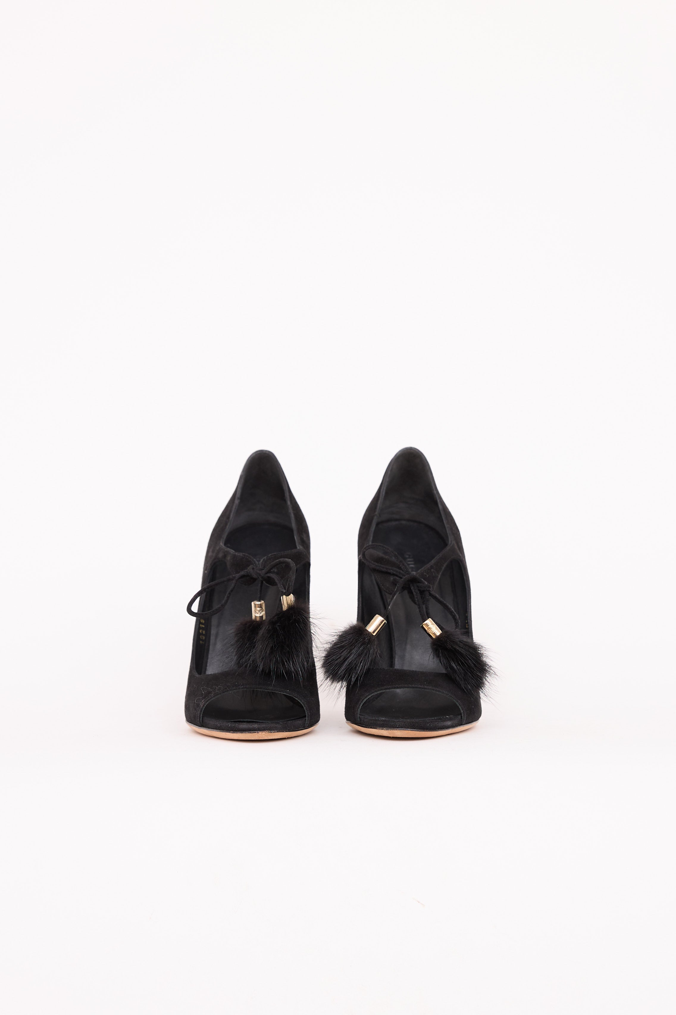 Pre-owned Gucci black suede pumps featuring an almond open toe, strap across toe, lace up strap with fur tassels across vamp, wrapped heel, and leather outsole.