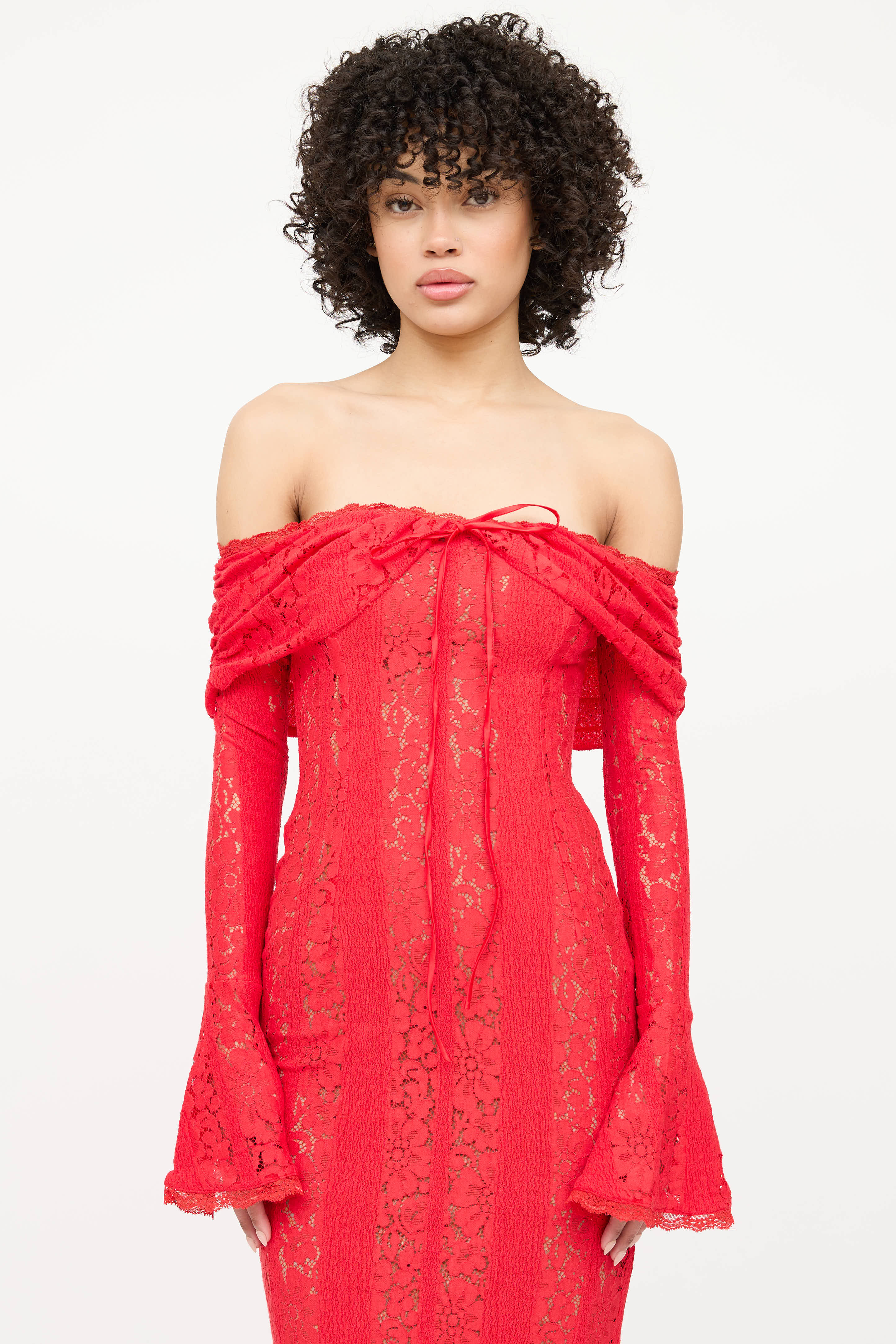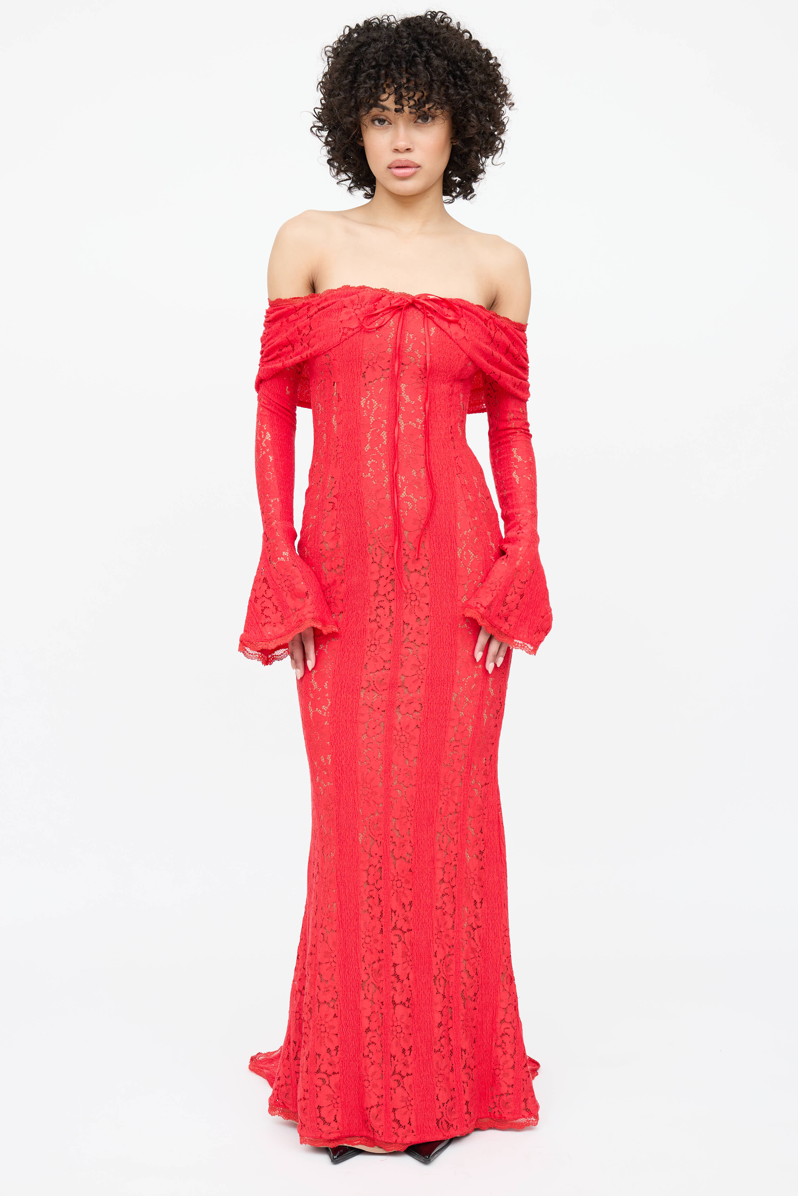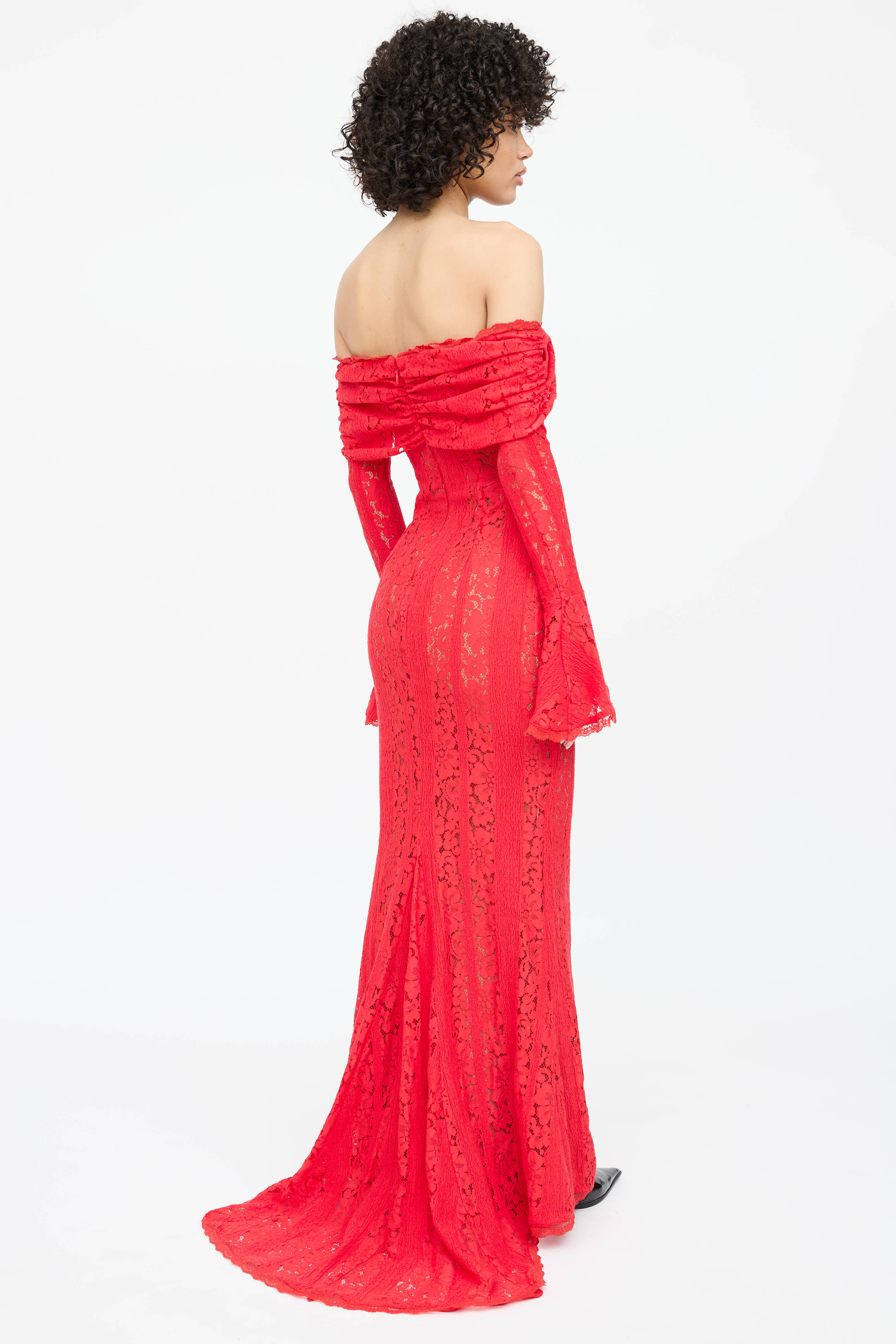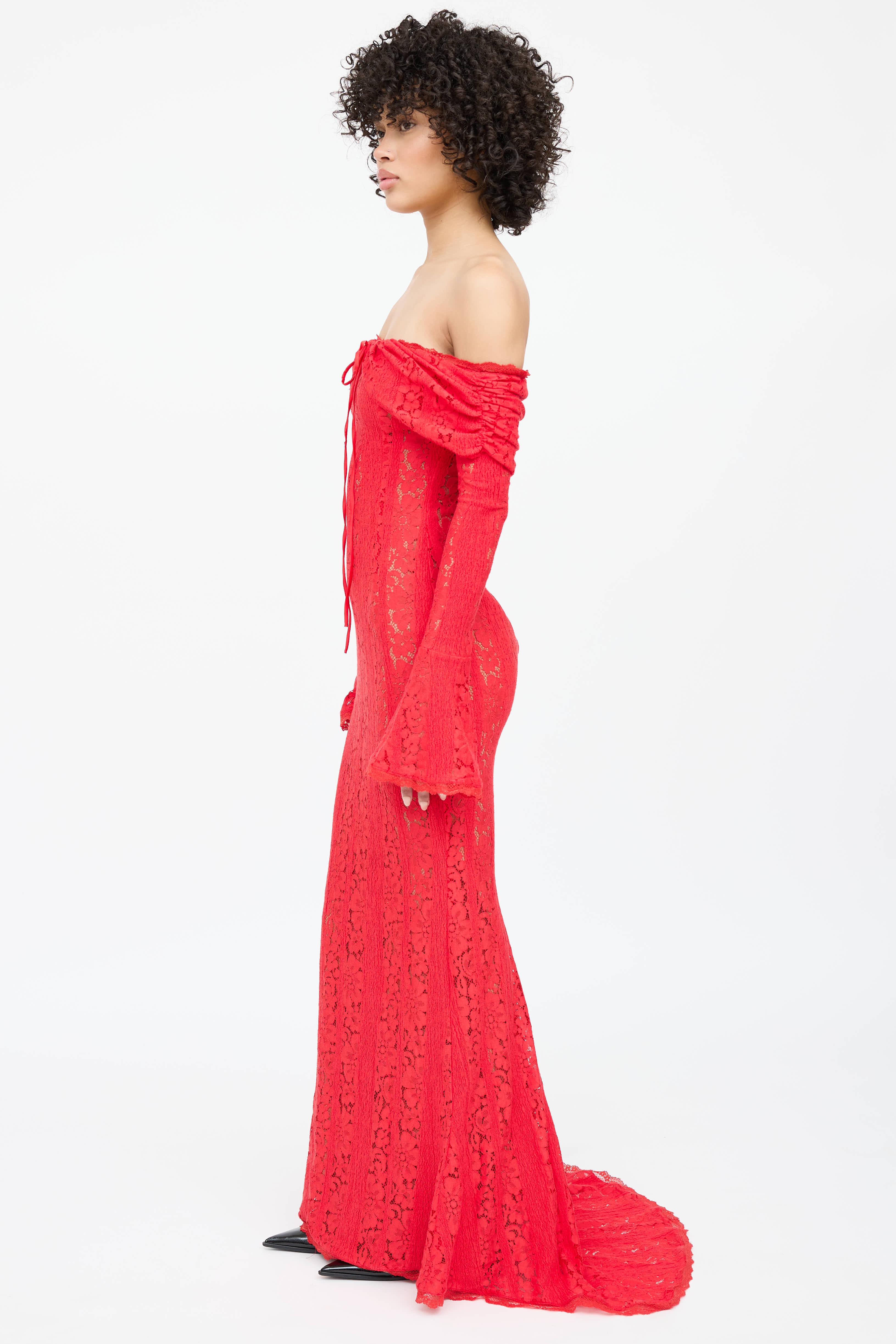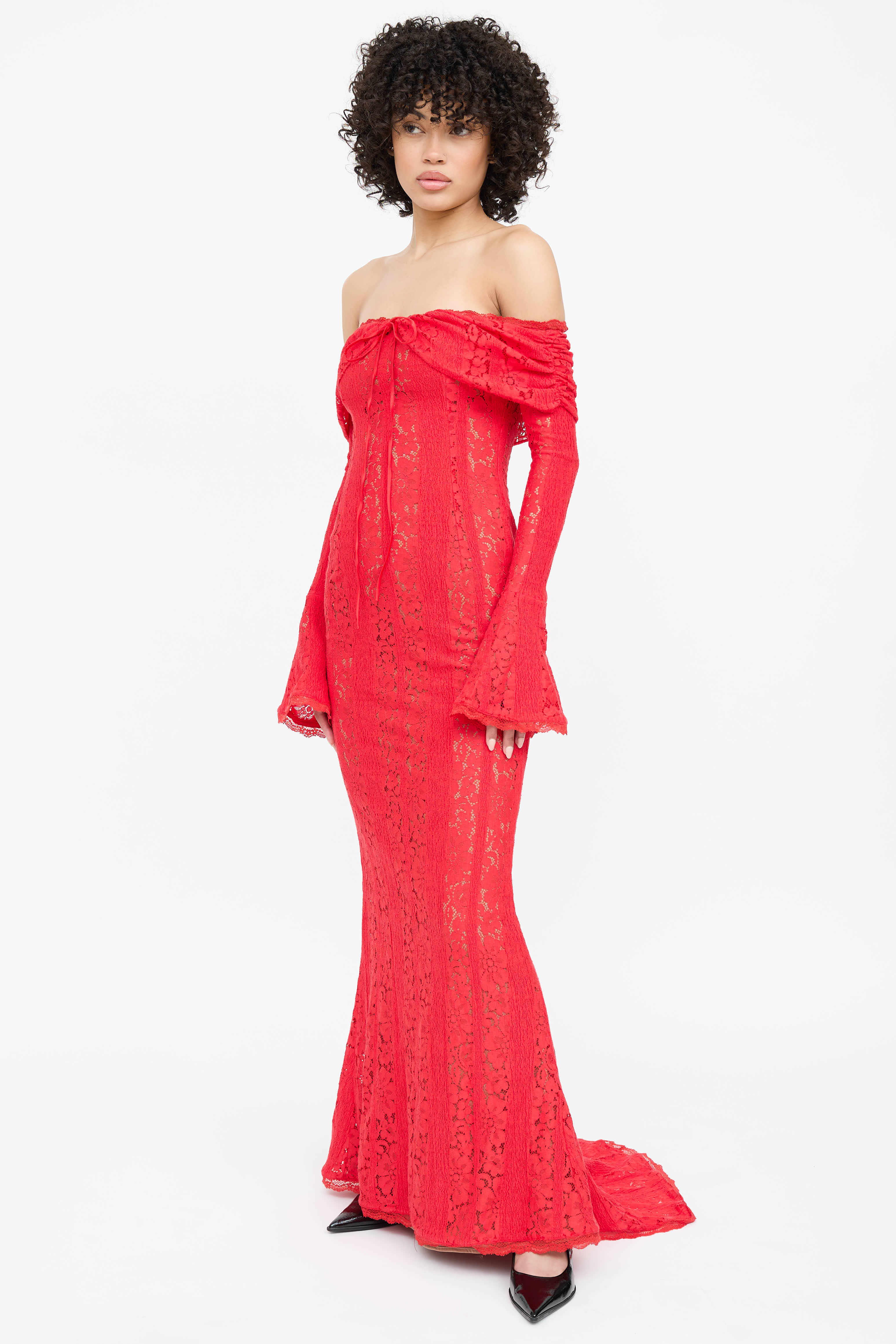 Pre-owned House of CB red lace long poet sleeve dress featuring off shoulder shawl neckline, lace trim edges, tie at chest, train skirt, and concealed zip at back. Lined.