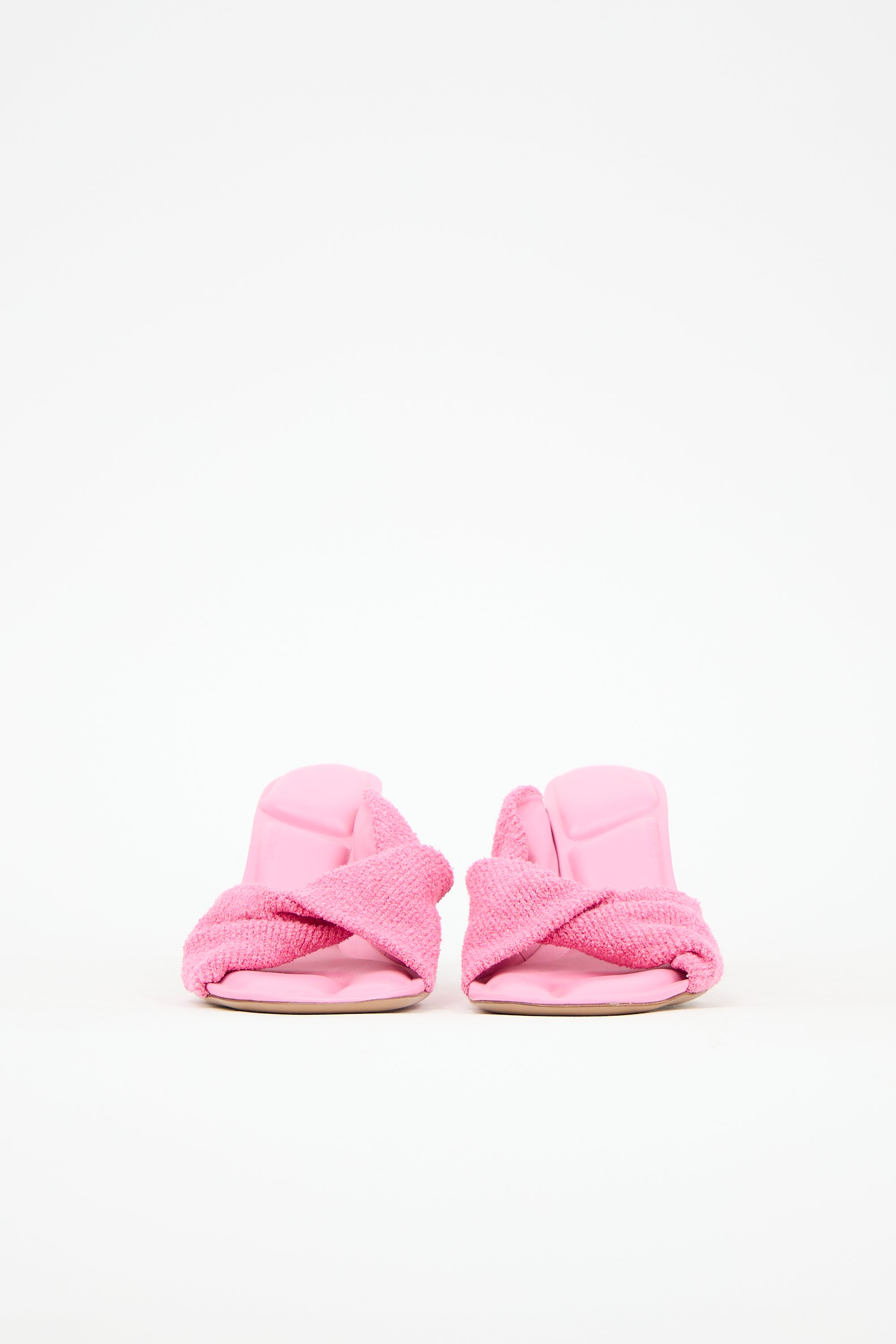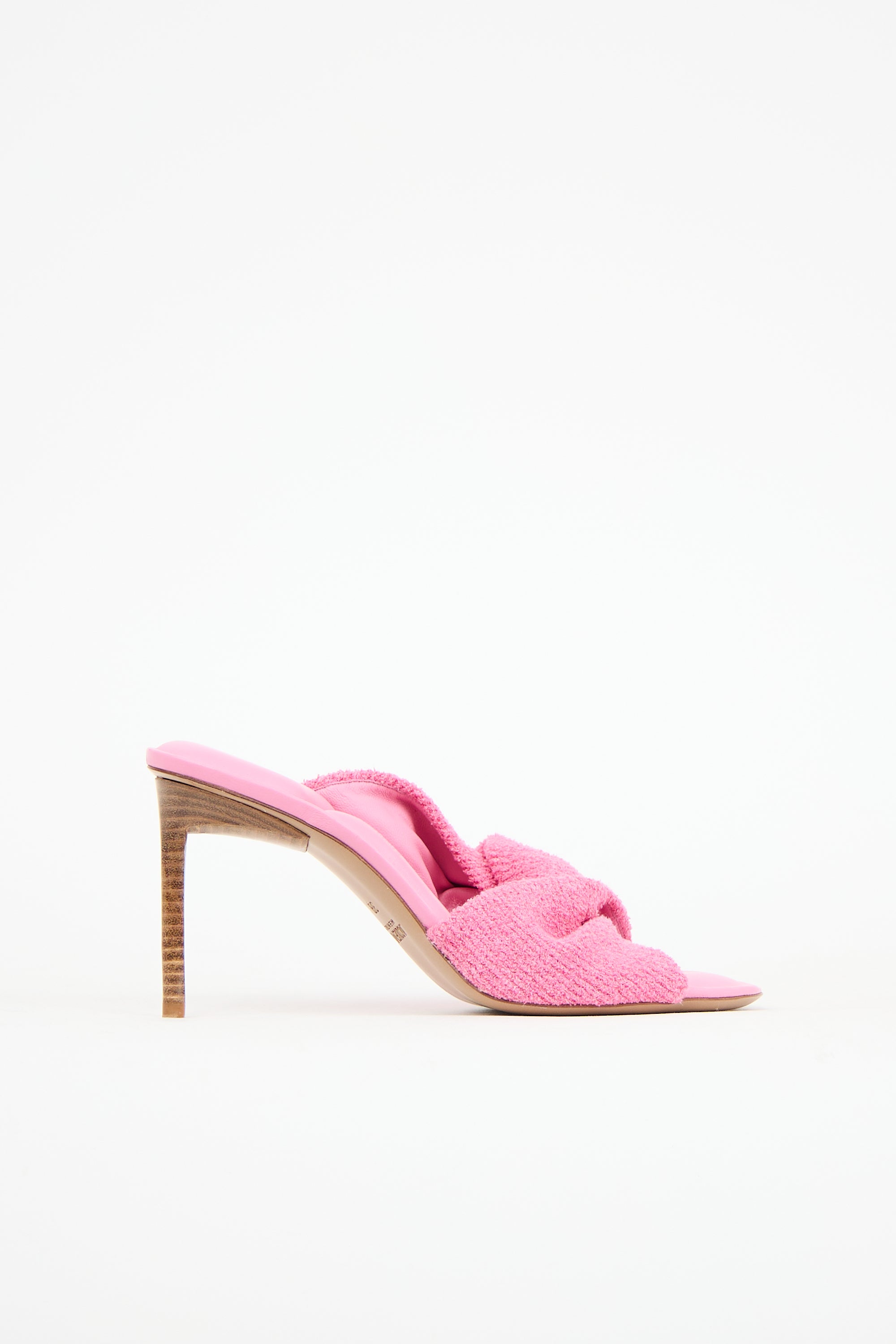 Pre-owned Jacquemus pink Les Mules Bagnu heels featuring a ribbed terry cloth folded strap across vamp, slip on entry, padded leather insole with debossed logo, and a stacked stiletto heel.