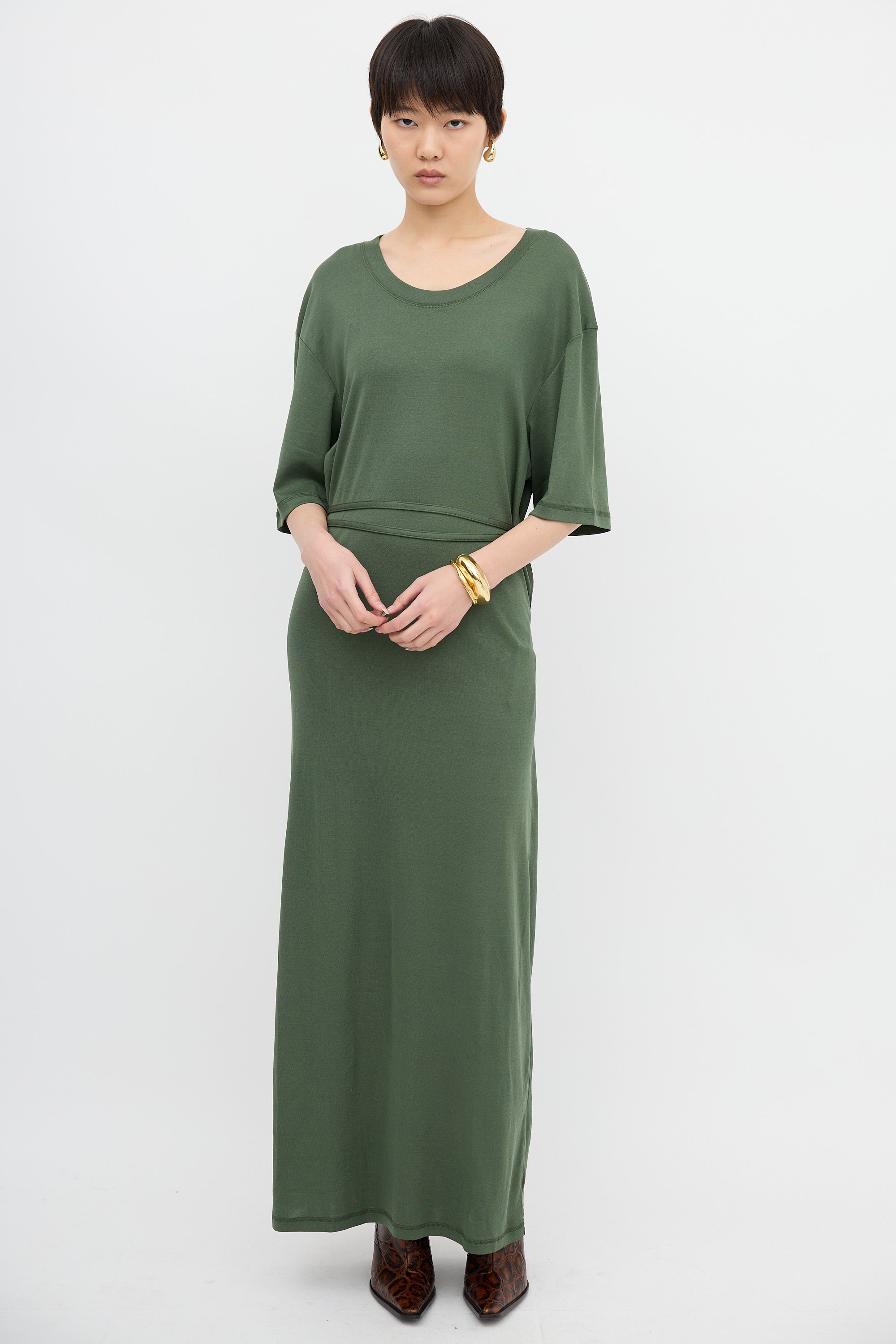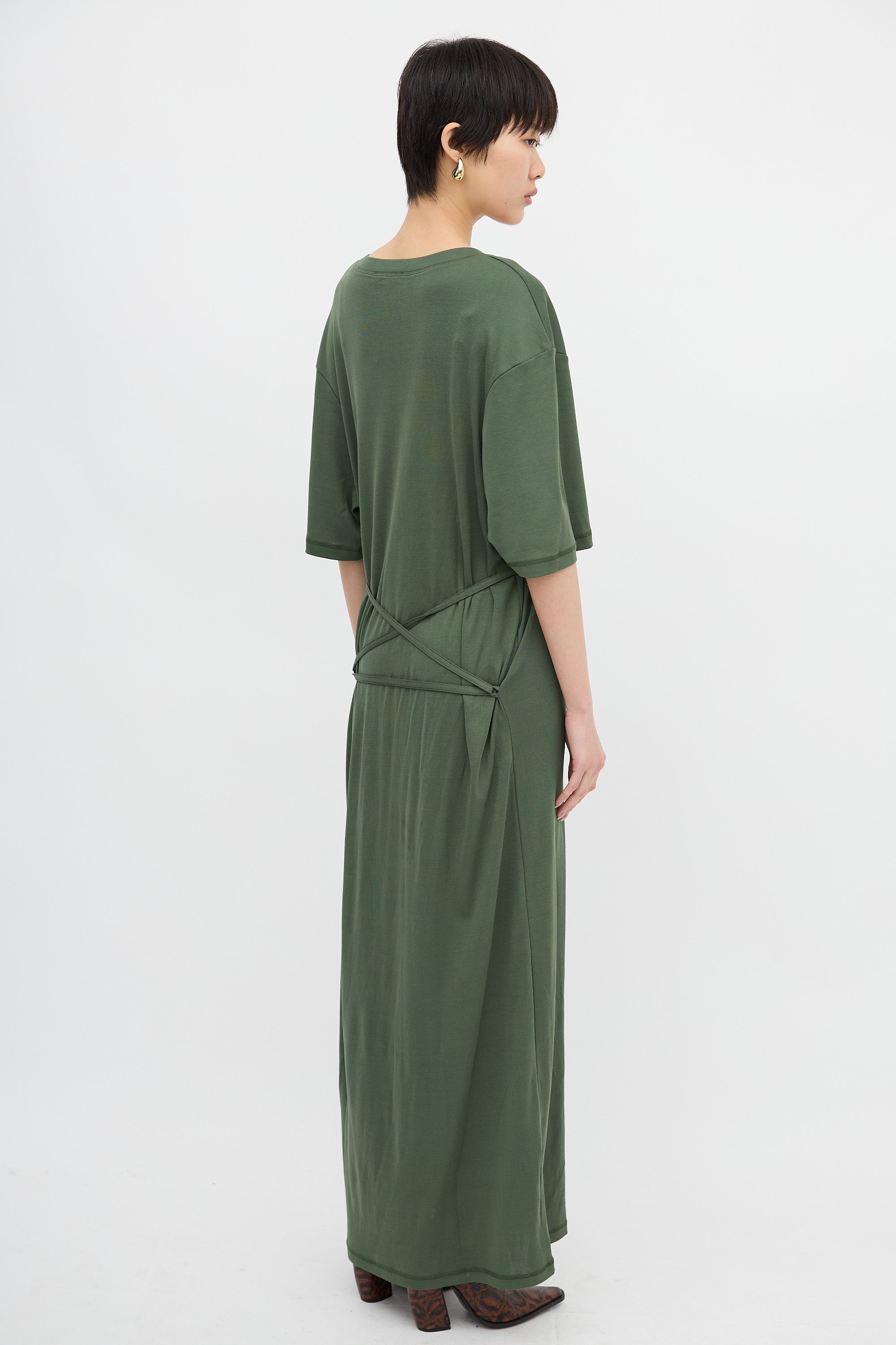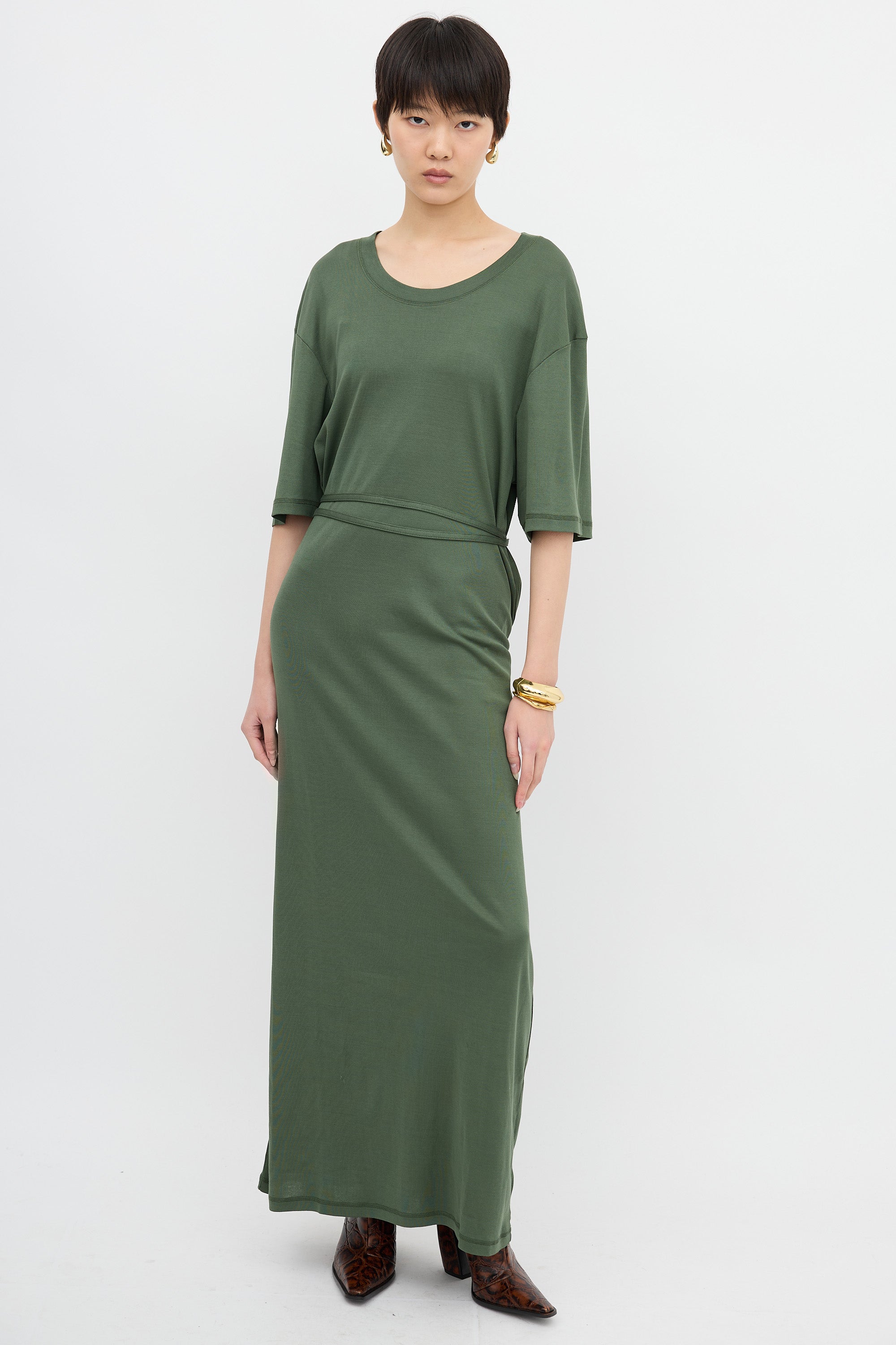 Pre-owned Lemaire green knit Belted Rib T-shirt dress featuring crew neckline, belt loops, and tie belt.