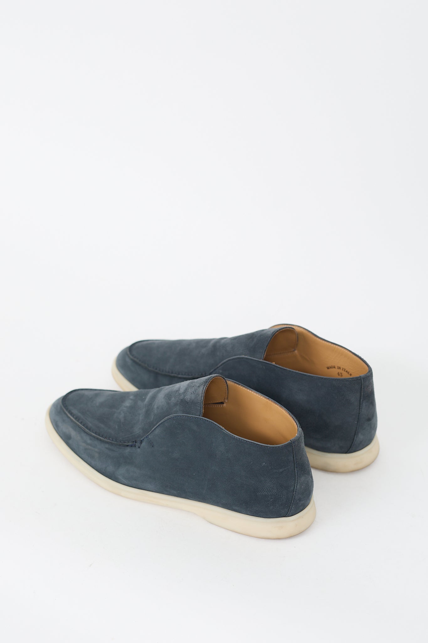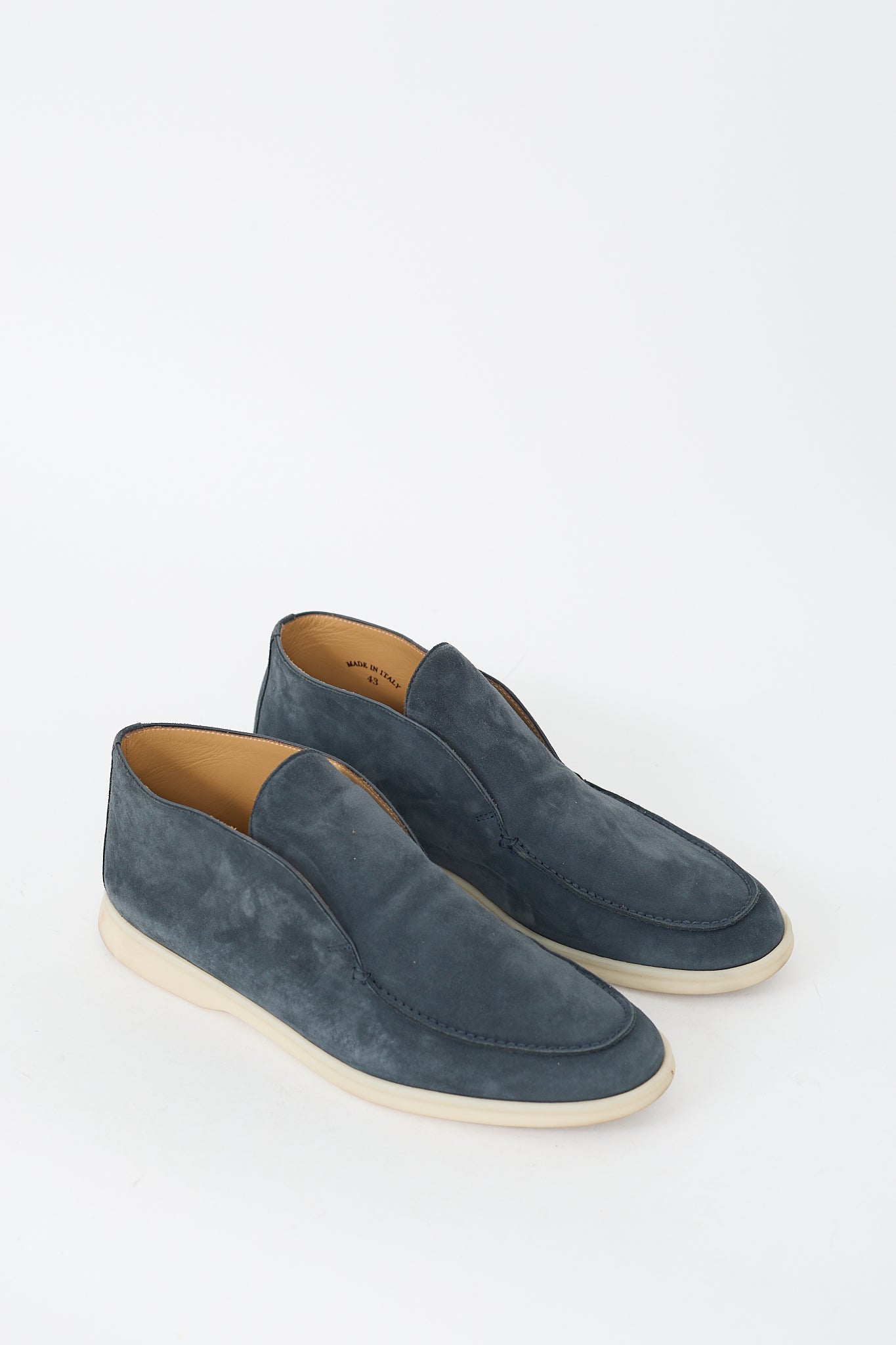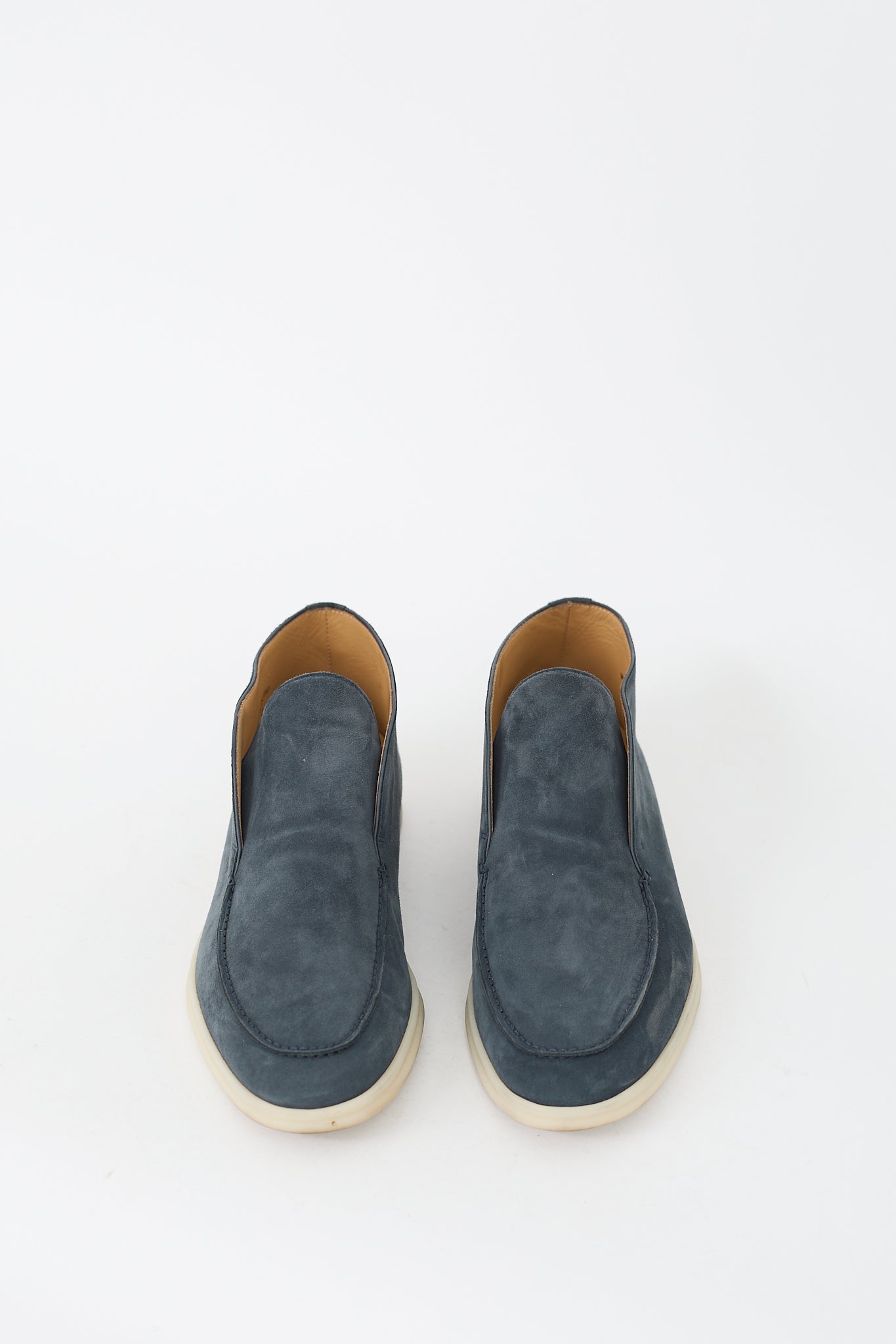 Pre-owned Loro Piana navy suede Open Walk boots featuring almond toe, notched topline, ankle high shaft, rubber outsole, and slip on entry.