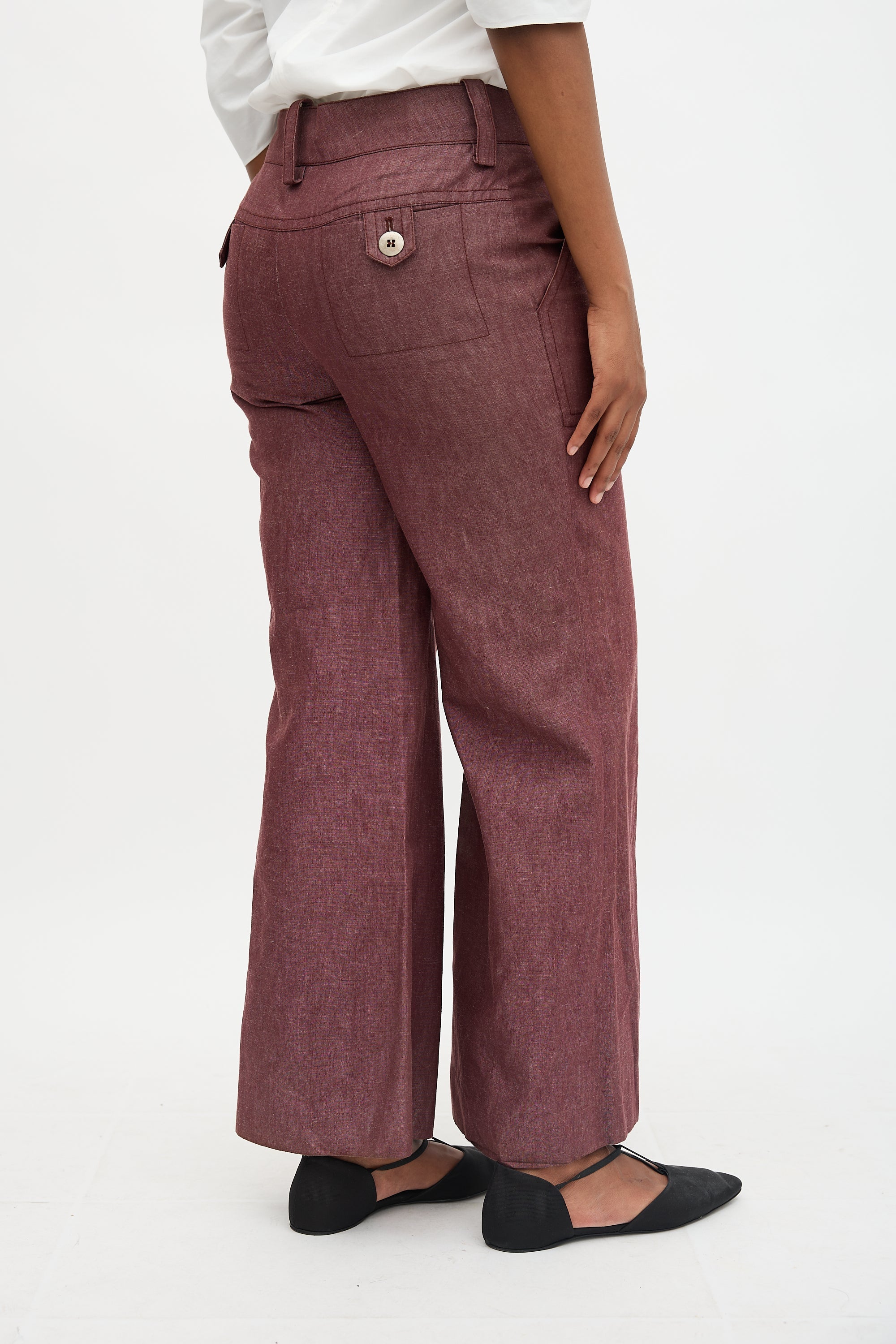 Pre-owned Louis Vuitton burgundy chambray trousers featuring high waist, wide leg, four pocket styling, and zip fly.