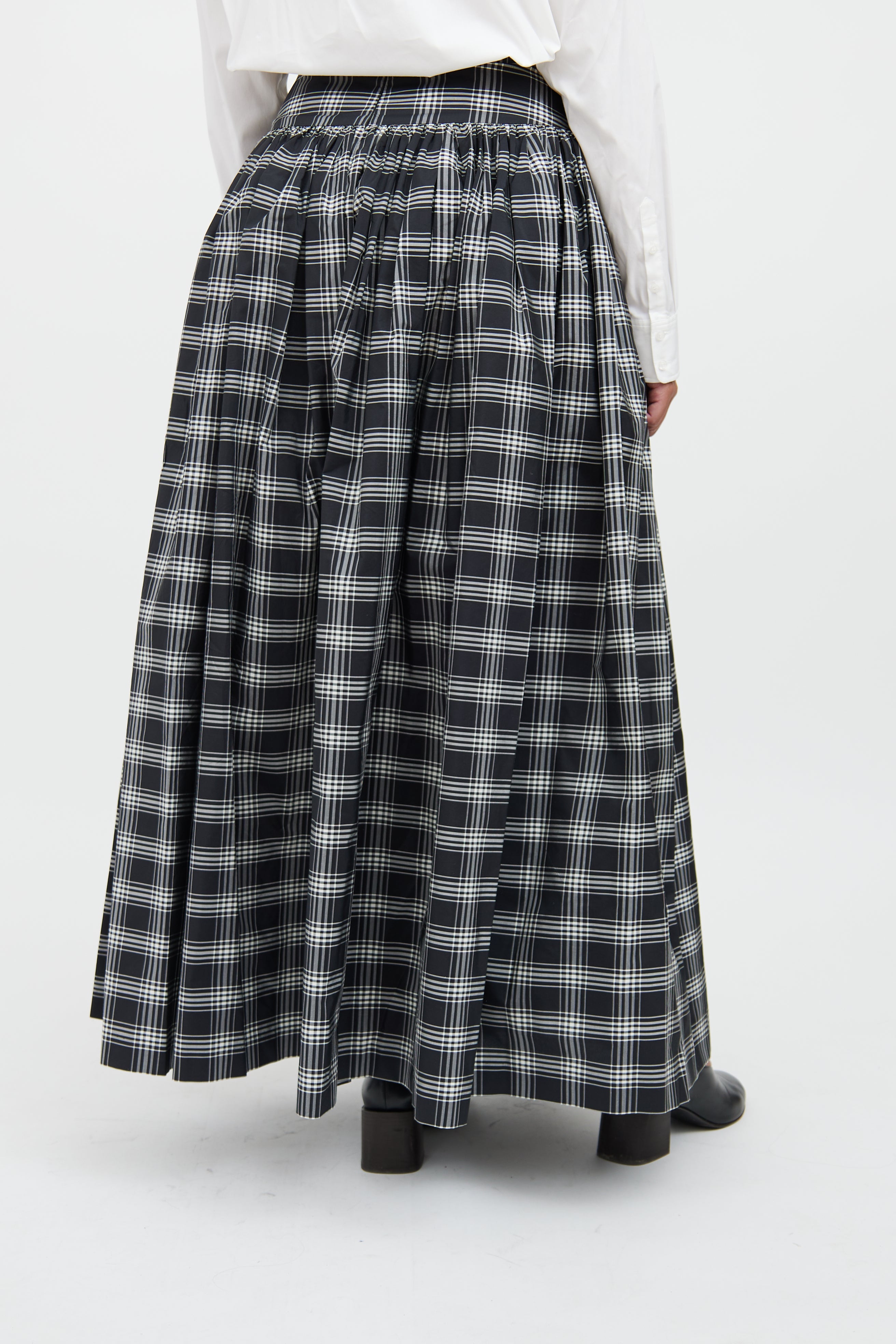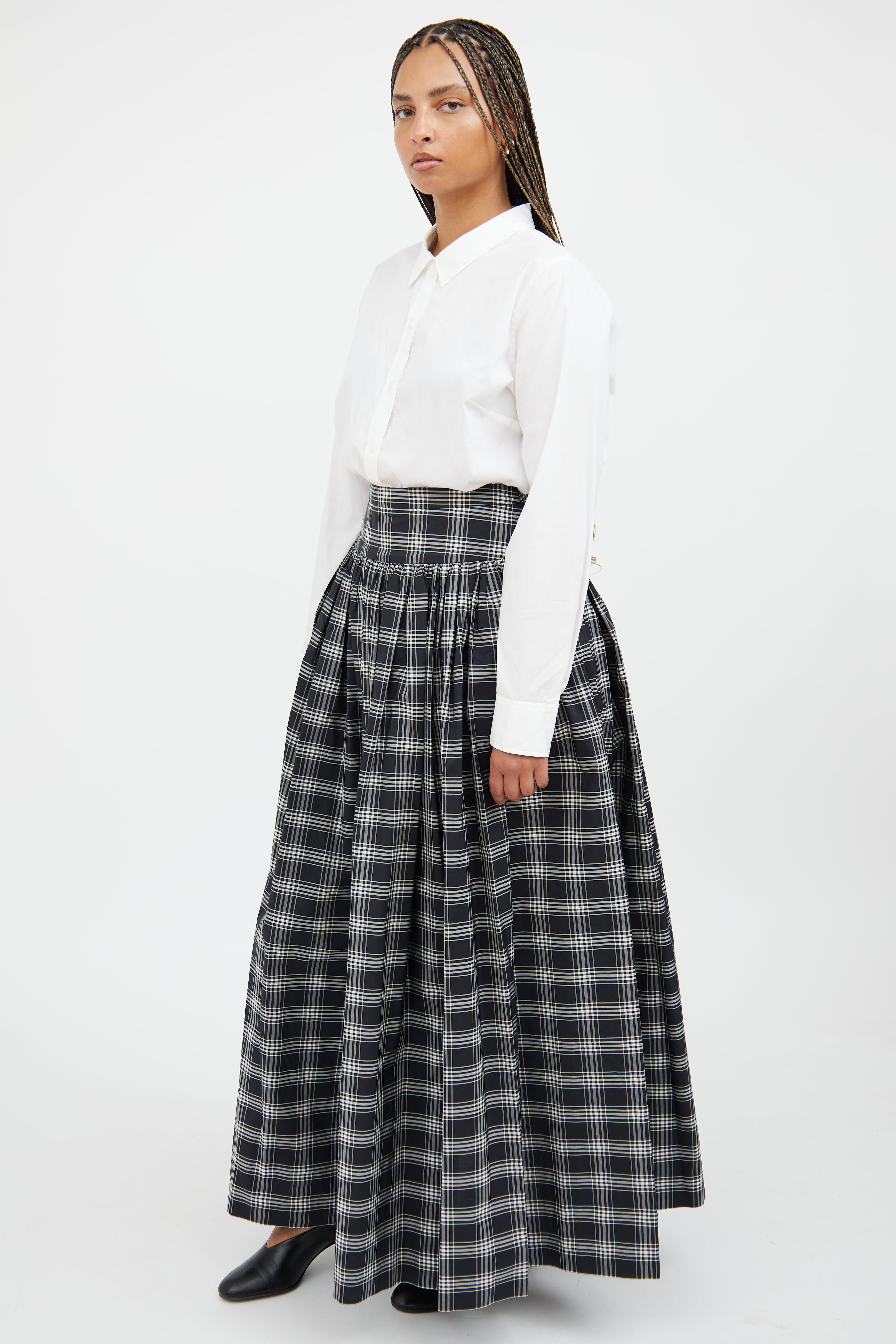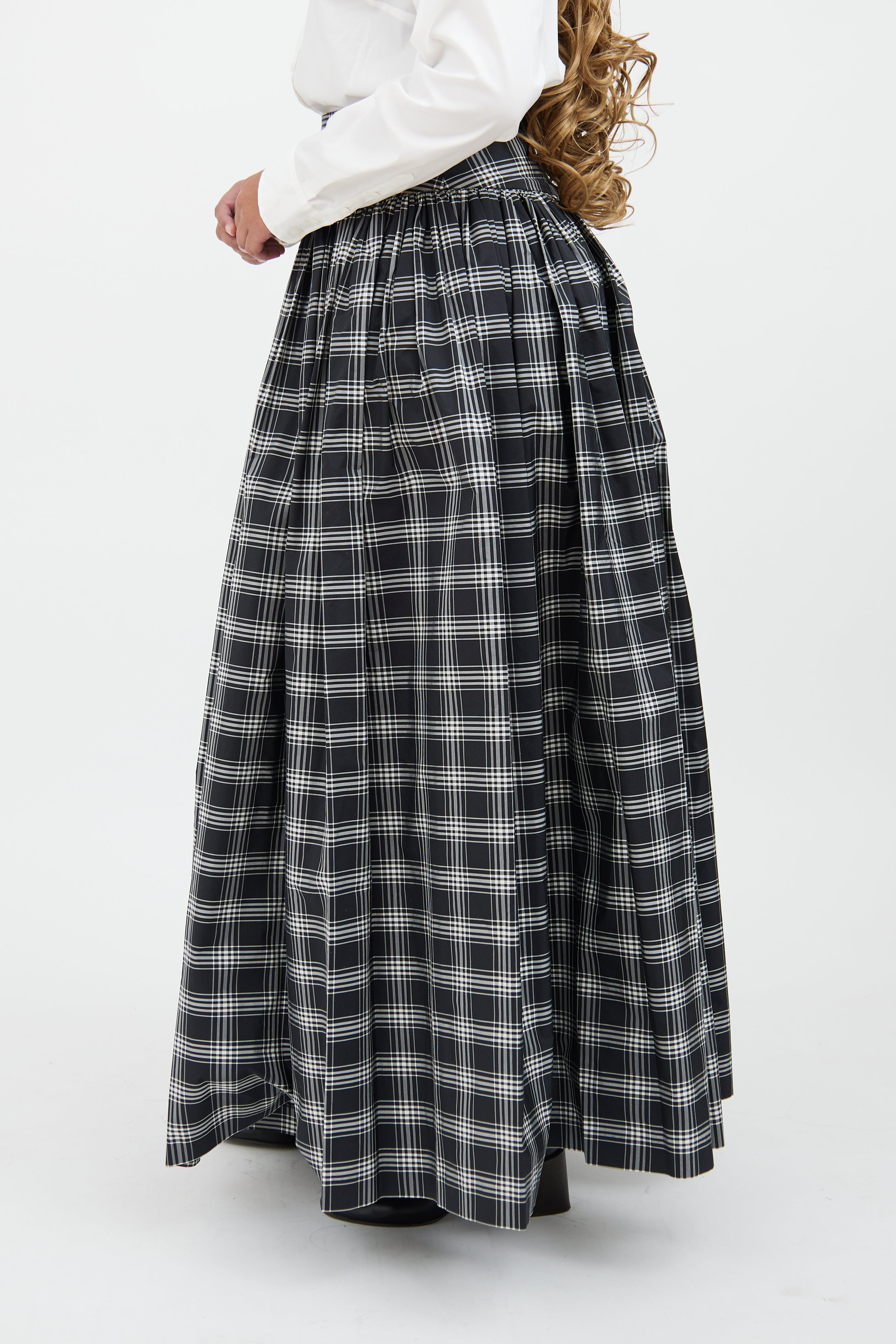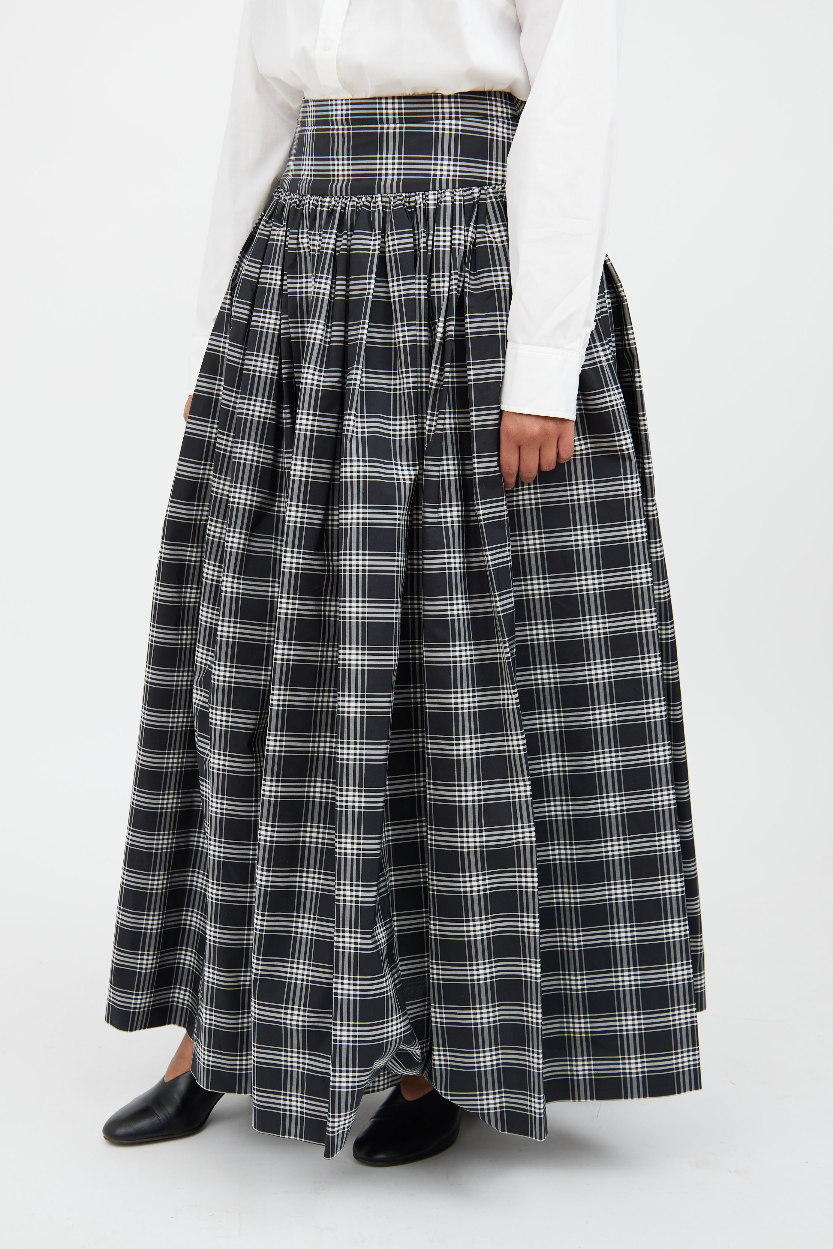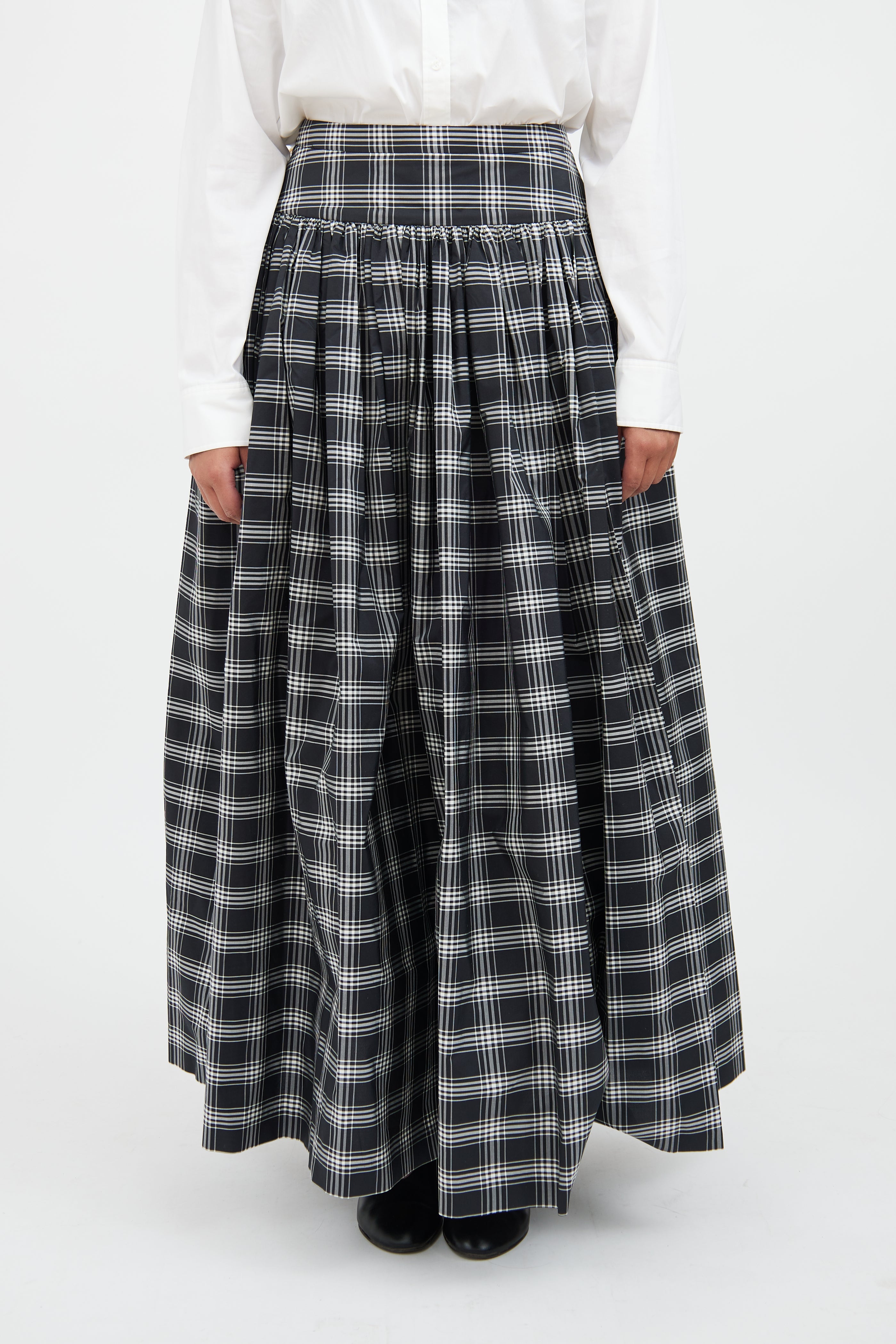 Pre-owned Michael Kors silk blend maxi skirt featuring flat waistband, concealed back zip closure, ruffle detailing, white and black plaid pattern throughout. Fully lined.