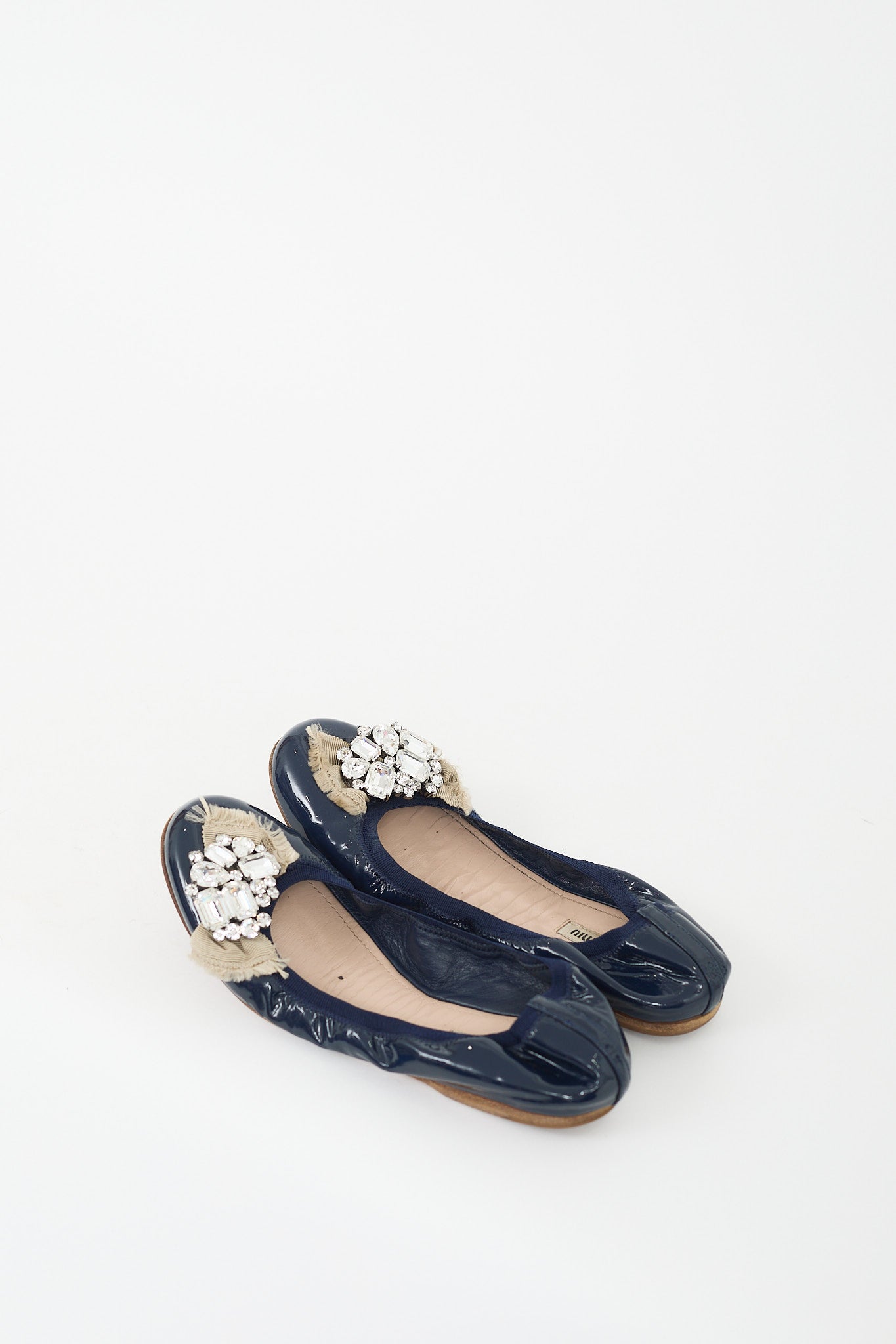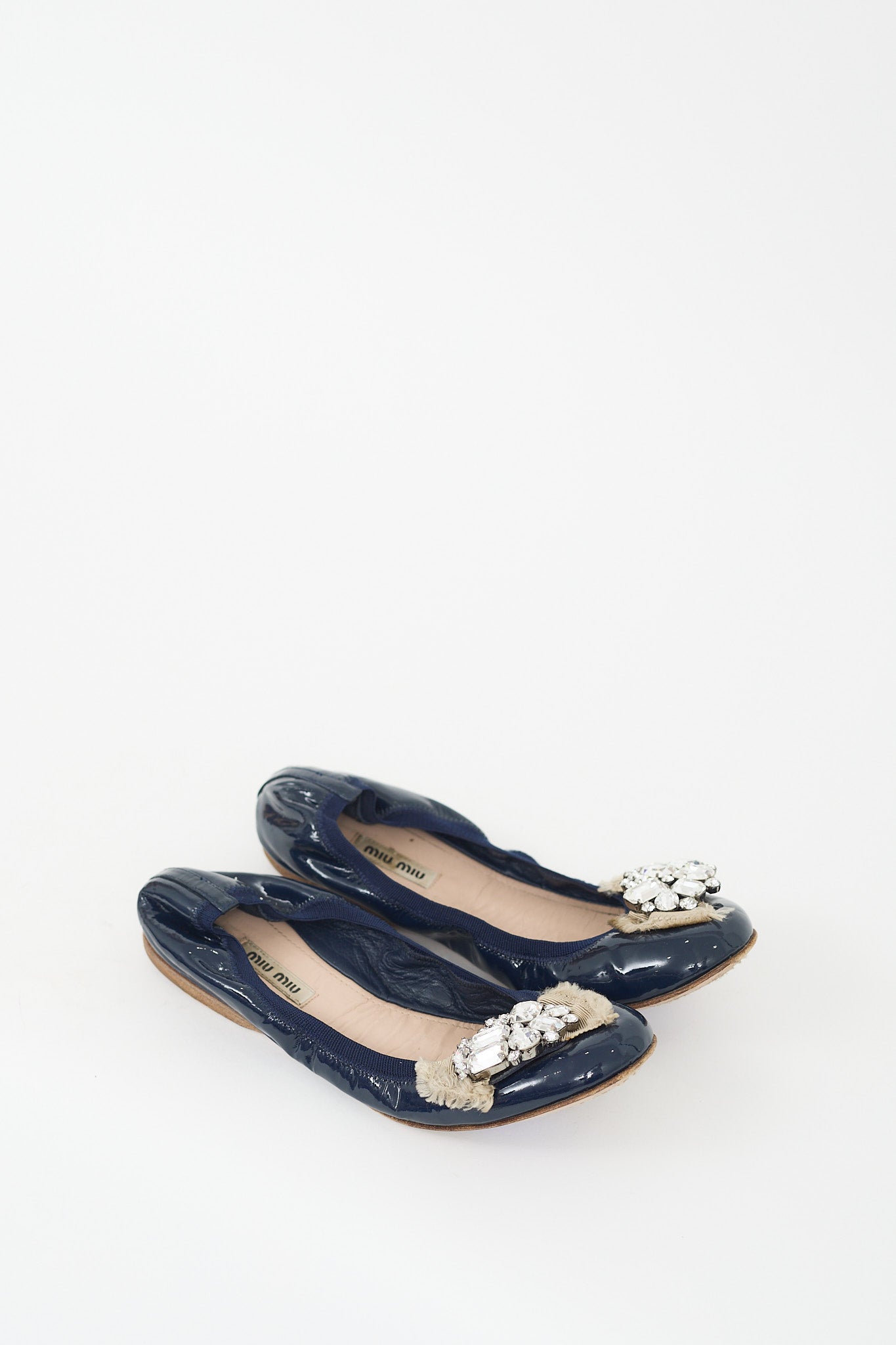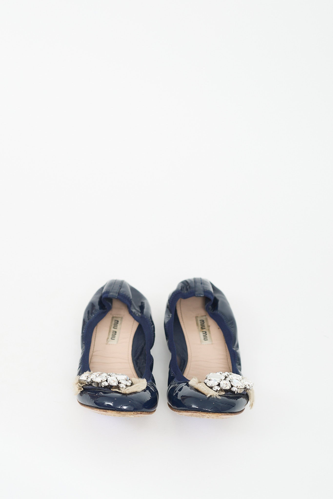 Pre-owned Miu Miu navy patent leather flats featuring a round toe, elasticized collar, multicolour jewel embellishment at vamp with grosgrain trim, and slip on entry.