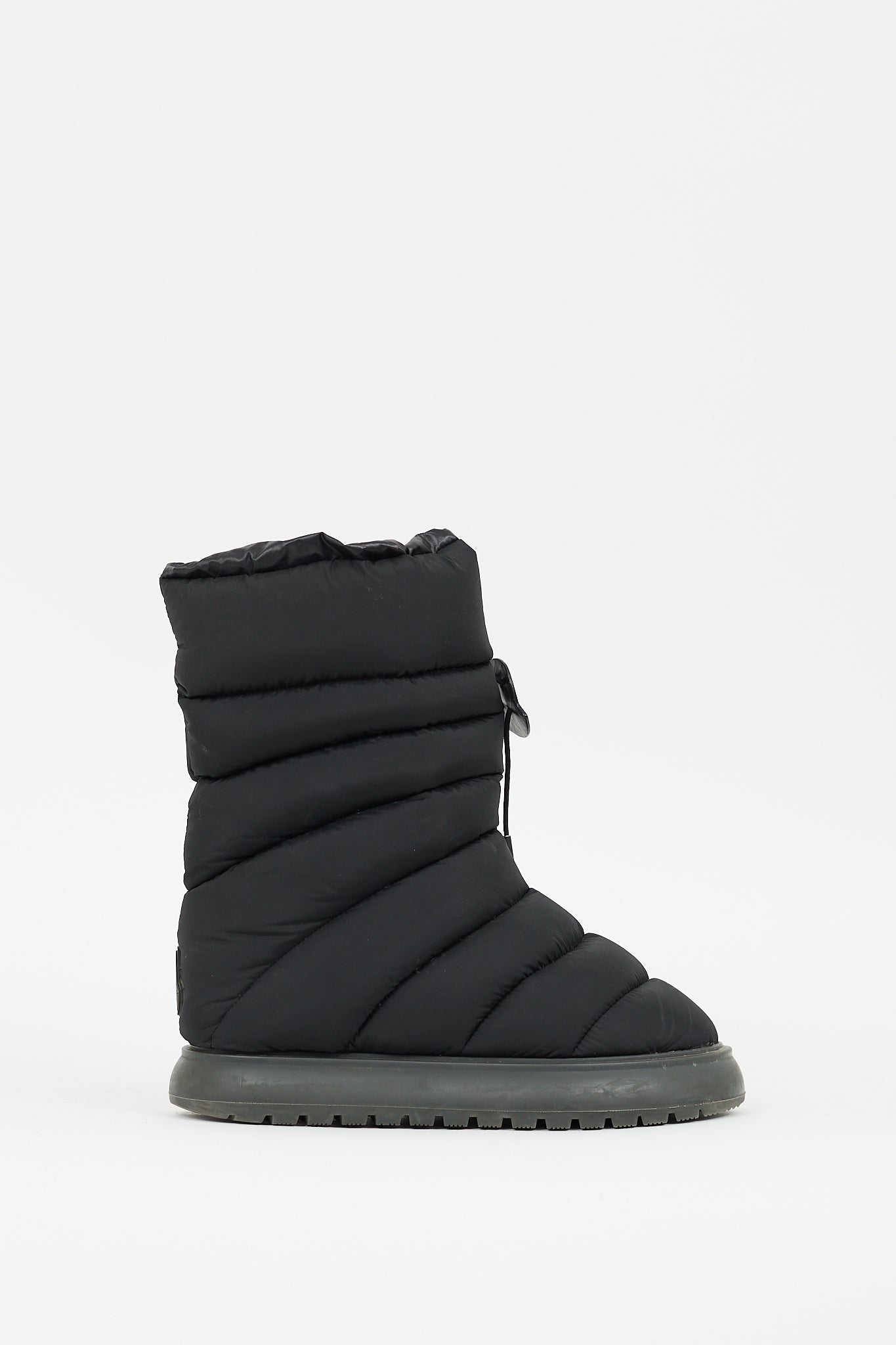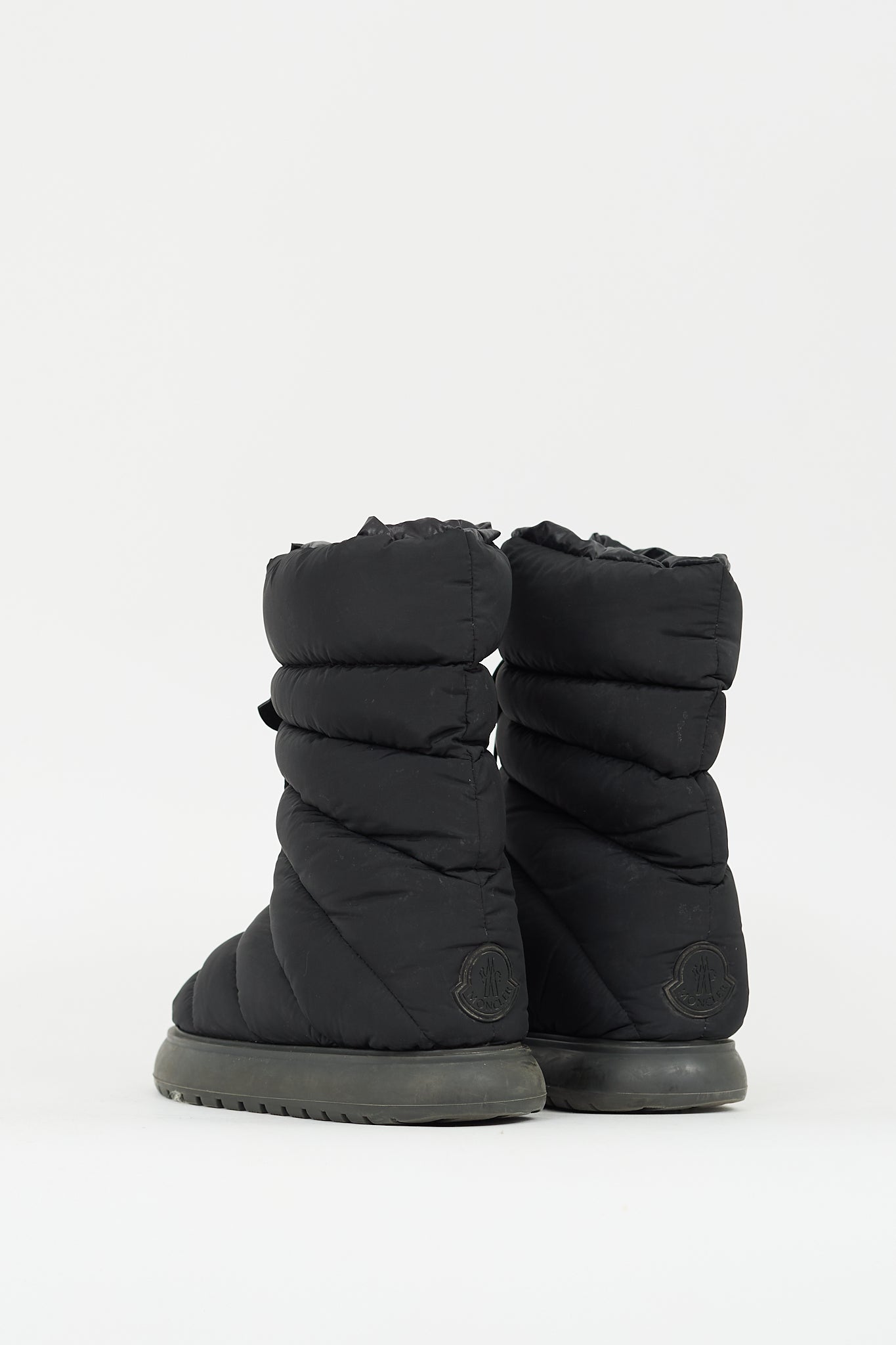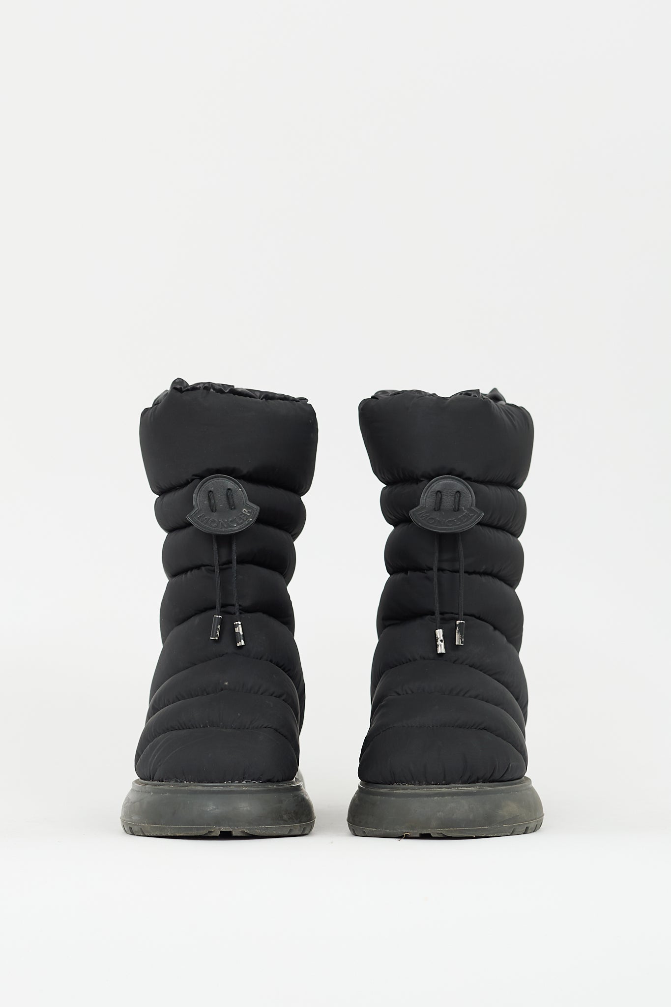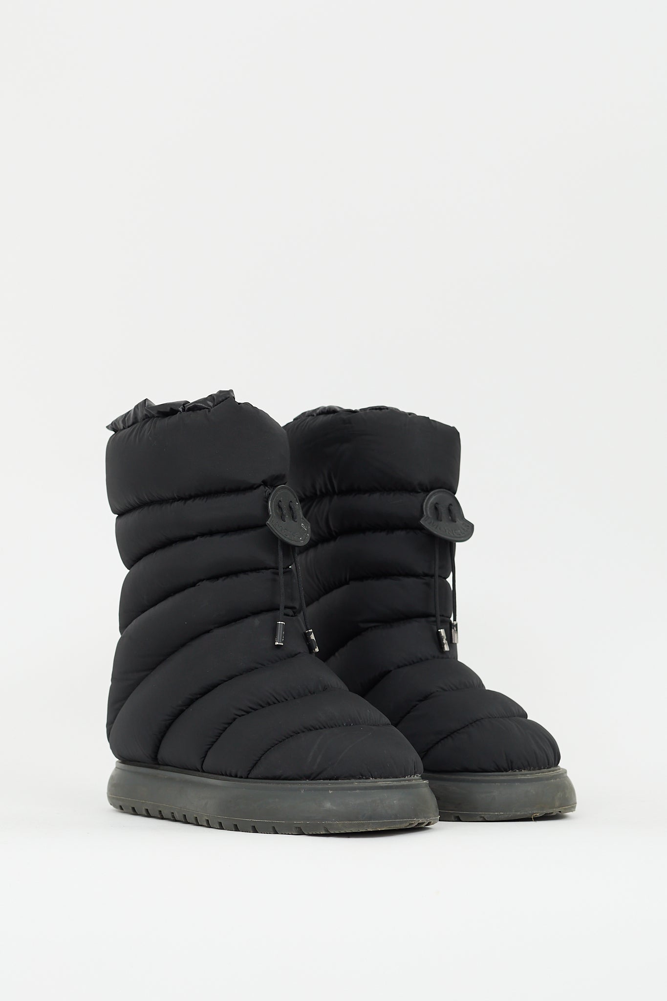 Pre-owned Moncler black Gaia Snow boots featuring rounded toe, quilted padded upper, debossed logo with drawstring fastening, and treaded sole.