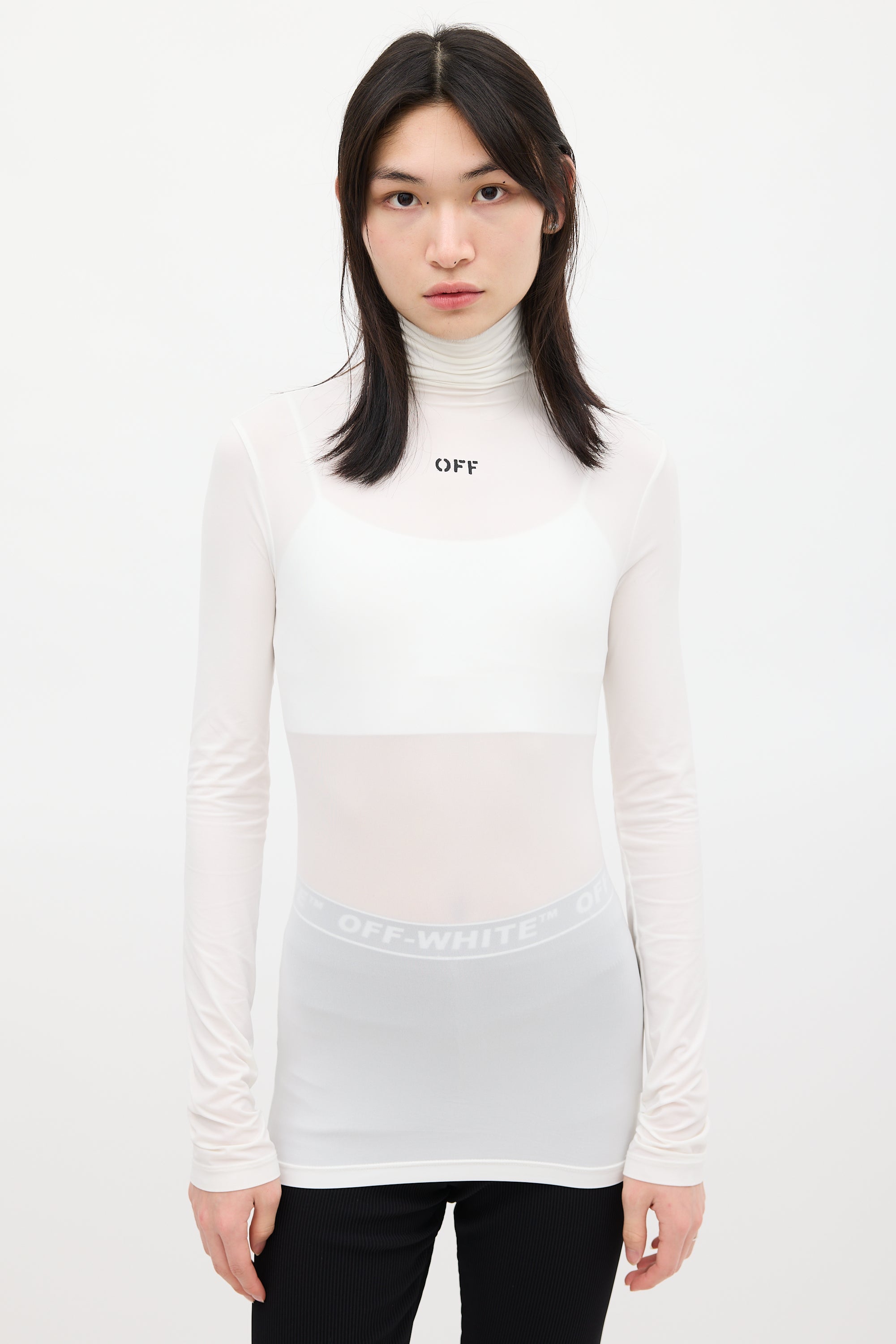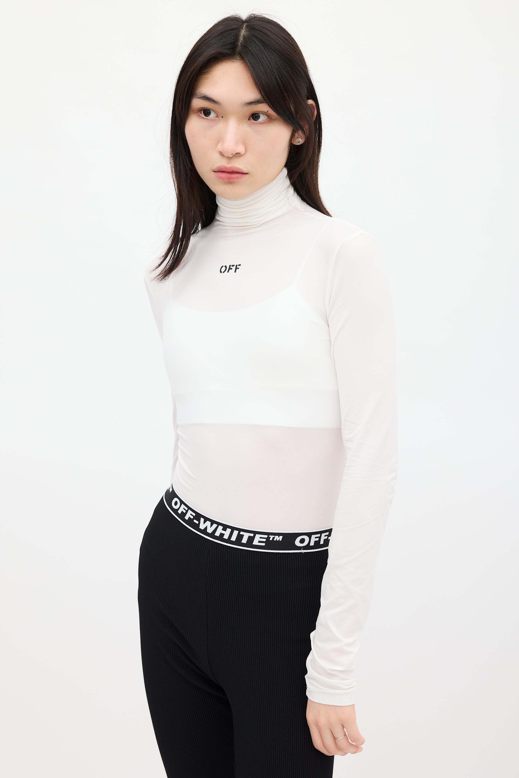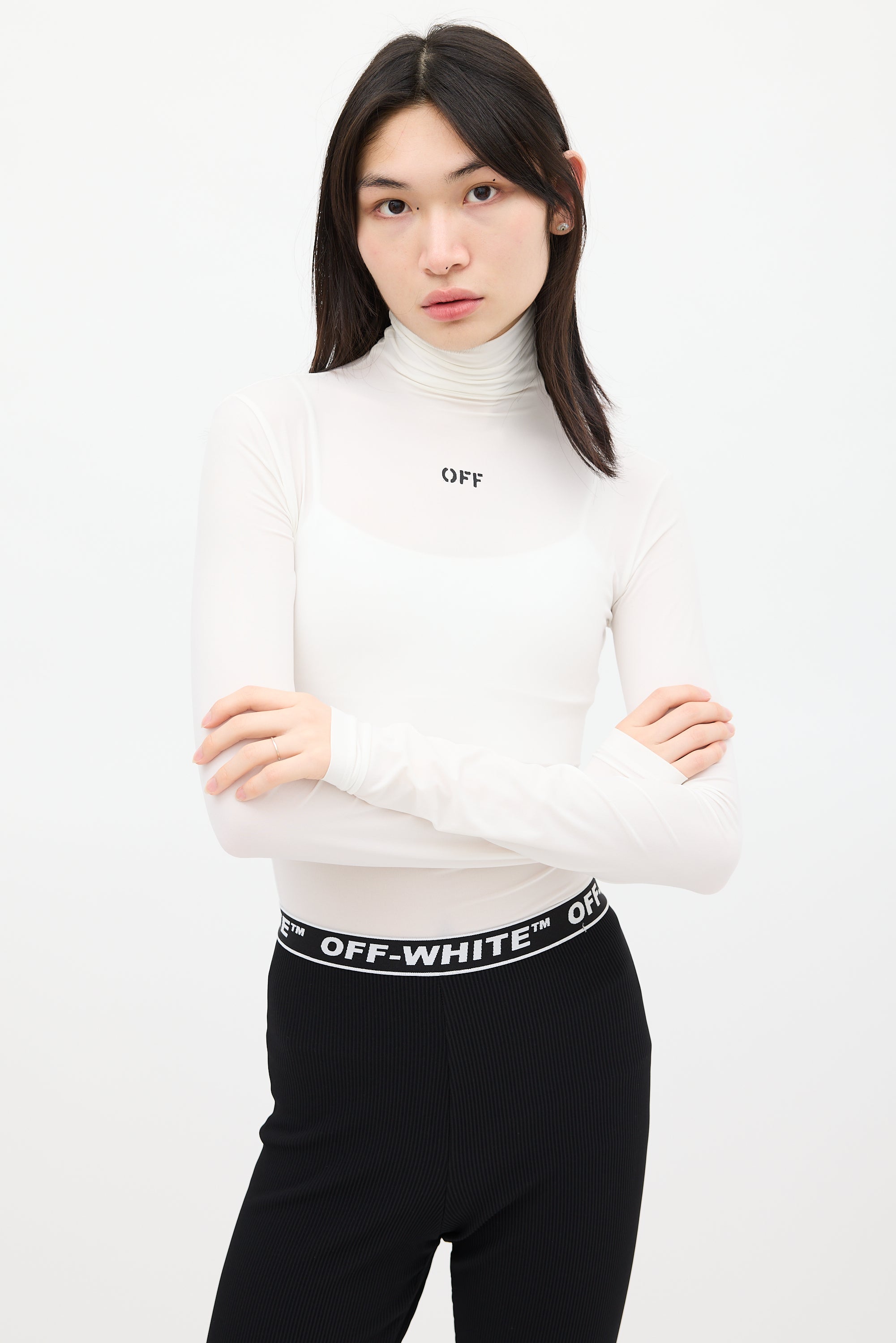 Pre-owned Off-White white top featuring a black logo print at chest, turtleneck, and long sleeves.
