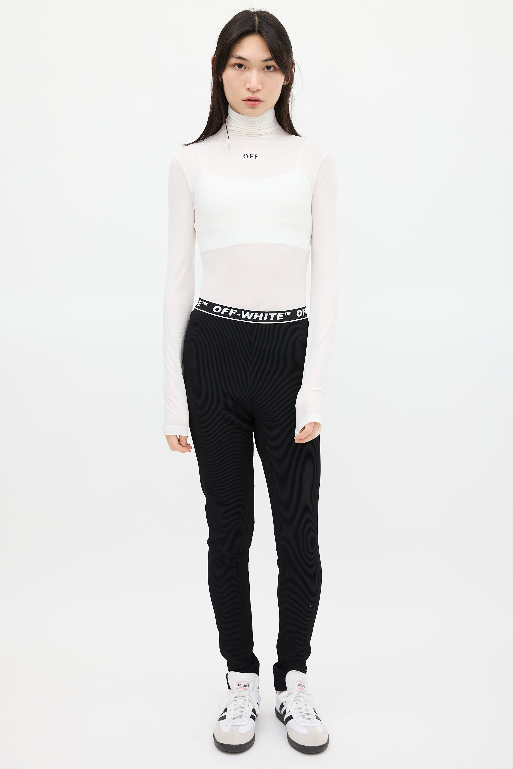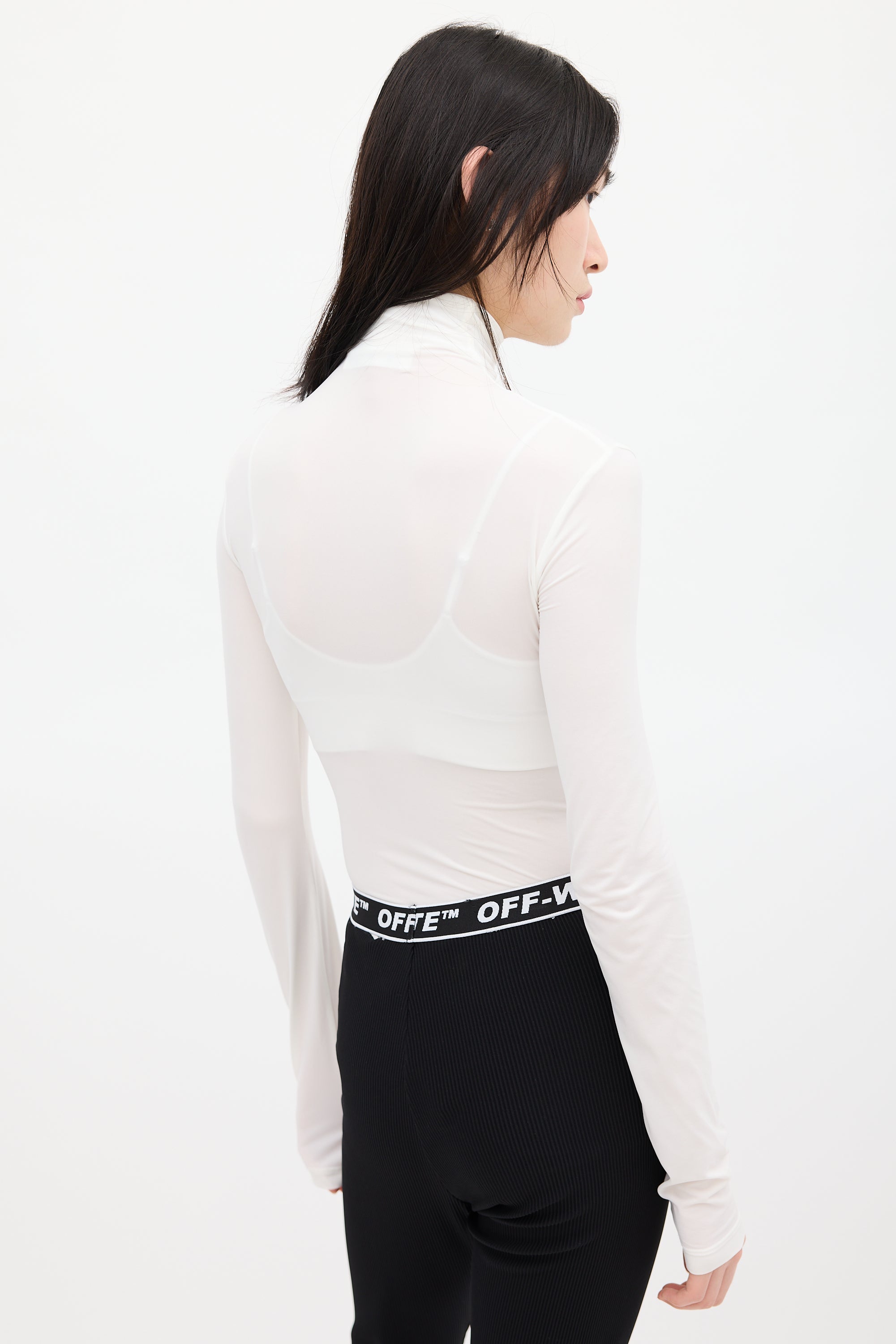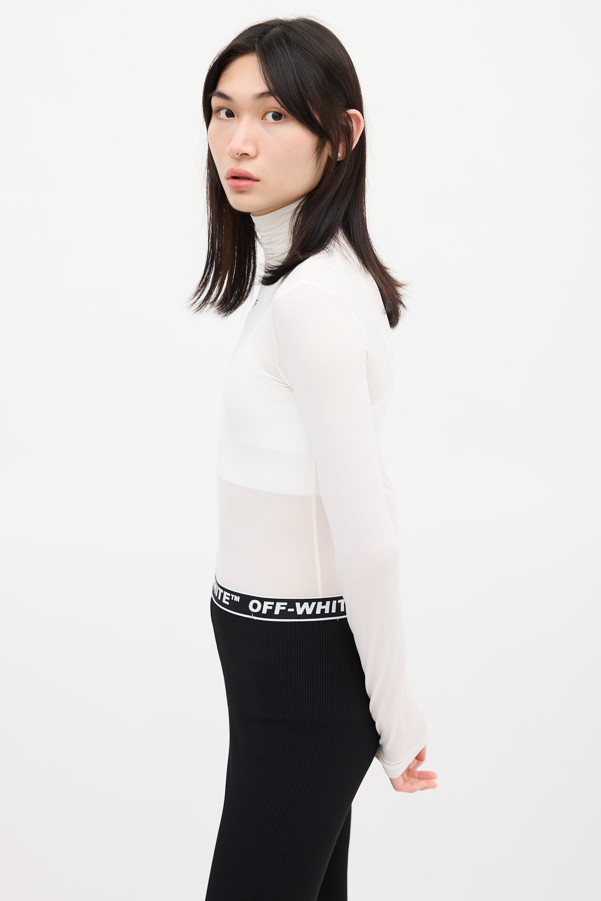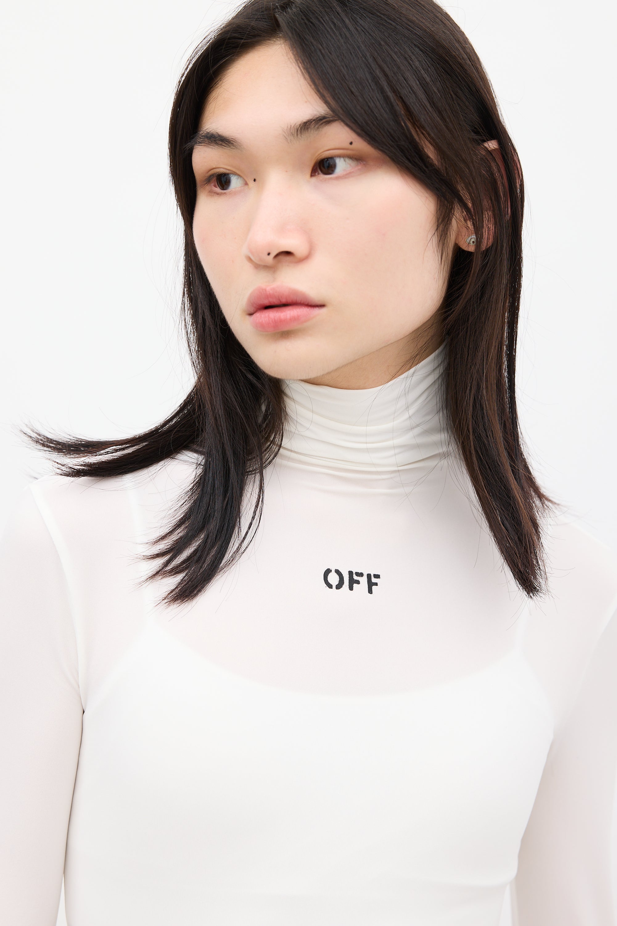 Pre-owned Off-White white top featuring a black logo print at chest, turtleneck, and long sleeves.
