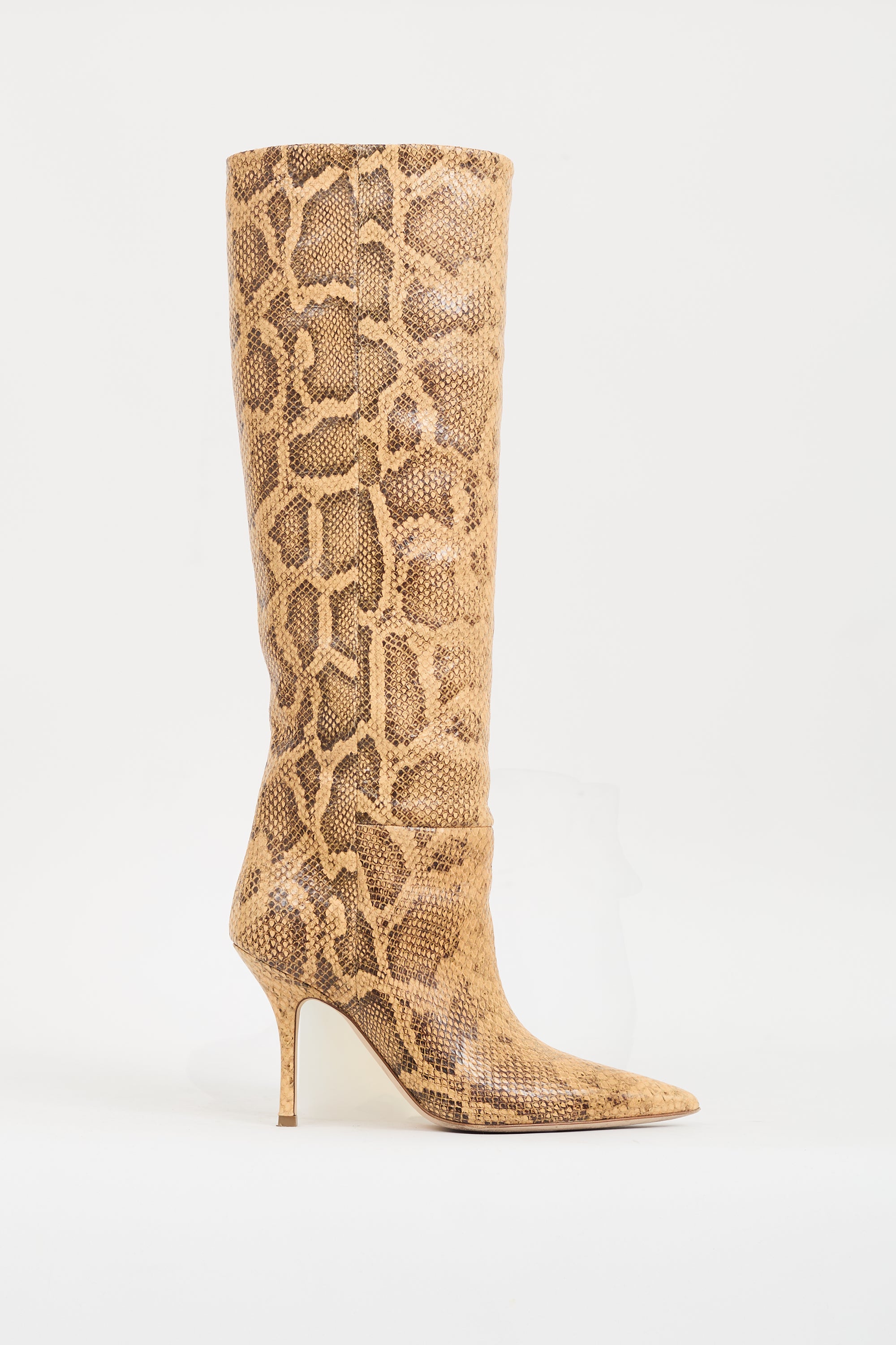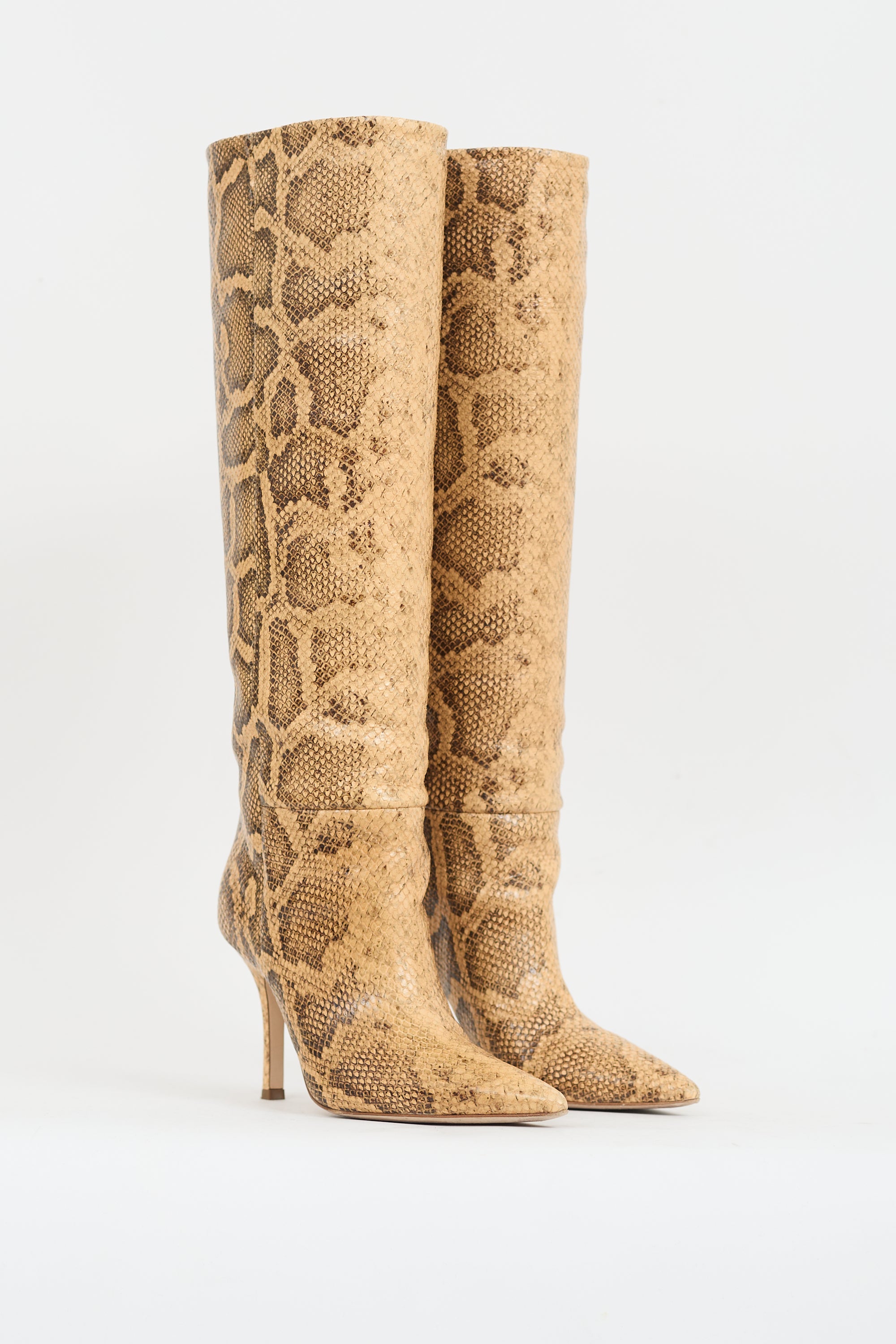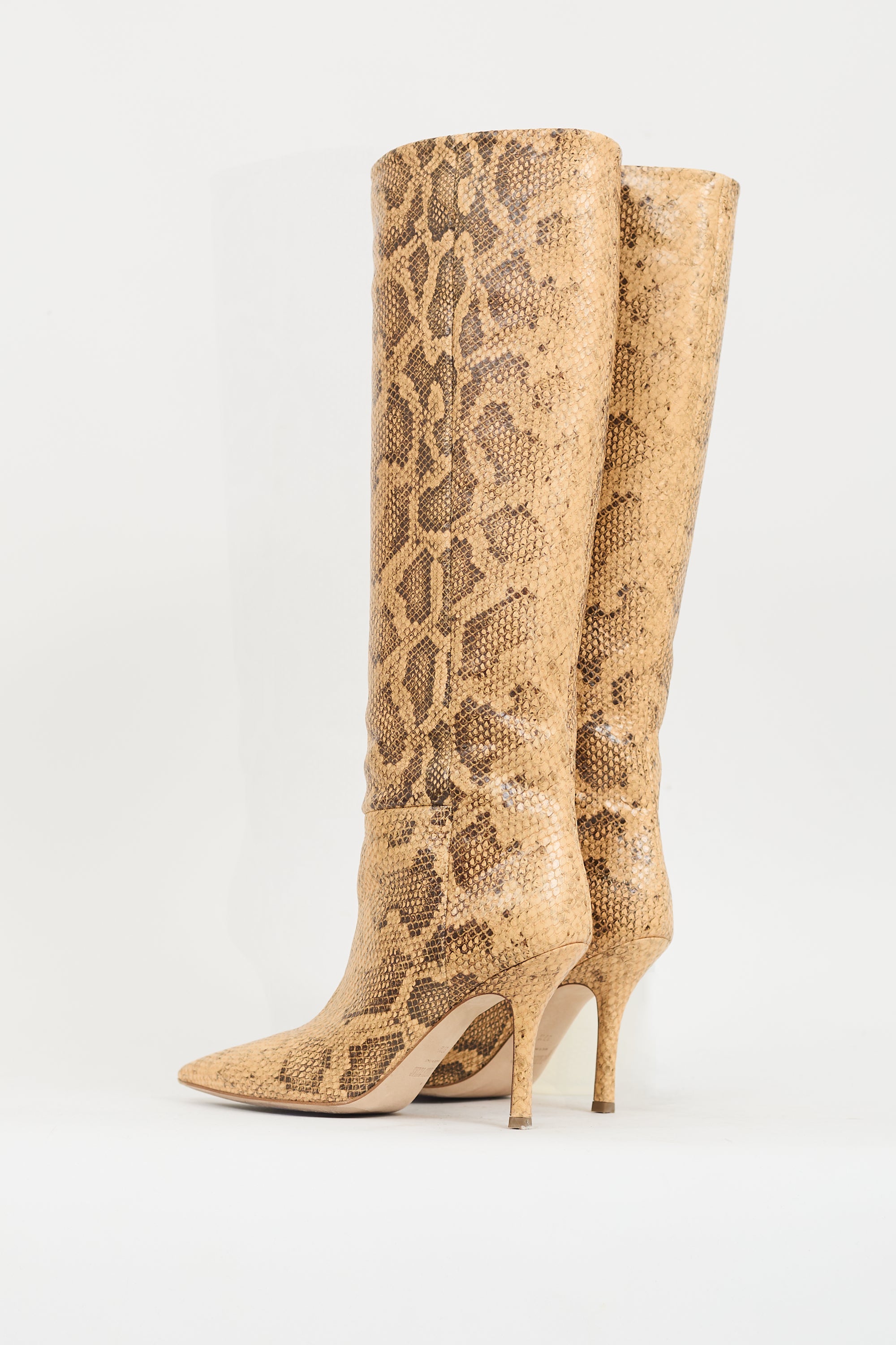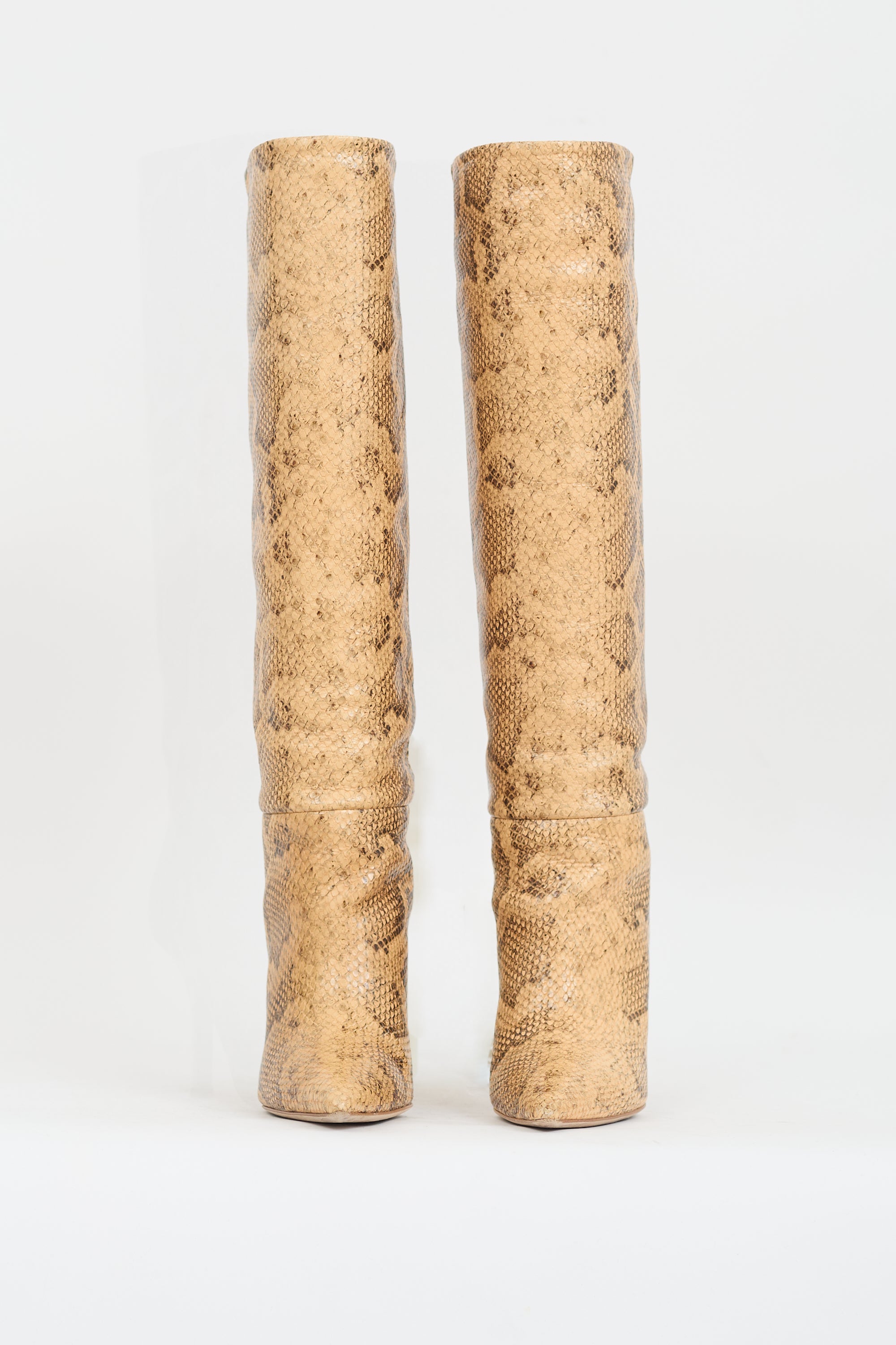 Pre-owned Paris Texas beige leather Mama Wide knee high boots featuring pointed toe, stiletto heel, python printed upper, pull on entry, and leather lining. Comes with original box and dust bag.