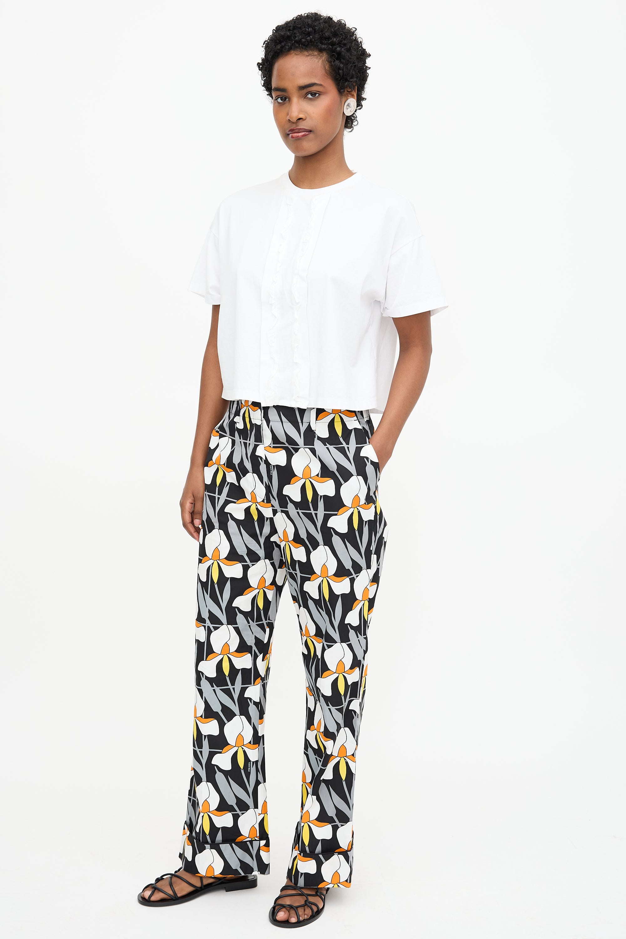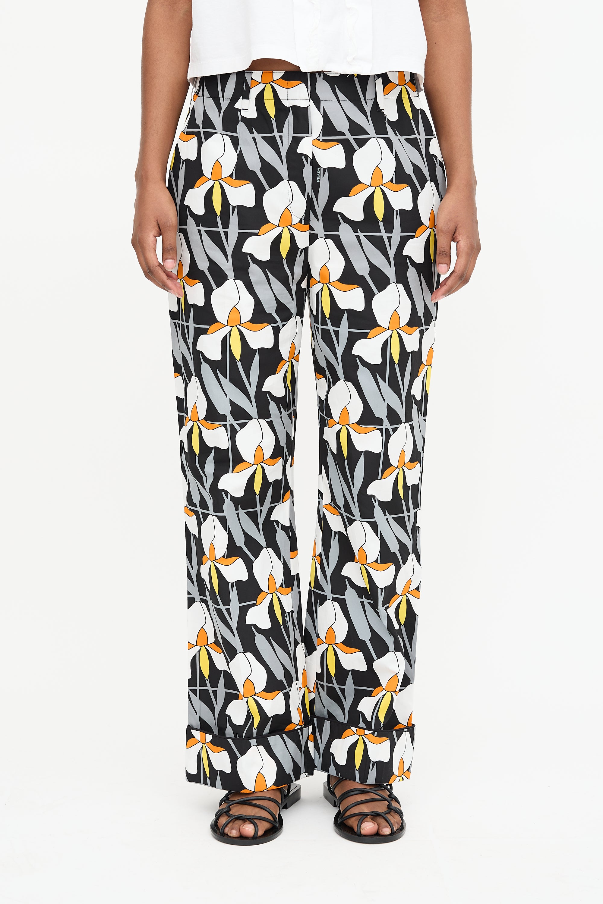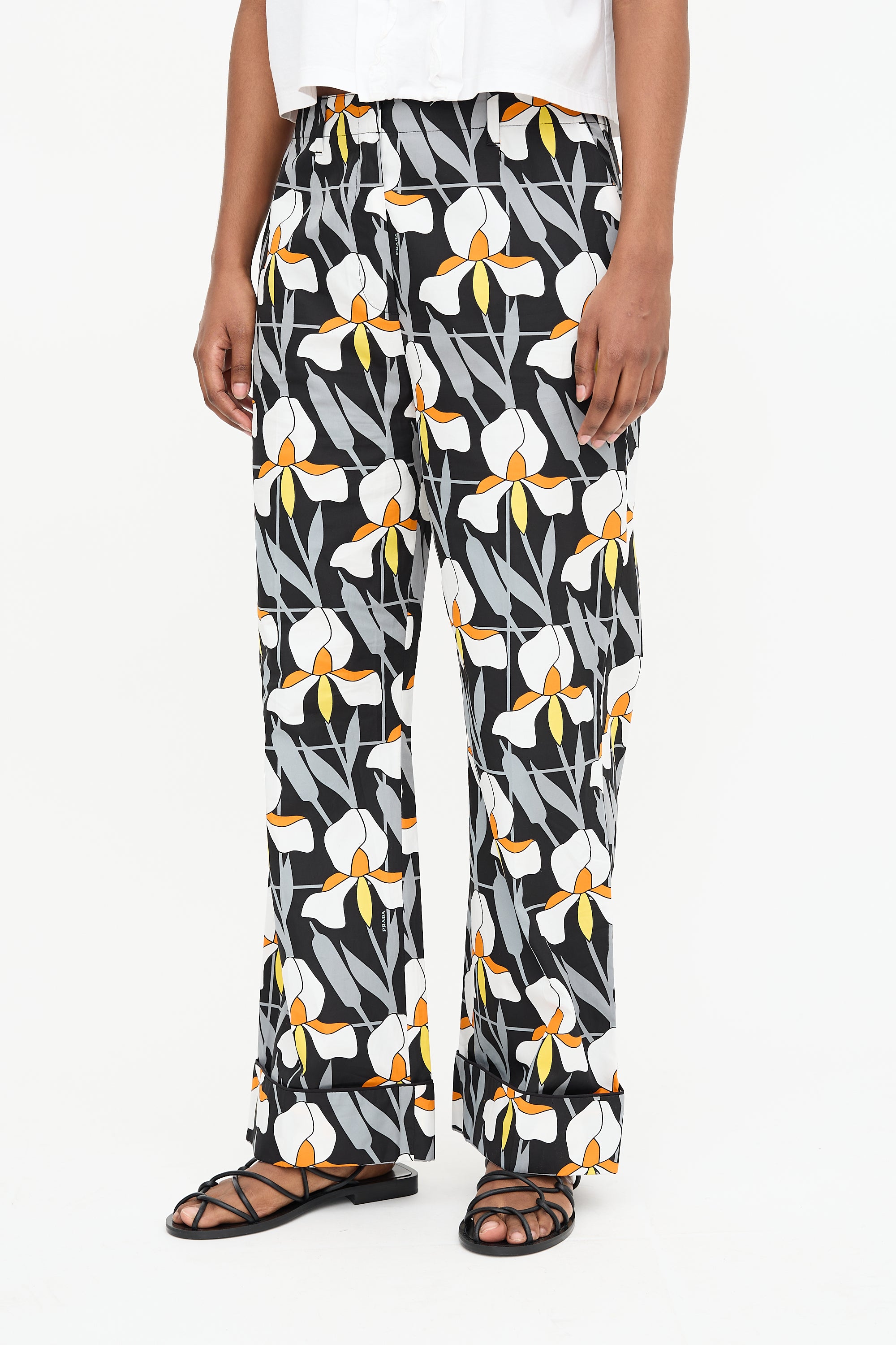 Pre-owned Prada Pre-Fall 2020 black and orange straight leg trouser featuring a geometric orchid pattern, zip fly with hook fastening, belt loops, two slash pockets at hip, two welt pockets at back, and a cuffed hem.