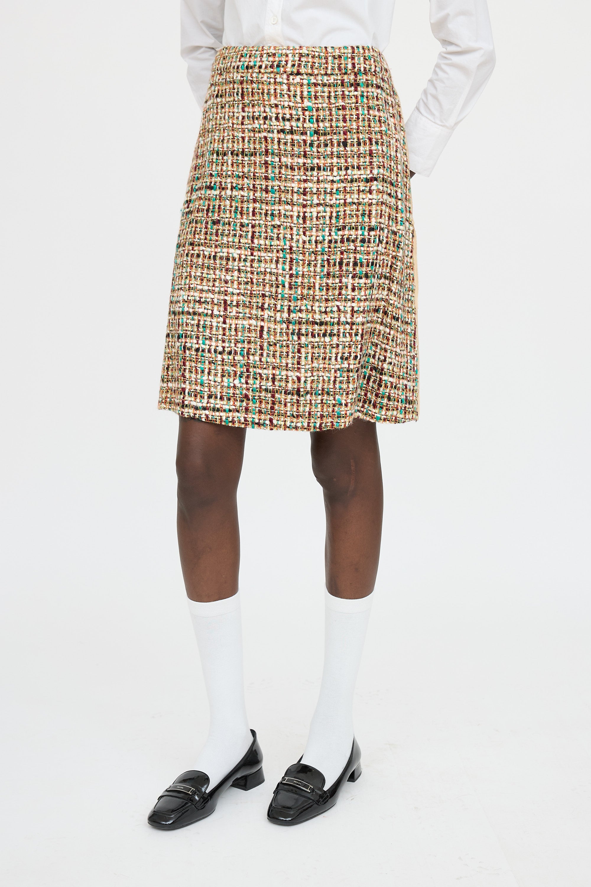 Pre-owned Prada beige and multicolor tweed co-ord set featuring pointed collar jacket, concealed button front, slit pockets at side, and lined. Matching skirt featuring concealed zip at back, raw trimming at side, and lined.