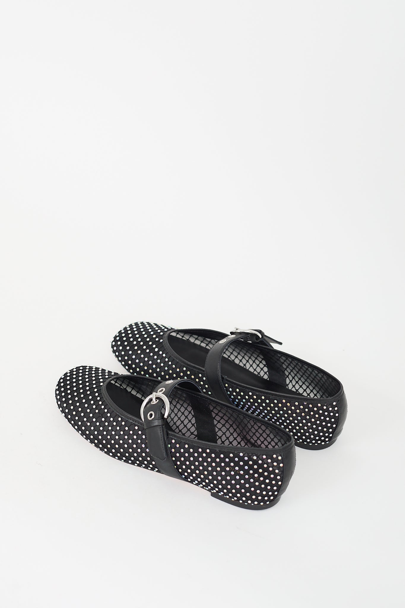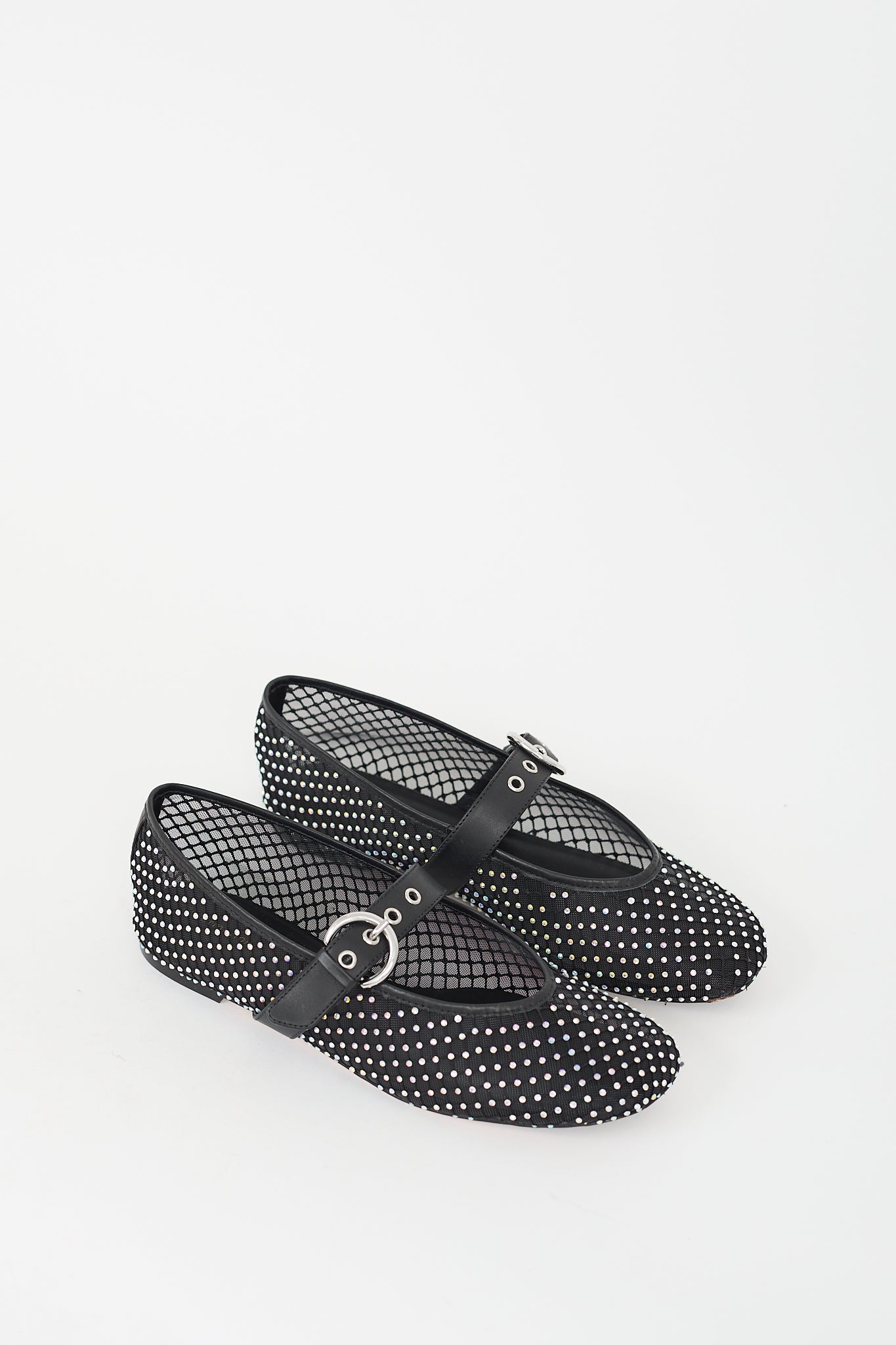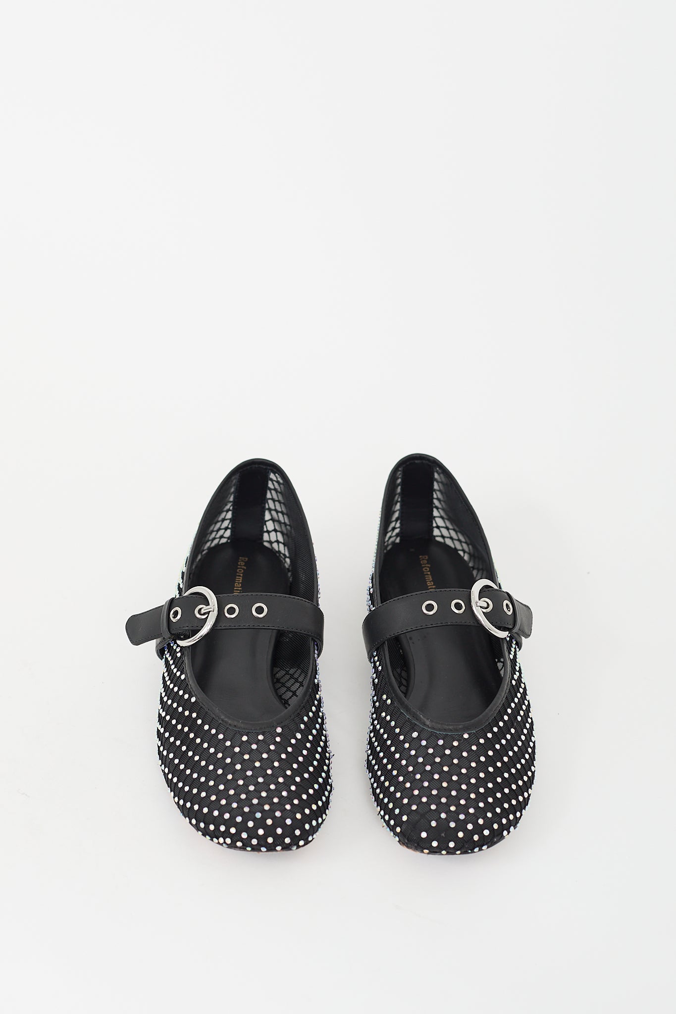 Pre-owned Reformation black mesh Bethany ballet flats featuring rounded toe, crystal embellishment throughout, adjustable strap with buckle closure, and leather trim topline and insole.