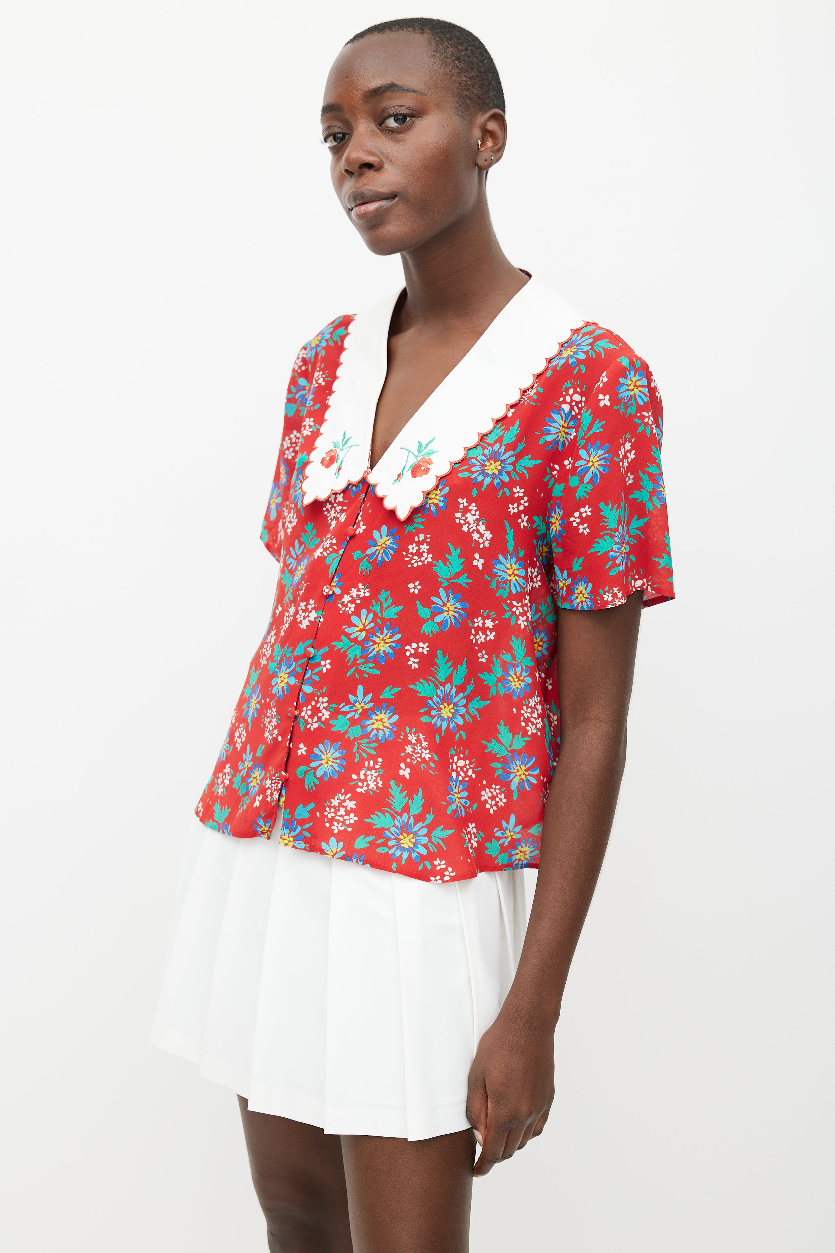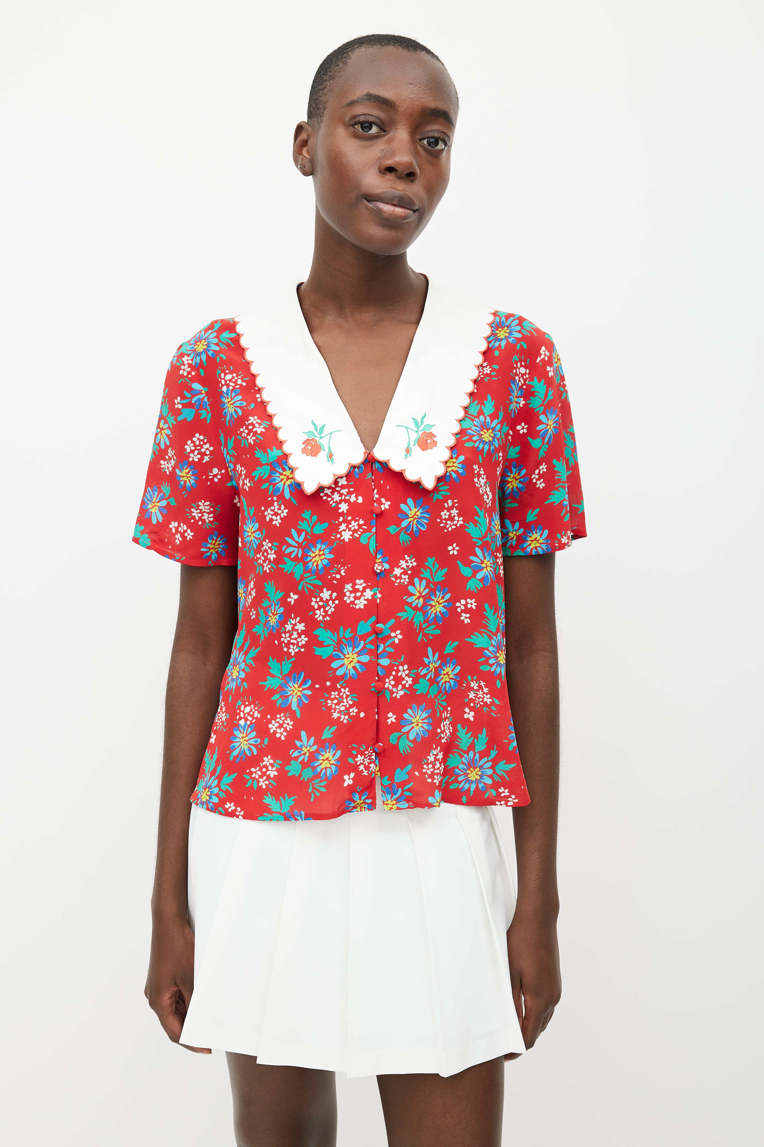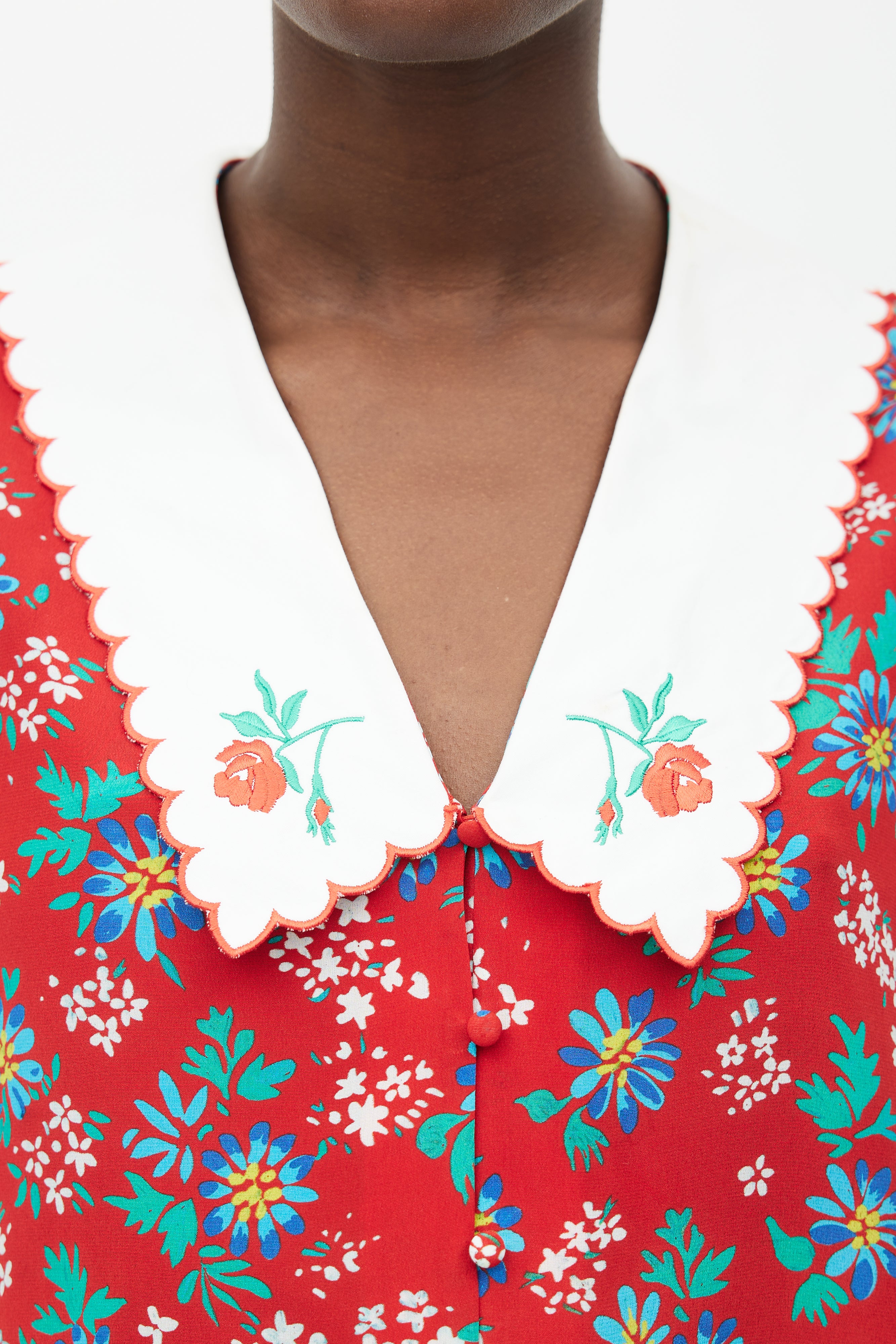 Pre-owned Rixo red blouse featuring white oversized collar with scalloped trim, floral embroidery at collar, multicolour floral print, and button up front.