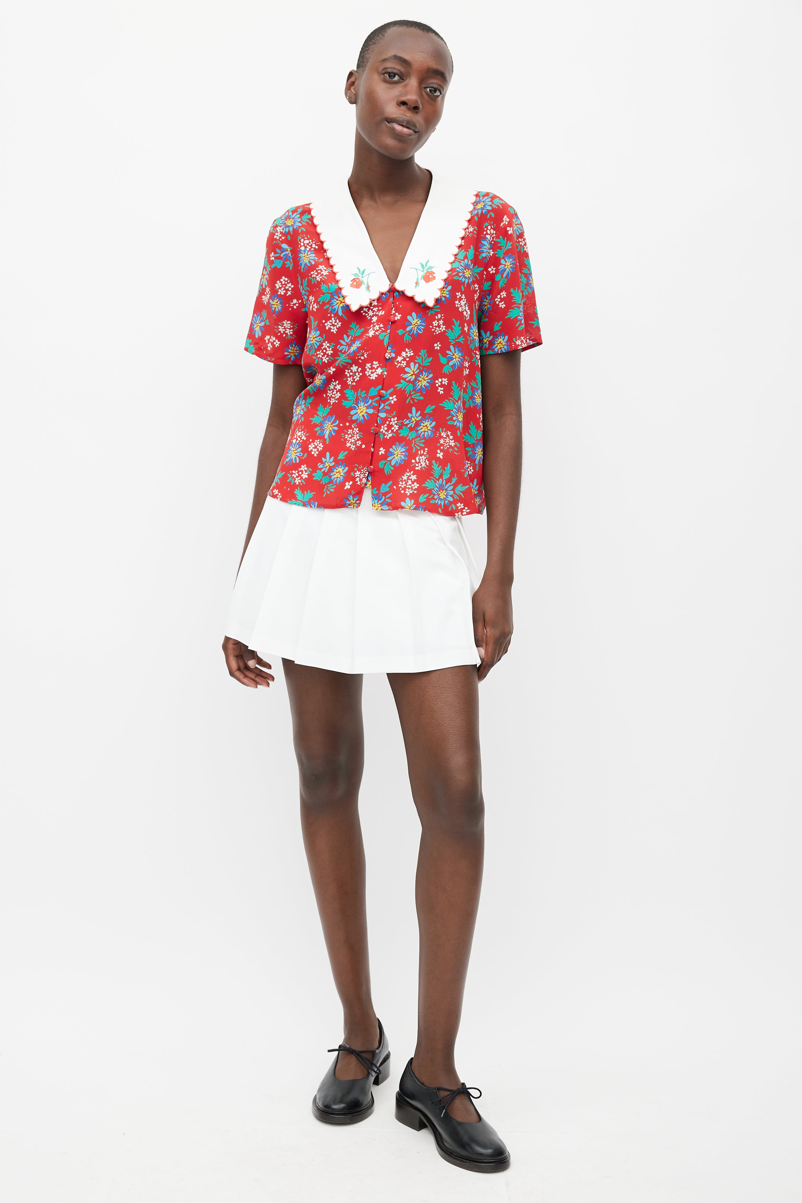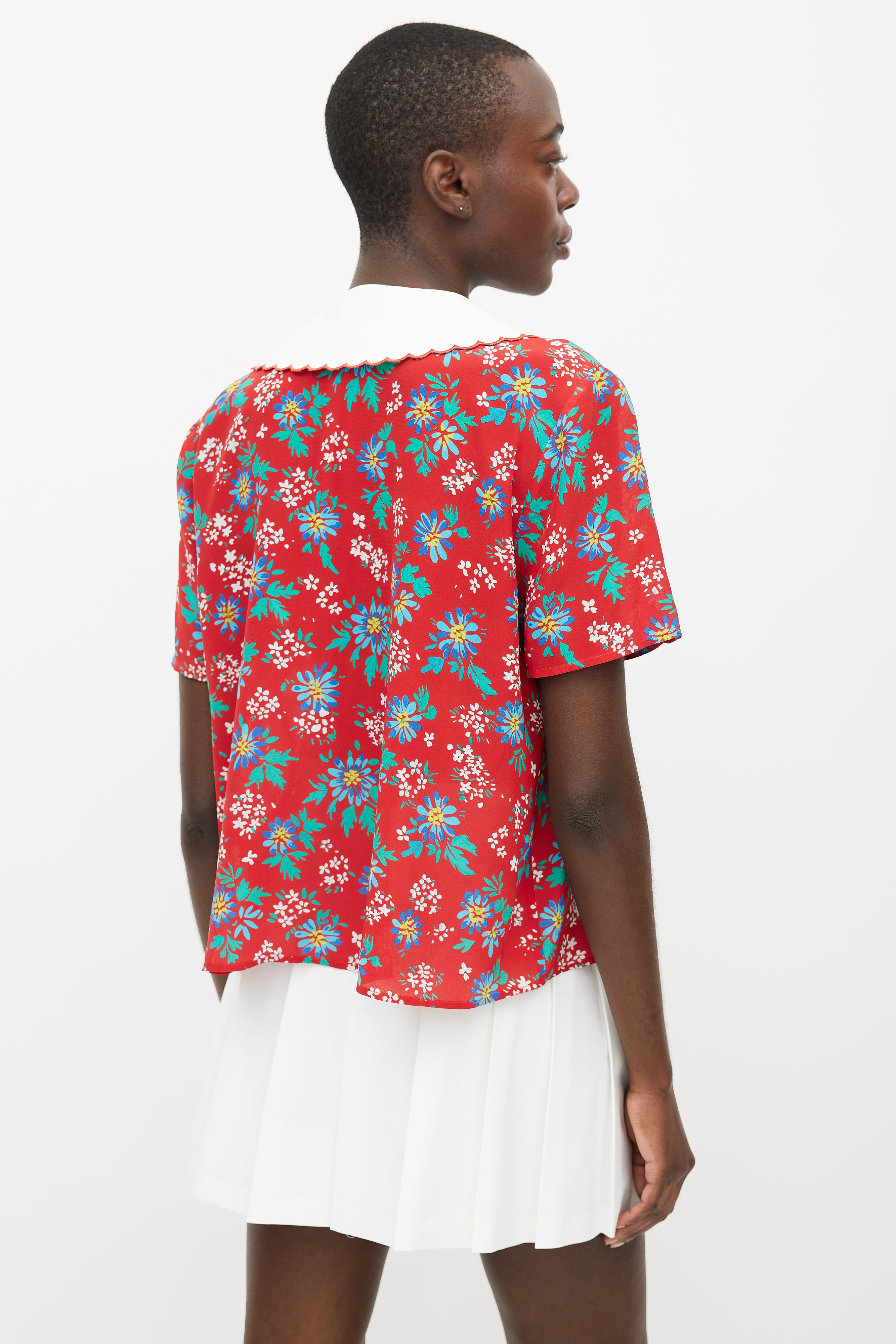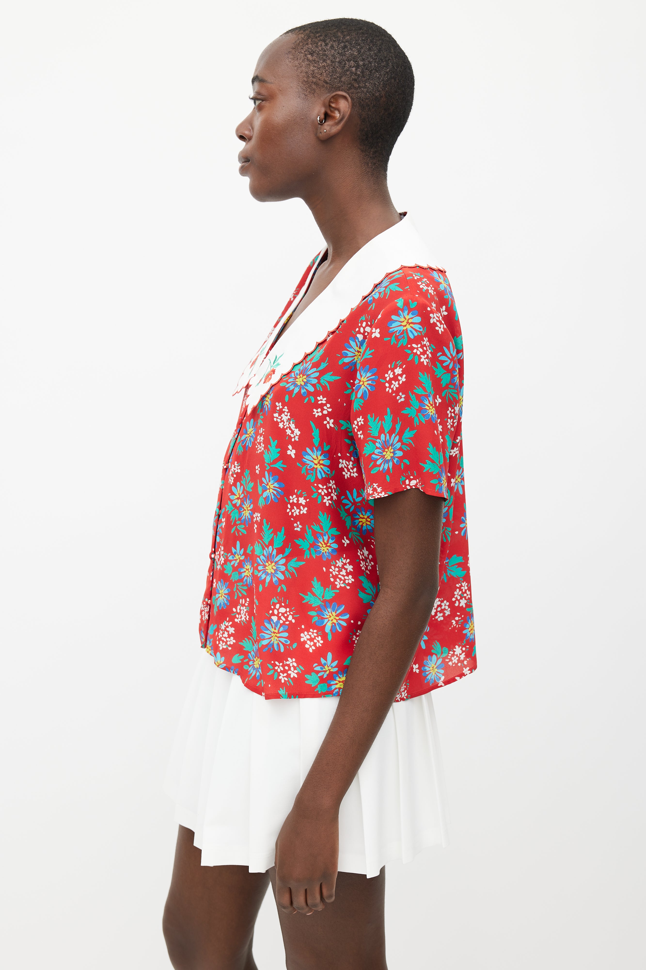Pre-owned Rixo red blouse featuring white oversized collar with scalloped trim, floral embroidery at collar, multicolour floral print, and button up front.