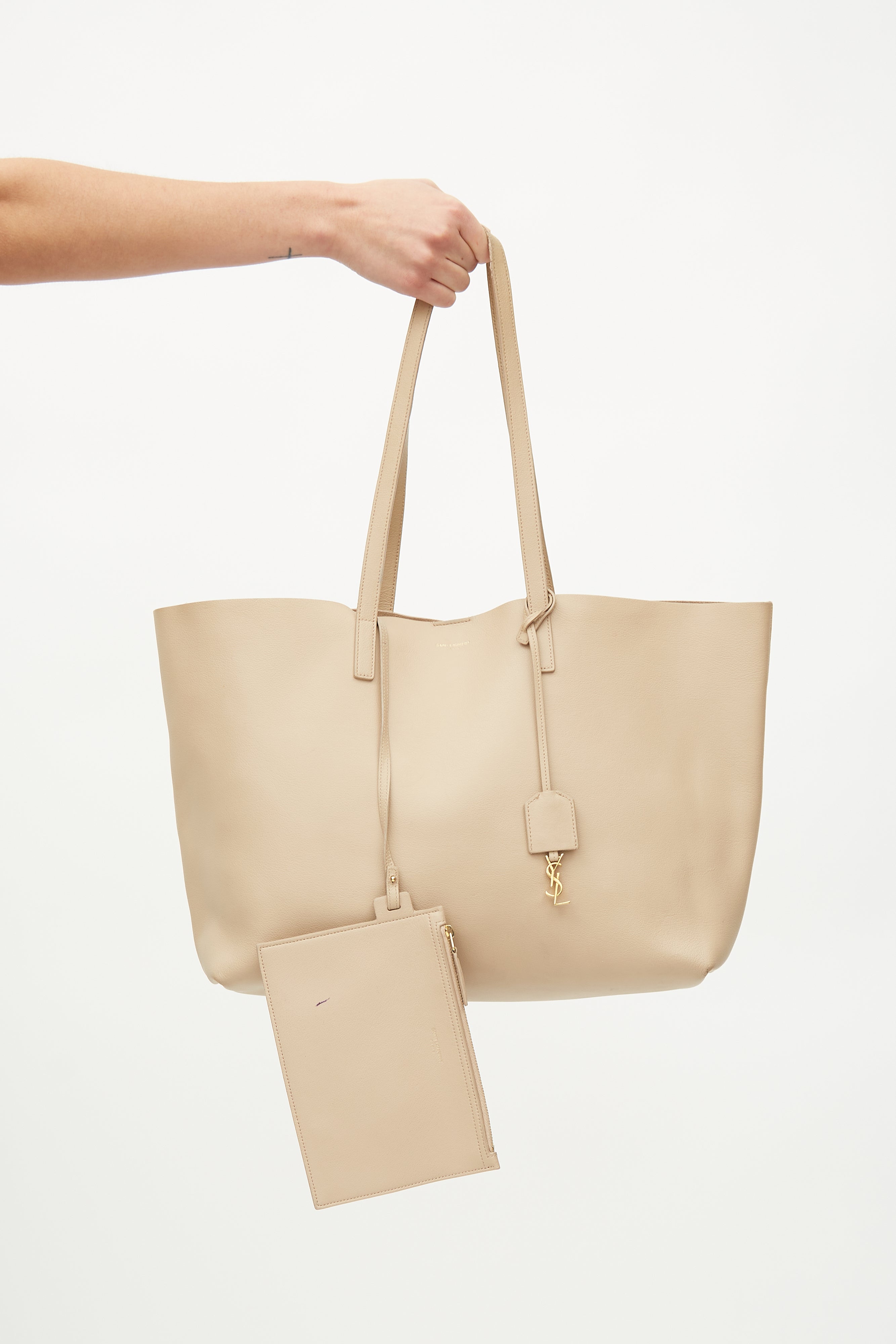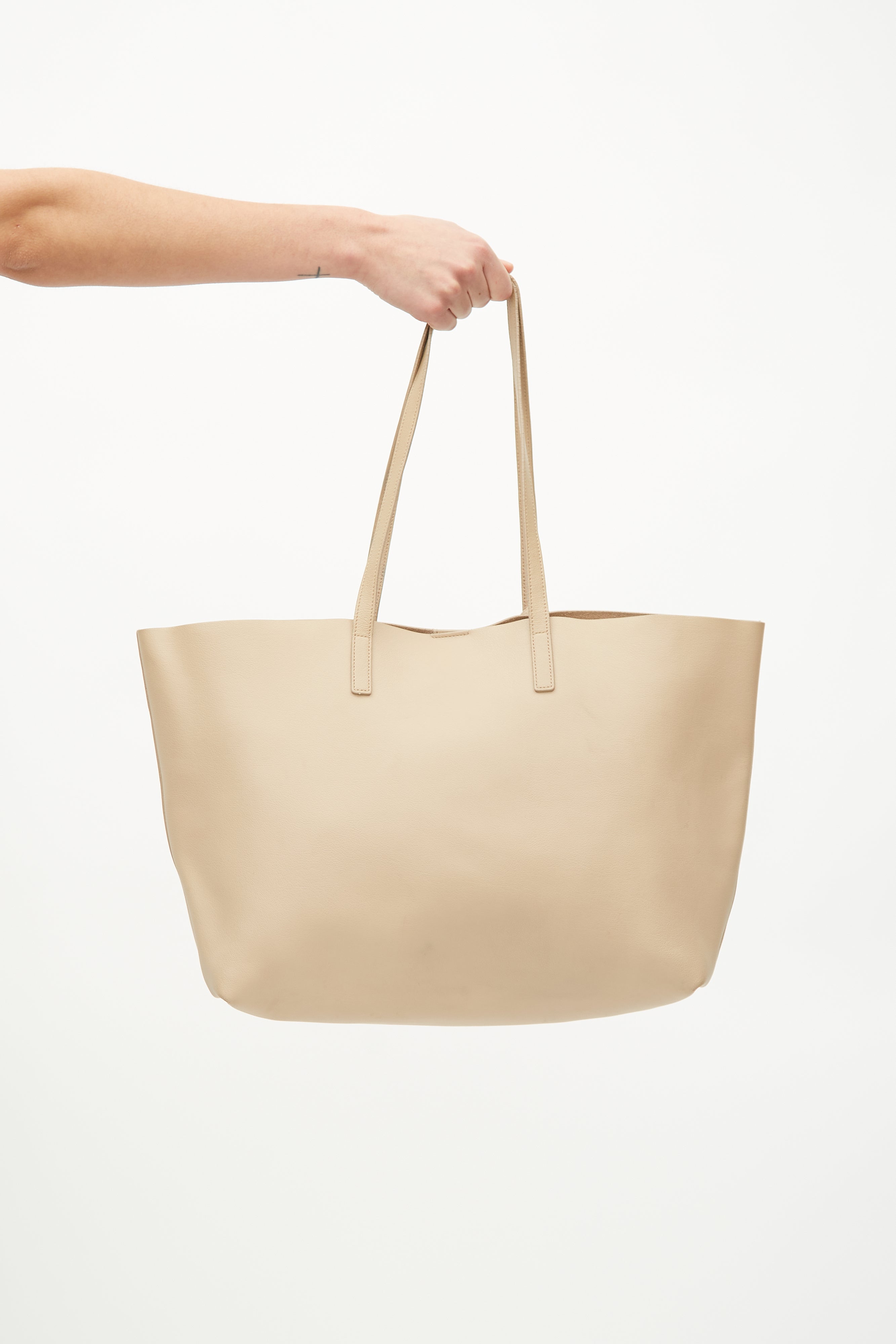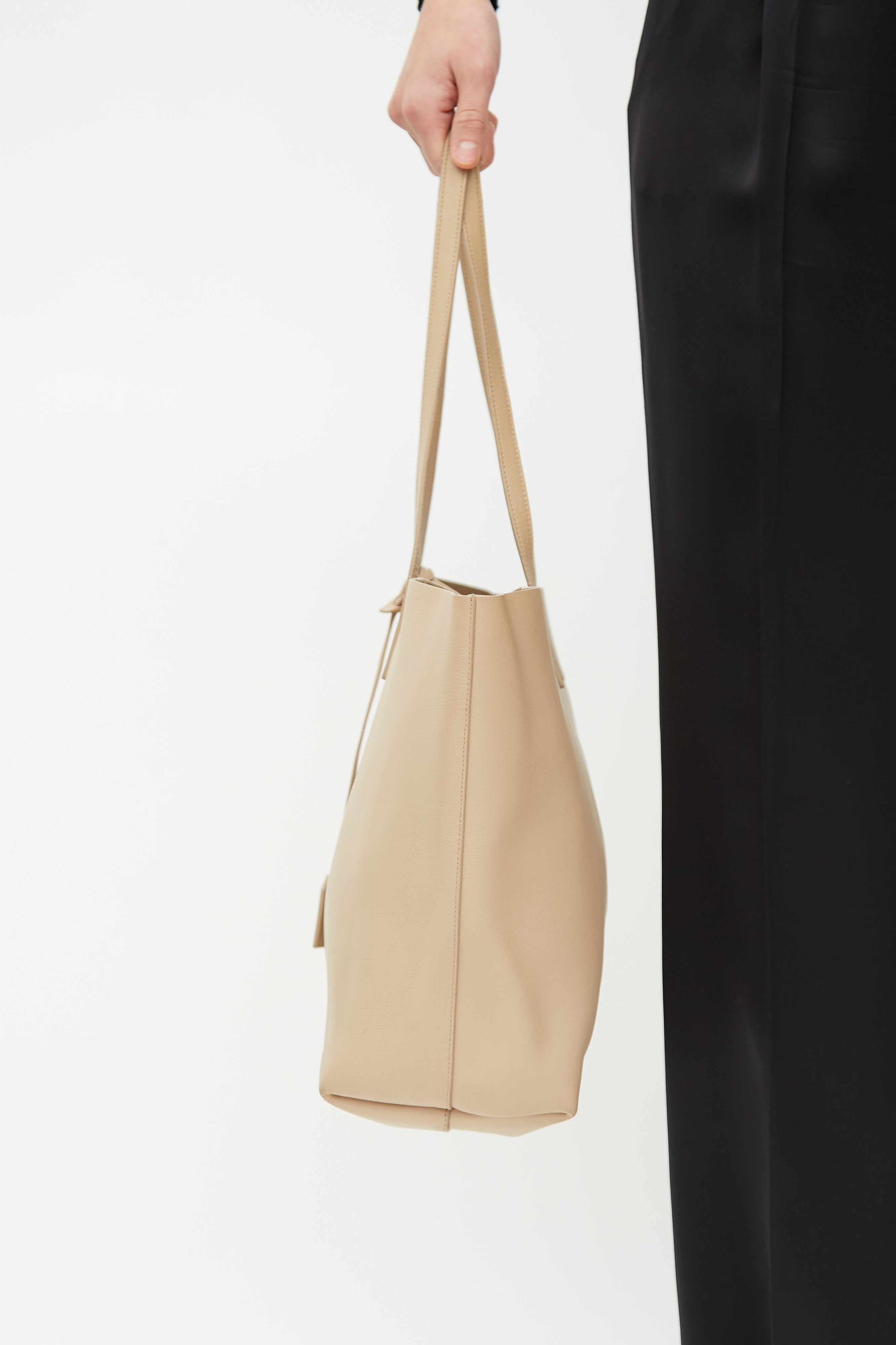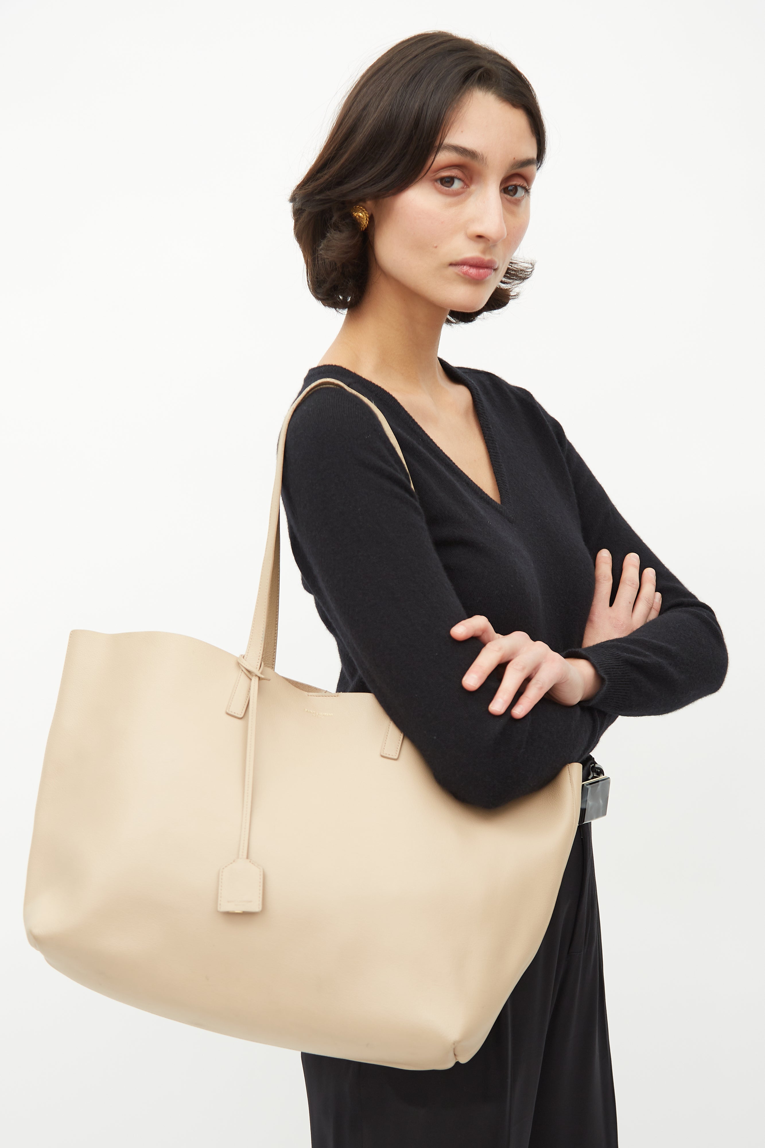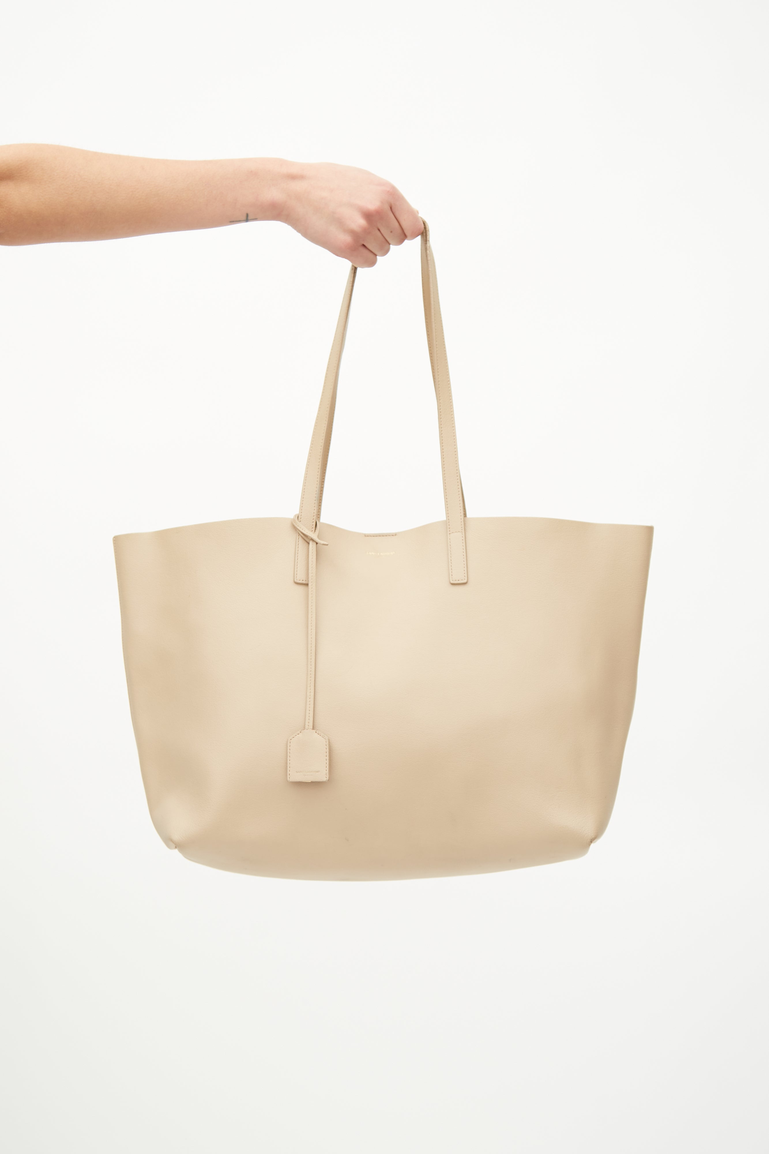 Pre-owned Saint Laurent beige Shopping Tote leather bag featuring two top handles, gold tone embossed logo at front, gold tone Cassandre logo clochette, one main compartment with removable logo pouch, and top snap closure. Comes with original dust bag.