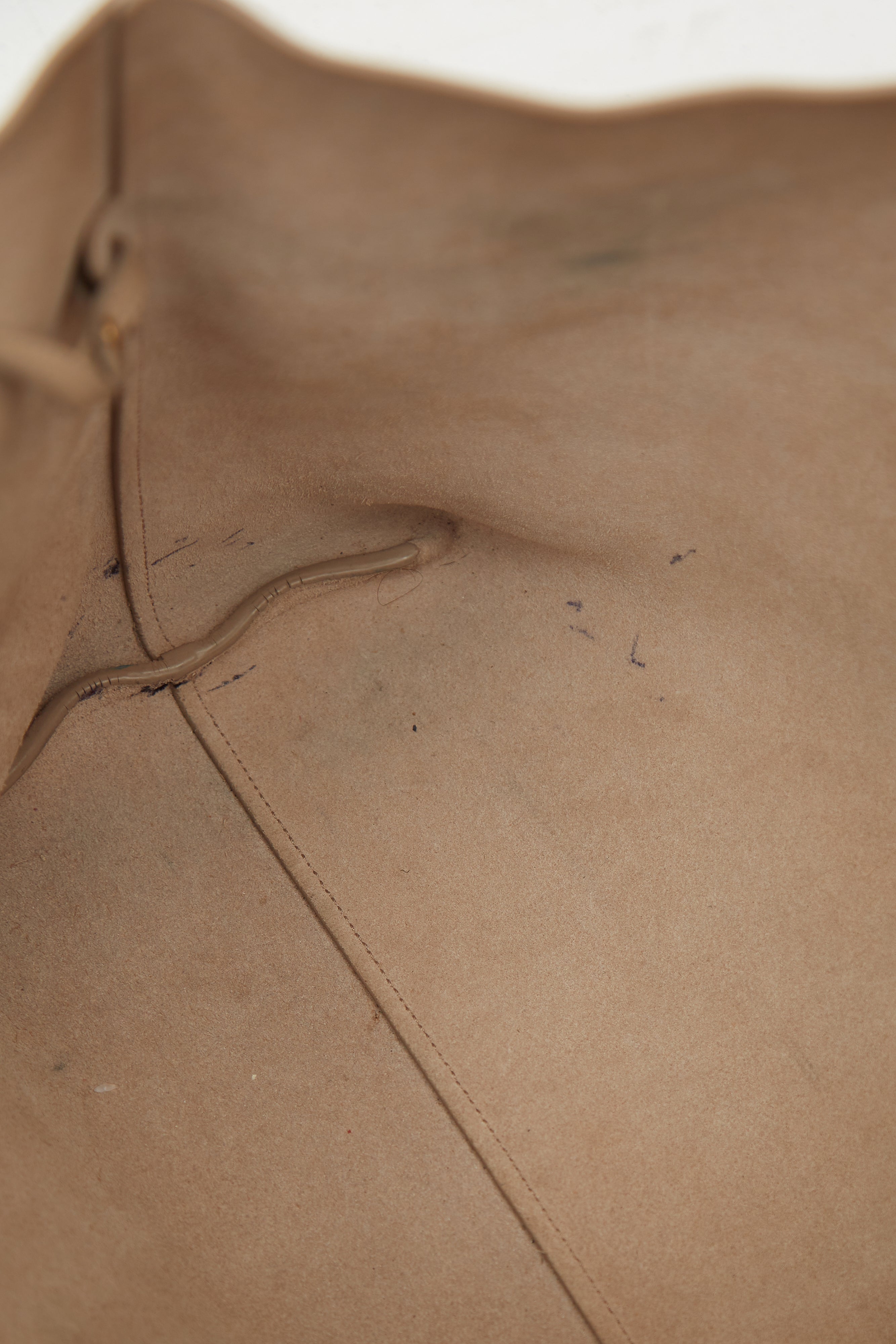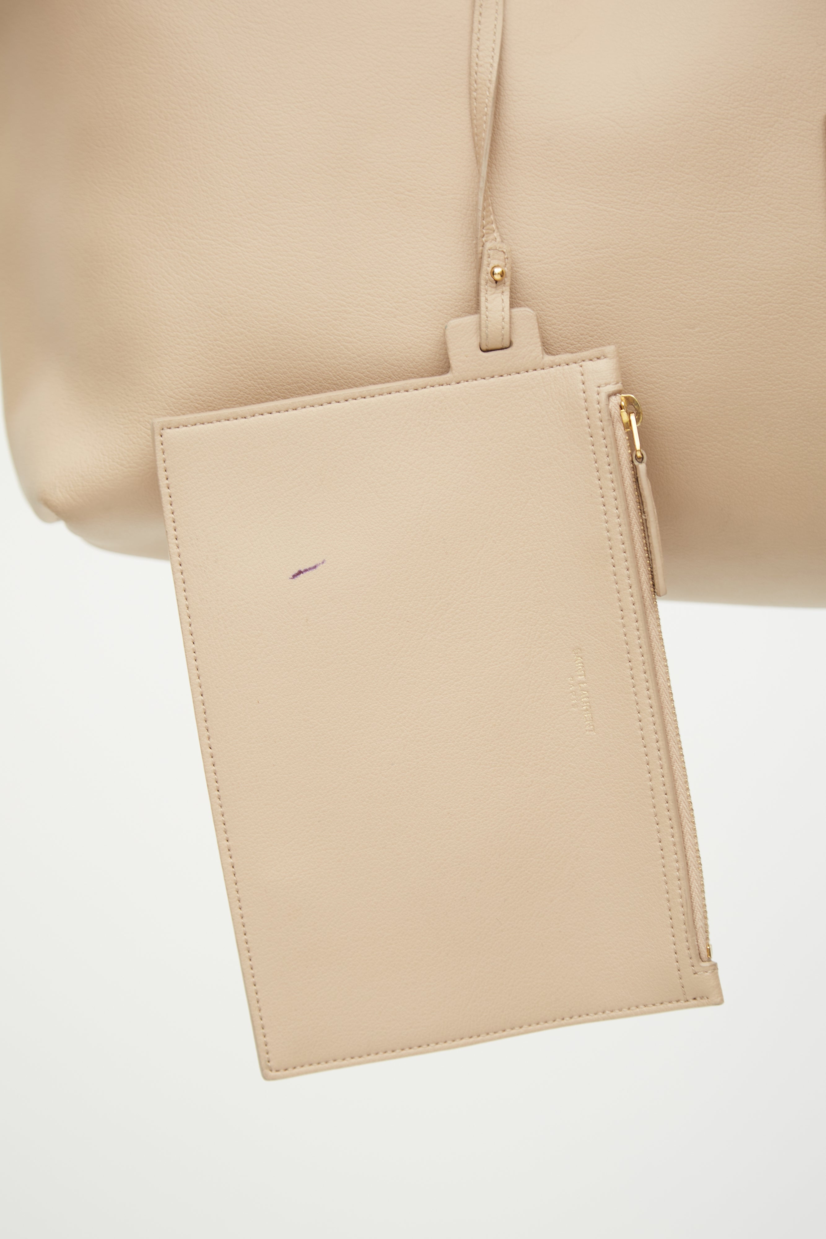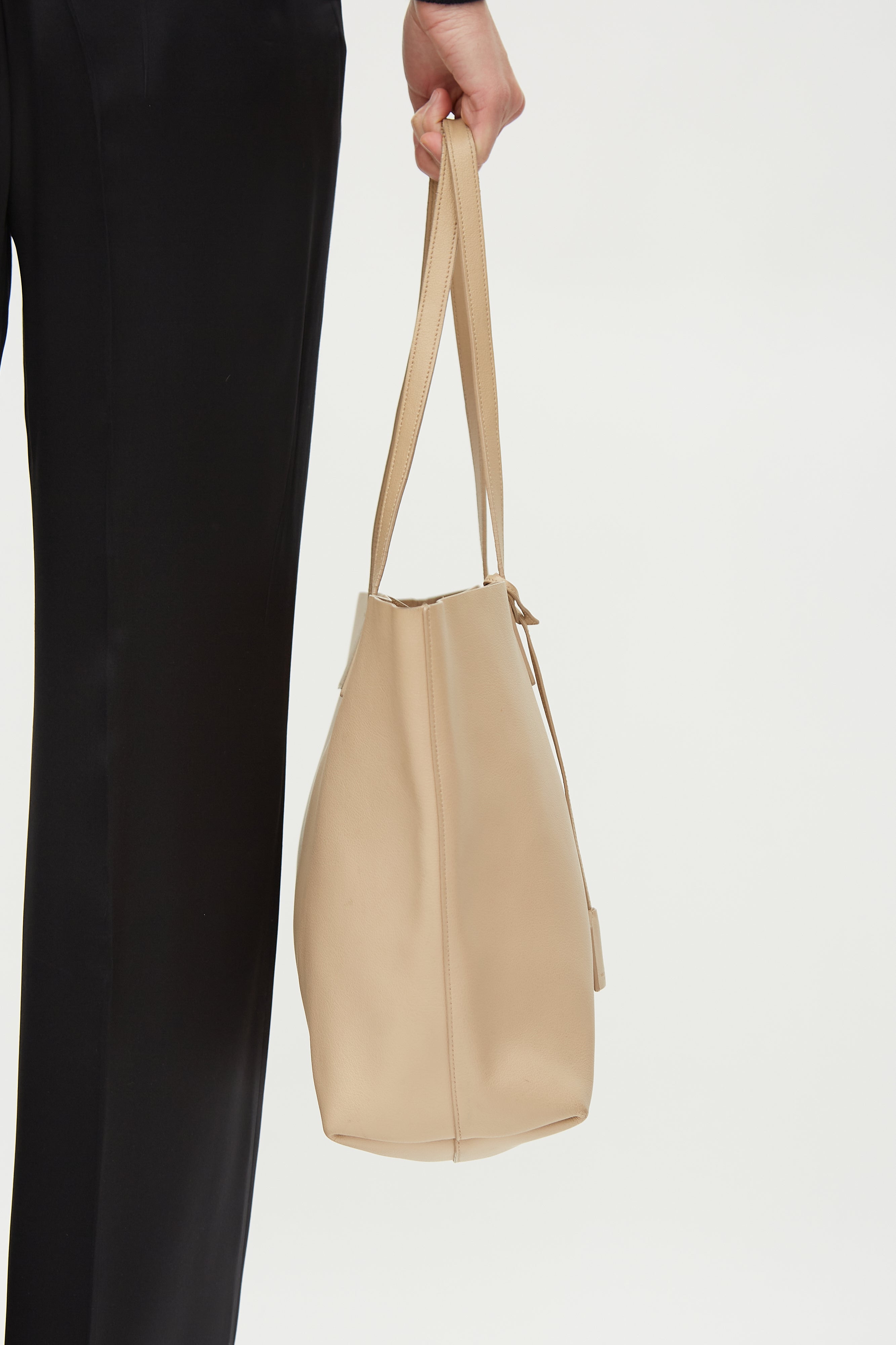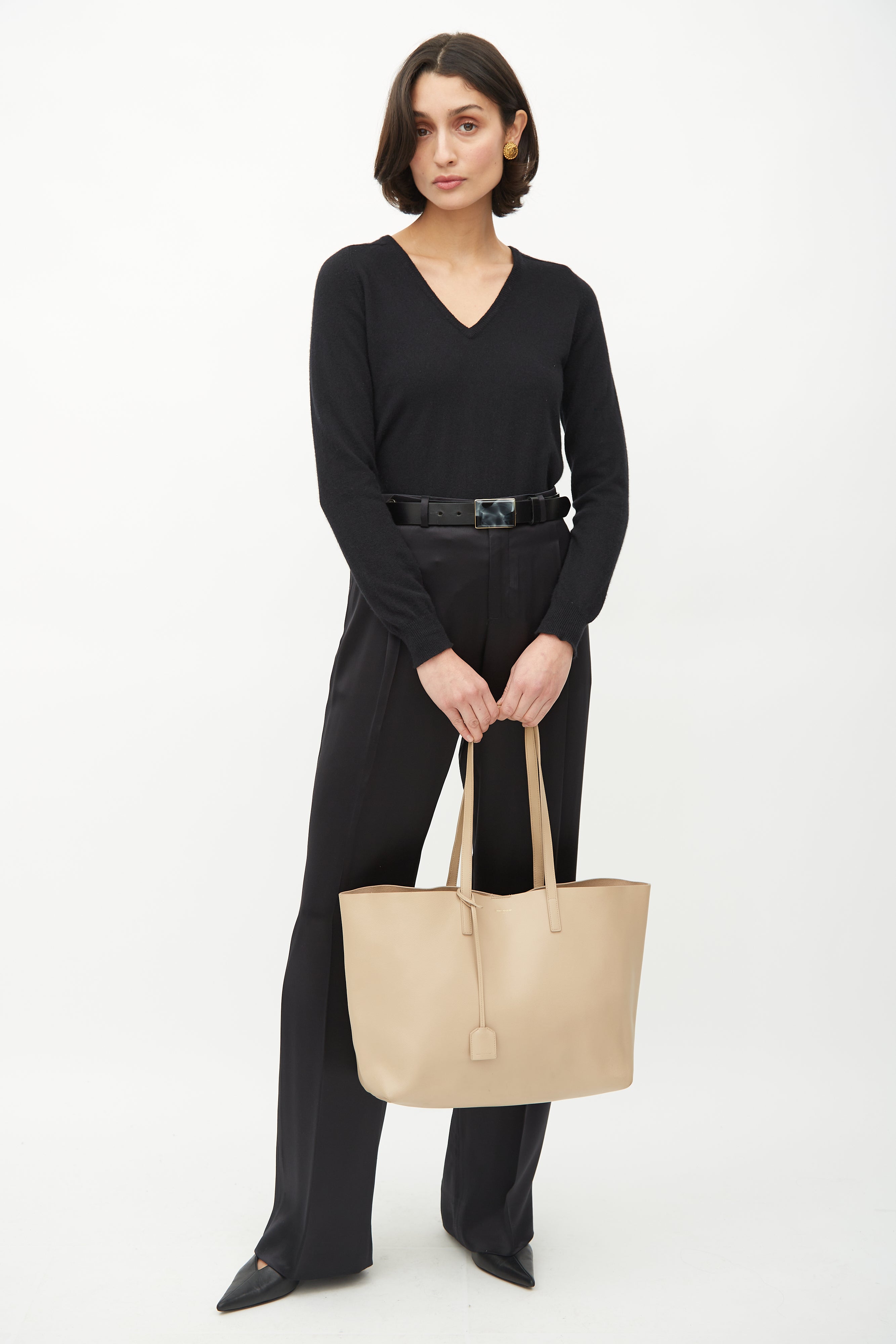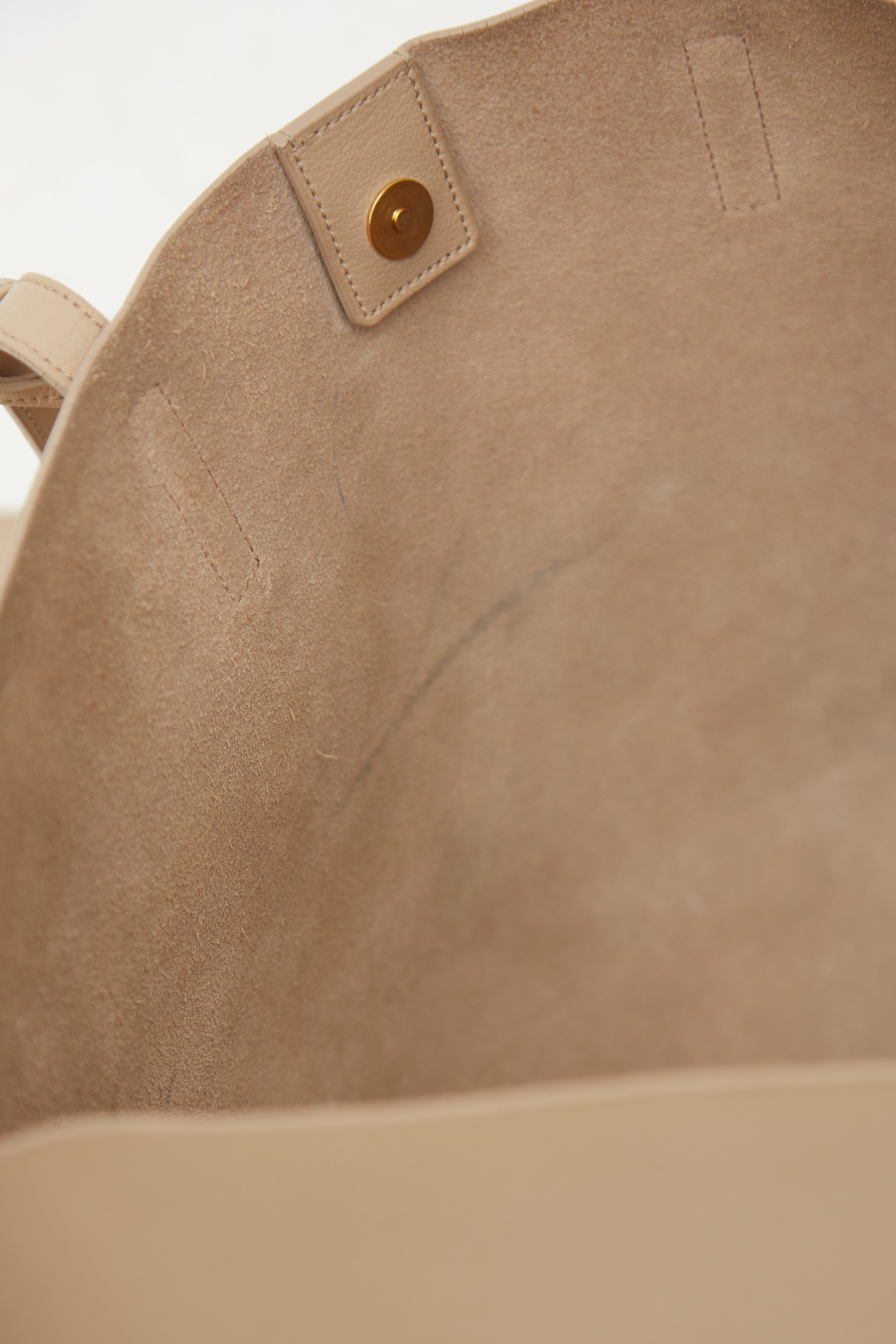 Pre-owned Saint Laurent beige Shopping Tote leather bag featuring two top handles, gold tone embossed logo at front, gold tone Cassandre logo clochette, one main compartment with removable logo pouch, and top snap closure. Comes with original dust bag.