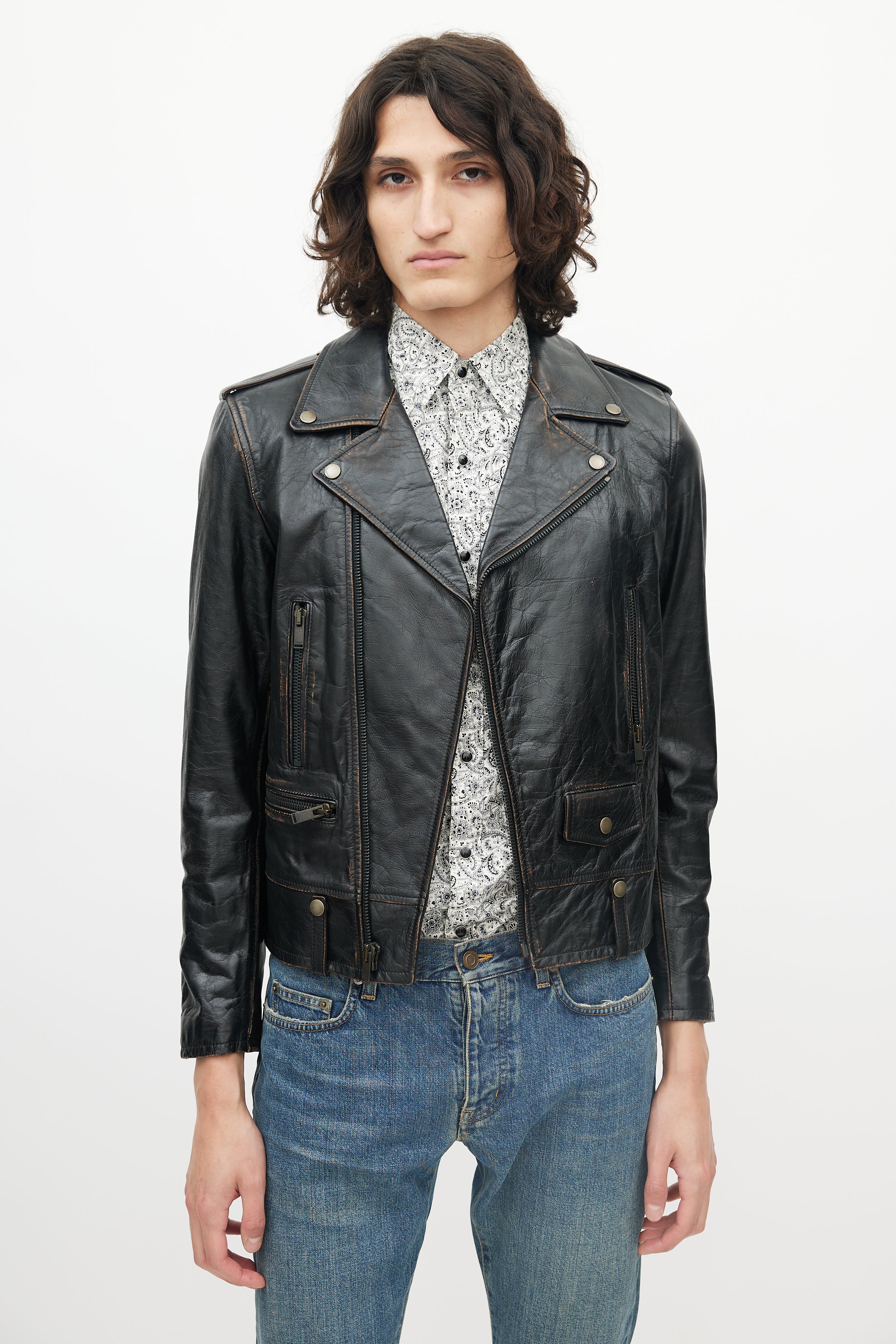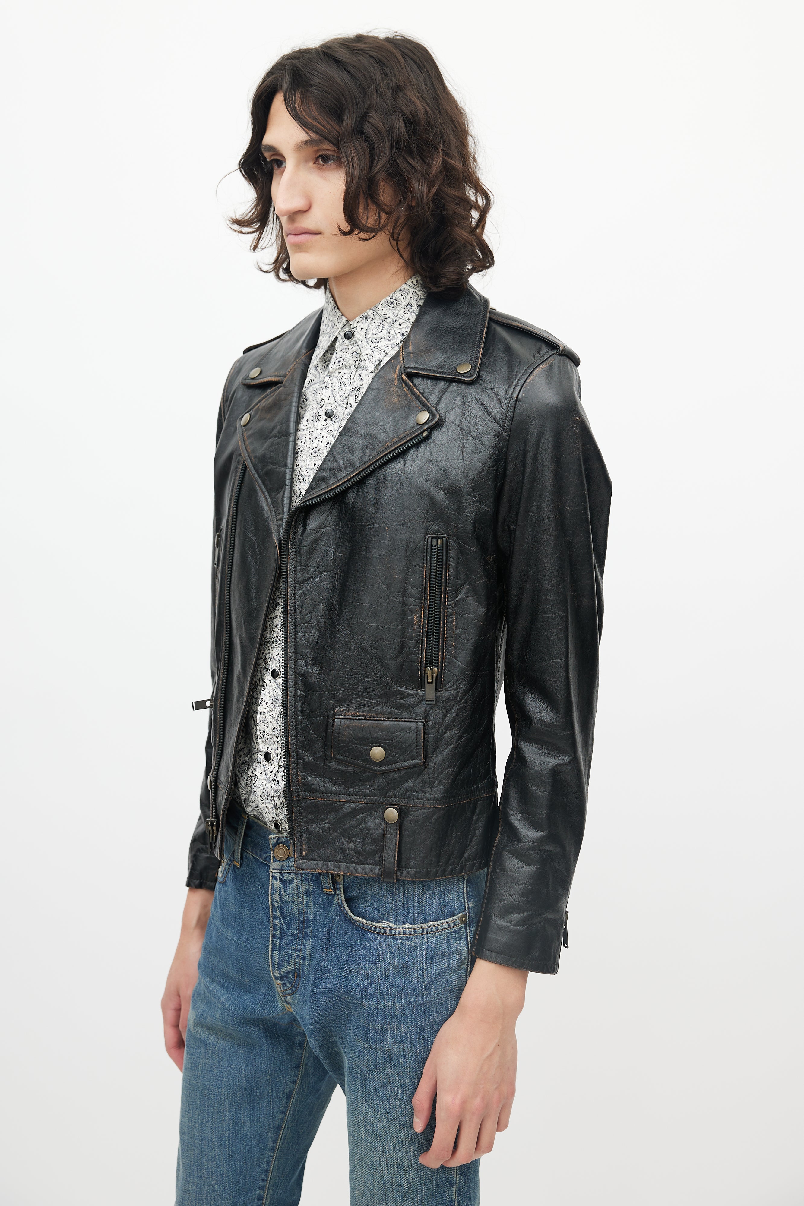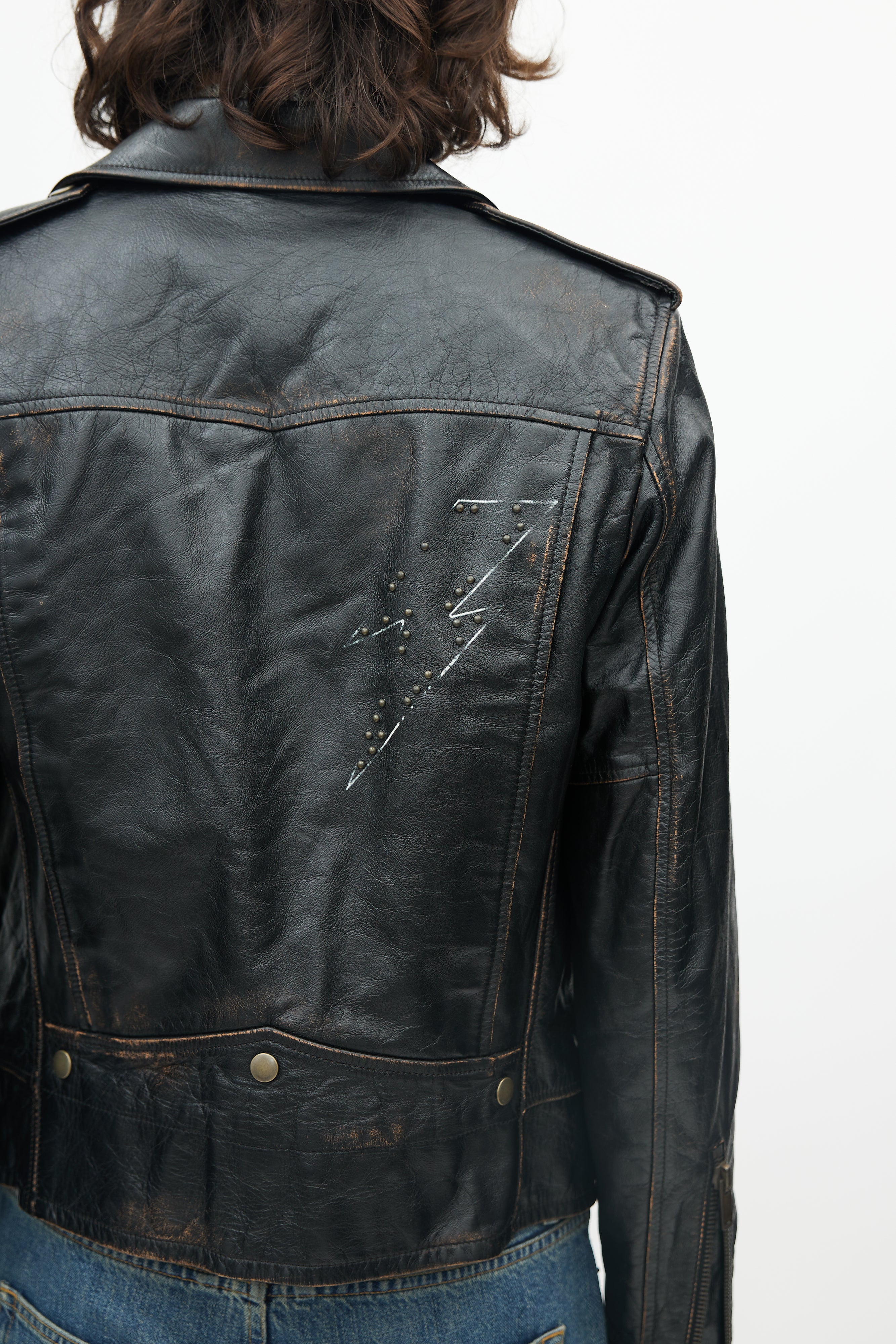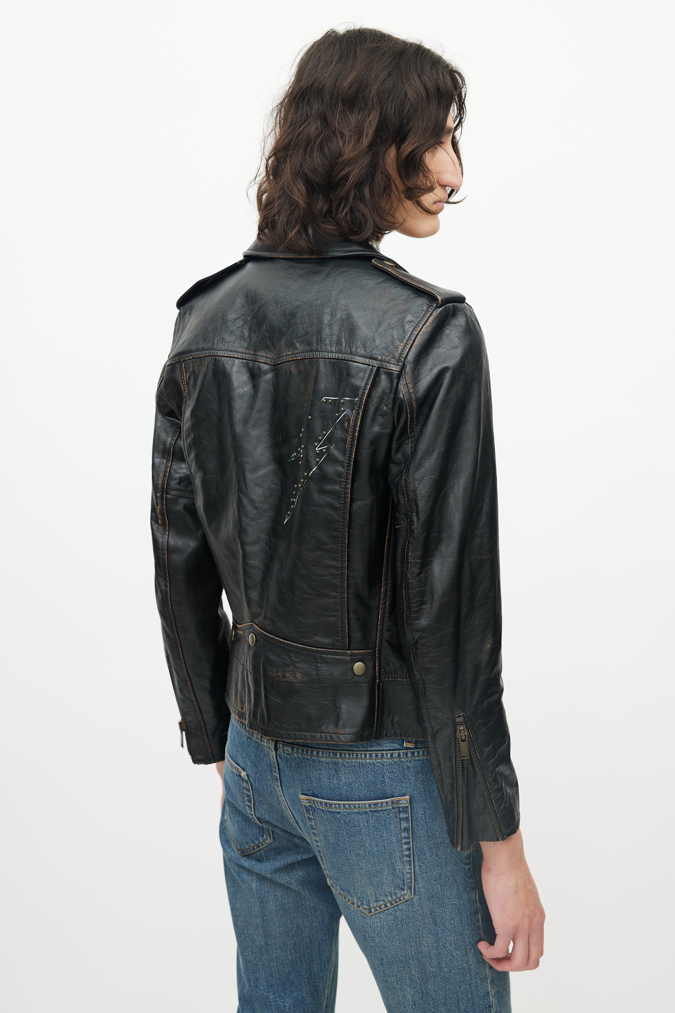 Pre-owned Saint Laurent leather jacket featuring zip up front, distressing throughout, notched lapel, blackened brass zipper hardware, four pockets at front, snap closure epaulettes at shoulders and faded lightening bolt with studs at back right. Lined.