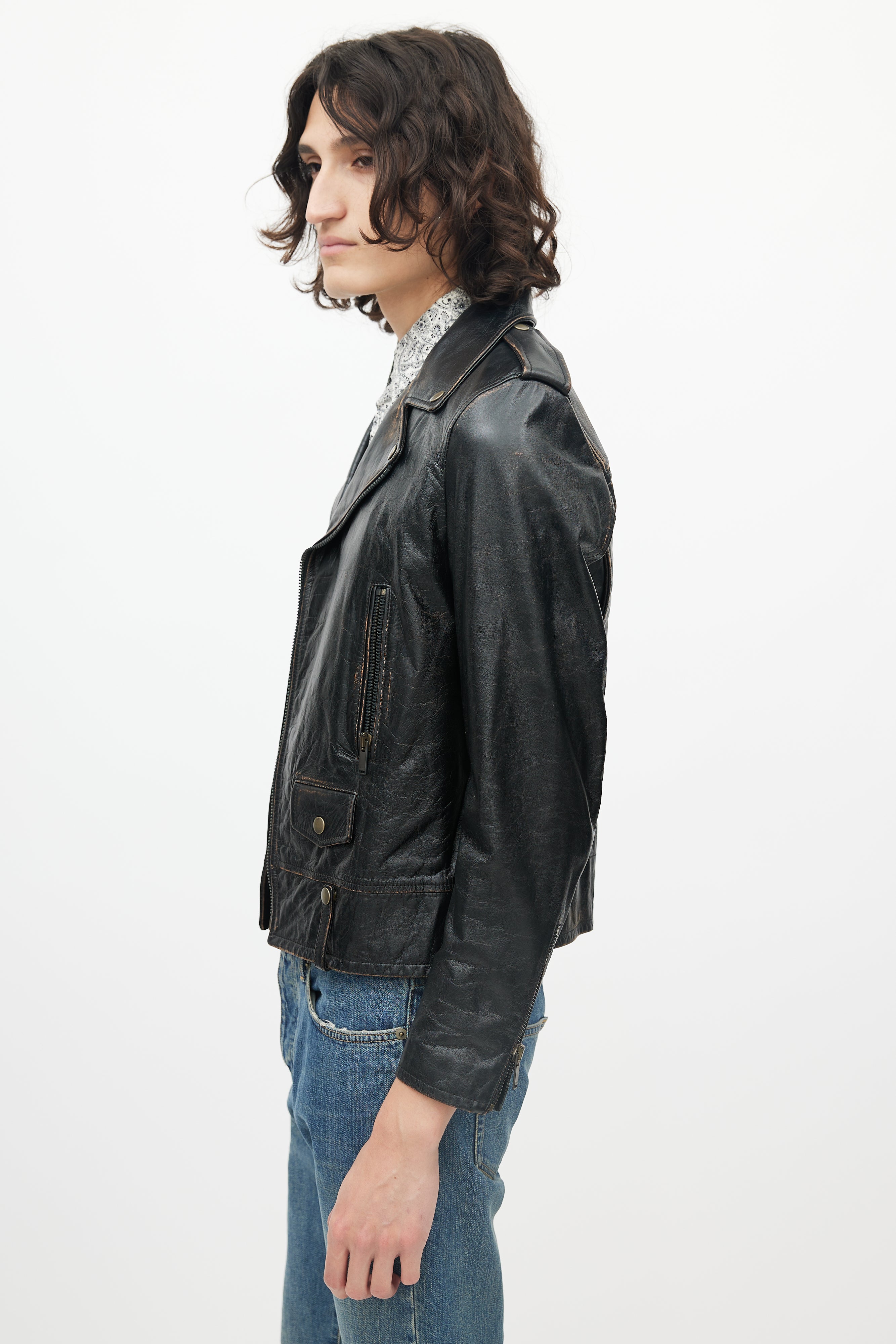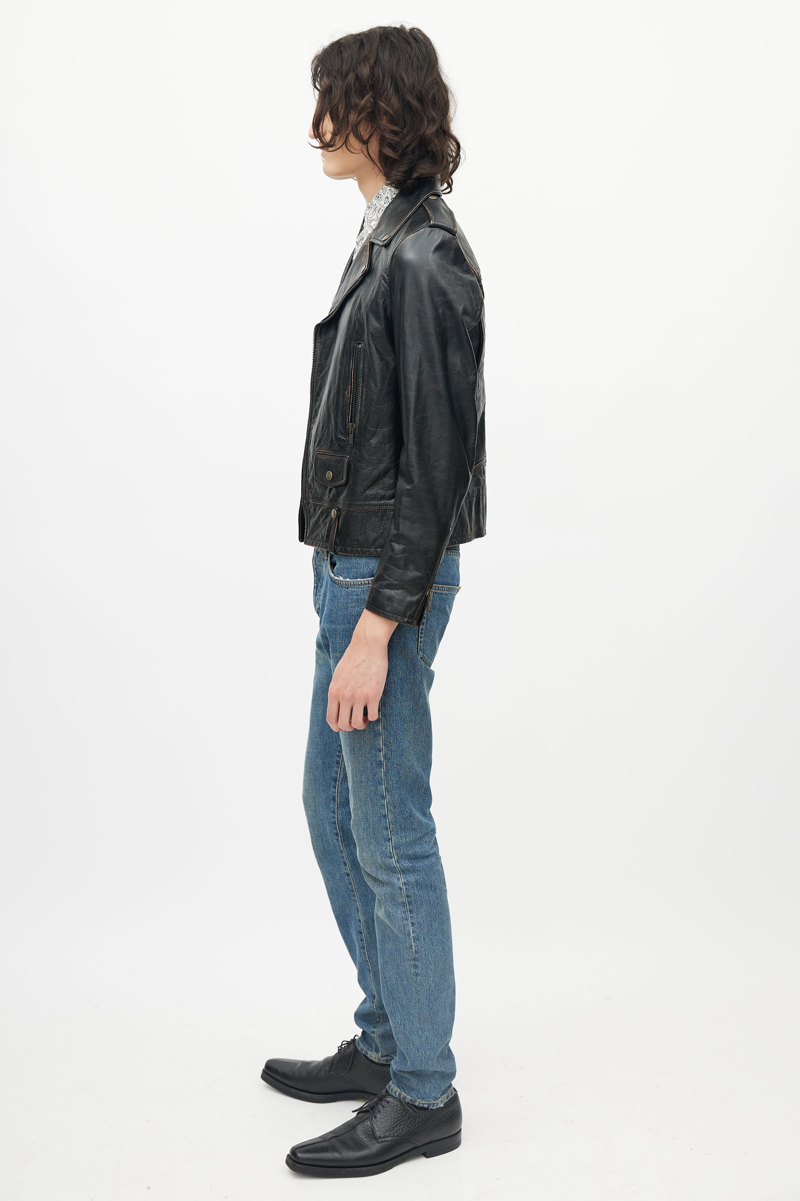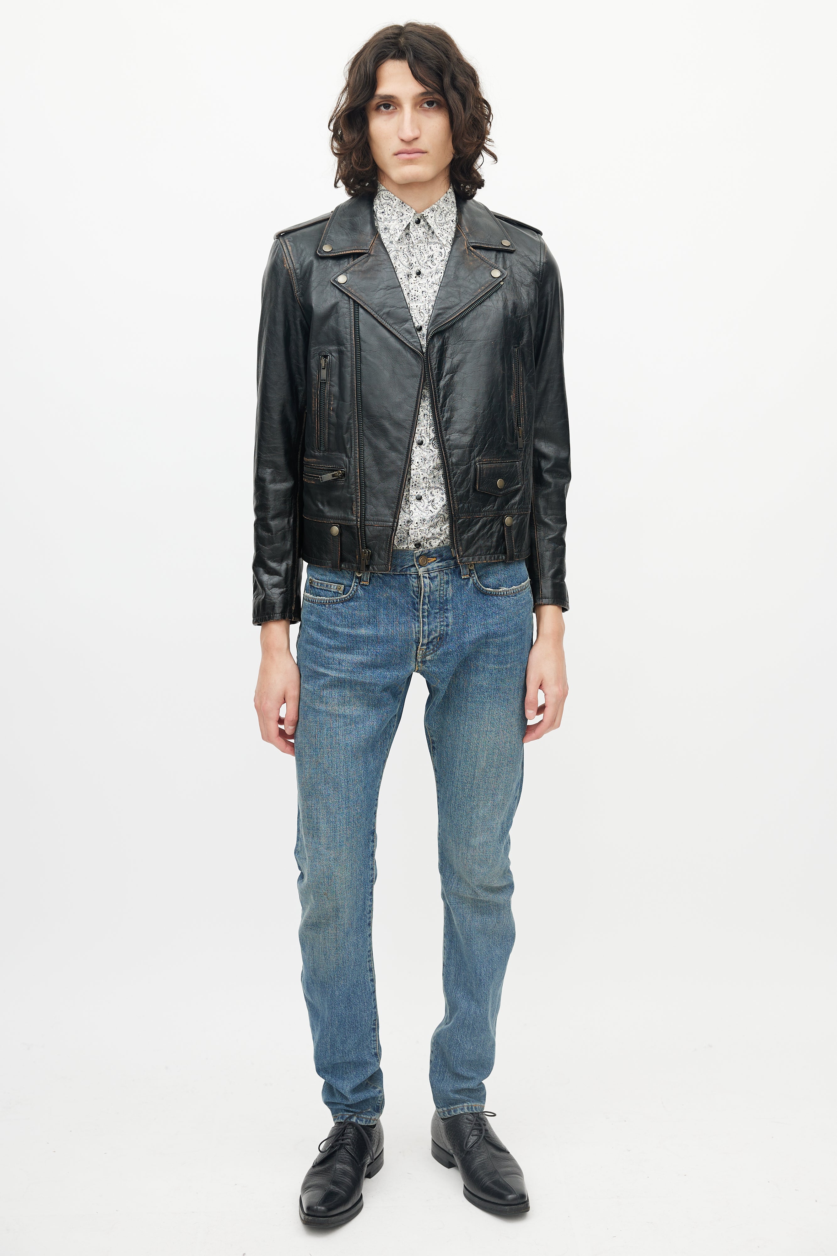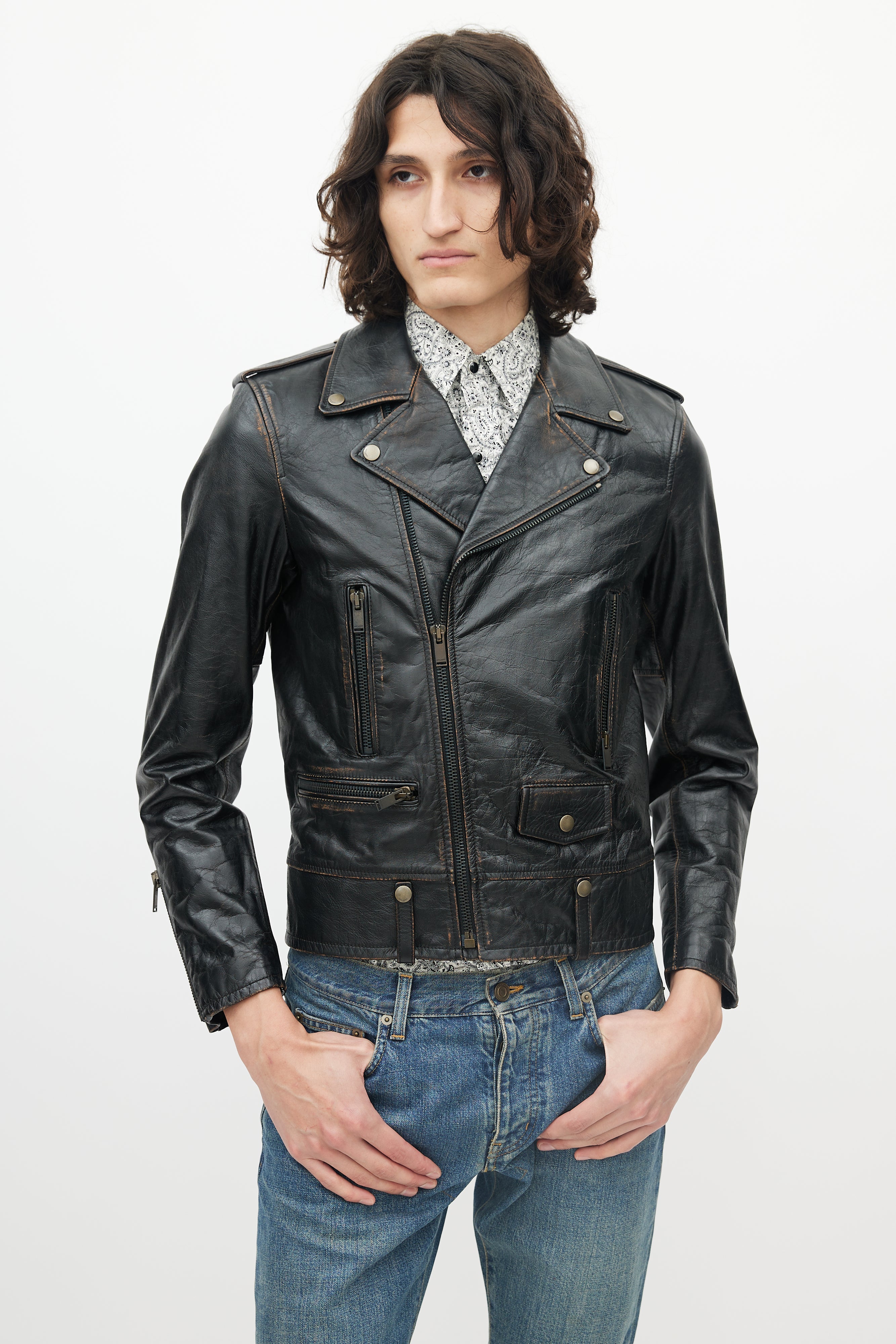 Pre-owned Saint Laurent leather jacket featuring zip up front, distressing throughout, notched lapel, blackened brass zipper hardware, four pockets at front, snap closure epaulettes at shoulders and faded lightening bolt with studs at back right. Lined.