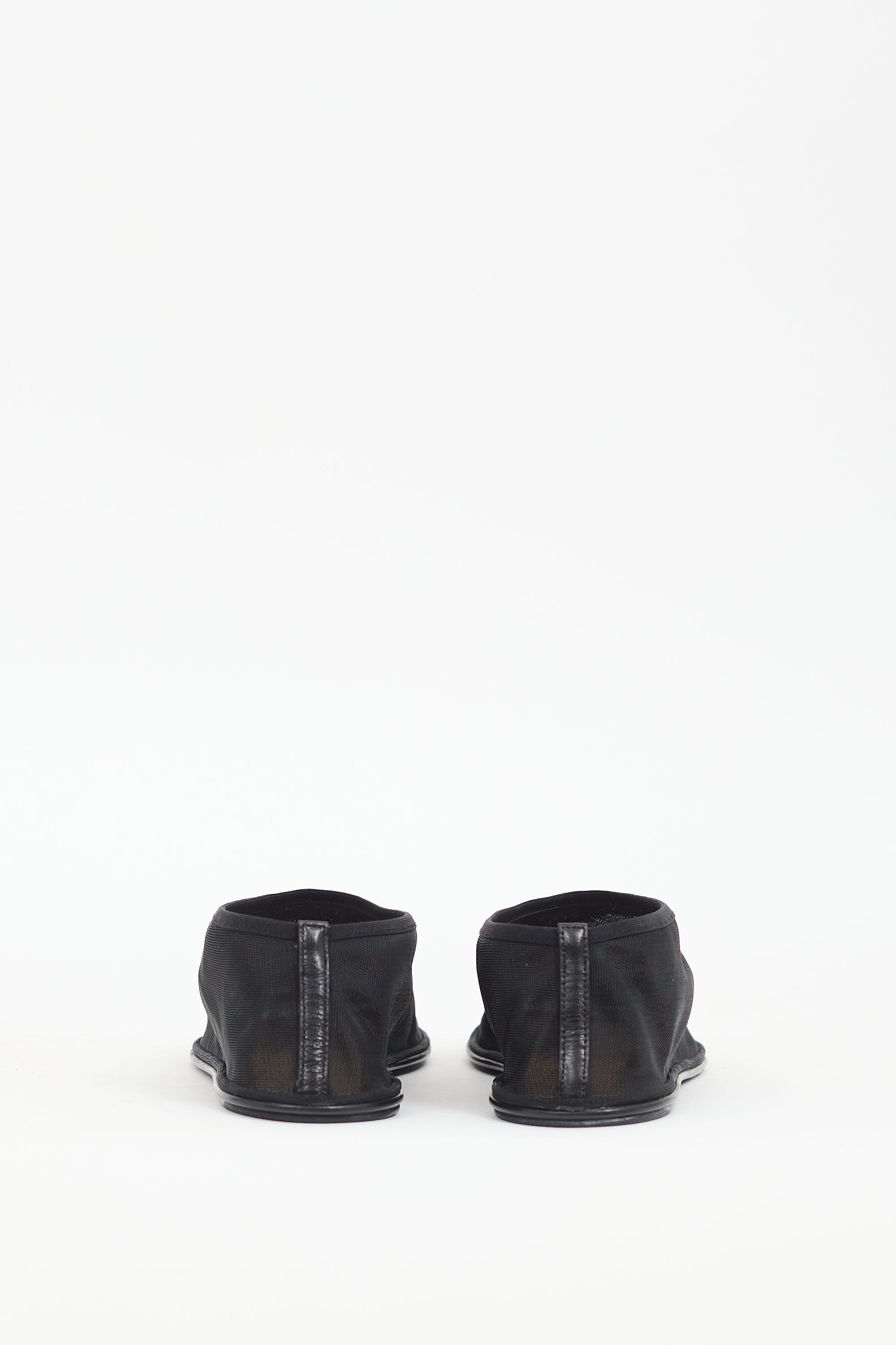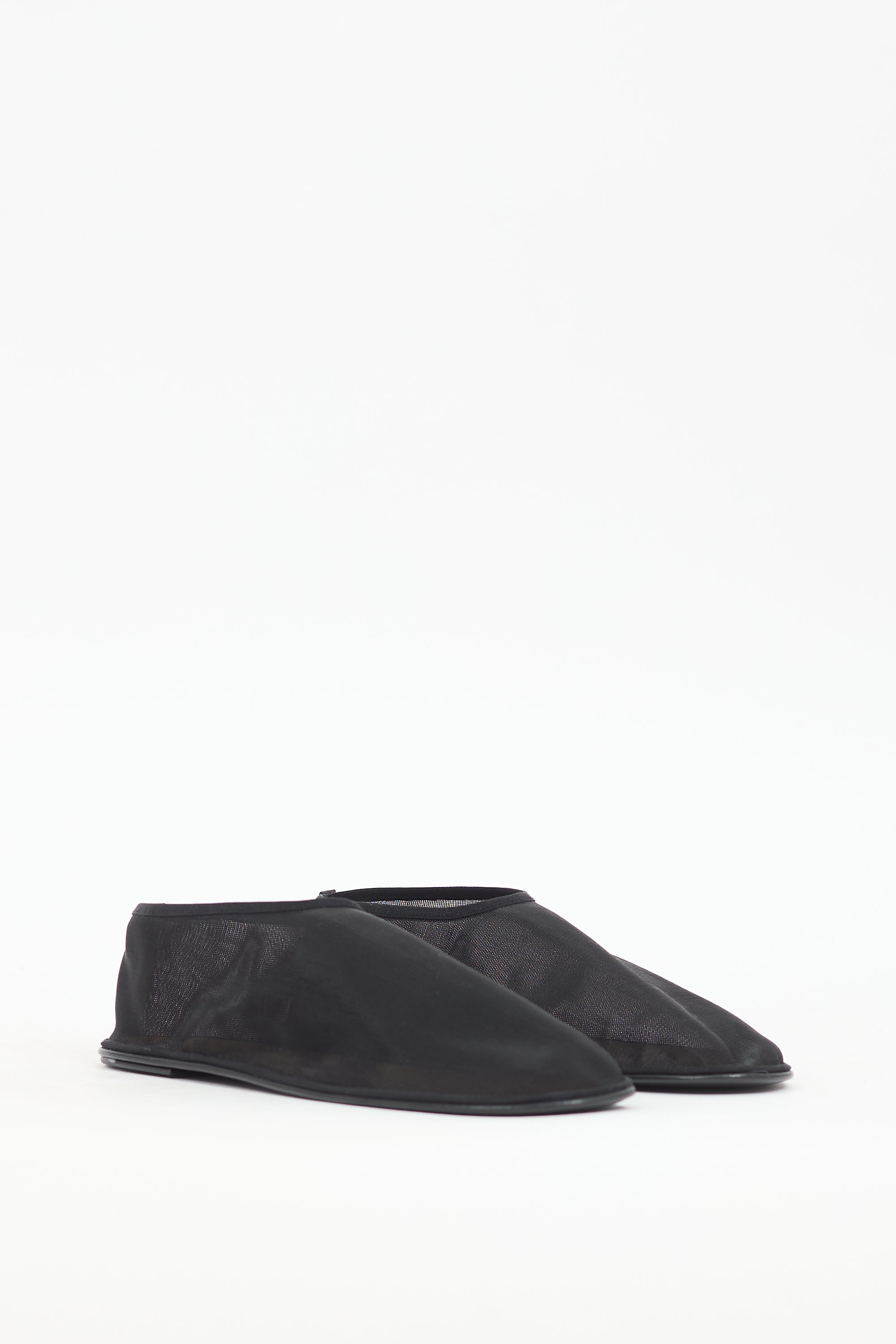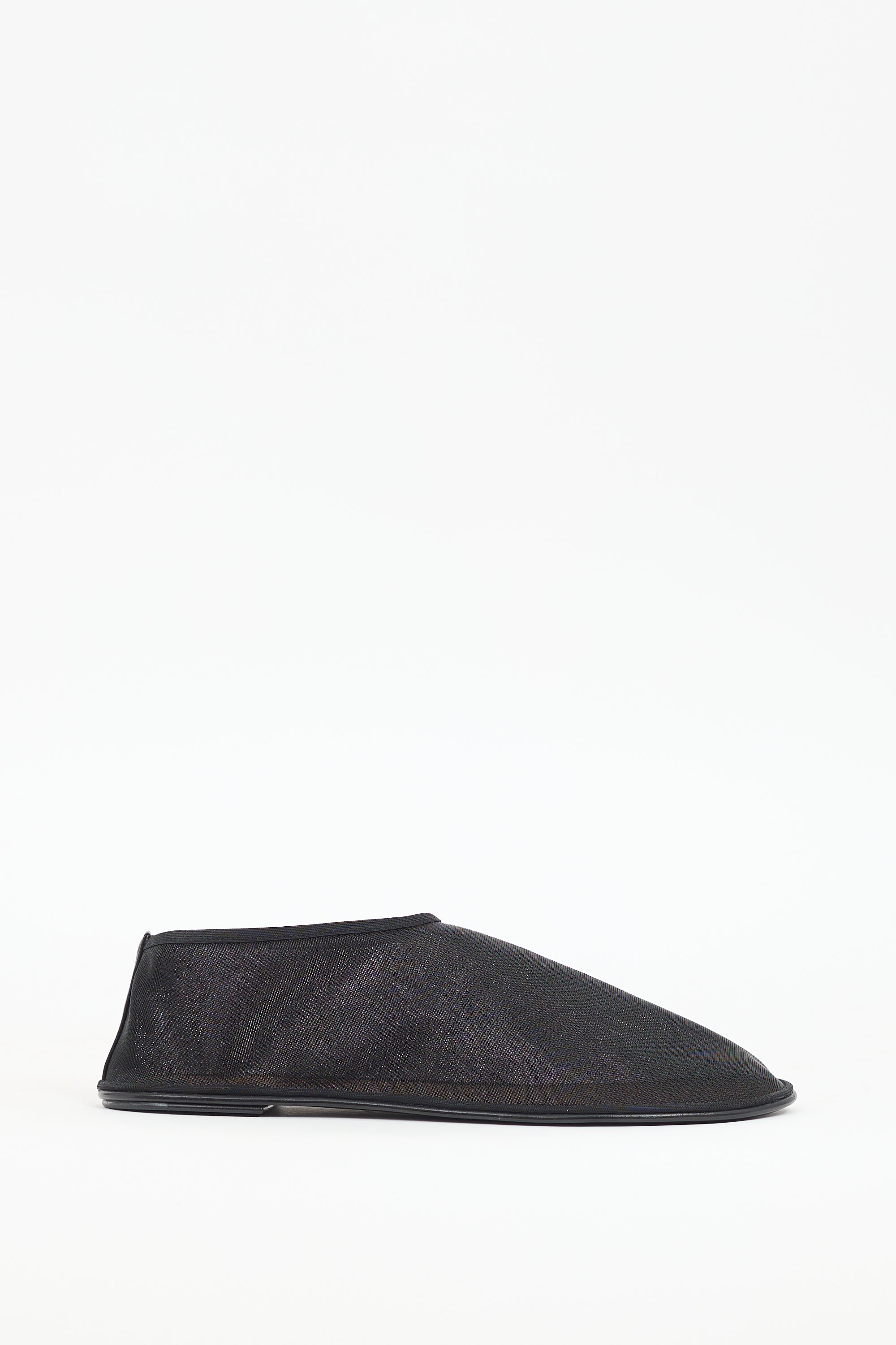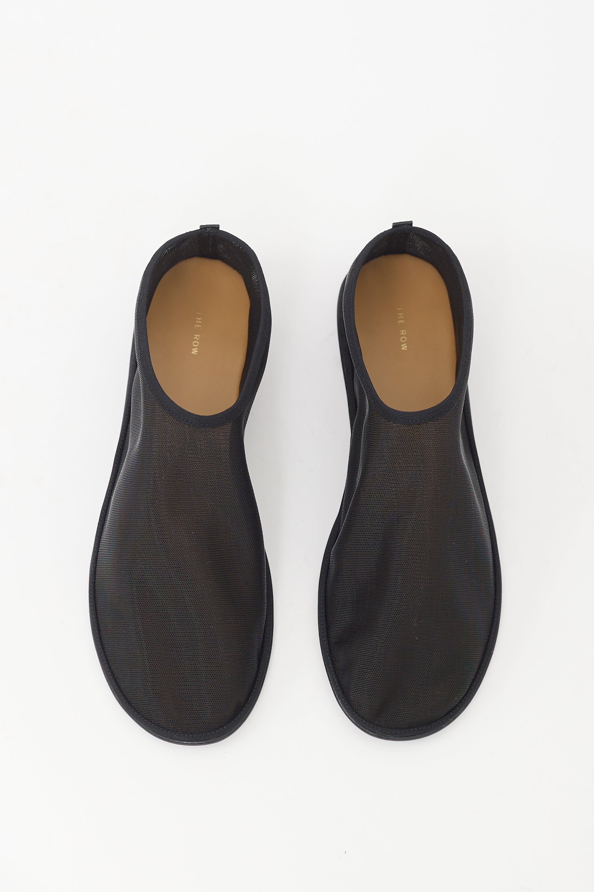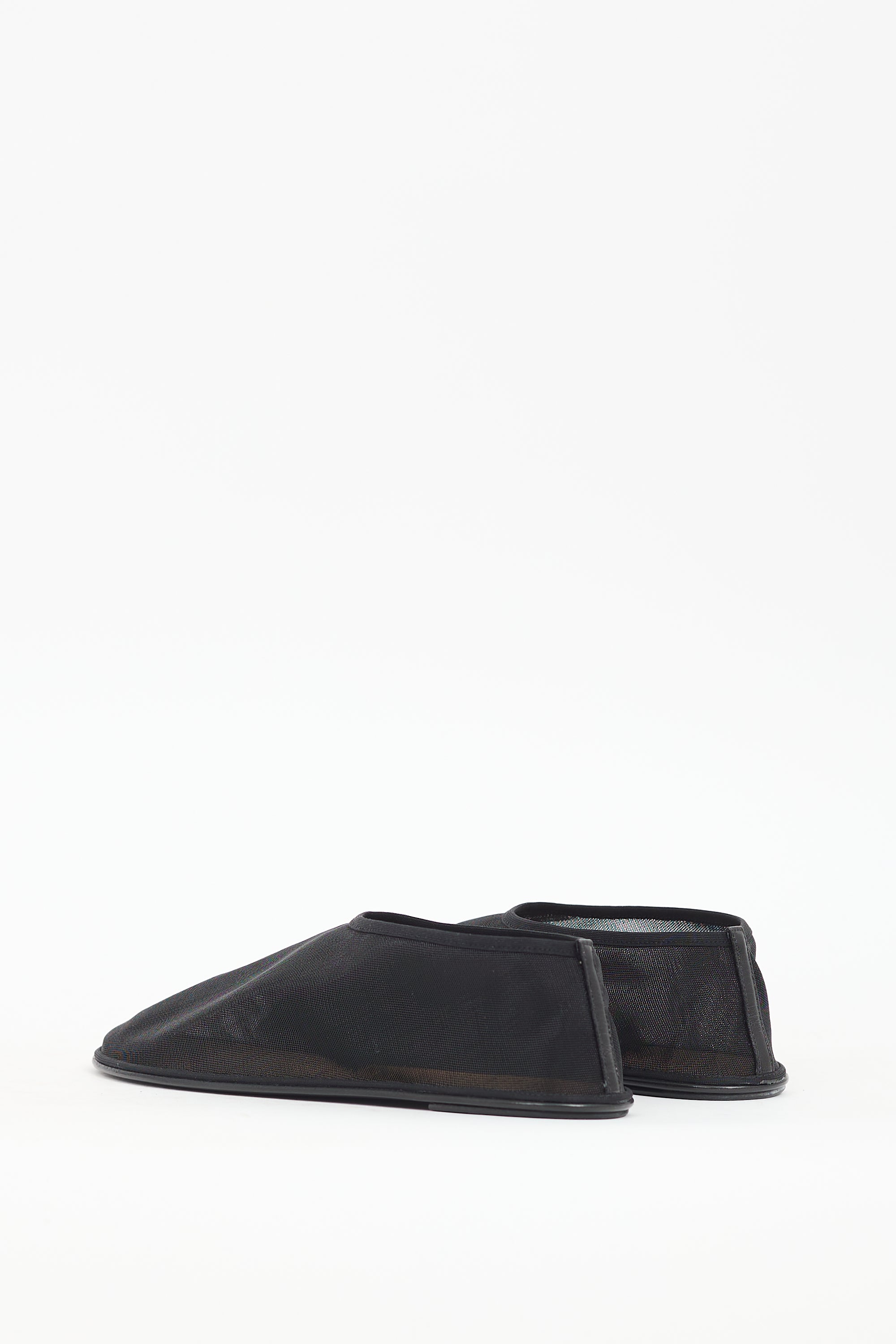 Pre-owned The Row black mesh Sock flats featuring rounded toe, sheer mesh upper, slip on entry, leather insole, and wooden outsole. Comes with original box and dust bags.