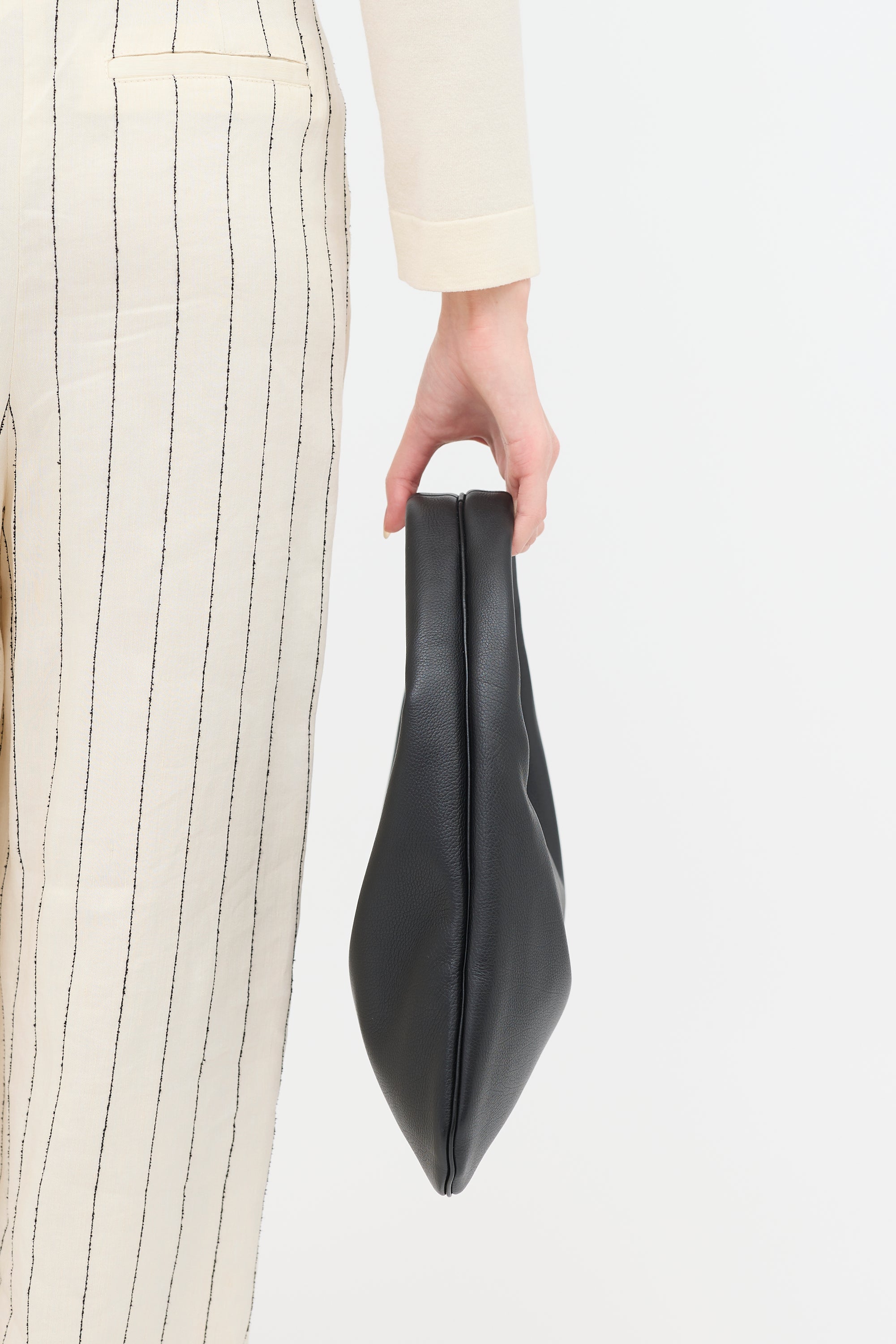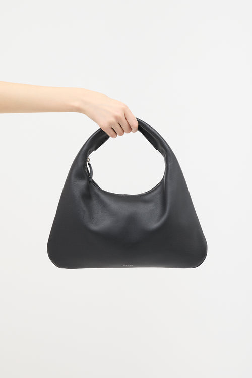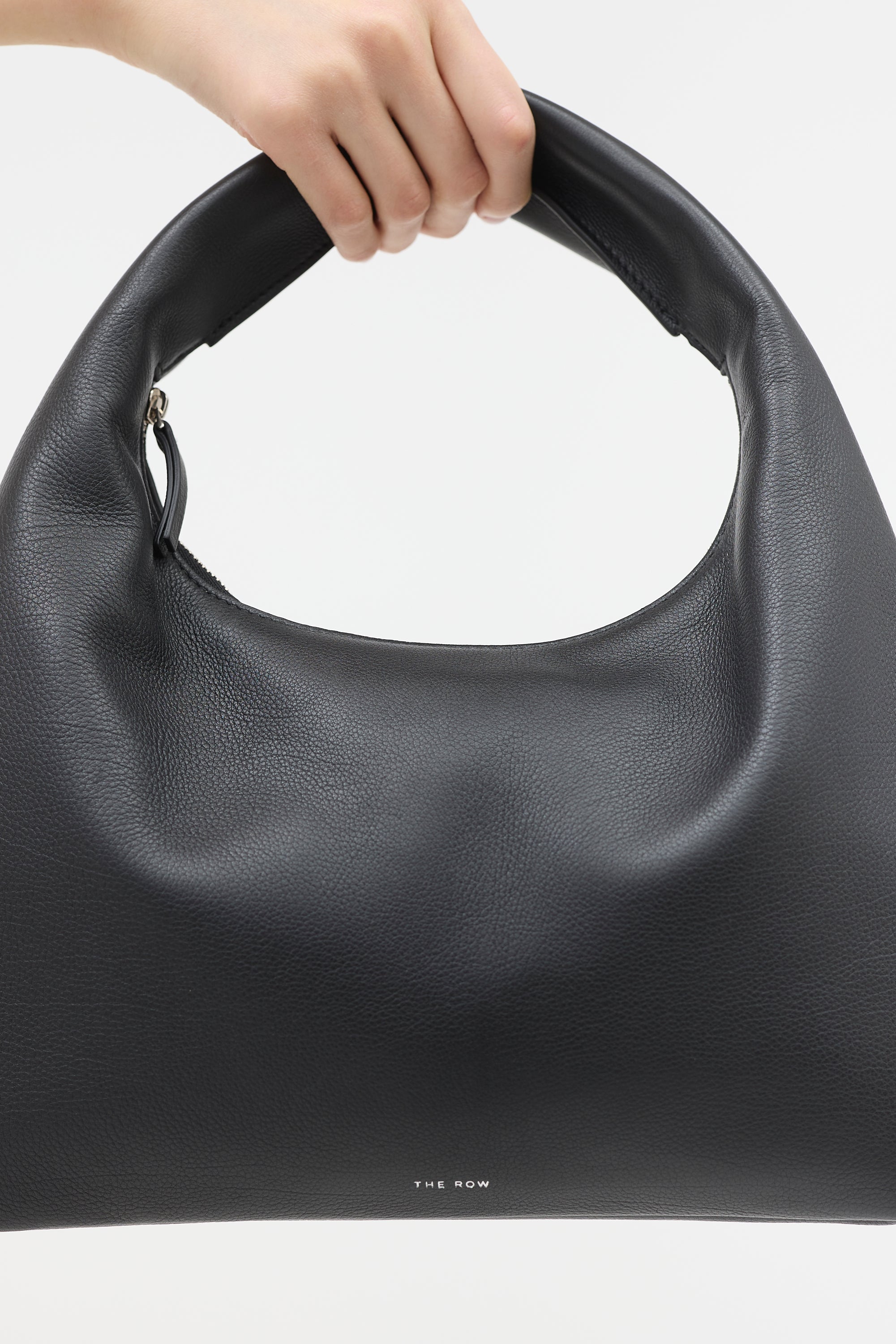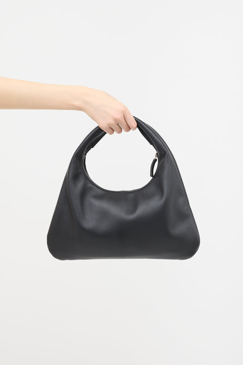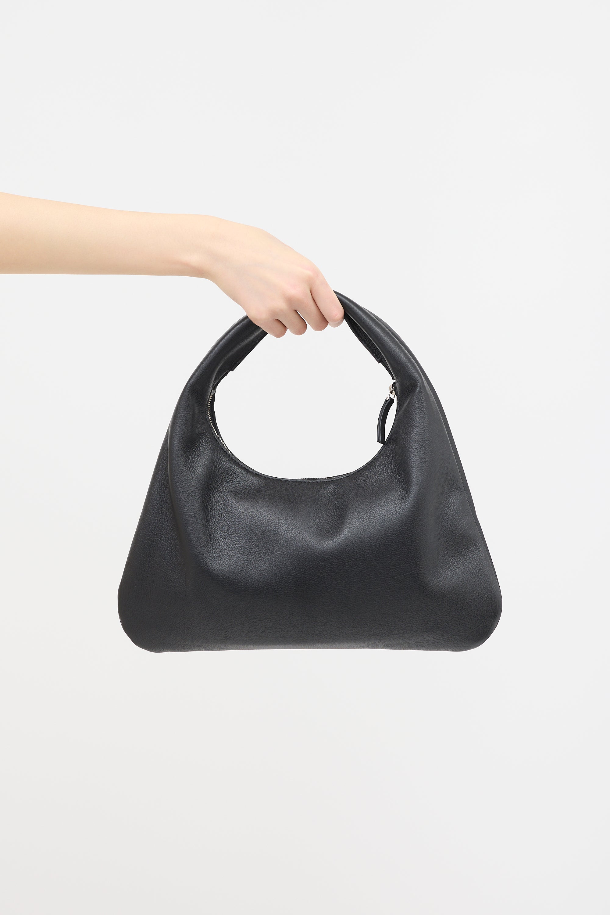Pre-owned The Row black leather Small Everyday shoulder bag featuring a rolled top handle, curved zip top closure, silver tone hardware, stamped foil logo at front, suede lining, and one interior slip pocket.