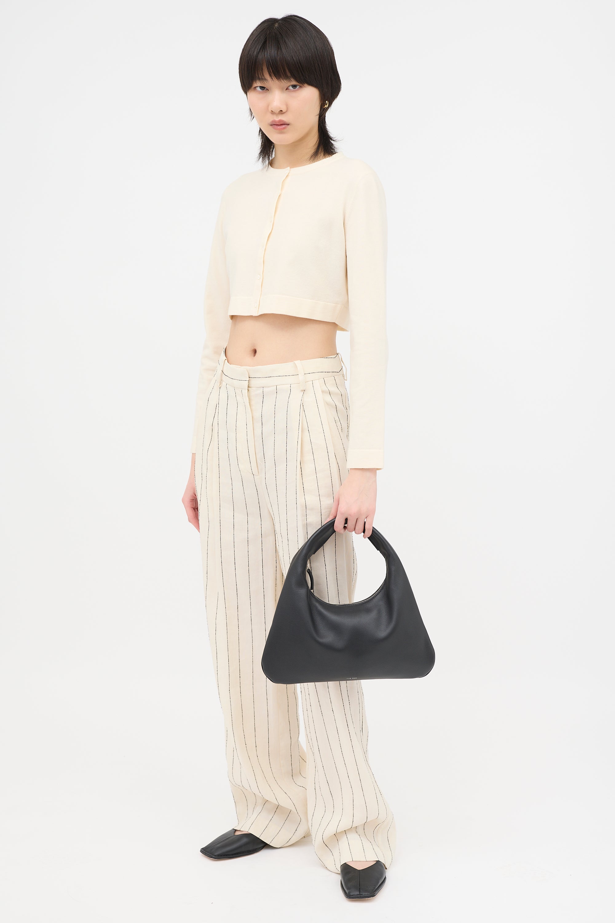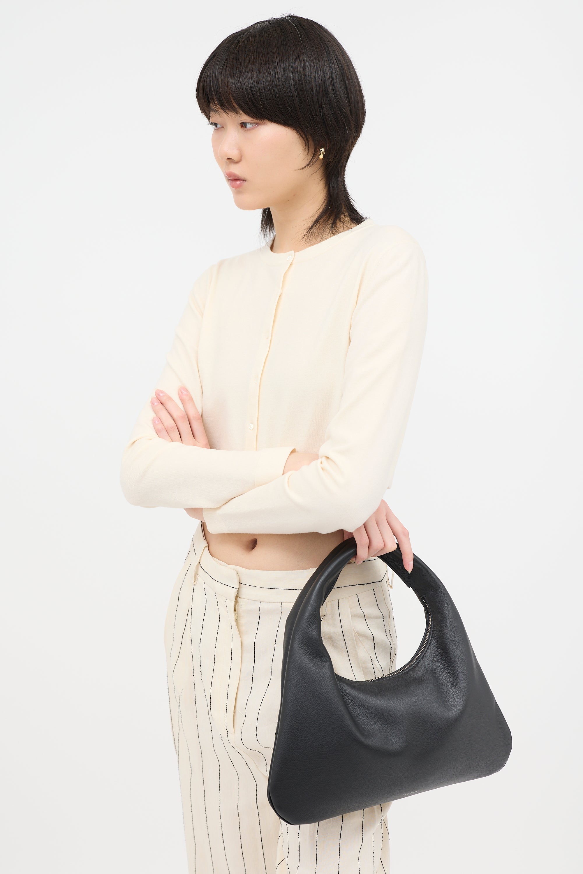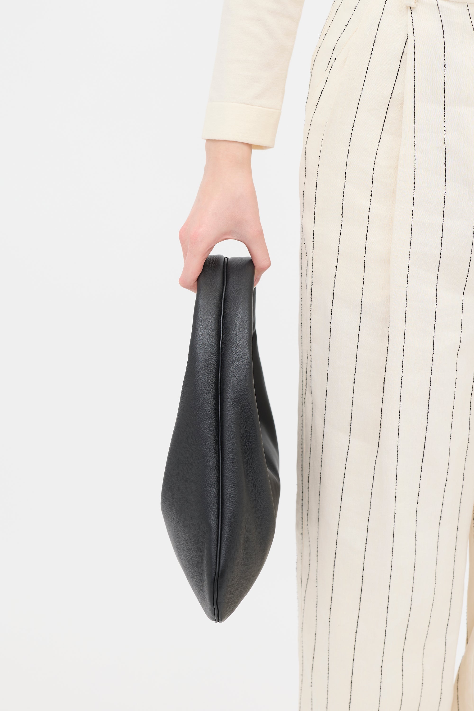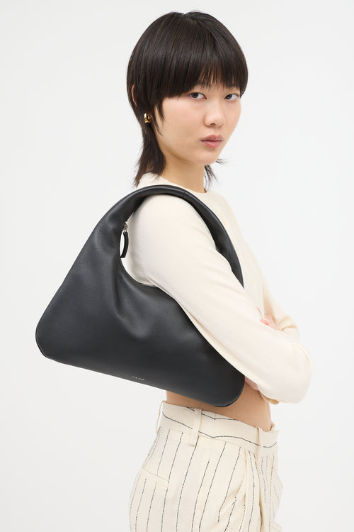 Pre-owned The Row black leather Small Everyday shoulder bag featuring a rolled top handle, curved zip top closure, silver tone hardware, stamped foil logo at front, suede lining, and one interior slip pocket.