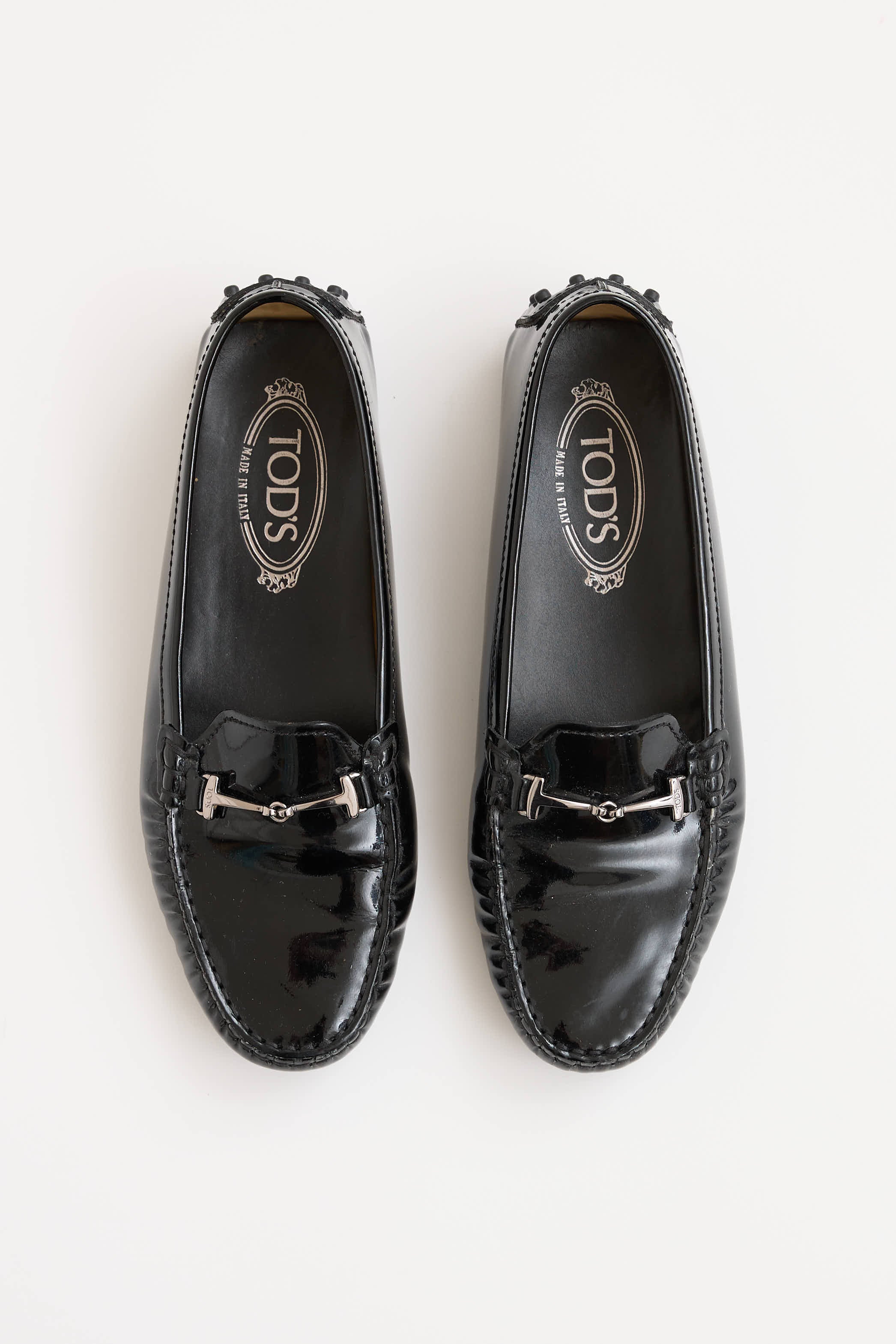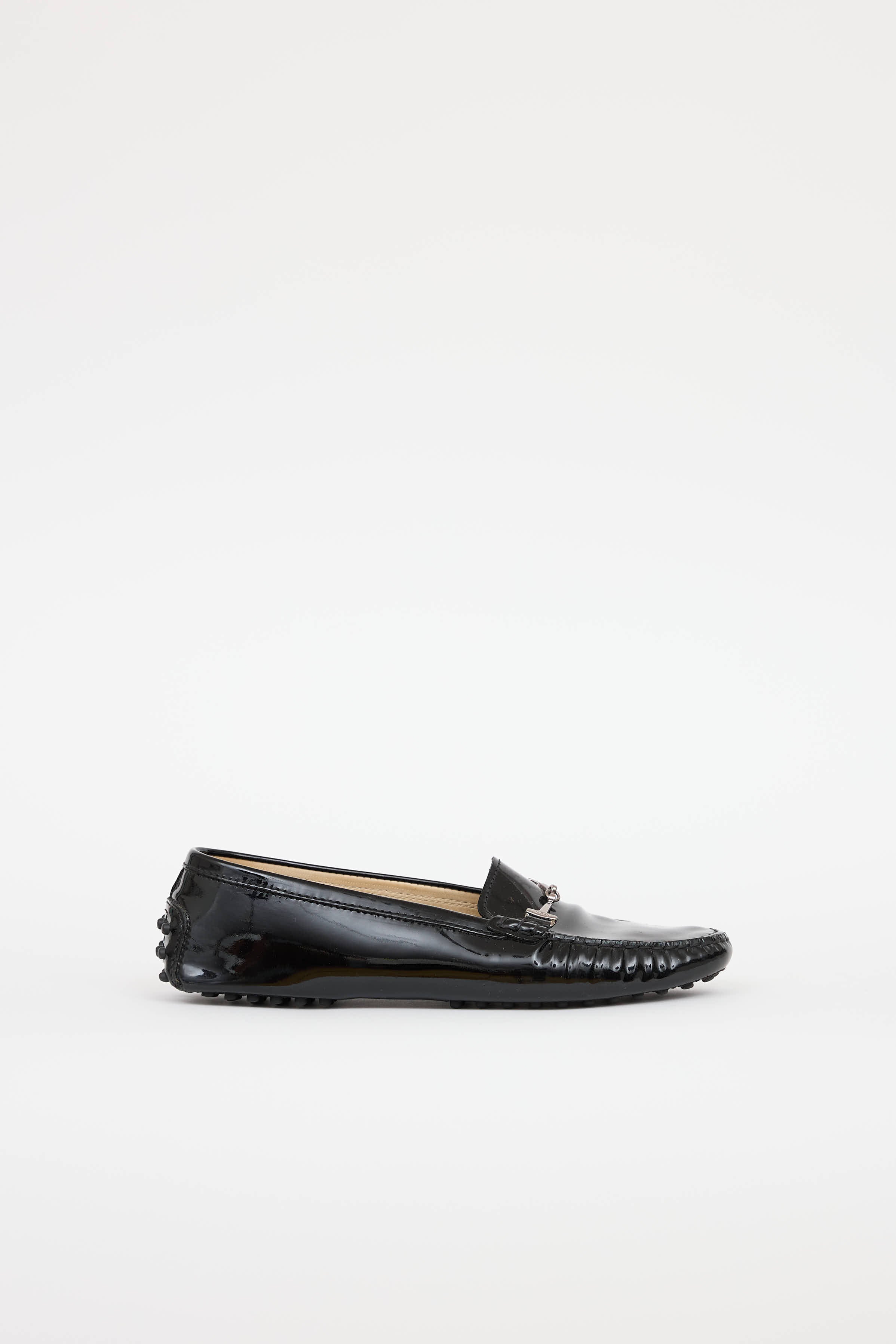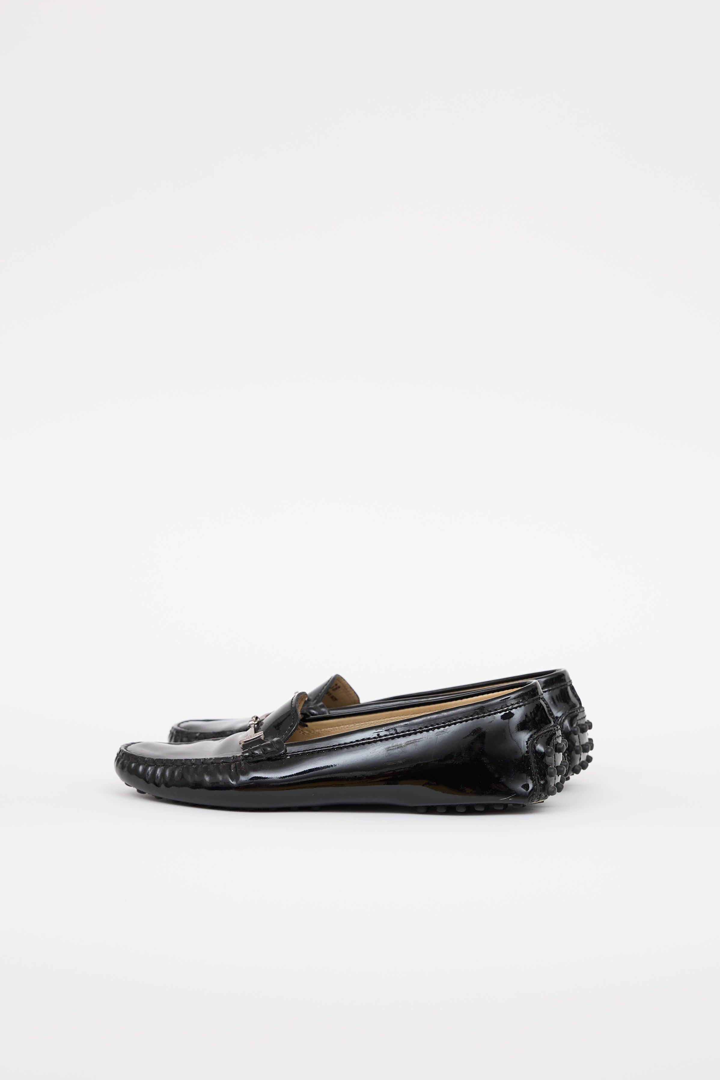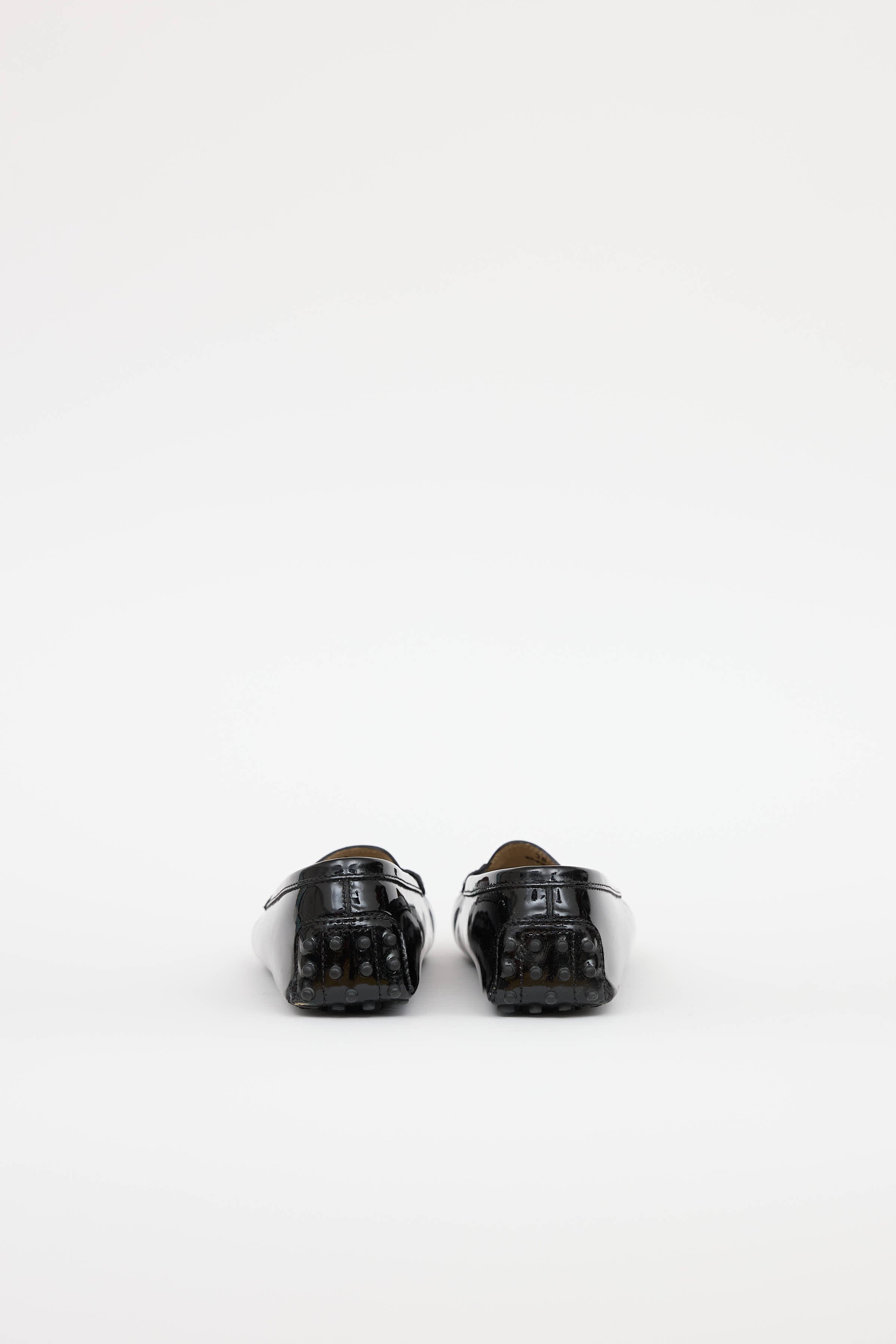 Pre-owned Tod's black patent leather driving loafer featuring square toe, rolled edges, silver tone buckle at vamp, and rubber pebbled sole.