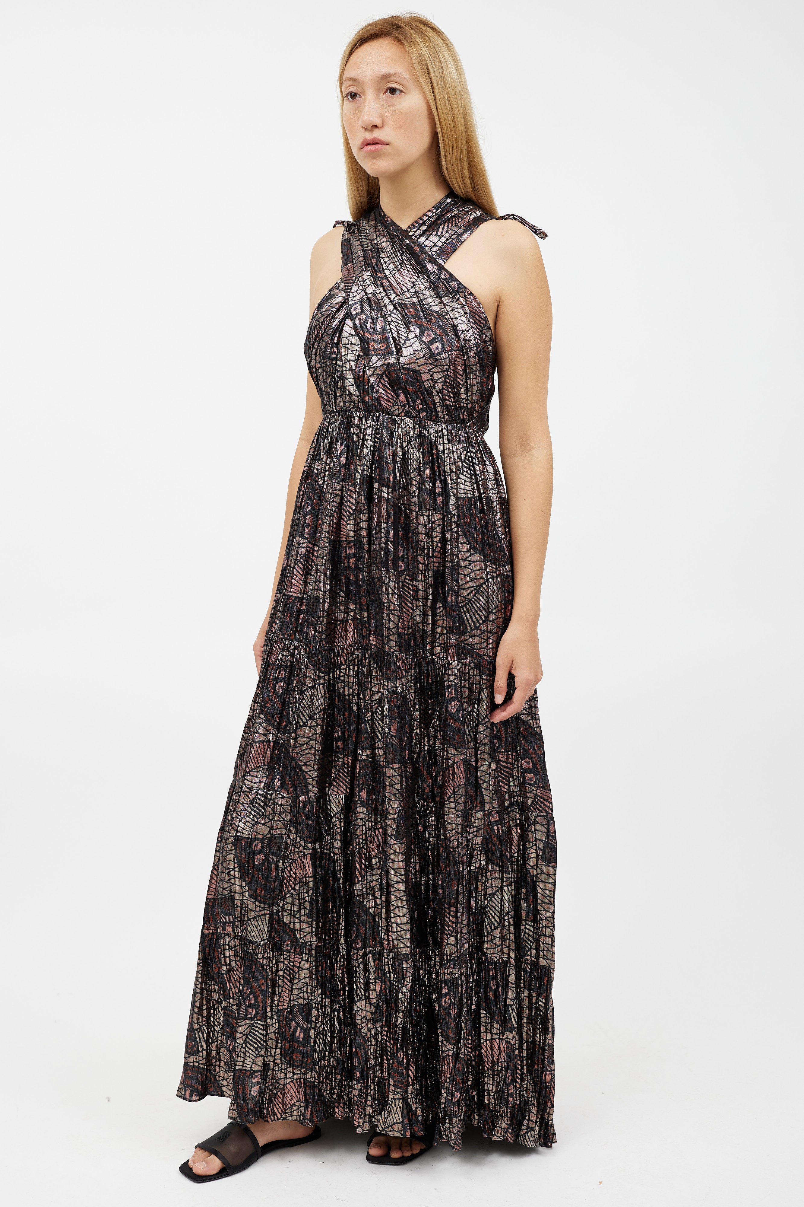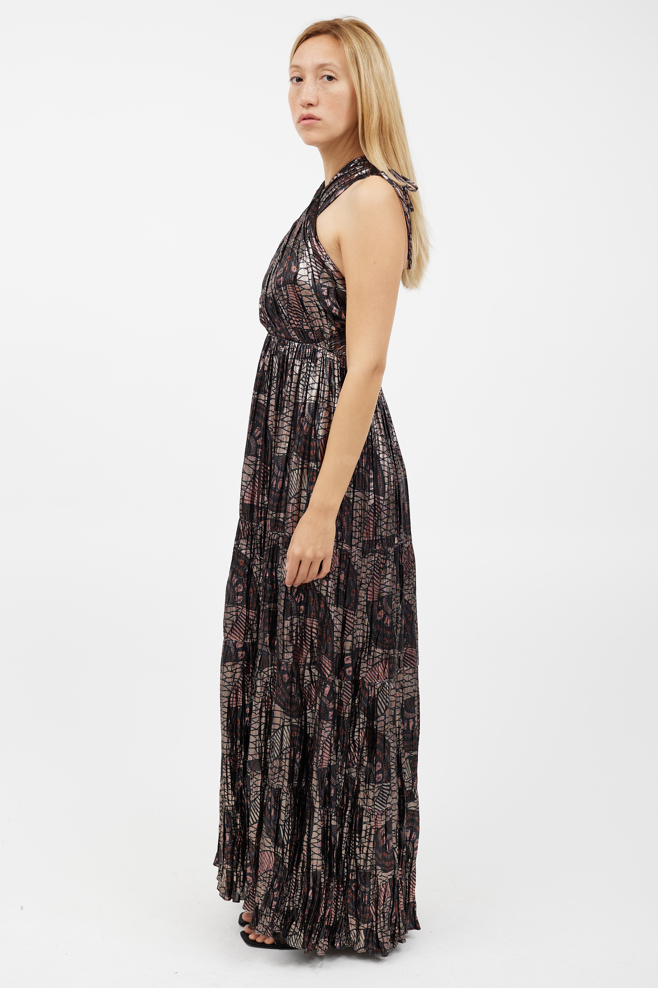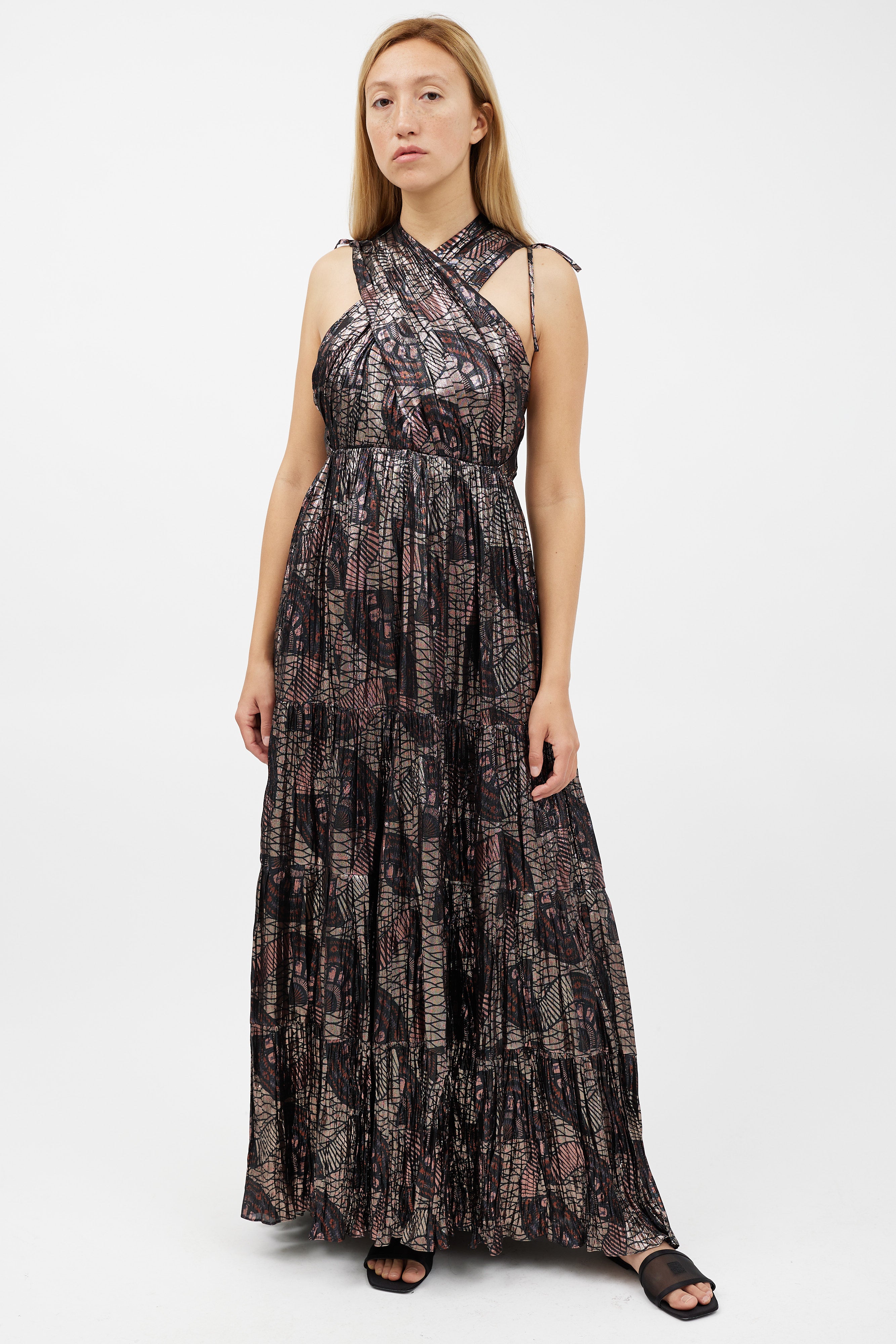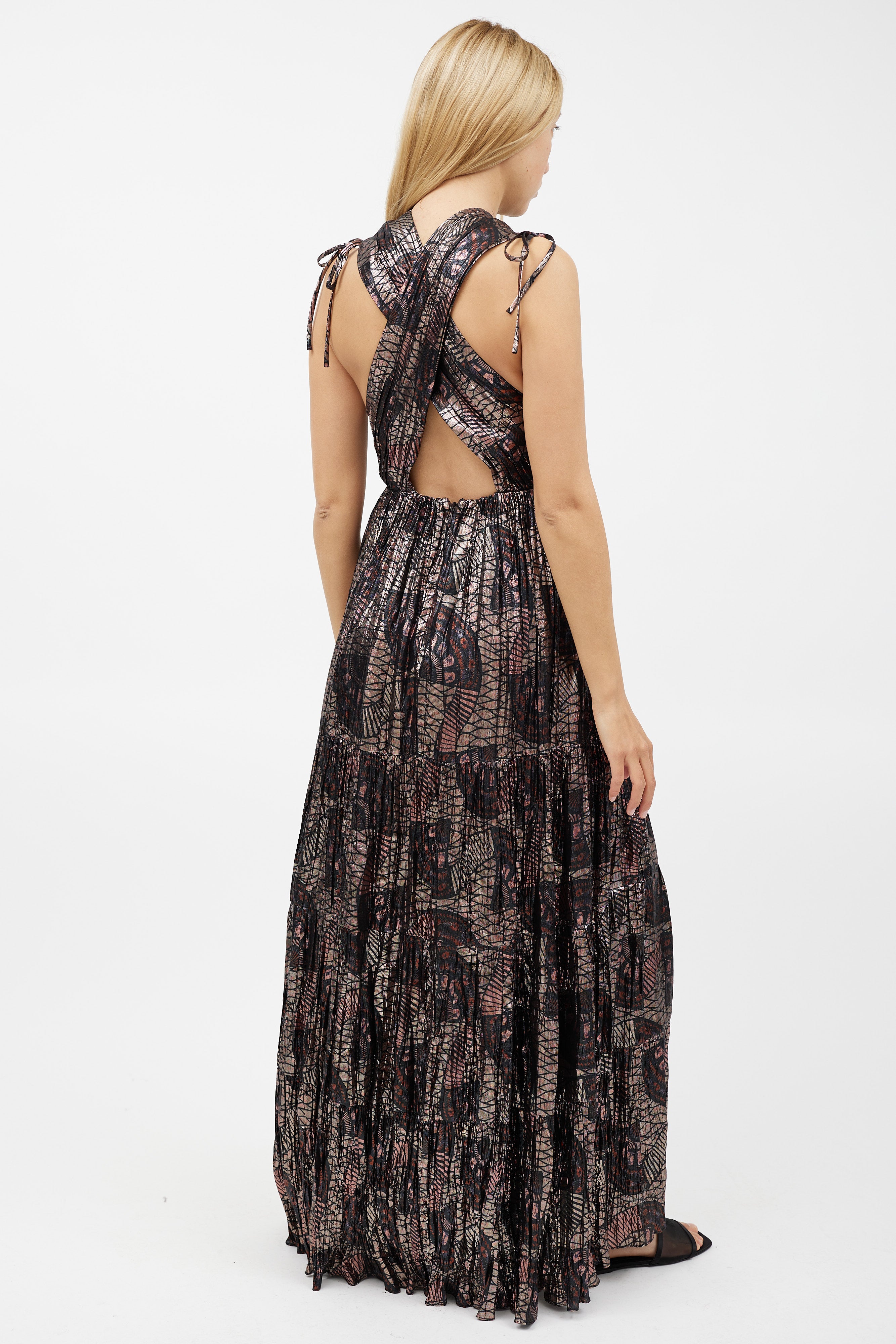 Ulla Johnson black silk dress featuring a multicolour metallic pattern throughout, V-neckline, pleated skirt, and zip at back with hook and eye closure. Lined.