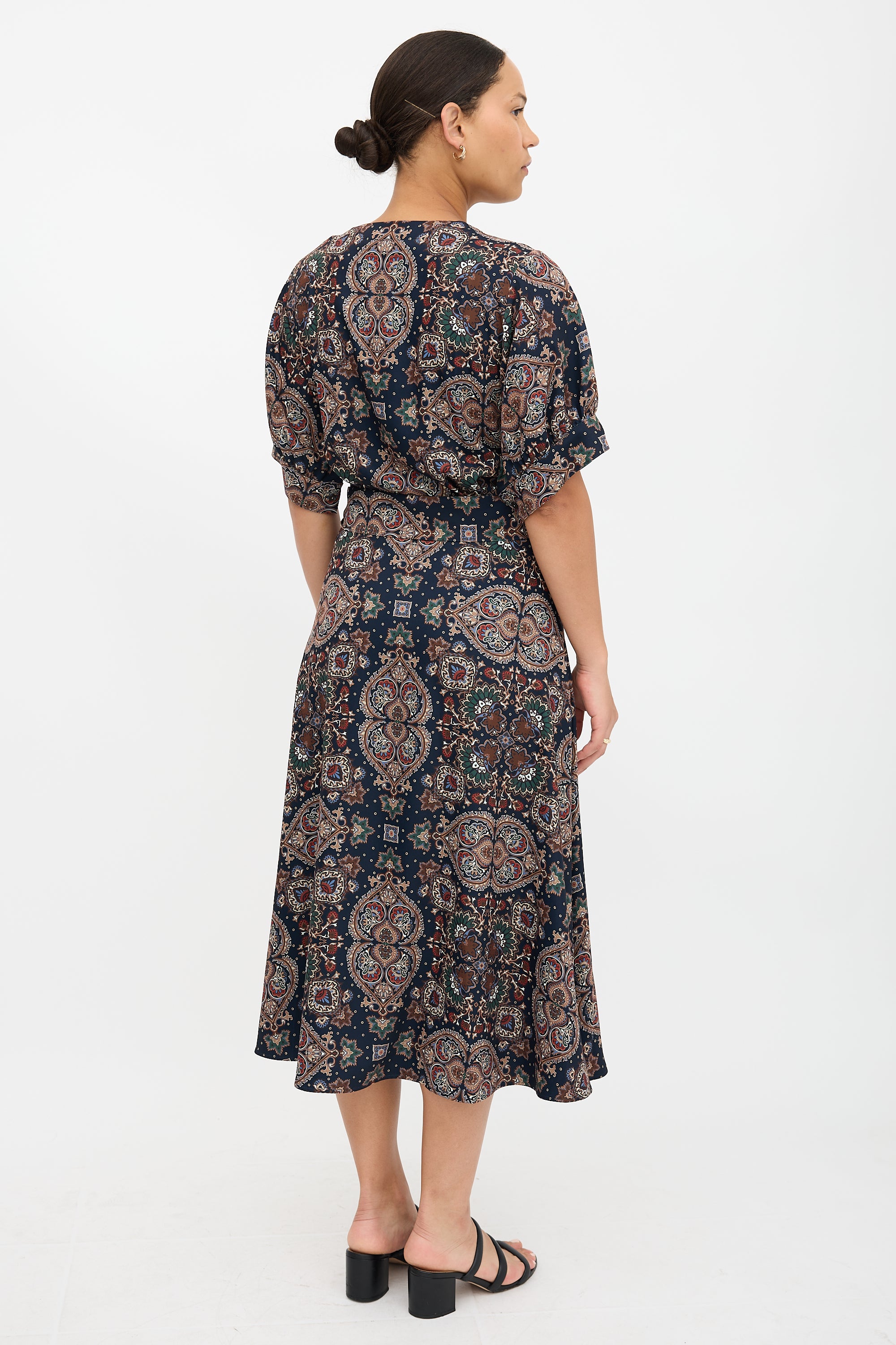 Pre-owned Veronica Beard Wyatt dress featuring a multicolour paisley print, surplice V-neckline, puff sleeves, tie belt, and concealed side zip.