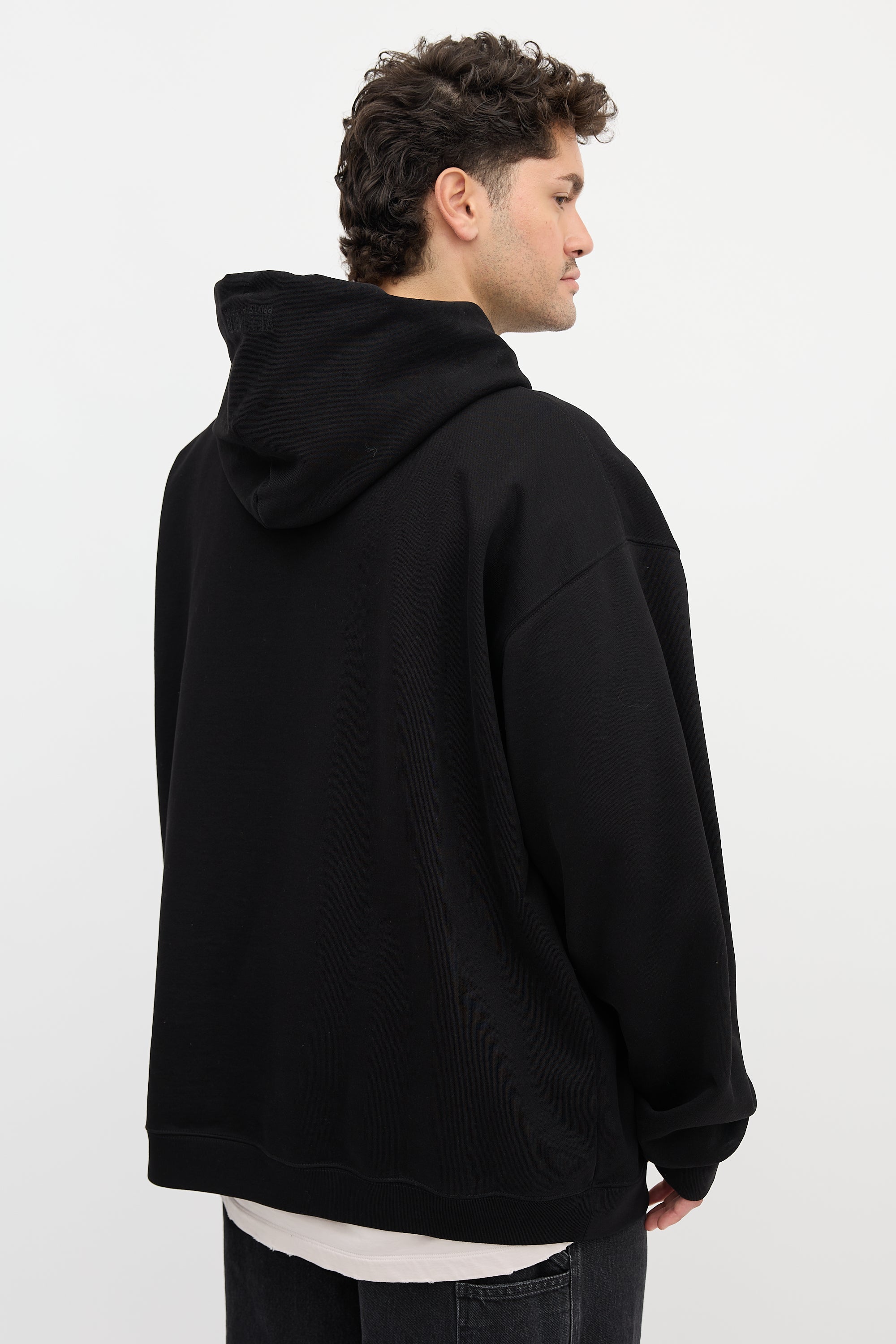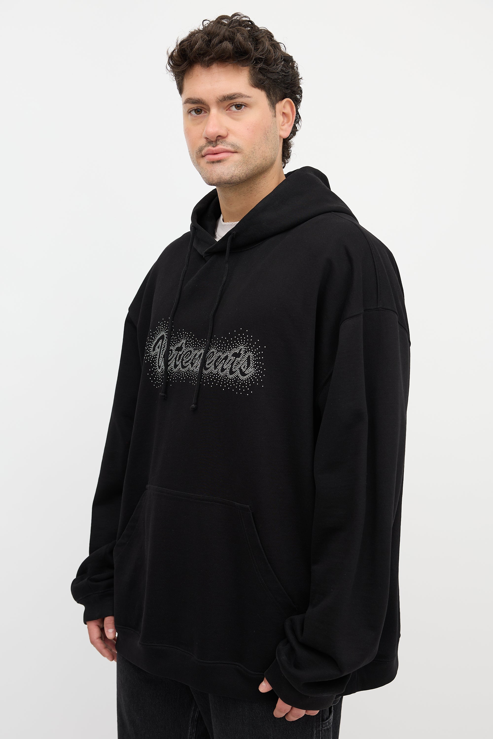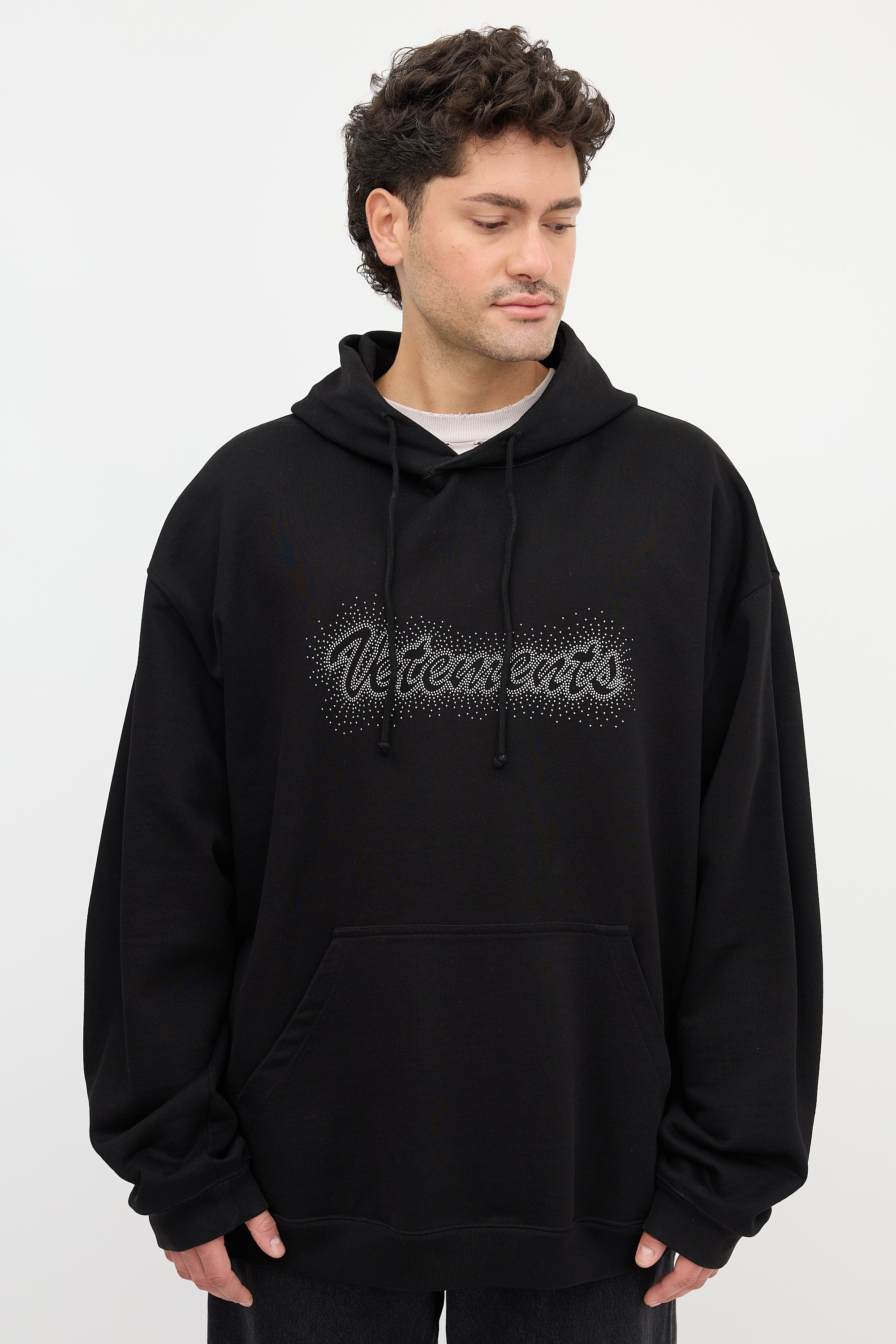 Pre-owned Vetements black hoodie featuring drawstring hood, silver tone embellished chest logo, front kangaroo pocket, and ribbed hem and cuffs.