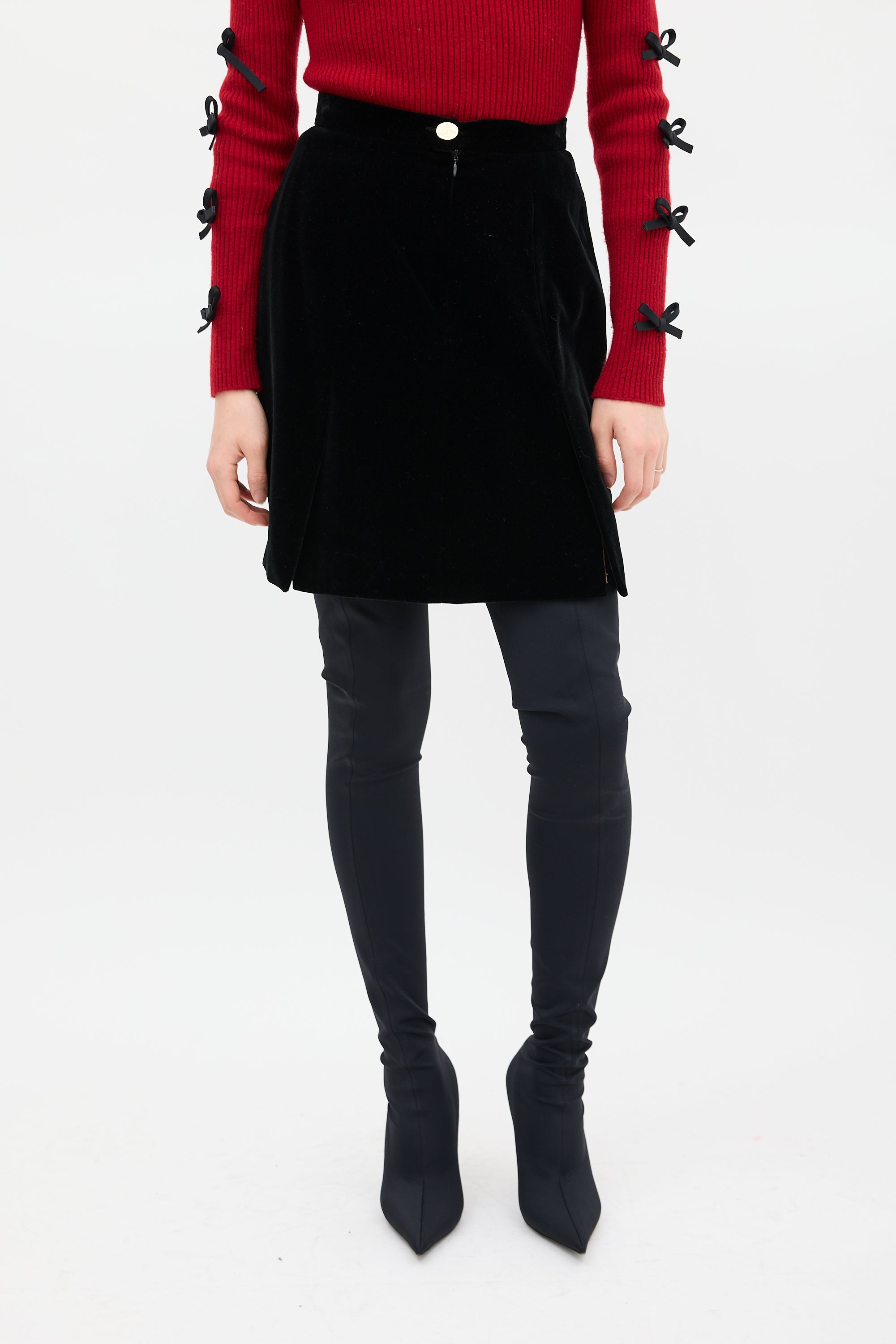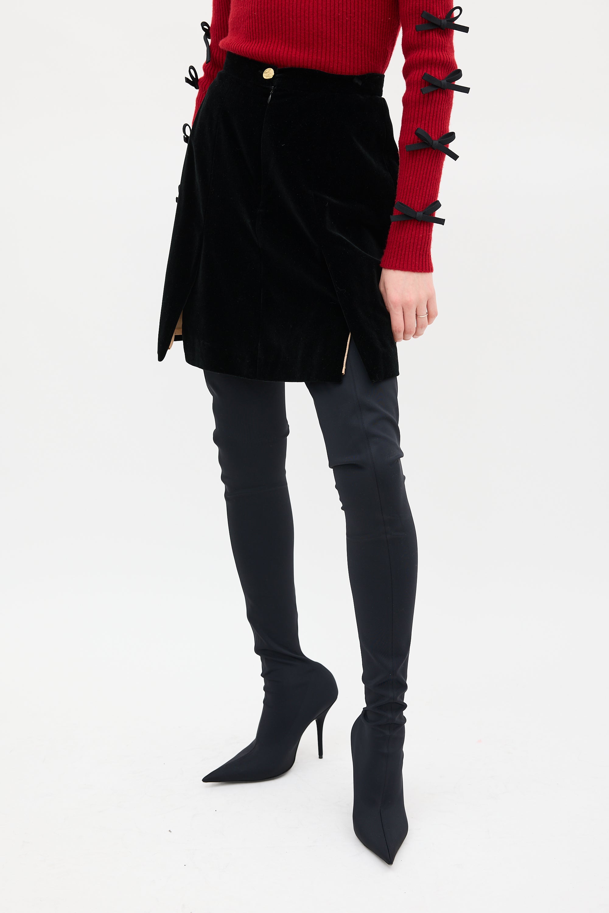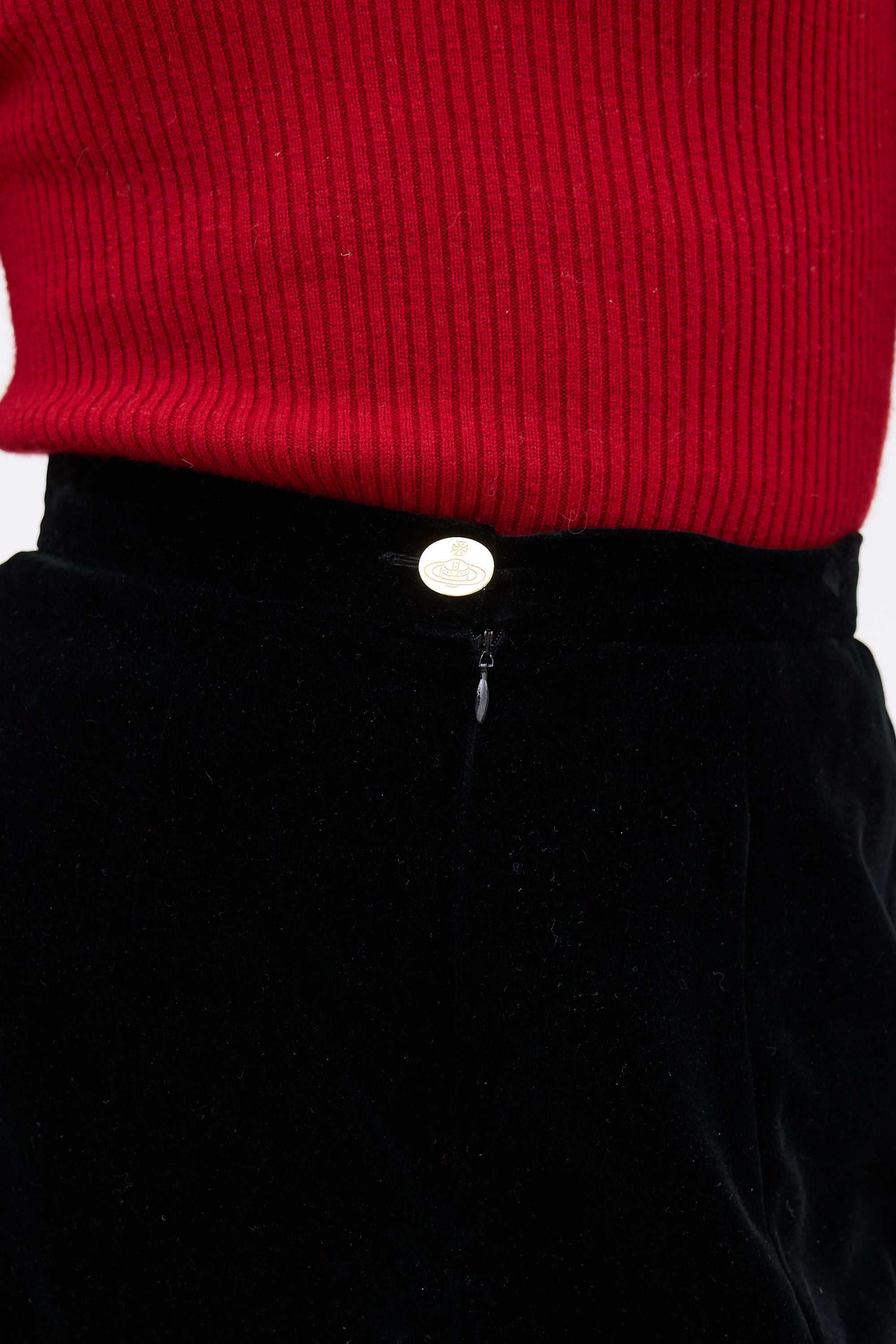 Pre-owned Vivienne Westwood black velour midi skirt featuring panelled seams, slits at hem, and zip at front with gold tone orb button closure. Lined.