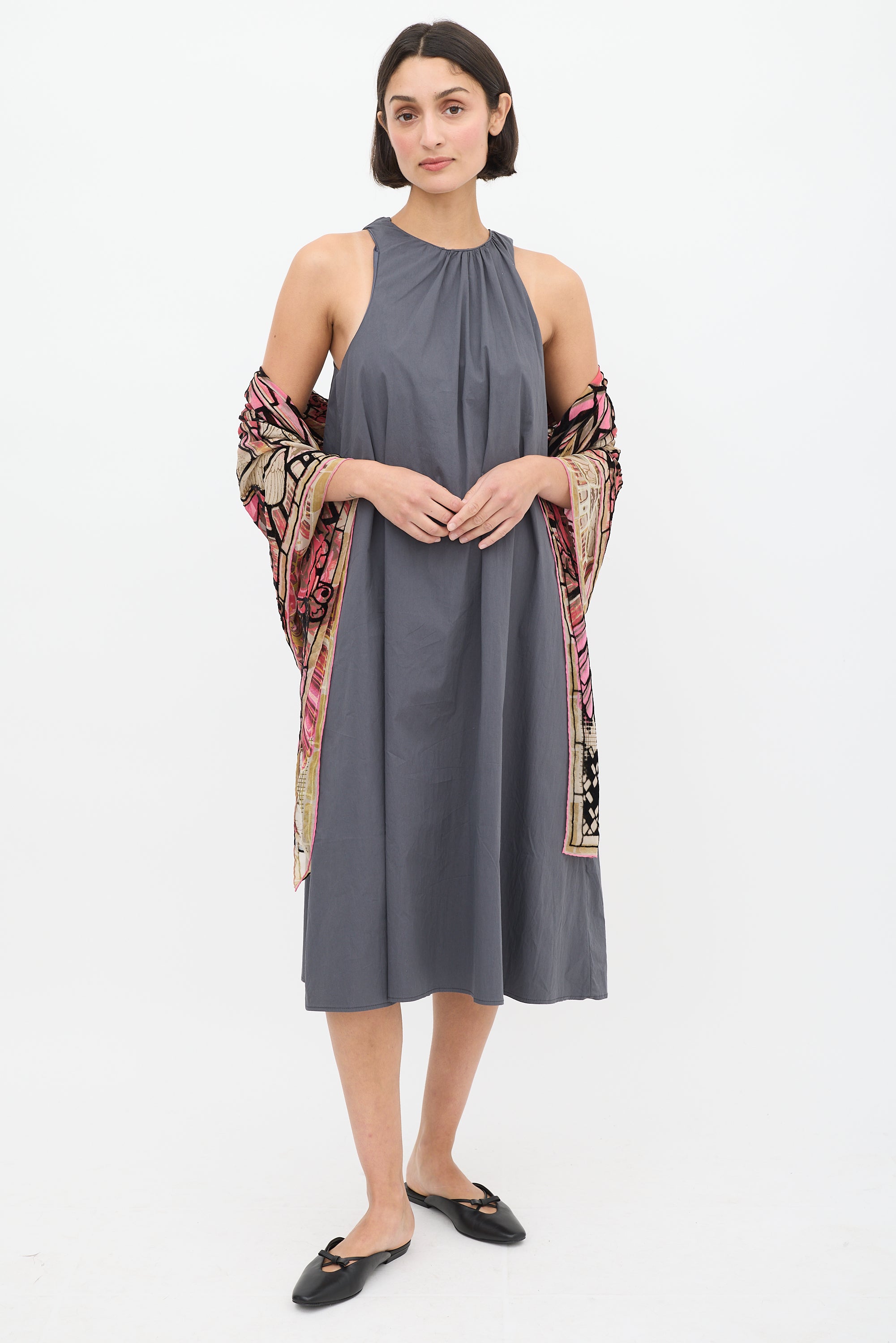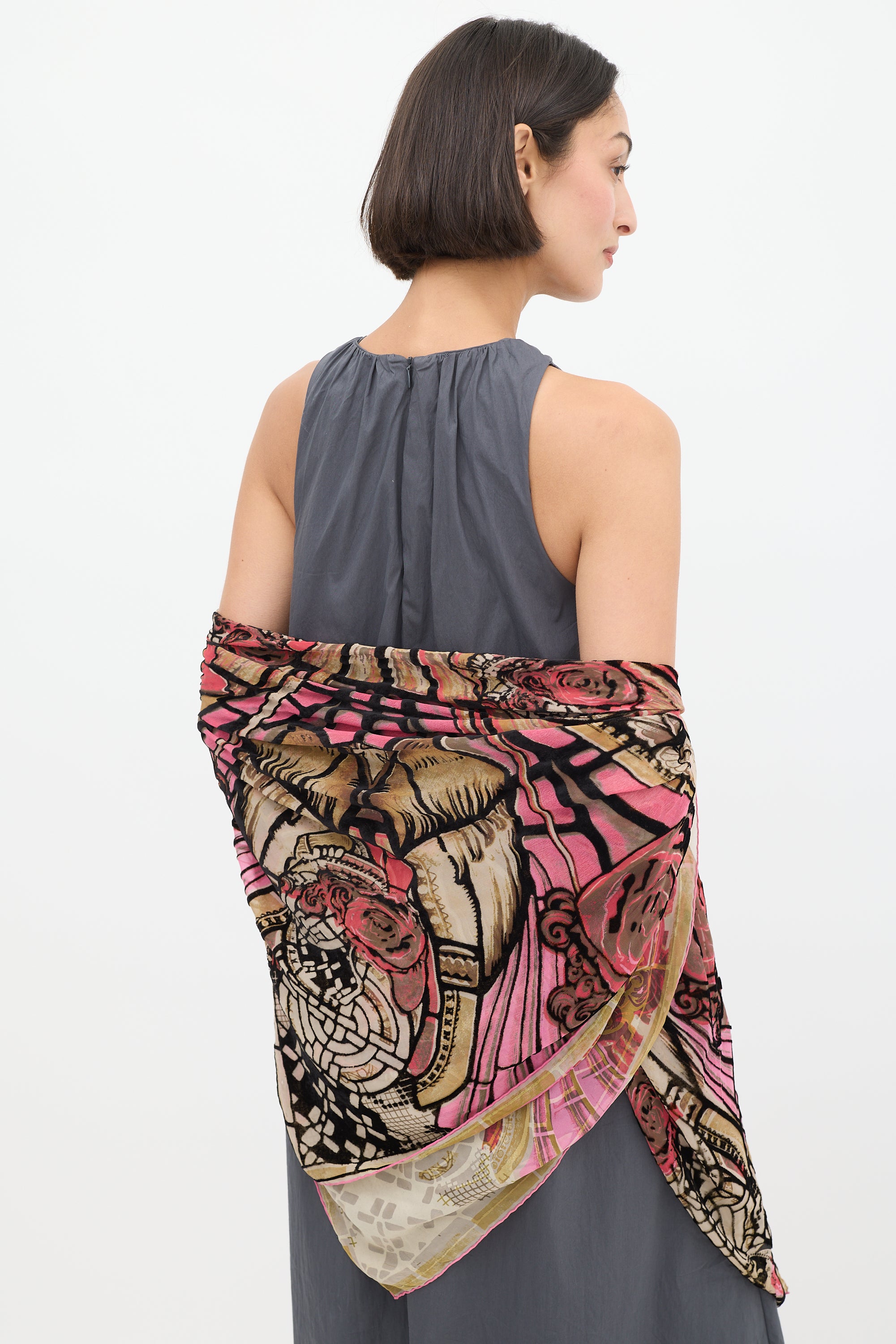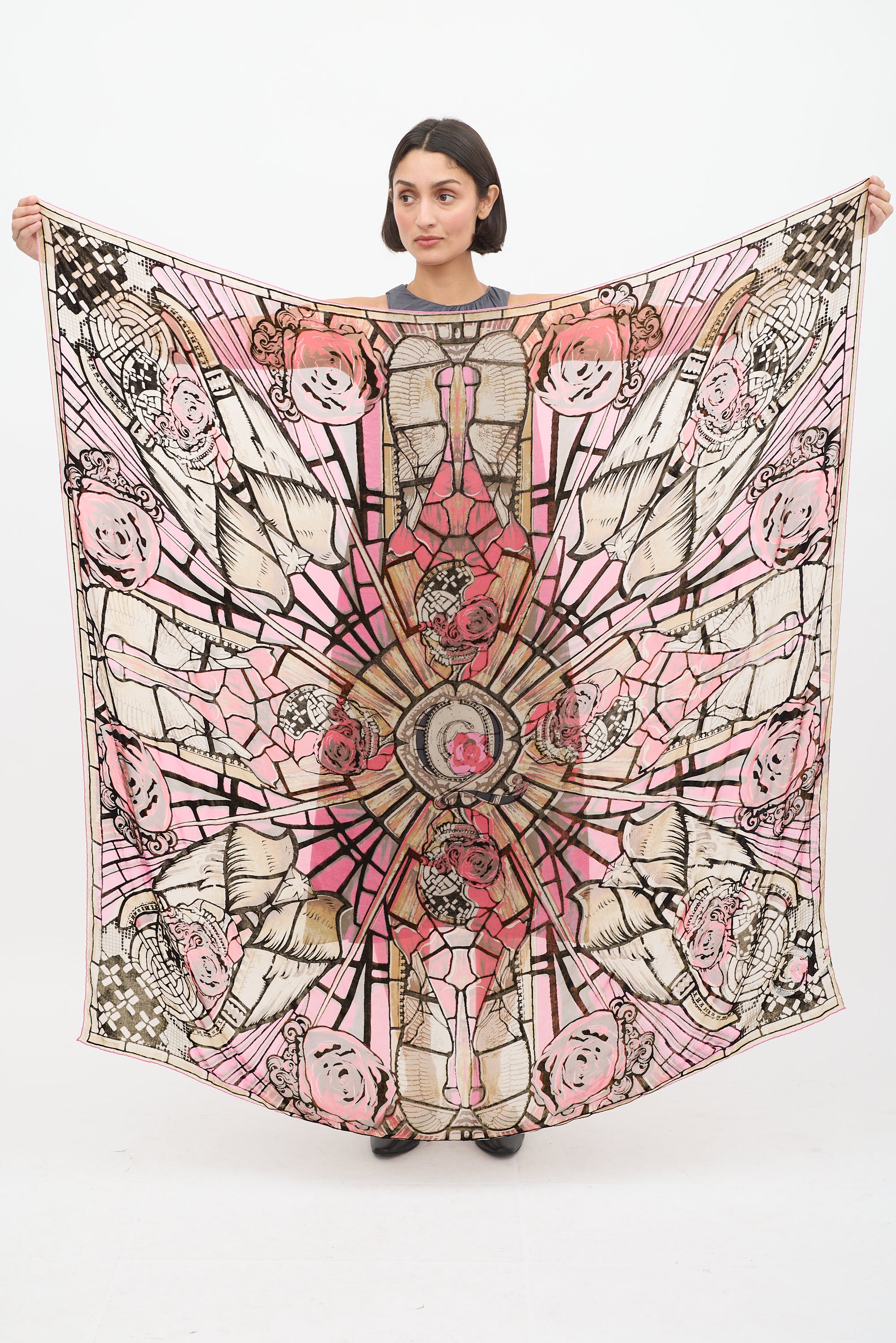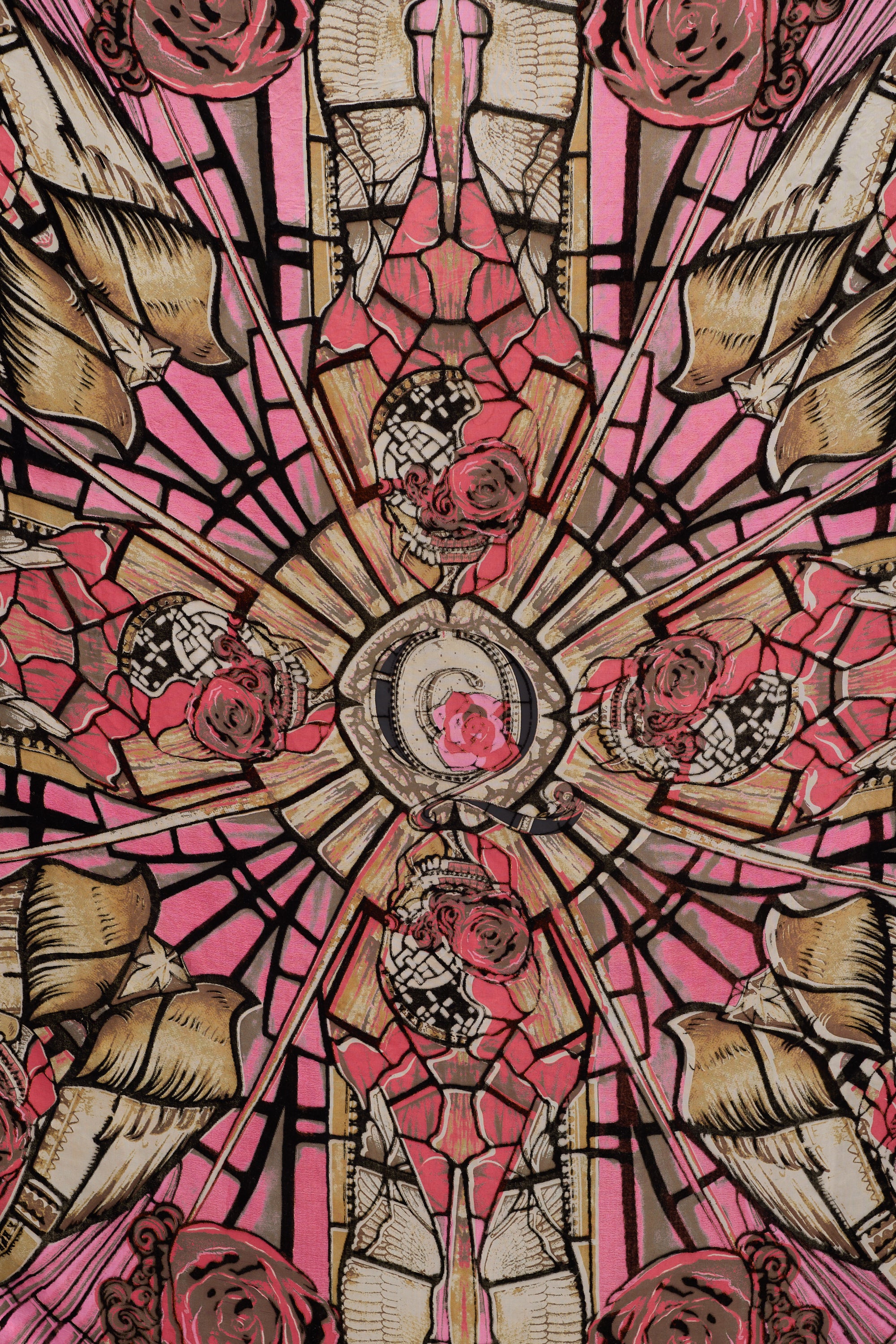 Pre-owned VSP Archive pink scarf featuring a multicolour skull pattern, black velour trim throughout, and rolled edges.