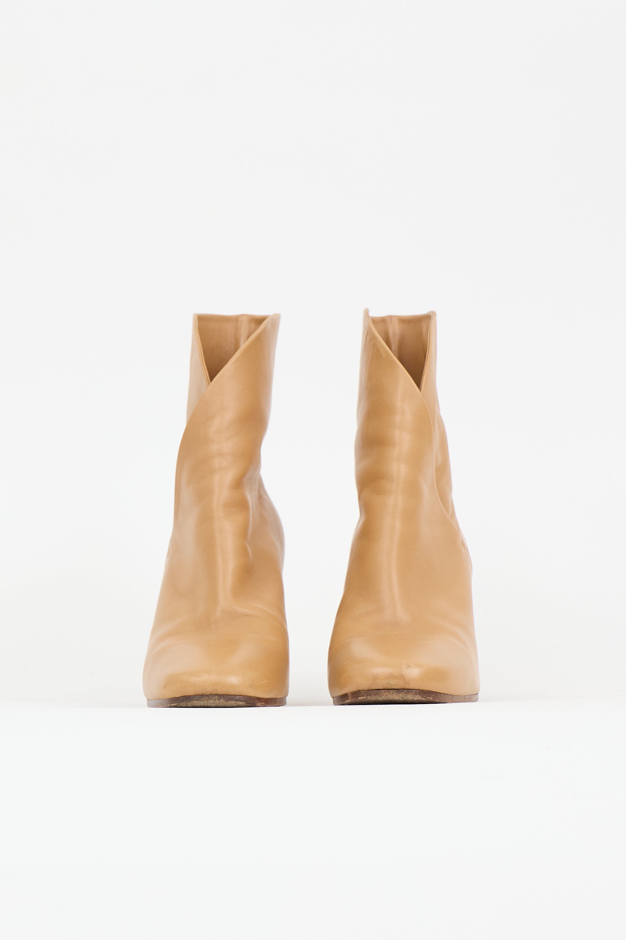 Pre-owned Celine beige leather boots featuring tapered square toe, pull on entry, layered shaft, and stacked block heel.