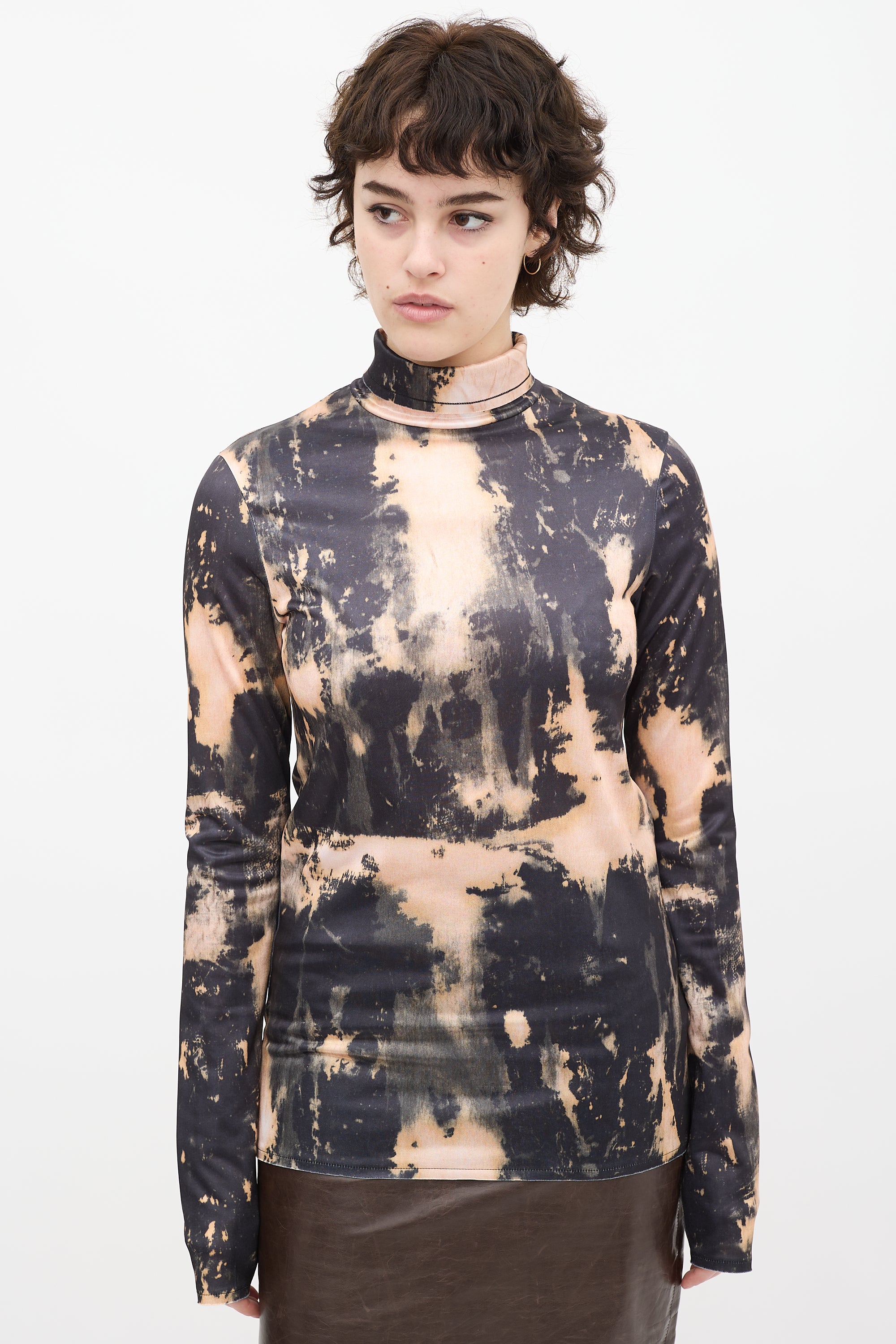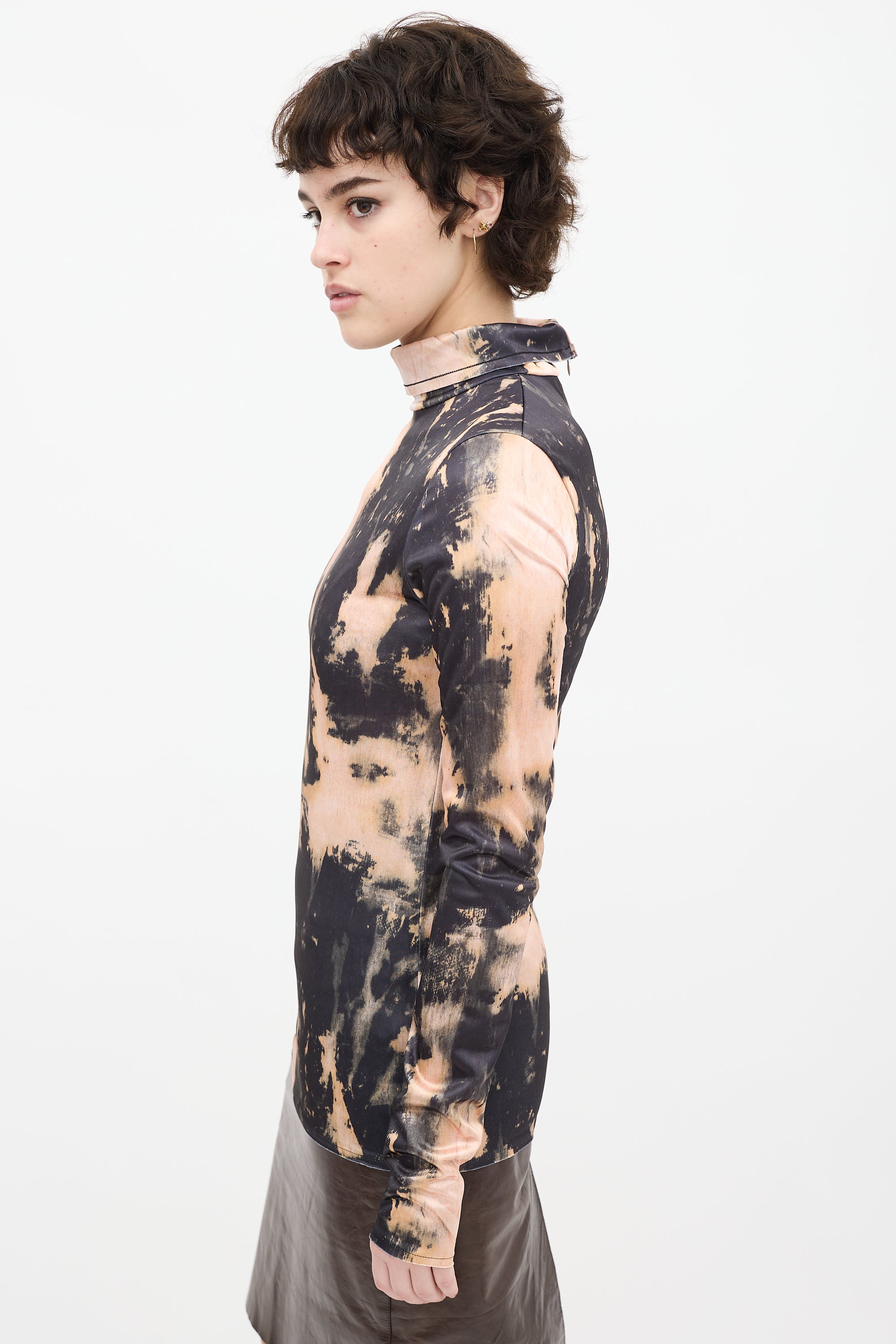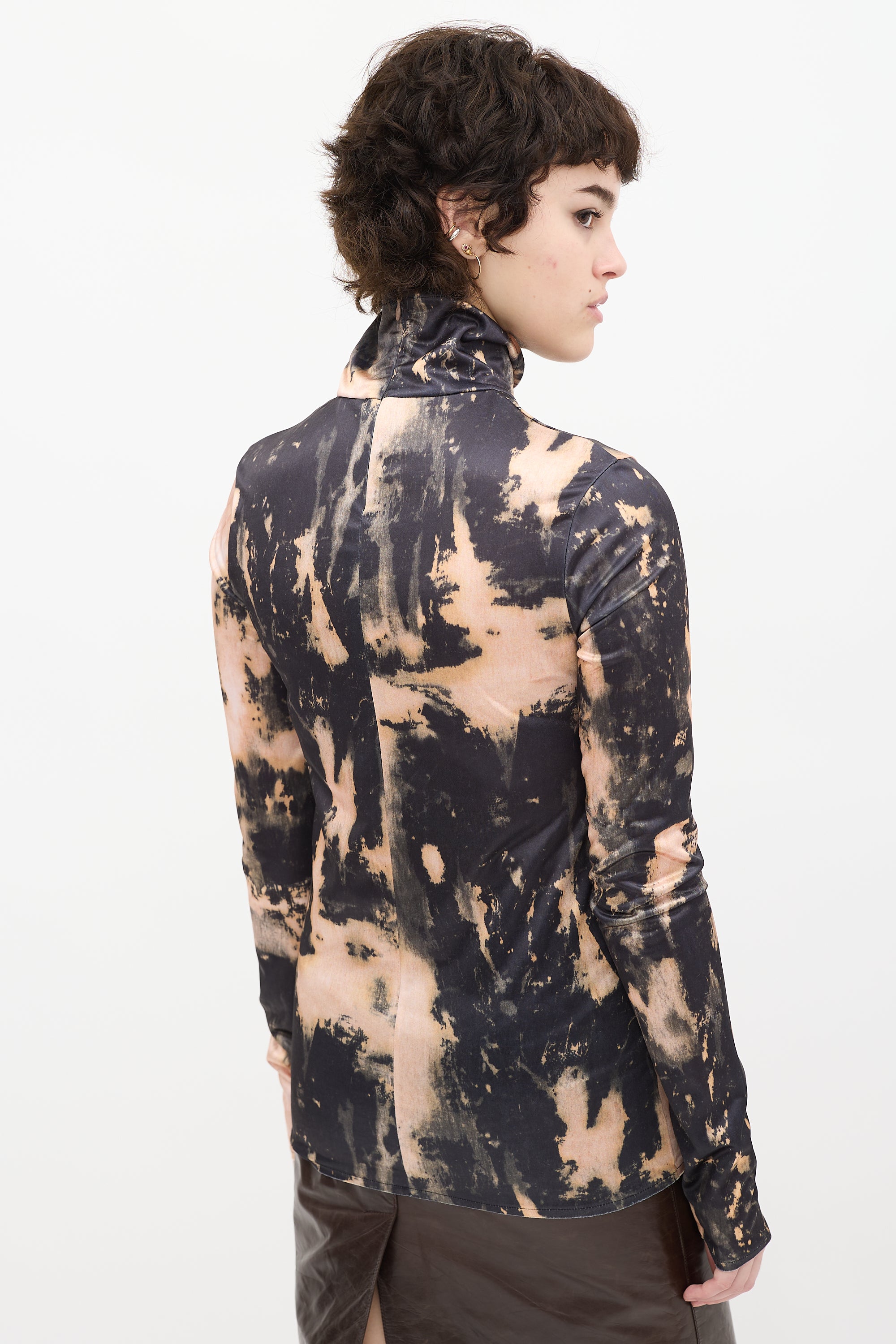 Pre-owned Acne Studios black and orange tie dye top featuring mock neck collar, long sleeves, and concealed zip closure at back.