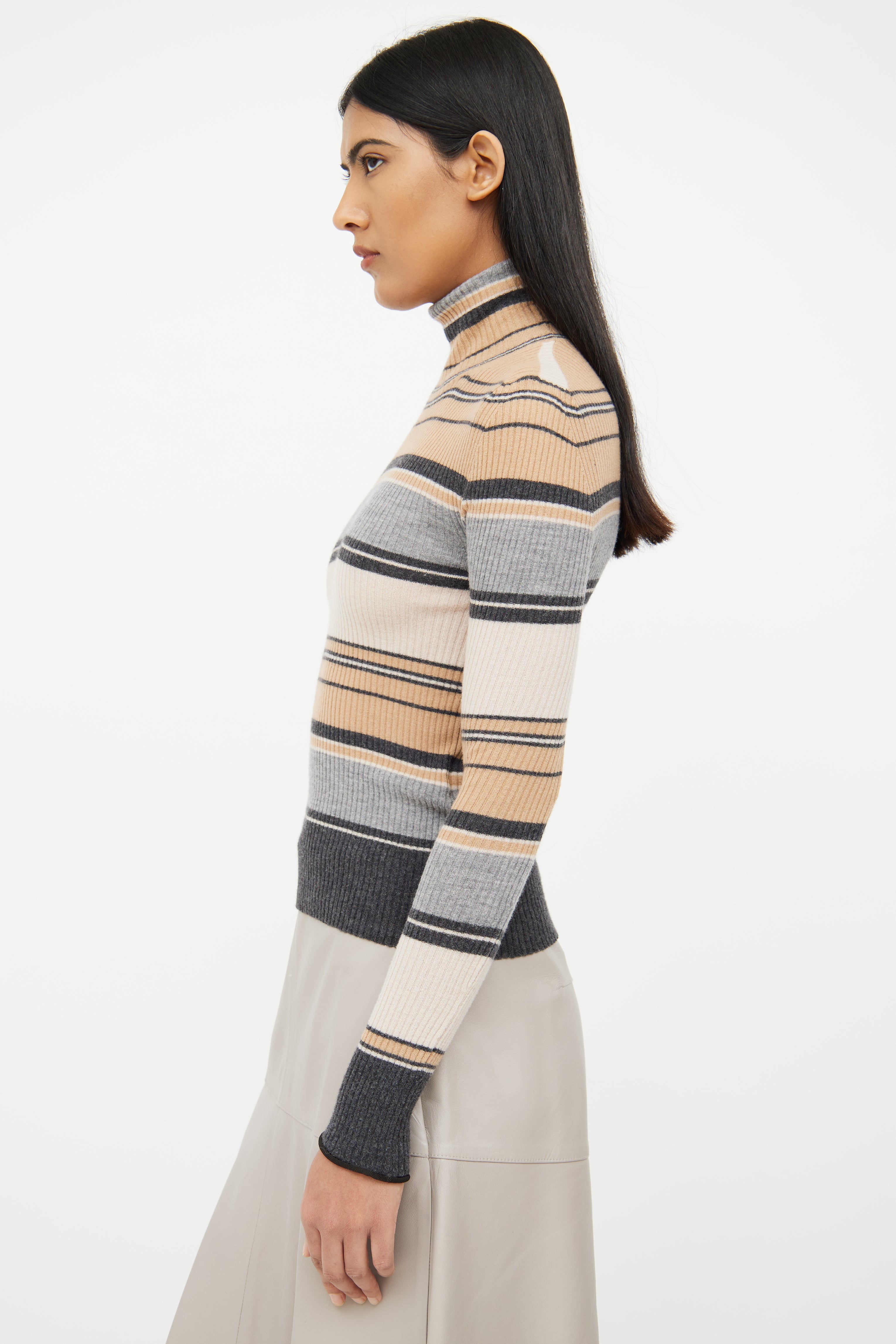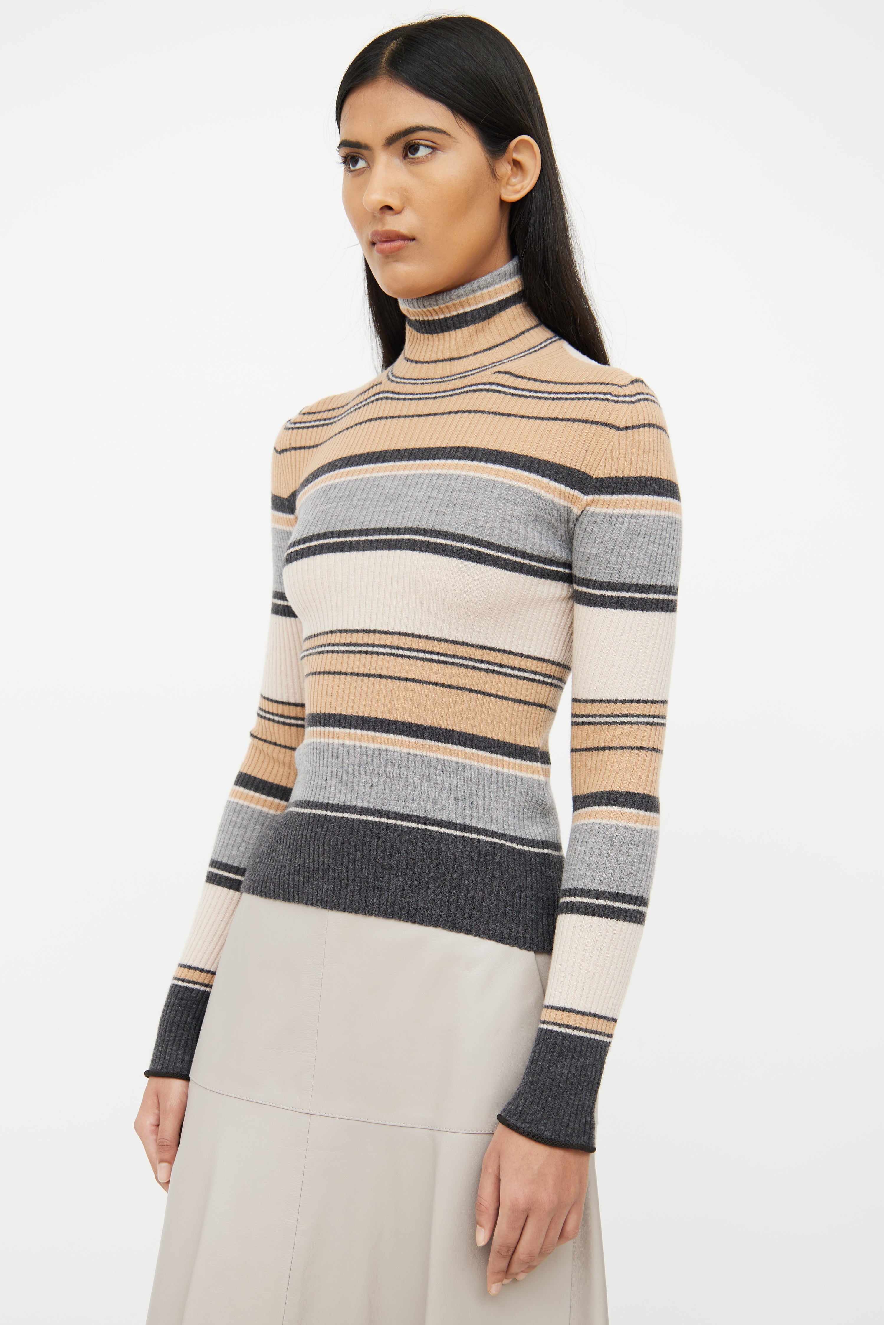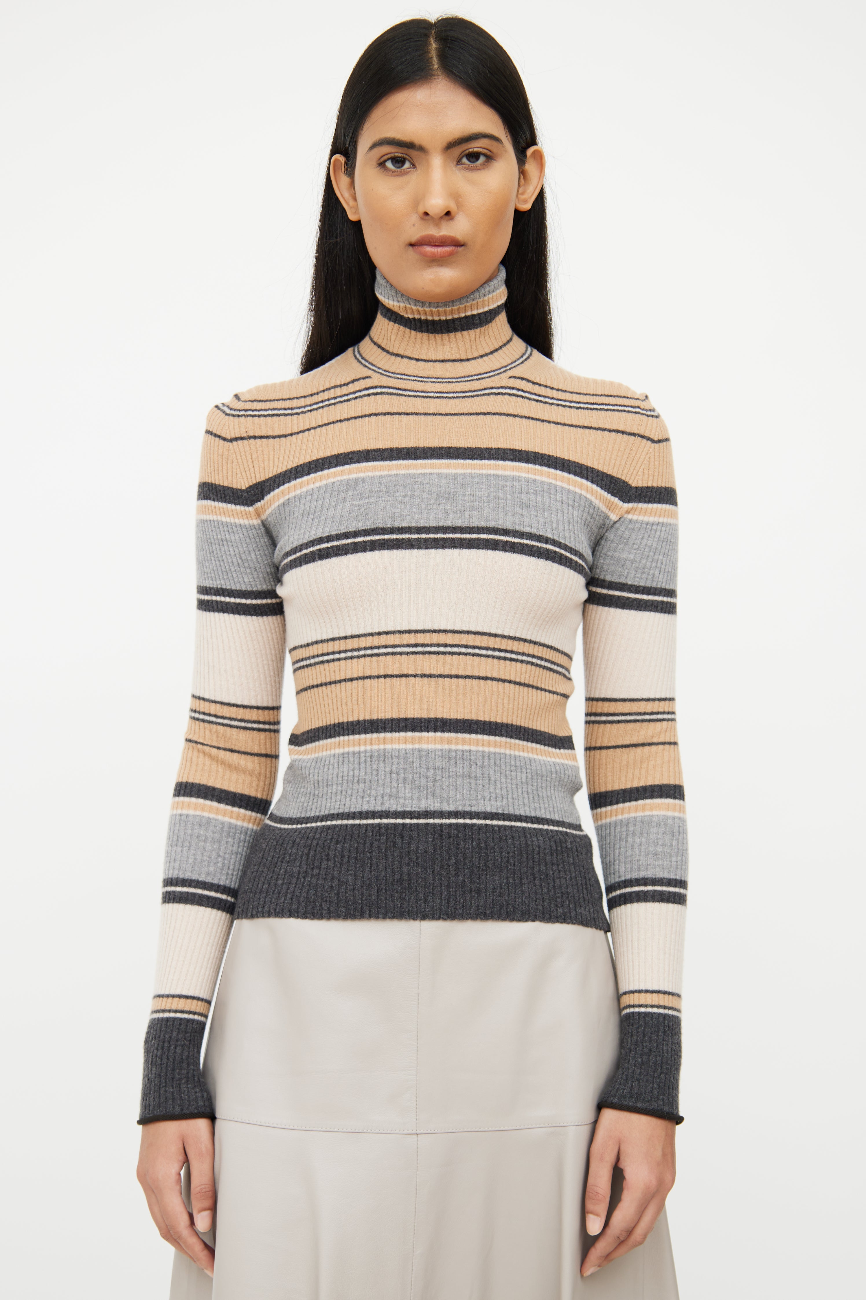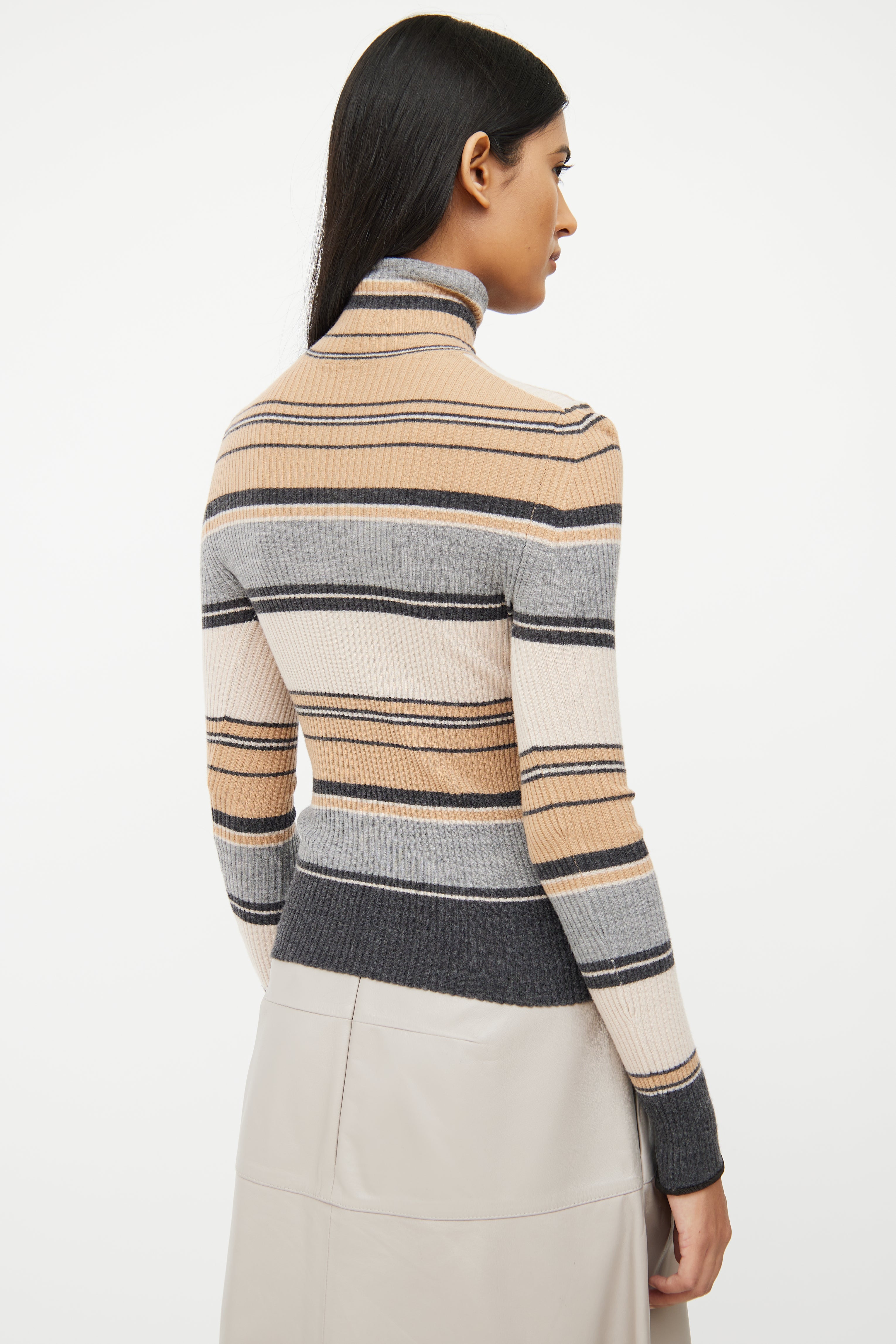 Pre-owned Acne Studios brown and grey long sleeve top featuring different sized stripes, ribbing and turtleneck.